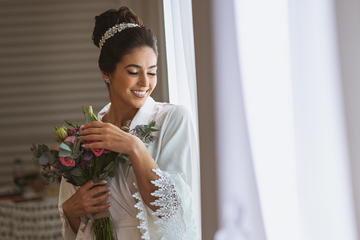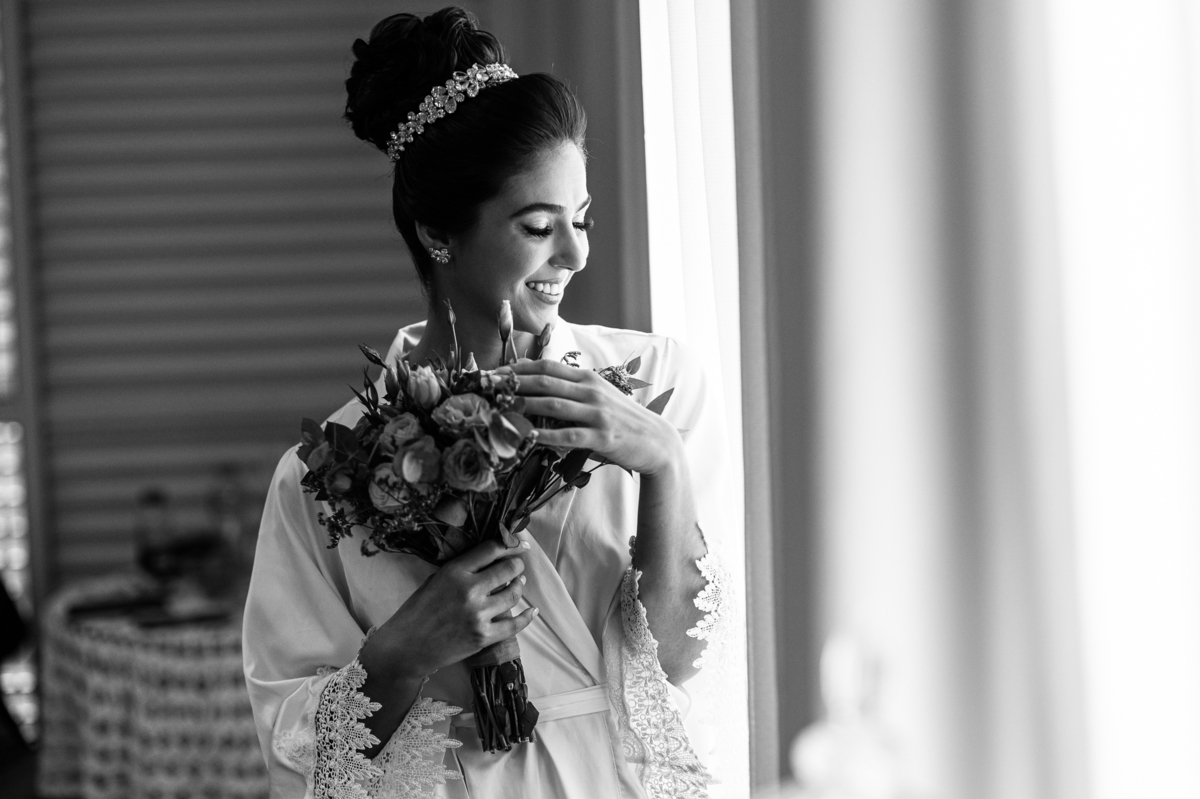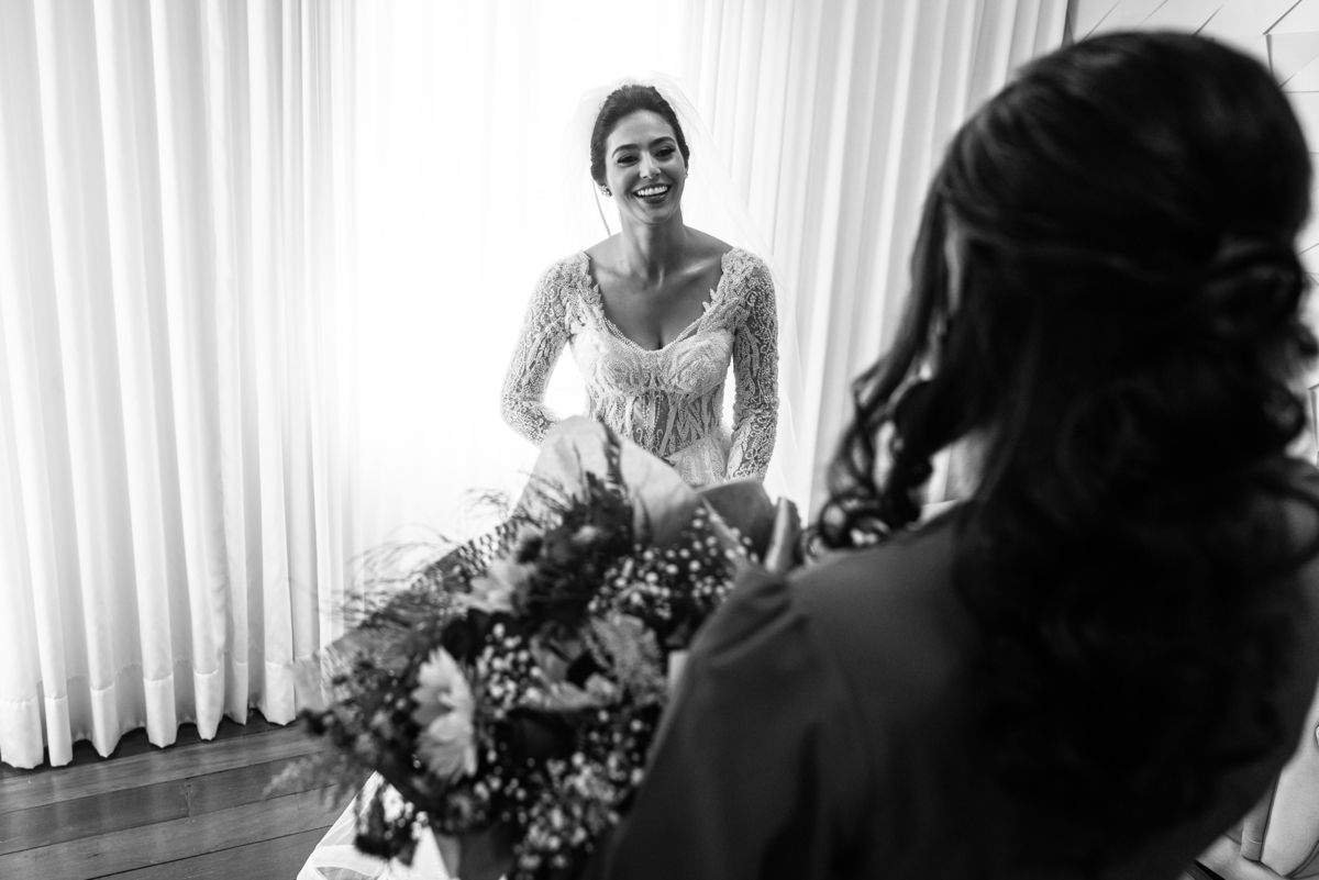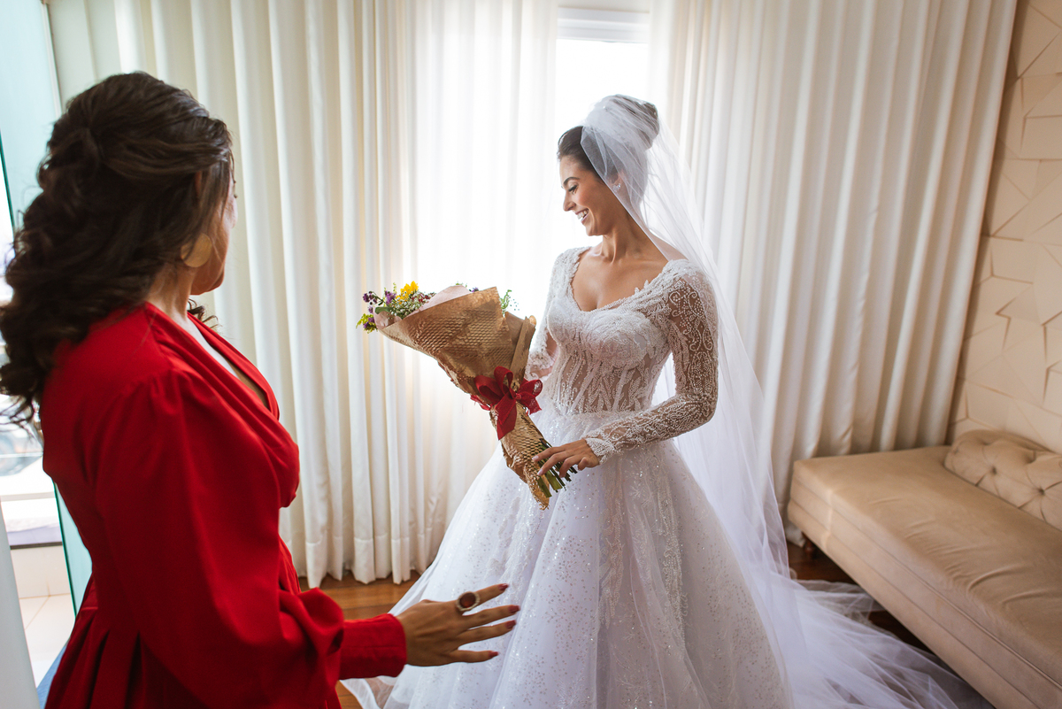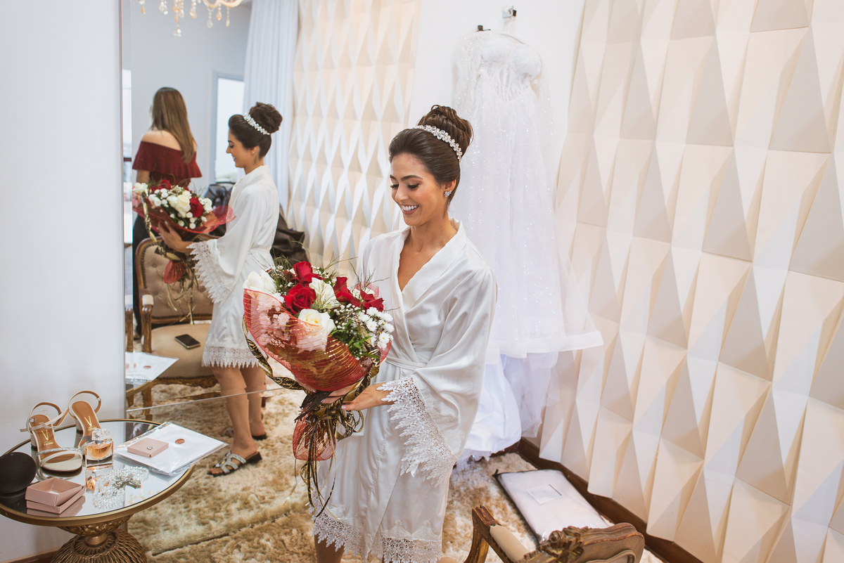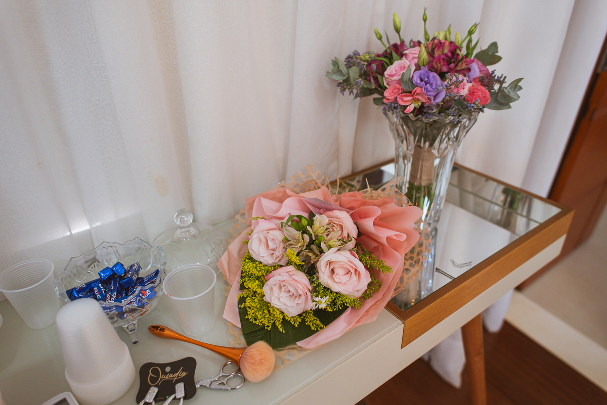 A mãe da noiva também se produzia no salão e logo chegou para fazermos algumas fotos. O sorriso? De canto a canto do rosto, das duas. Elas se abraçavam e sorriam como se fossem ambas que estivessem realizando um grande sonho. Jaqueline estava com penteado pronto e a make quase finalizada. Olhando no cantinho, estava o maravilhoso vestido escolhido por ela. Assinado pela Enlace Maison, tradicionalíssima e com vestidos impecáveis, ele só aguardava seu momento de brilhar junto com a noiva. Enquanto estávamos conversando e alinhando os últimos detalhes, eis que me surge uma surpresa pra noiva. Um belo buquê de flores pegou ela de surpresa. Otávio havia preparado essa surpresa e realmente deixou ela muito feliz. Fotografei o buquê e falei para ela como esse buquê estava maravilhoso. Ela me disse que esse em especial, era somente para as fotos no salão. Então, questionei se haveria outro, e ela confirmou que sim.