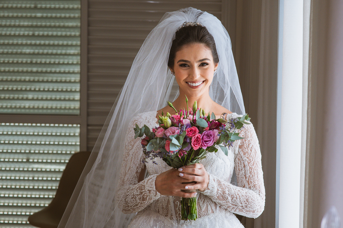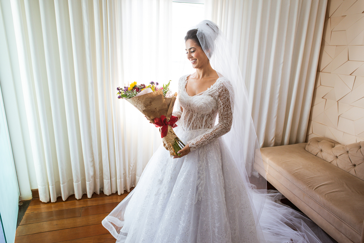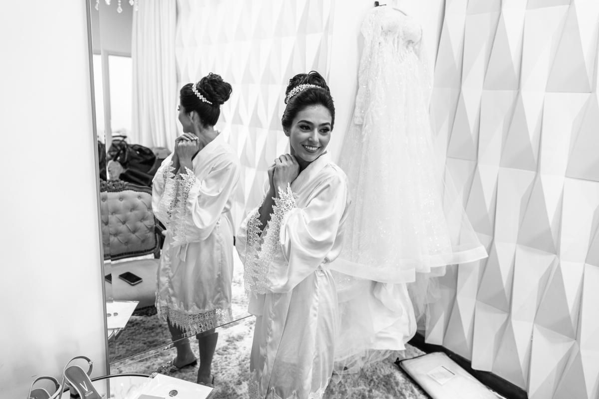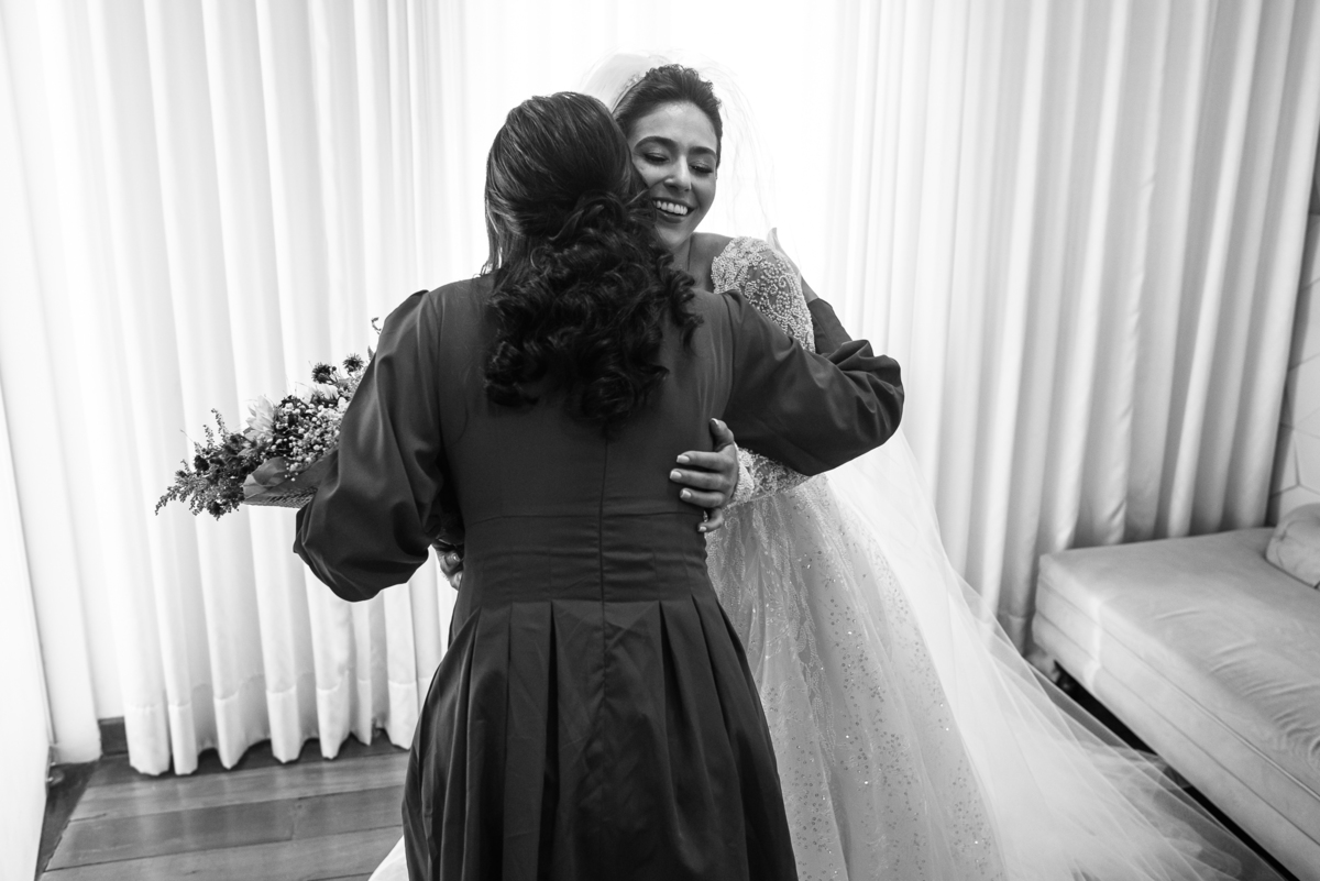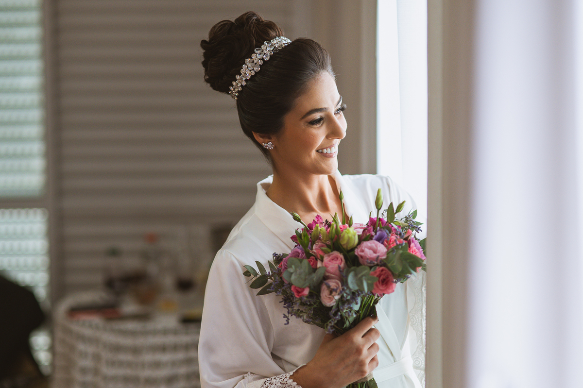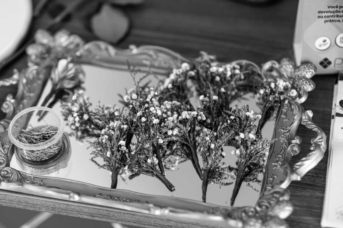 A mãe da noiva também se produzia no salão e logo chegou para fazermos algumas fotos. O sorriso? De canto a canto do rosto, das duas. Elas se abraçavam e sorriam como se fossem ambas que estivessem realizando um grande sonho. Jaqueline estava com penteado pronto e a make quase finalizada. Olhando no cantinho, estava o maravilhoso vestido escolhido por ela. Assinado pela Enlace Maison, tradicionalíssima e com vestidos impecáveis, ele só aguardava seu momento de brilhar junto com a noiva. Enquanto estávamos conversando e alinhando os últimos detalhes, eis que me surge uma surpresa pra noiva. Um belo buquê de flores pegou ela de surpresa. Otávio havia preparado essa surpresa e realmente deixou ela muito feliz. Fotografei o buquê e falei para ela como esse buquê estava maravilhoso. Ela me disse que esse em especial, era somente para as fotos no salão. Então, questionei se haveria outro, e ela confirmou que sim.