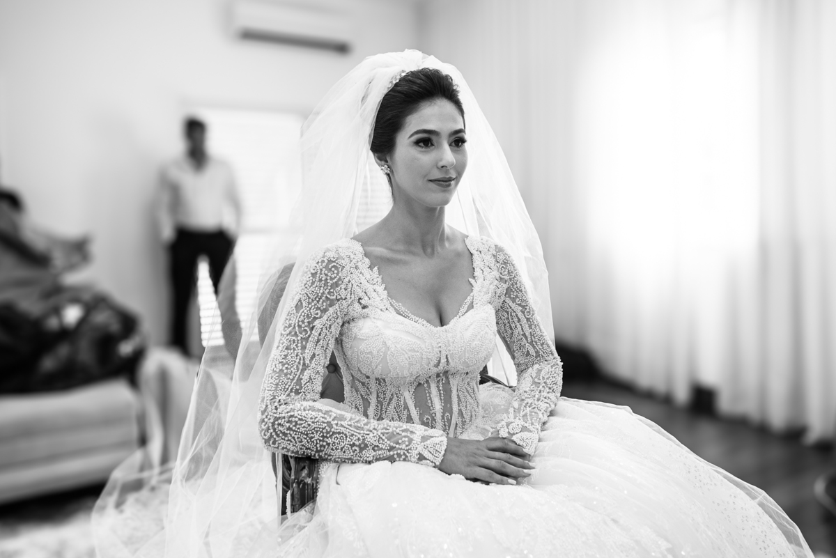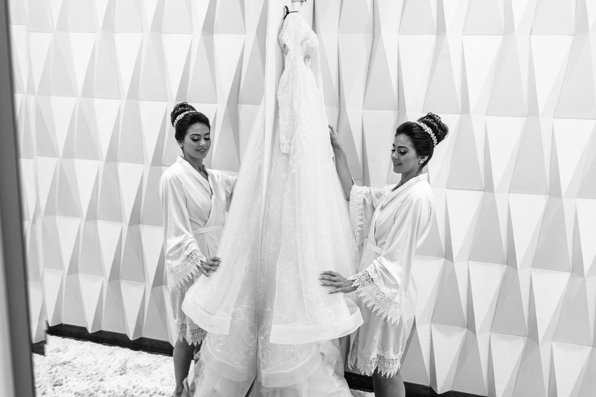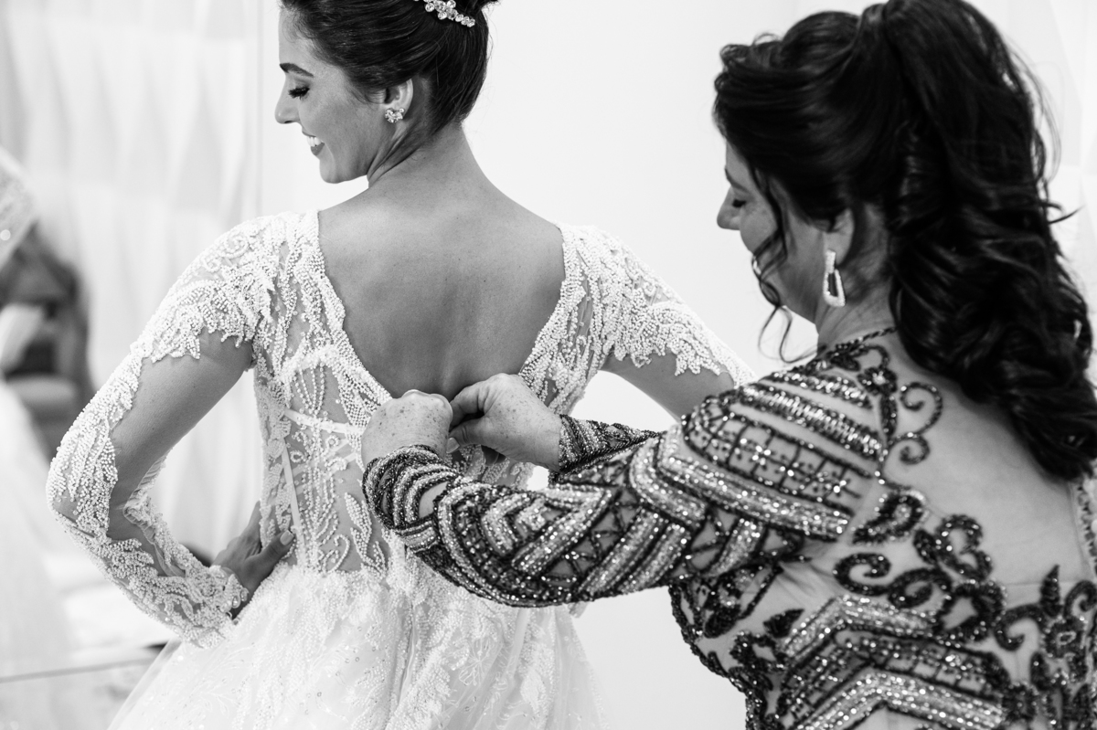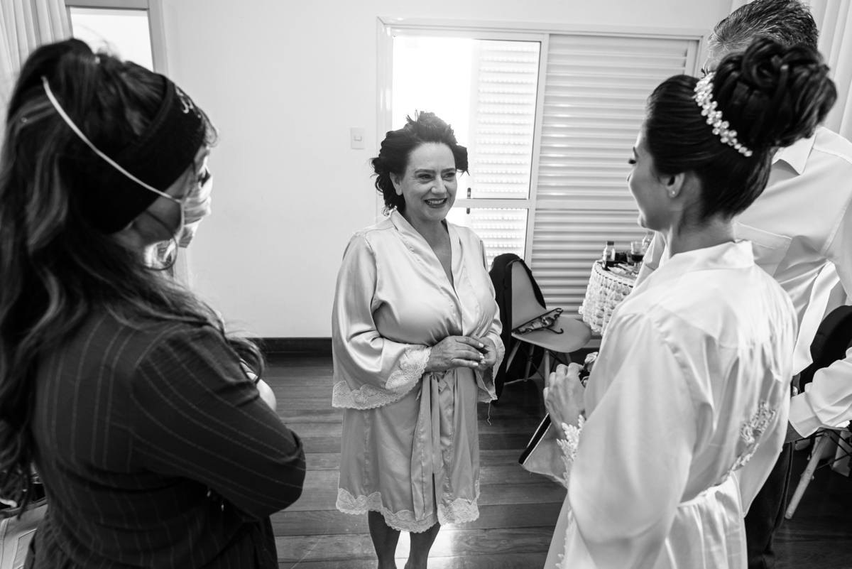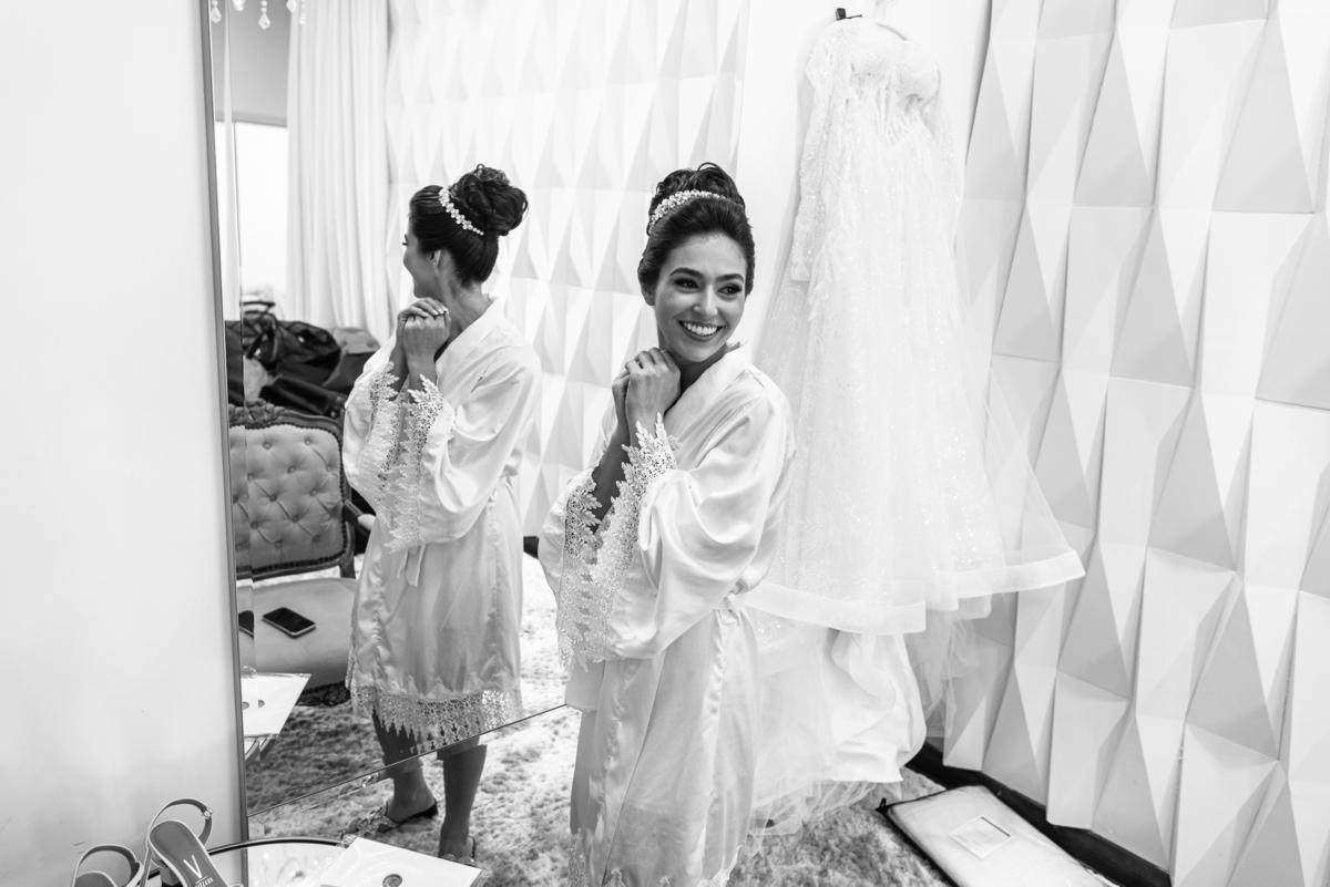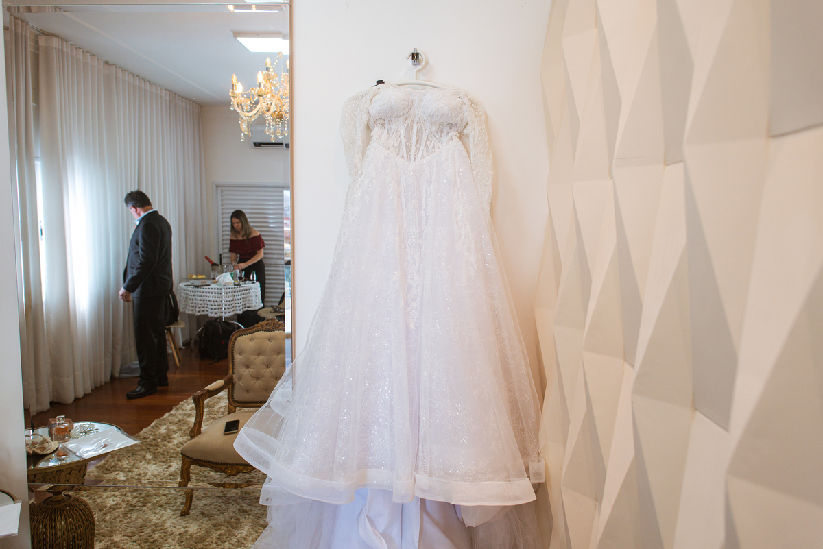 A mãe da noiva também se produzia no salão e logo chegou para fazermos algumas fotos. O sorriso? De canto a canto do rosto, das duas. Elas se abraçavam e sorriam como se fossem ambas que estivessem realizando um grande sonho. Jaqueline estava com penteado pronto e a make quase finalizada. Olhando no cantinho, estava o maravilhoso vestido escolhido por ela. Assinado pela Enlace Maison, tradicionalíssima e com vestidos impecáveis, ele só aguardava seu momento de brilhar junto com a noiva. Enquanto estávamos conversando e alinhando os últimos detalhes, eis que me surge uma surpresa pra noiva. Um belo buquê de flores pegou ela de surpresa. Otávio havia preparado essa surpresa e realmente deixou ela muito feliz. Fotografei o buquê e falei para ela como esse buquê estava maravilhoso. Ela me disse que esse em especial, era somente para as fotos no salão. Então, questionei se haveria outro, e ela confirmou que sim.