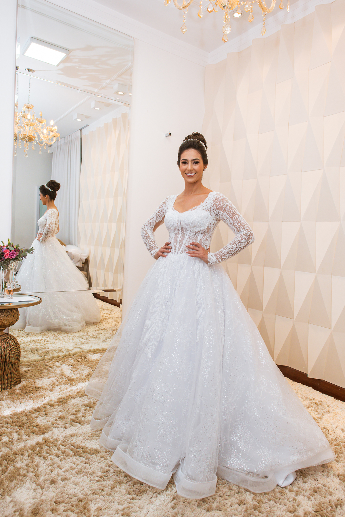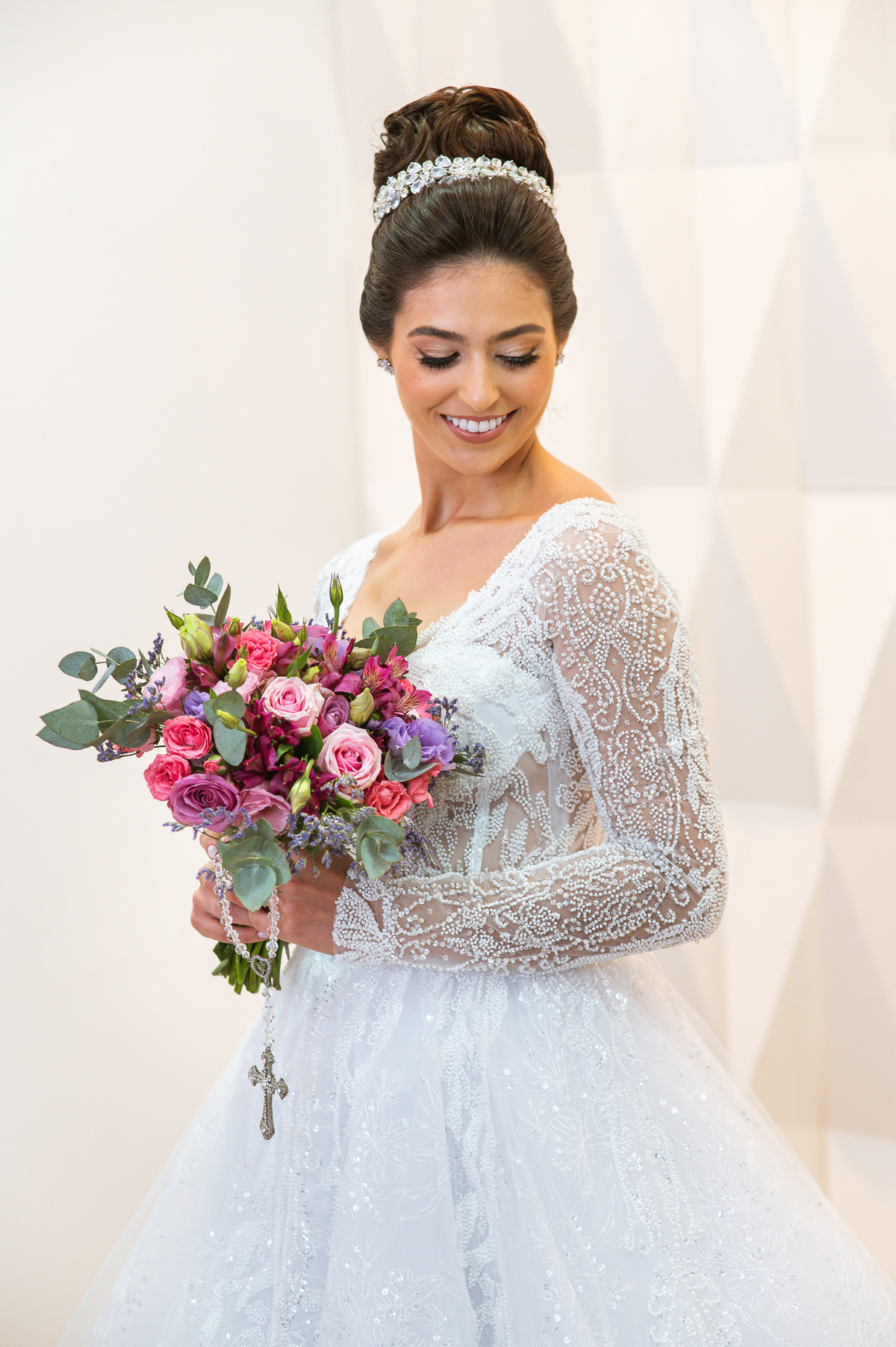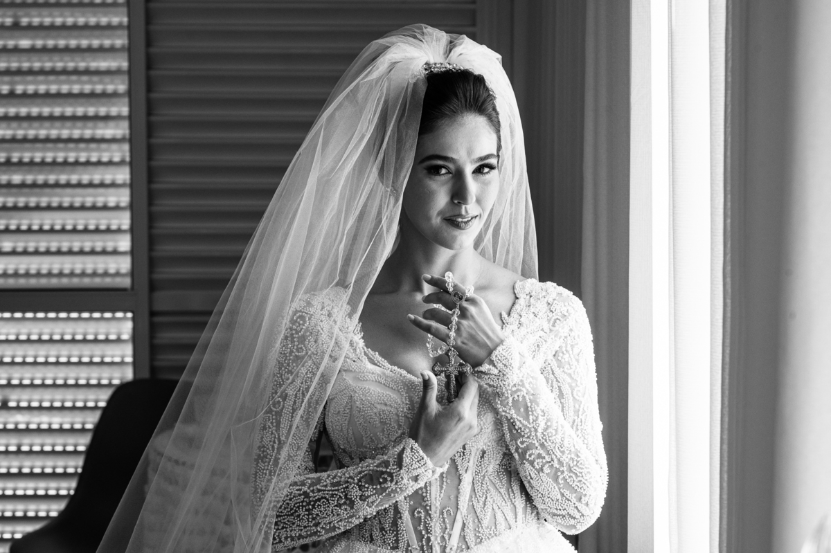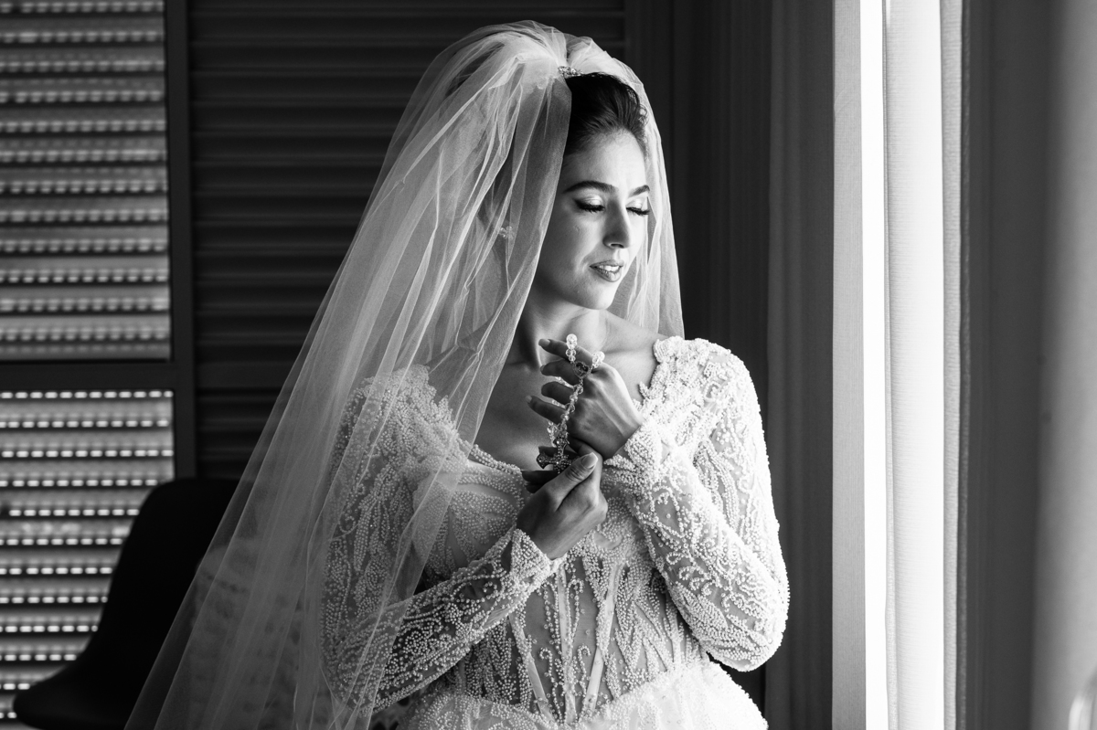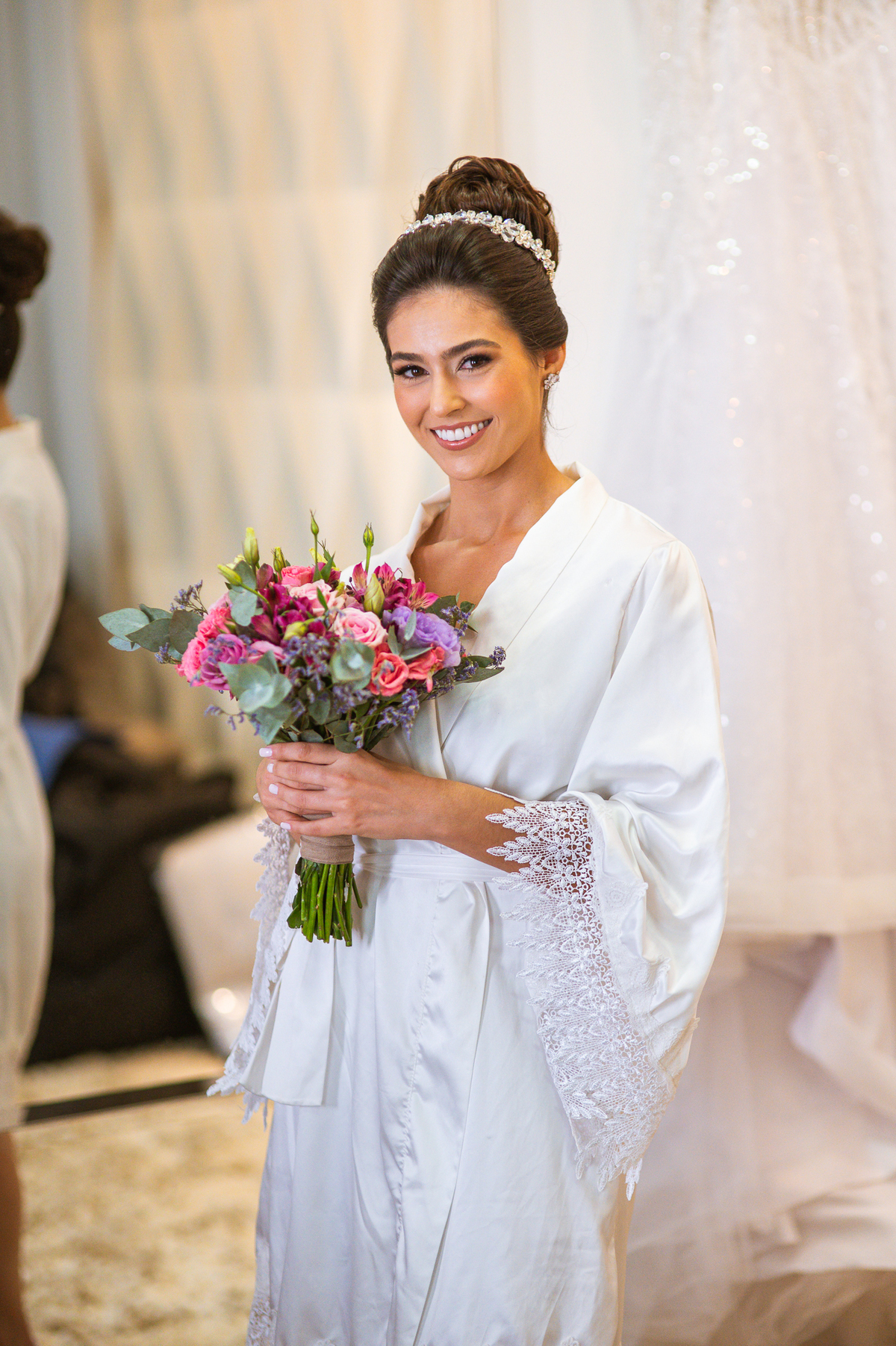 A mãe da noiva também se produzia no salão e logo chegou para fazermos algumas fotos. O sorriso? De canto a canto do rosto, das duas. Elas se abraçavam e sorriam como se fossem ambas que estivessem realizando um grande sonho. Jaqueline estava com penteado pronto e a make quase finalizada. Olhando no cantinho, estava o maravilhoso vestido escolhido por ela. Assinado pela Enlace Maison, tradicionalíssima e com vestidos impecáveis, ele só aguardava seu momento de brilhar junto com a noiva. Enquanto estávamos conversando e alinhando os últimos detalhes, eis que me surge uma surpresa pra noiva. Um belo buquê de flores pegou ela de surpresa. Otávio havia preparado essa surpresa e realmente deixou ela muito feliz. Fotografei o buquê e falei para ela como esse buquê estava maravilhoso. Ela me disse que esse em especial, era somente para as fotos no salão. Então, questionei se haveria outro, e ela confirmou que sim.