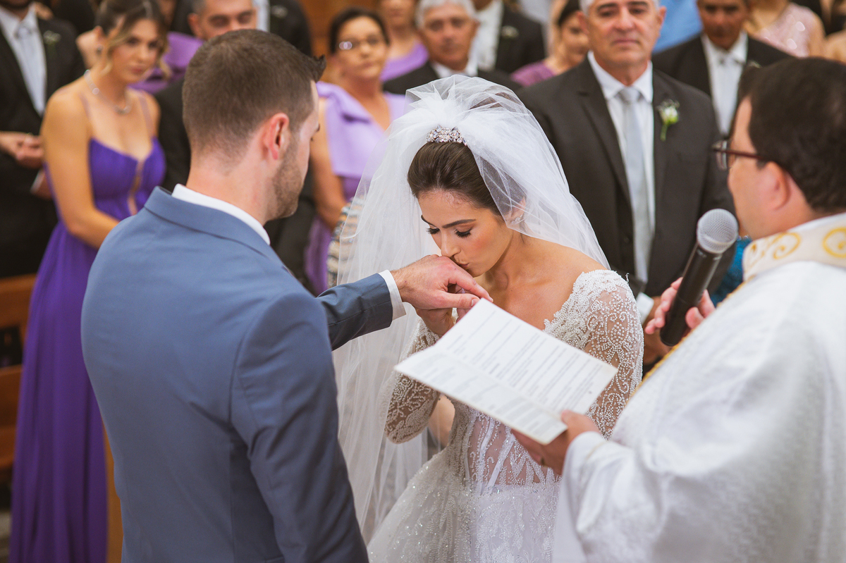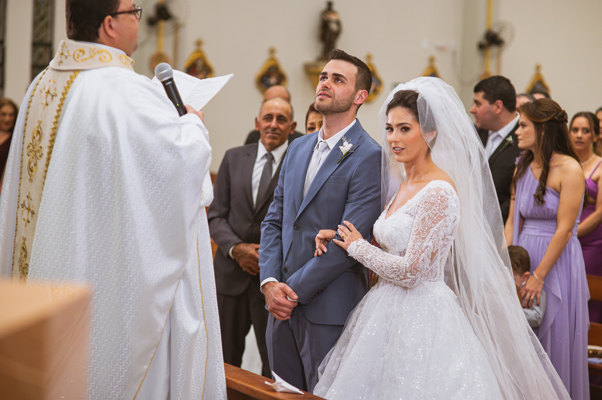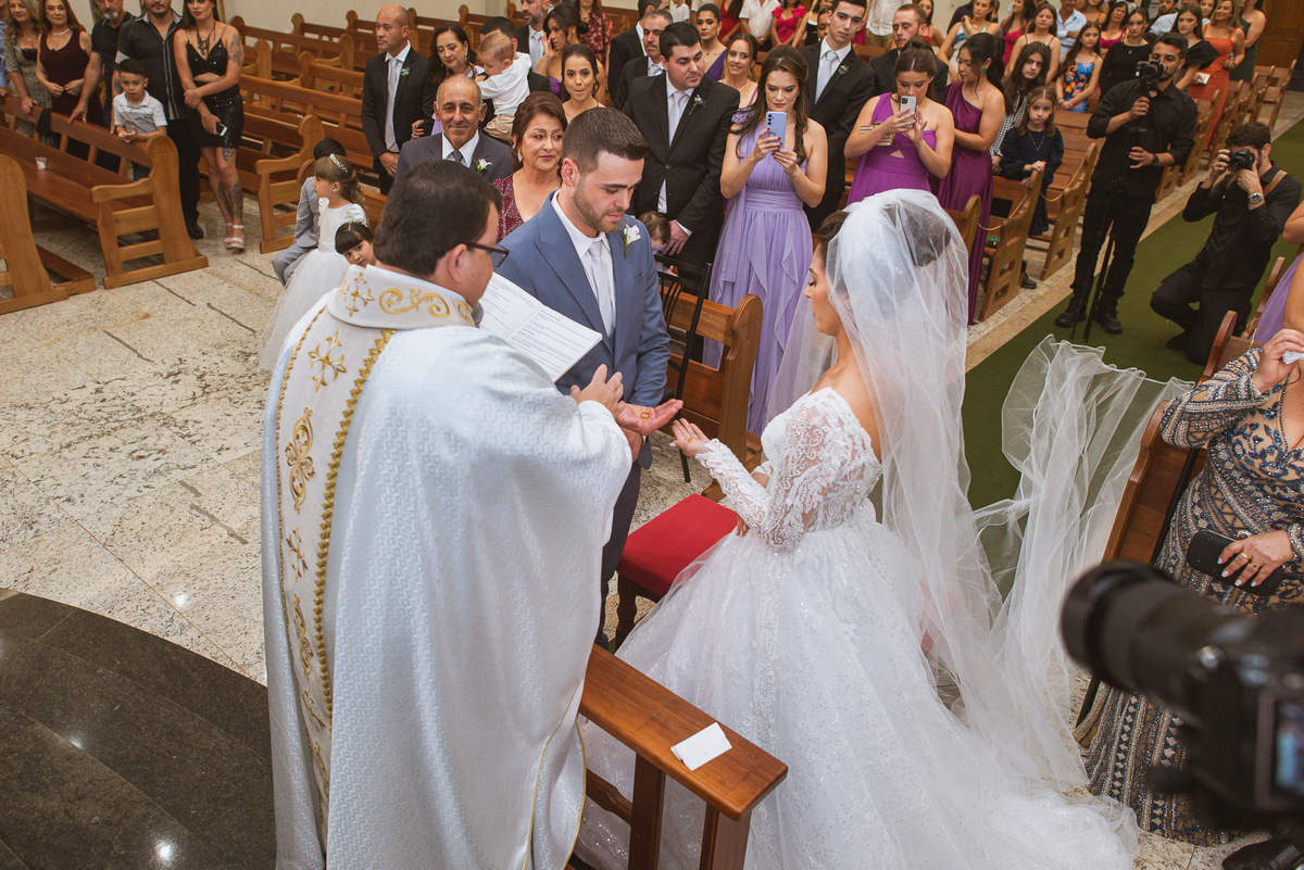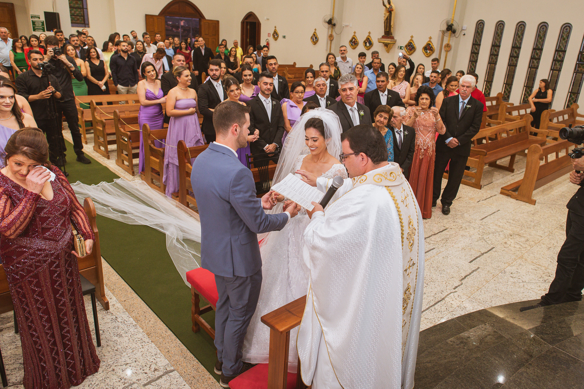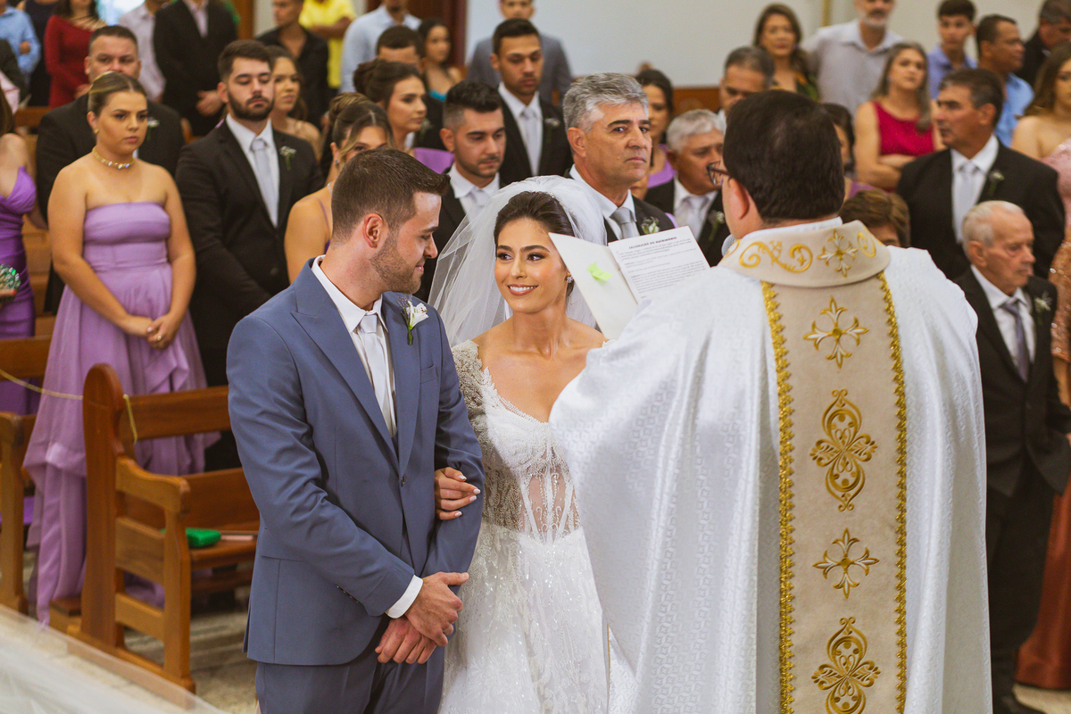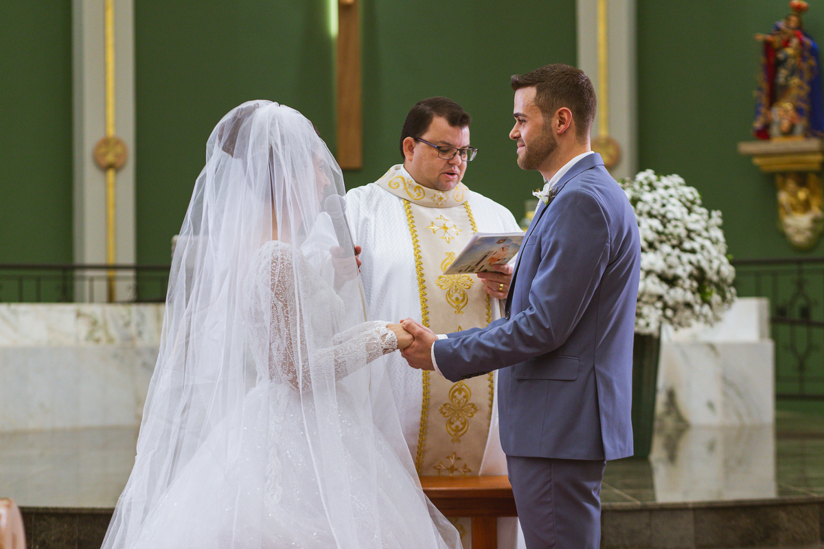 O padre os recebeu com muita alegria. Trouxe uma palavra abençoada que com toda certeza mexeu com o coração dos presentes e também dos noivos. Eles receberam as alianças, que foram ungidas com a água benta. Eles fizeram a troca de votos e também colocaram a aliança, um no dedo do outro. Com um beijo na aliança, cada um deles selou aquele momento de fé e emoção. O padre ainda convidou os presentes a erguerem as mãos abençoando os noivos. Todos oraram pelos noivos os abençoando. Os pais de ambos estavam muito emocionados. Eles participaram também da comunhão juntos. Com muita fé, os dois participaram desse momento e juntos foram abençoados. Depois, eles foram declarados casados perante Deus e assinaram os papéis do casamento.