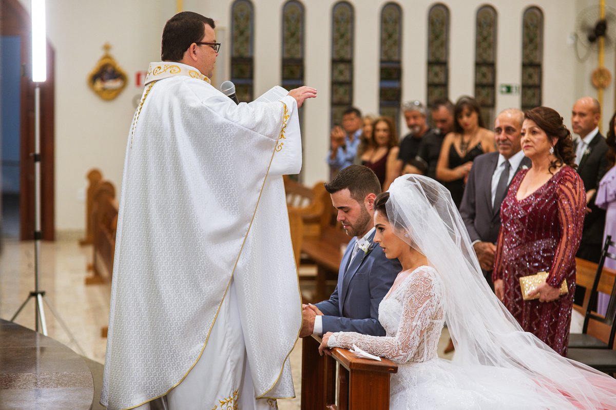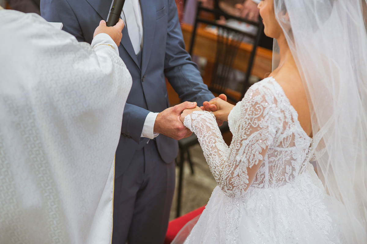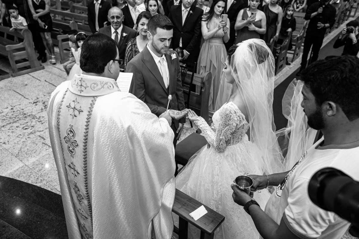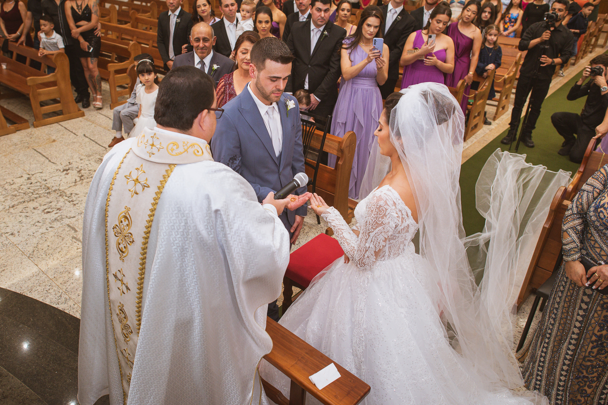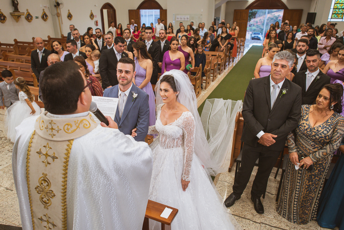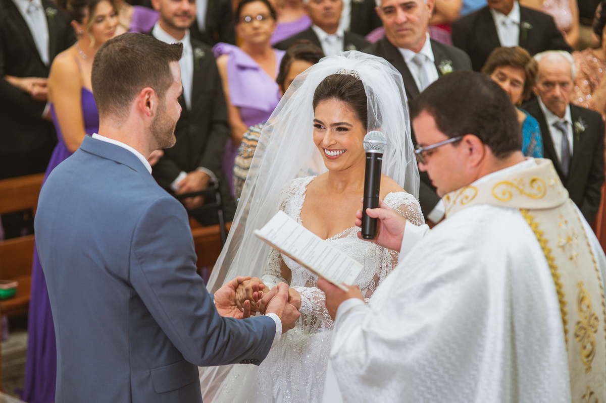 O padre os recebeu com muita alegria. Trouxe uma palavra abençoada que com toda certeza mexeu com o coração dos presentes e também dos noivos. Eles receberam as alianças, que foram ungidas com a água benta. Eles fizeram a troca de votos e também colocaram a aliança, um no dedo do outro. Com um beijo na aliança, cada um deles selou aquele momento de fé e emoção. O padre ainda convidou os presentes a erguerem as mãos abençoando os noivos. Todos oraram pelos noivos os abençoando. Os pais de ambos estavam muito emocionados. Eles participaram também da comunhão juntos. Com muita fé, os dois participaram desse momento e juntos foram abençoados. Depois, eles foram declarados casados perante Deus e assinaram os papéis do casamento.