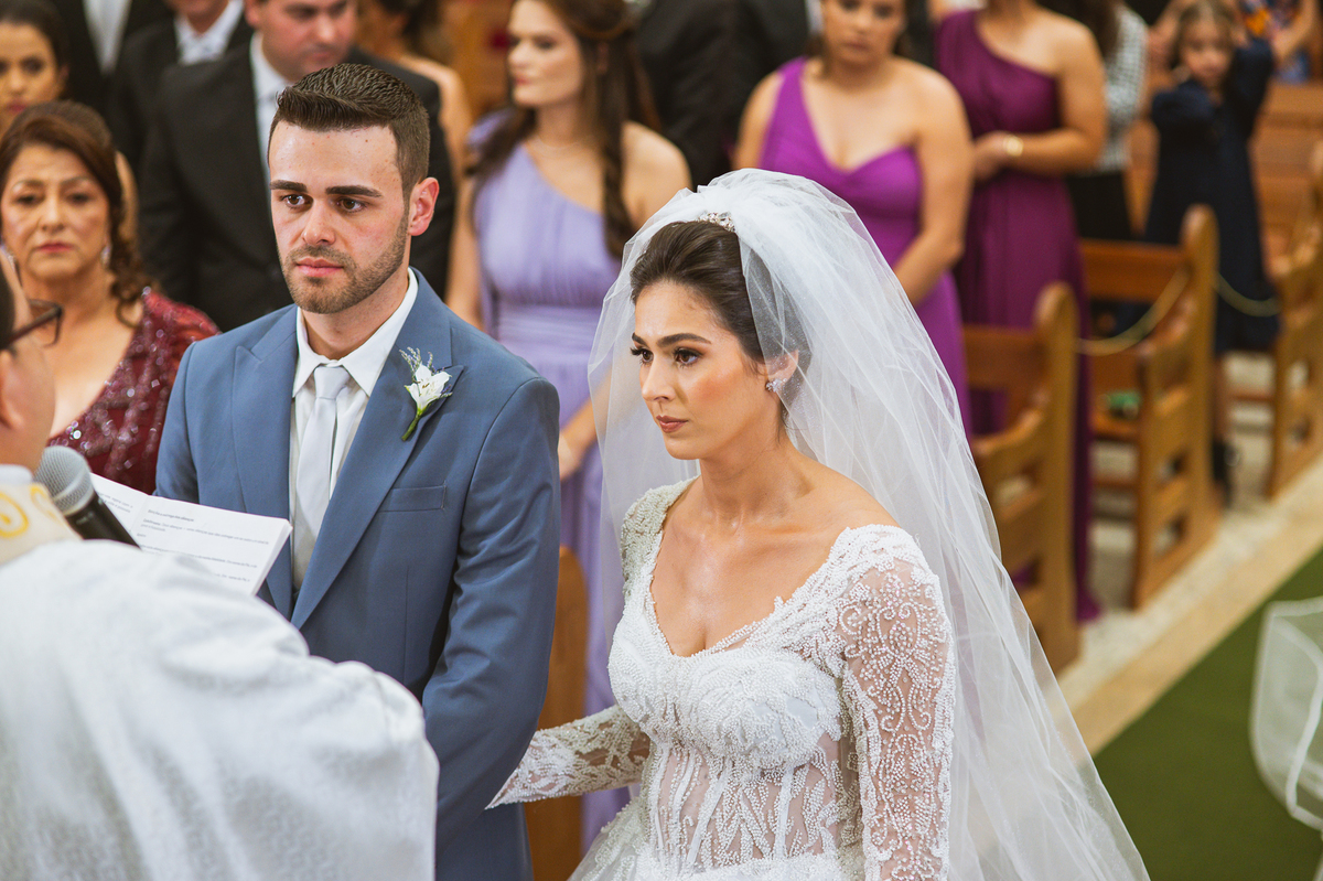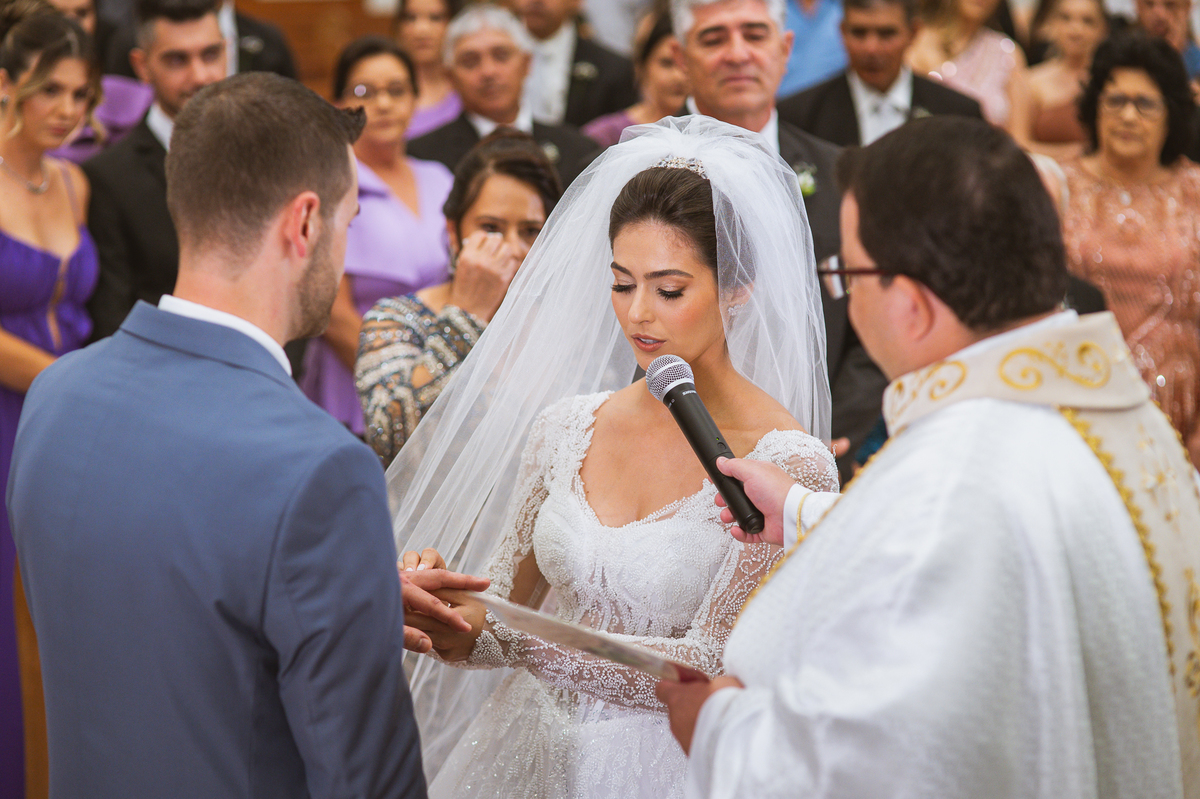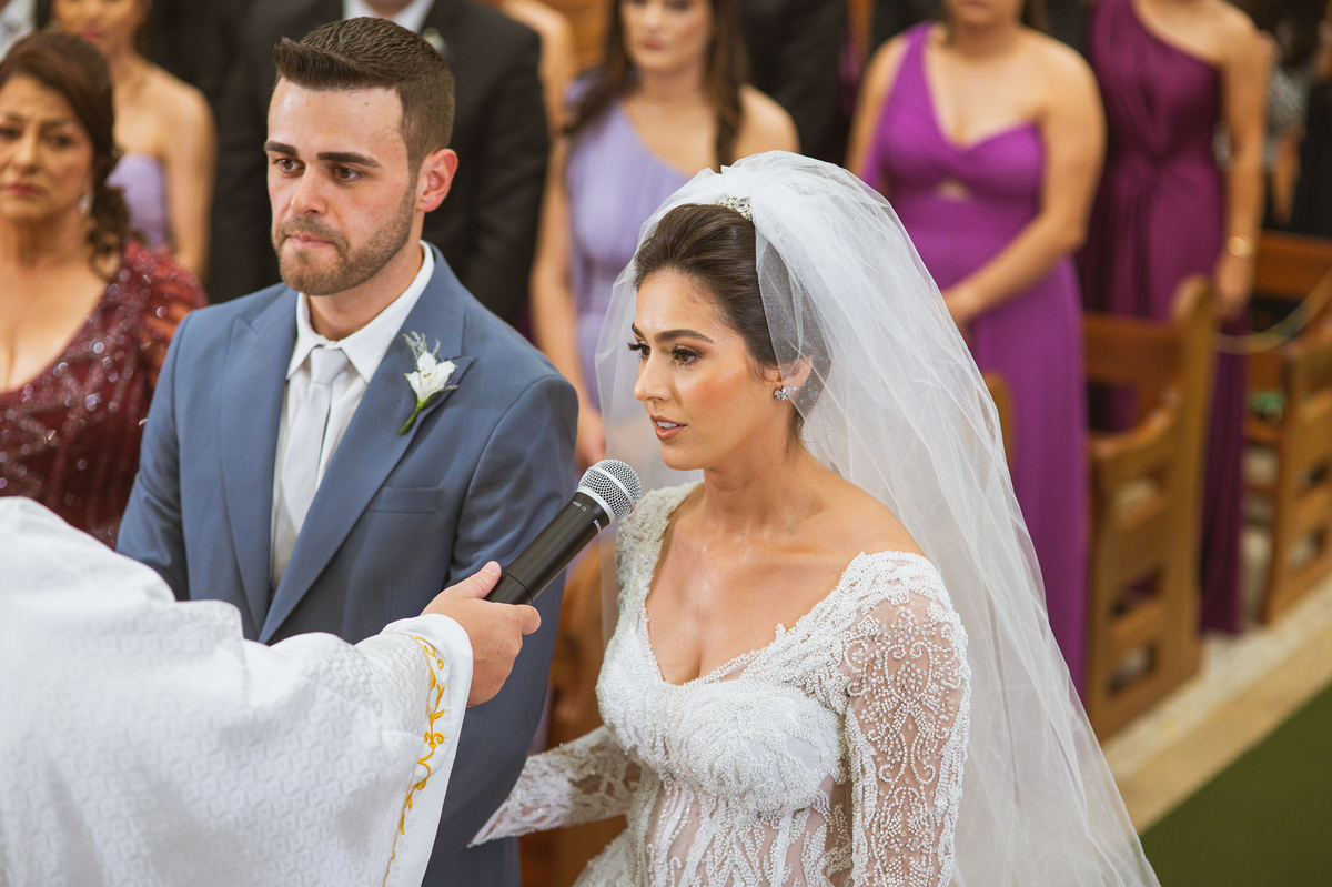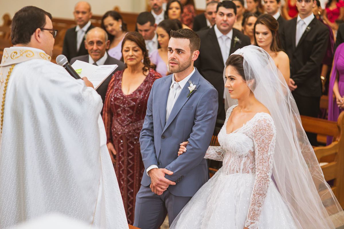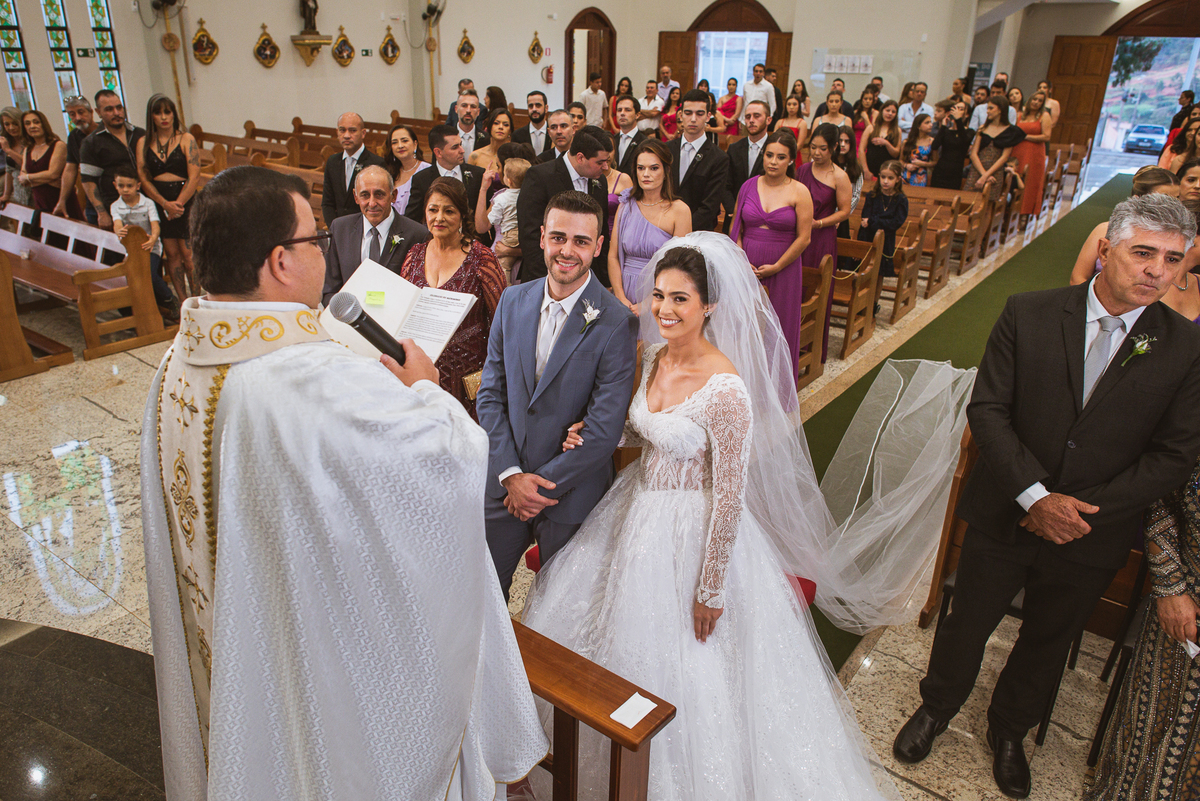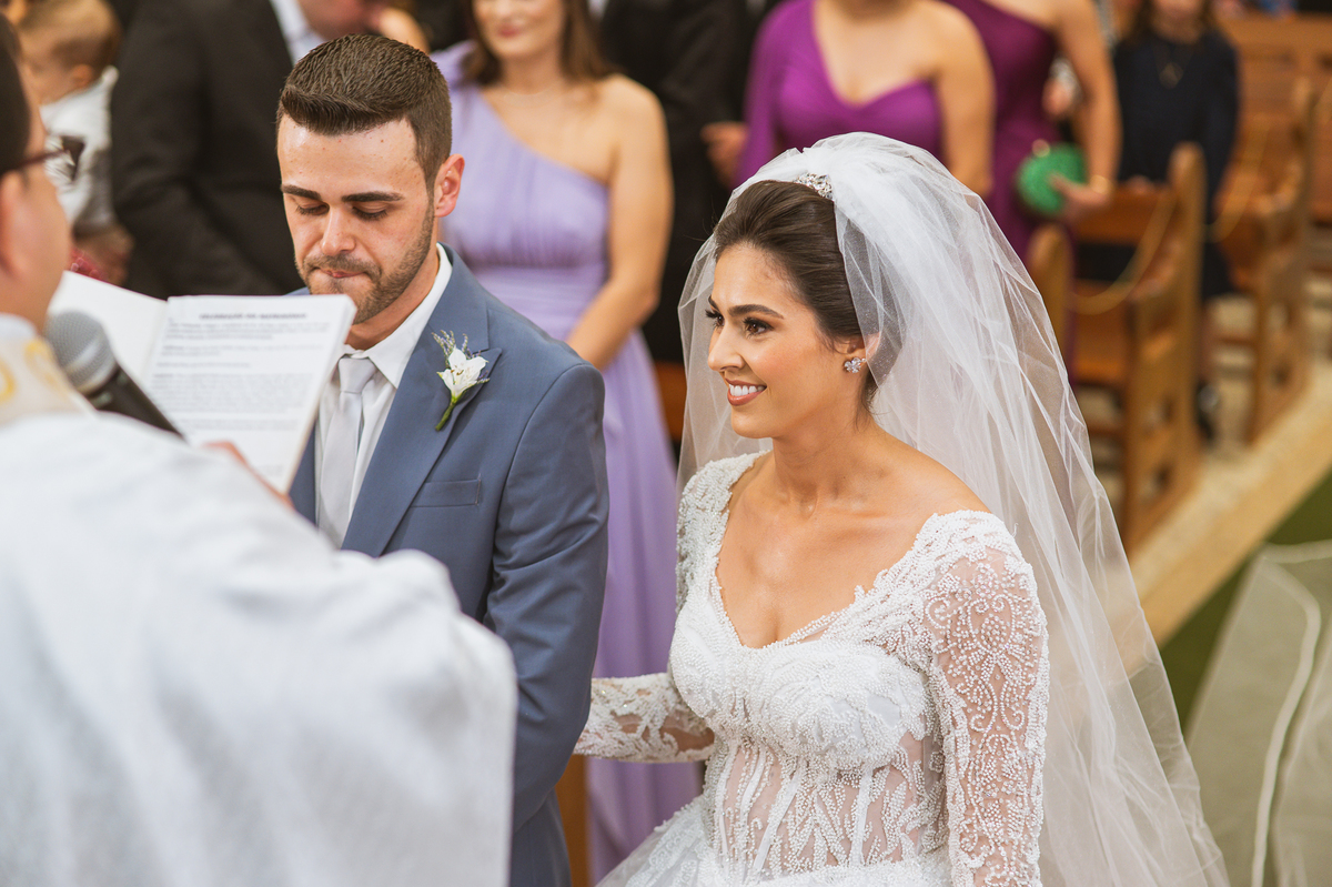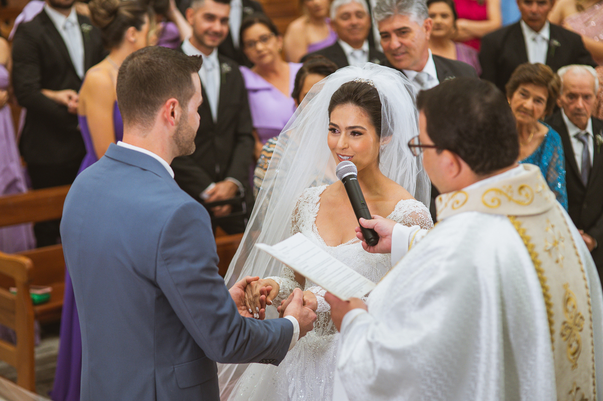 O padre os recebeu com muita alegria. Trouxe uma palavra abençoada que com toda certeza mexeu com o coração dos presentes e também dos noivos. Eles receberam as alianças, que foram ungidas com a água benta. Eles fizeram a troca de votos e também colocaram a aliança, um no dedo do outro. Com um beijo na aliança, cada um deles selou aquele momento de fé e emoção. O padre ainda convidou os presentes a erguerem as mãos abençoando os noivos. Todos oraram pelos noivos os abençoando. Os pais de ambos estavam muito emocionados. Eles participaram também da comunhão juntos. Com muita fé, os dois participaram desse momento e juntos foram abençoados. Depois, eles foram declarados casados perante Deus e assinaram os papéis do casamento.