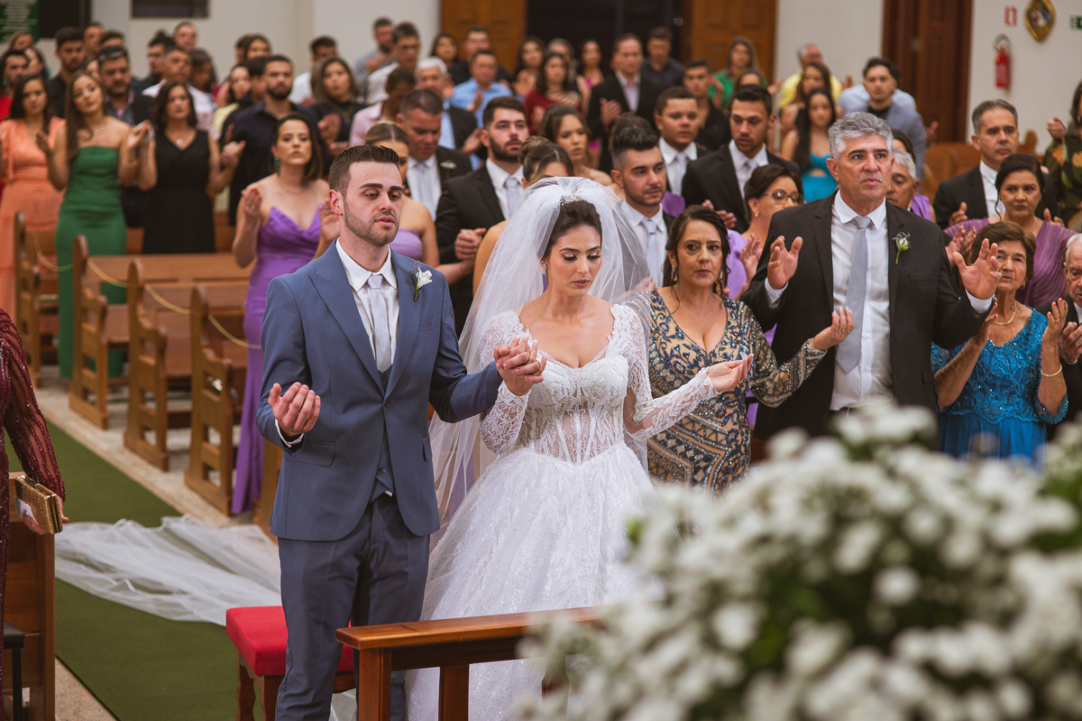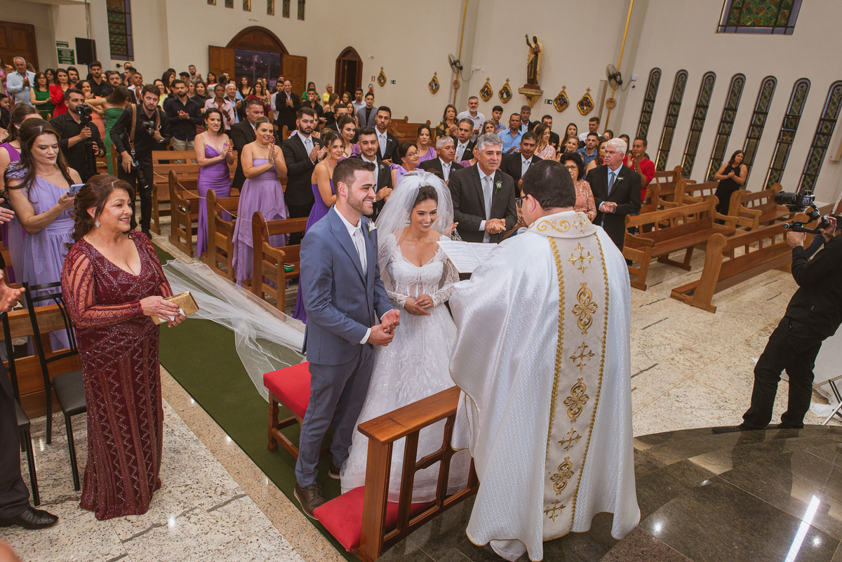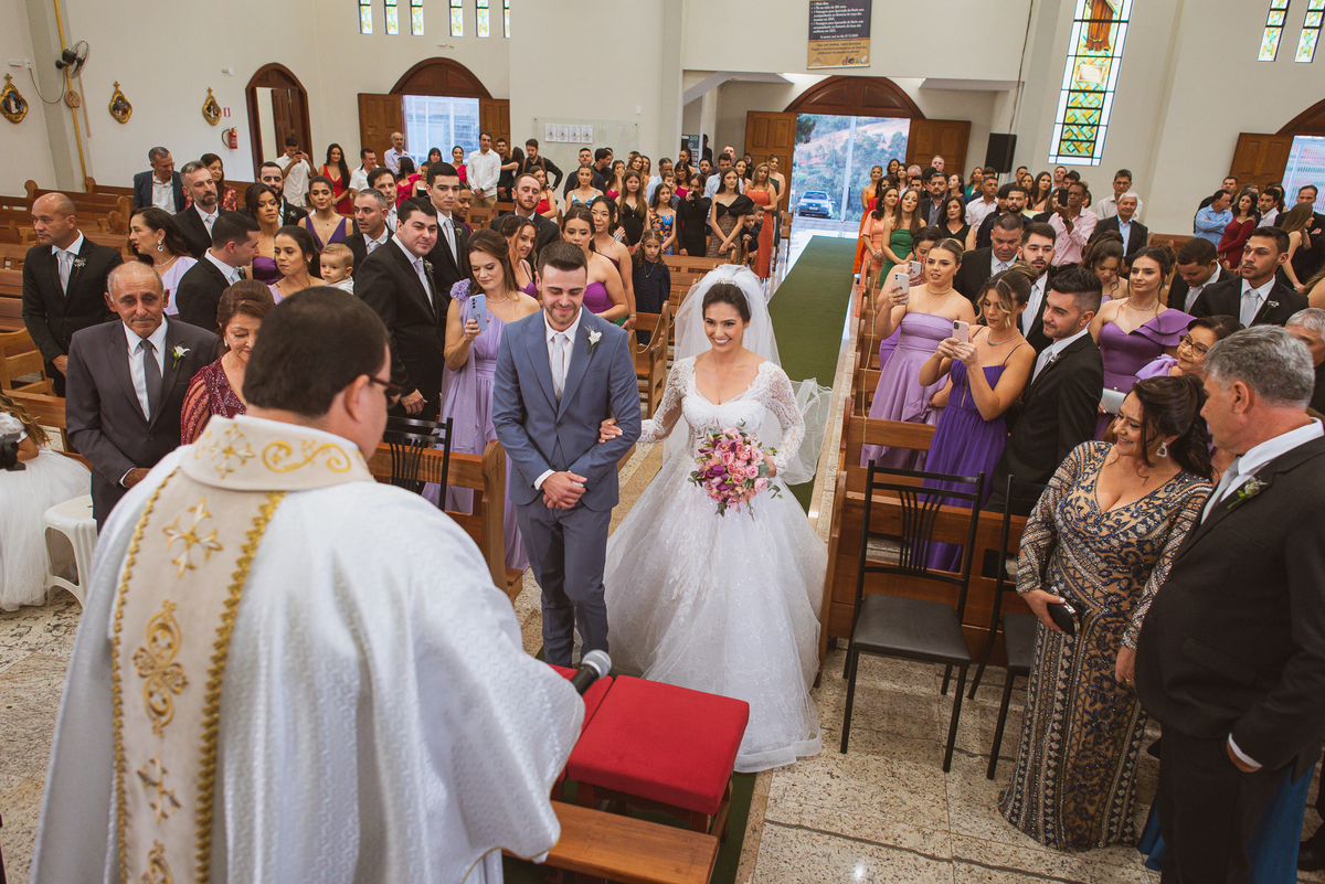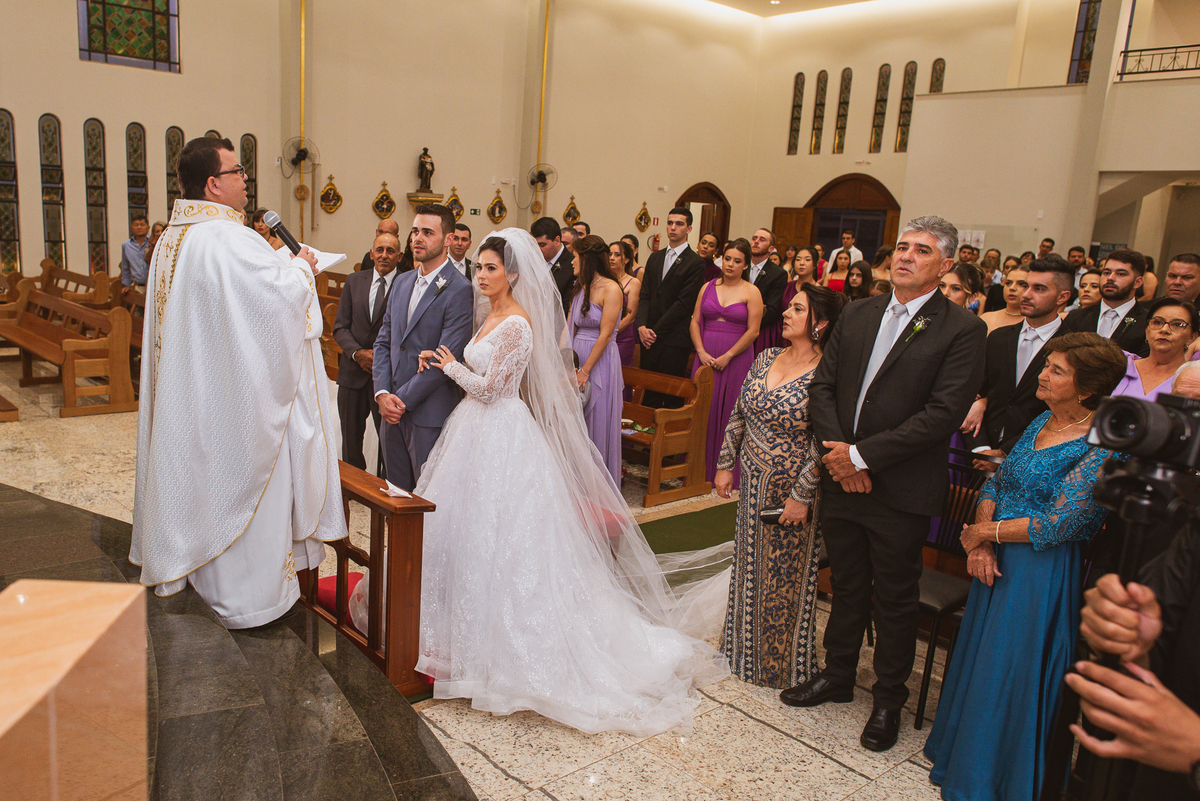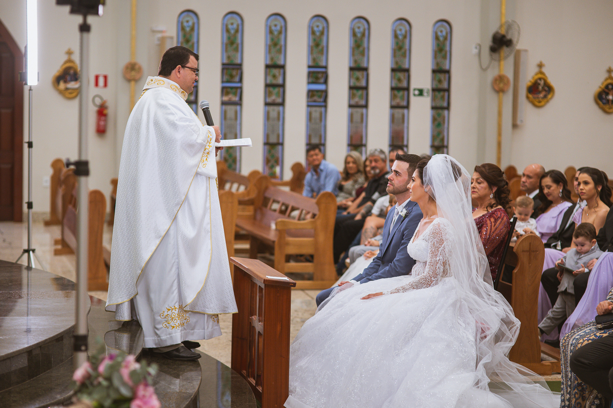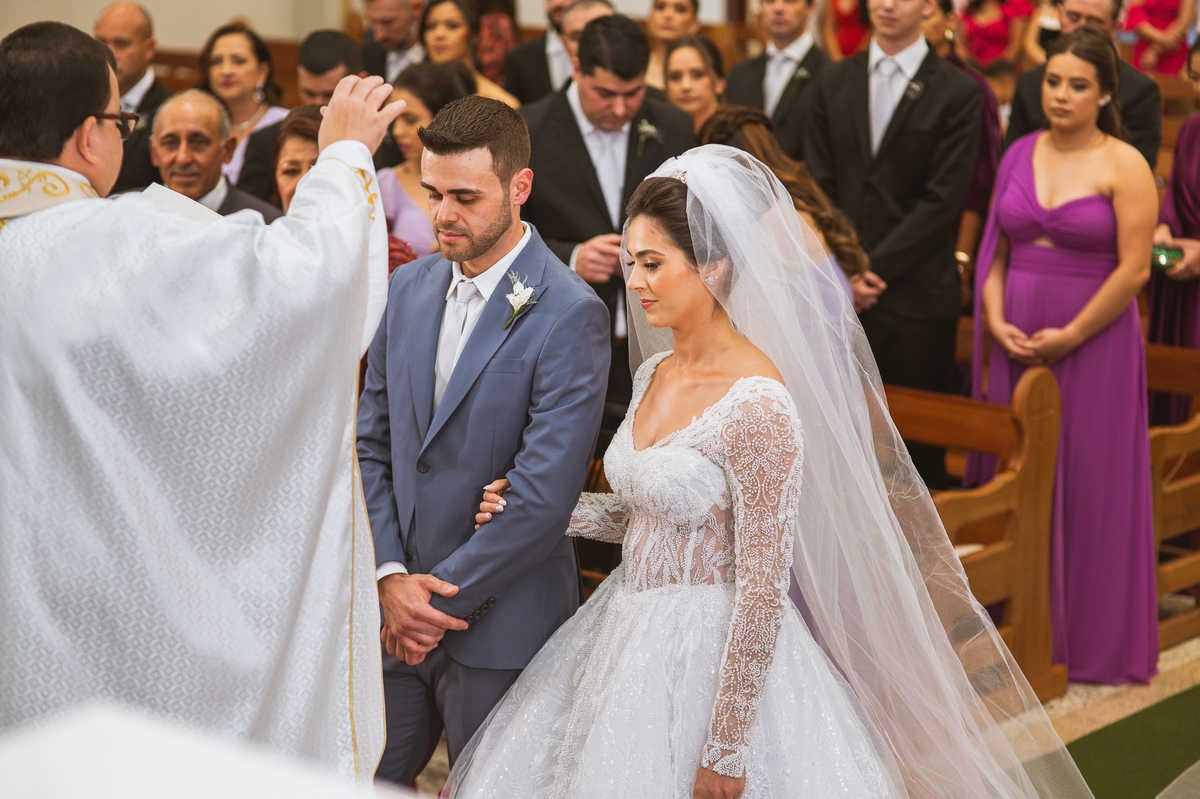 O padre os recebeu com muita alegria. Trouxe uma palavra abençoada que com toda certeza mexeu com o coração dos presentes e também dos noivos. Eles receberam as alianças, que foram ungidas com a água benta. Eles fizeram a troca de votos e também colocaram a aliança, um no dedo do outro. Com um beijo na aliança, cada um deles selou aquele momento de fé e emoção. O padre ainda convidou os presentes a erguerem as mãos abençoando os noivos. Todos oraram pelos noivos os abençoando. Os pais de ambos estavam muito emocionados. Eles participaram também da comunhão juntos. Com muita fé, os dois participaram desse momento e juntos foram abençoados. Depois, eles foram declarados casados perante Deus e assinaram os papéis do casamento.