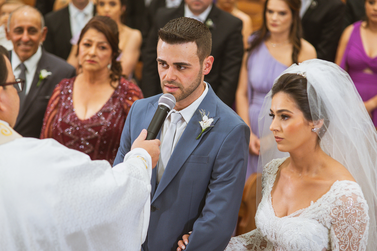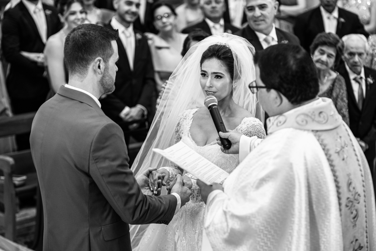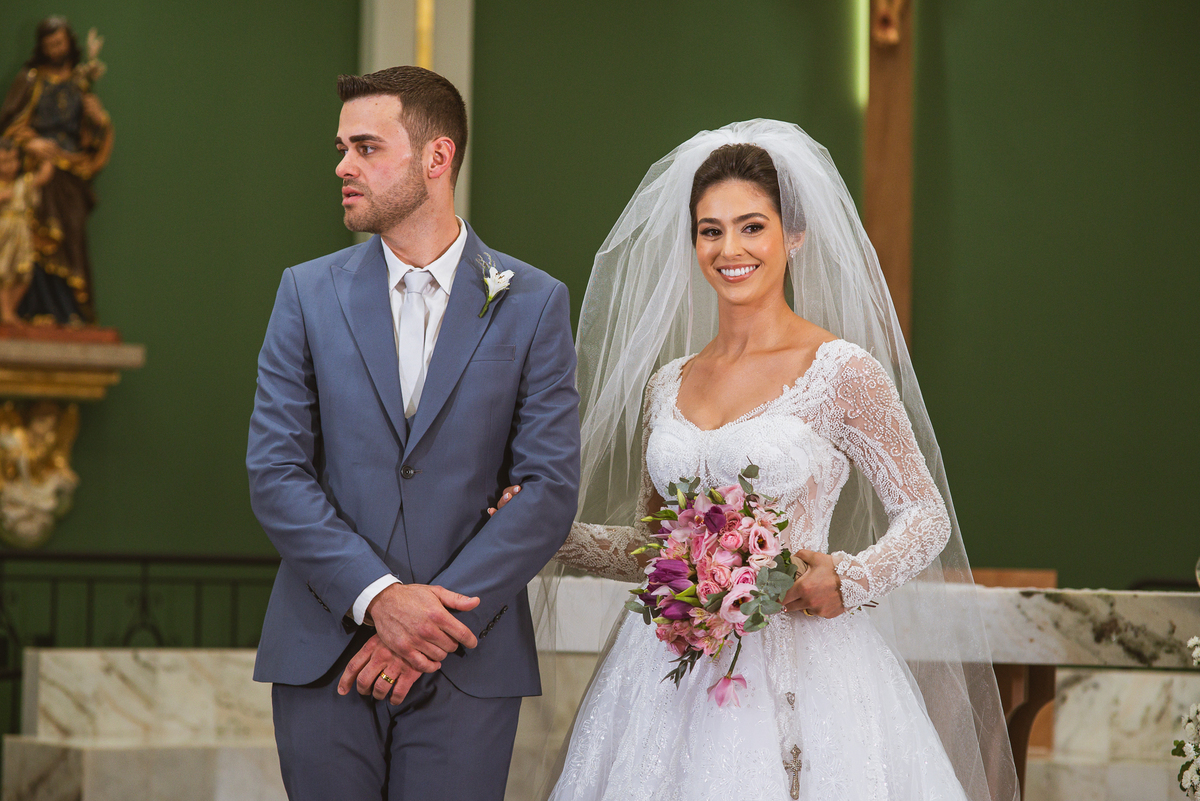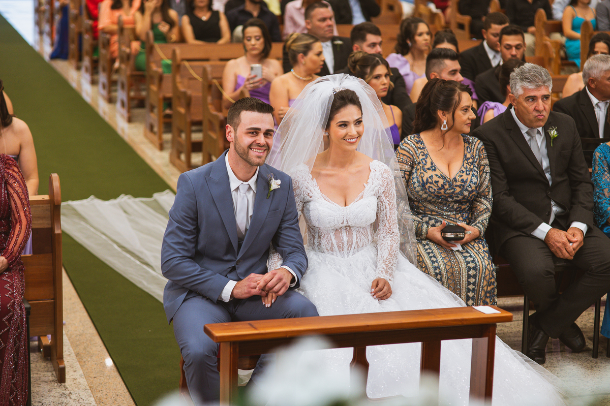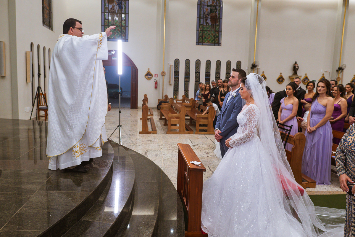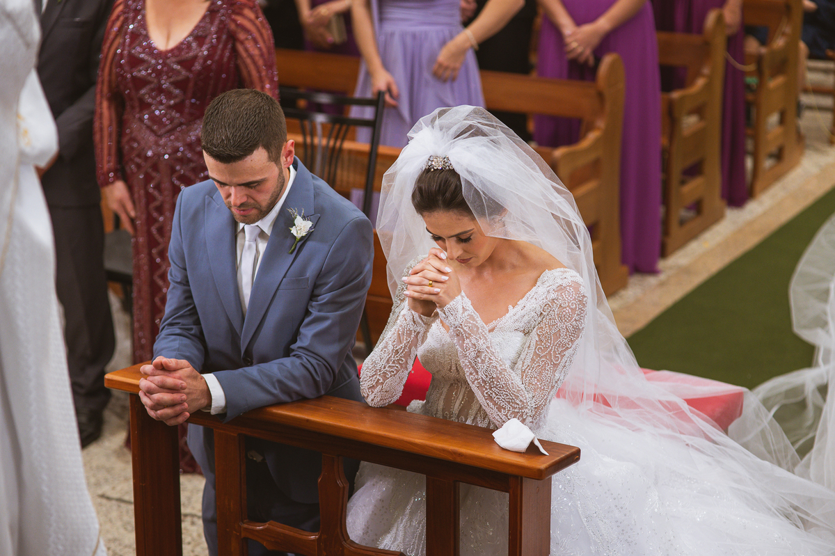 O padre os recebeu com muita alegria. Trouxe uma palavra abençoada que com toda certeza mexeu com o coração dos presentes e também dos noivos. Eles receberam as alianças, que foram ungidas com a água benta. Eles fizeram a troca de votos e também colocaram a aliança, um no dedo do outro. Com um beijo na aliança, cada um deles selou aquele momento de fé e emoção. O padre ainda convidou os presentes a erguerem as mãos abençoando os noivos. Todos oraram pelos noivos os abençoando. Os pais de ambos estavam muito emocionados. Eles participaram também da comunhão juntos. Com muita fé, os dois participaram desse momento e juntos foram abençoados. Depois, eles foram declarados casados perante Deus e assinaram os papéis do casamento.
