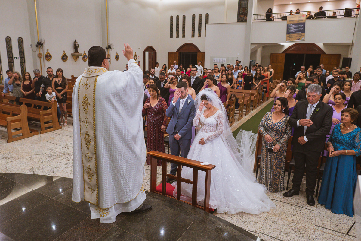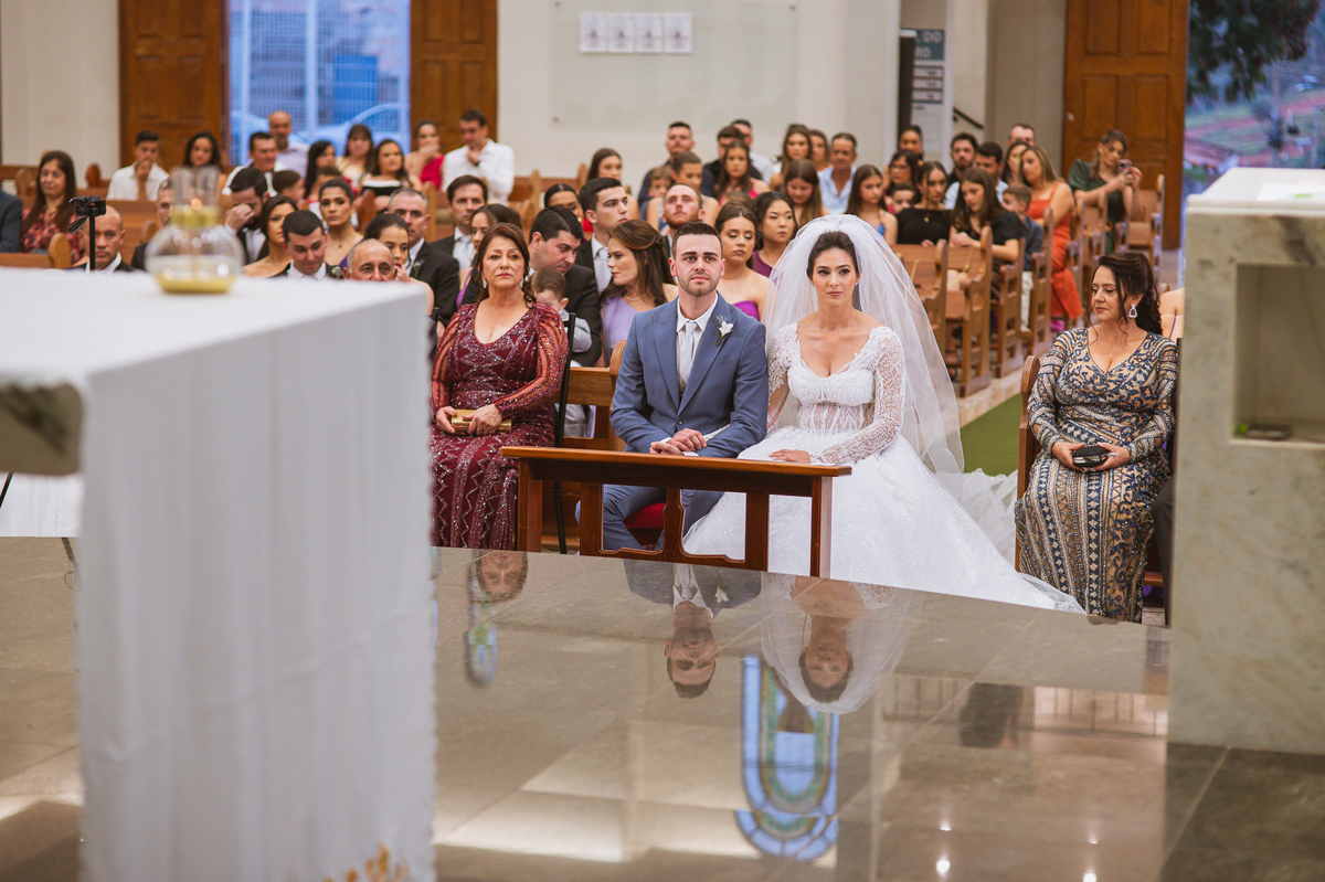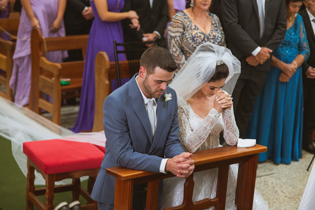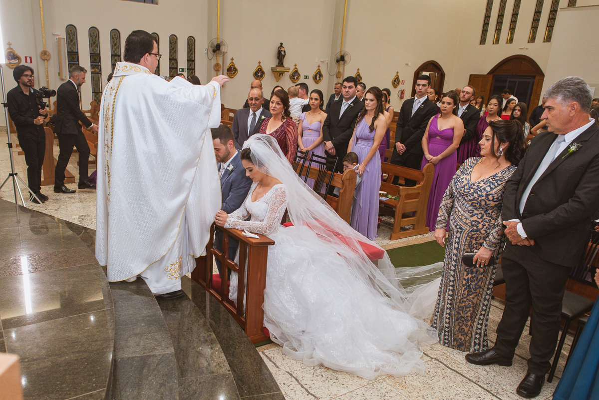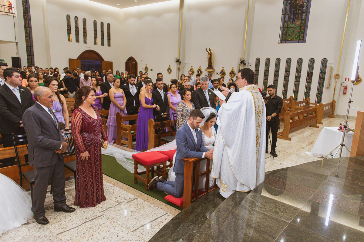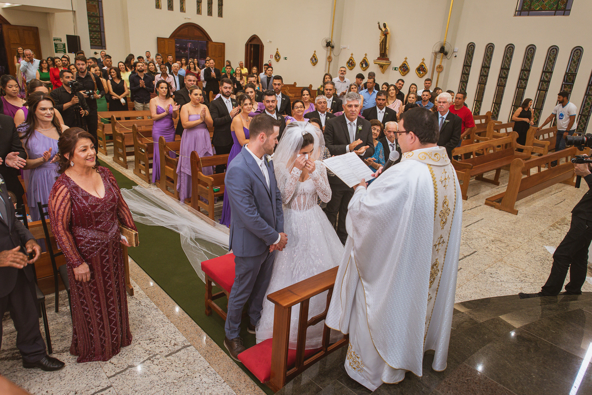 O padre os recebeu com muita alegria. Trouxe uma palavra abençoada que com toda certeza mexeu com o coração dos presentes e também dos noivos. Eles receberam as alianças, que foram ungidas com a água benta. Eles fizeram a troca de votos e também colocaram a aliança, um no dedo do outro. Com um beijo na aliança, cada um deles selou aquele momento de fé e emoção. O padre ainda convidou os presentes a erguerem as mãos abençoando os noivos. Todos oraram pelos noivos os abençoando. Os pais de ambos estavam muito emocionados. Eles participaram também da comunhão juntos. Com muita fé, os dois participaram desse momento e juntos foram abençoados. Depois, eles foram declarados casados perante Deus e assinaram os papéis do casamento.
