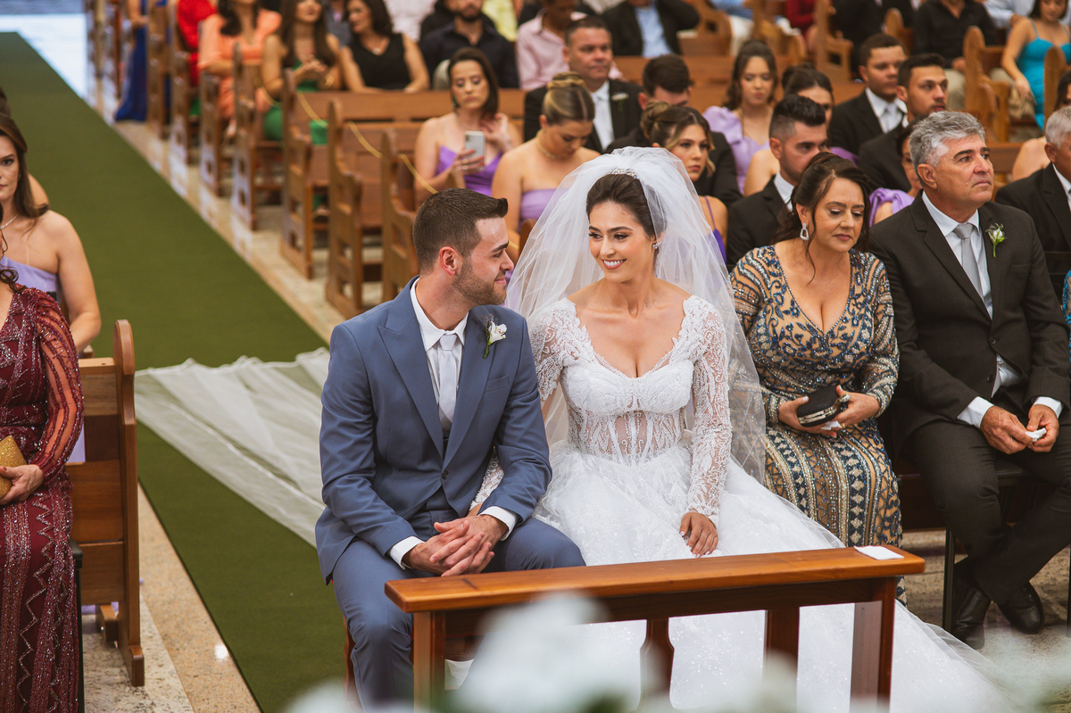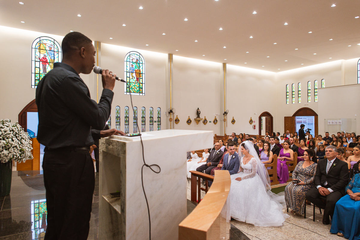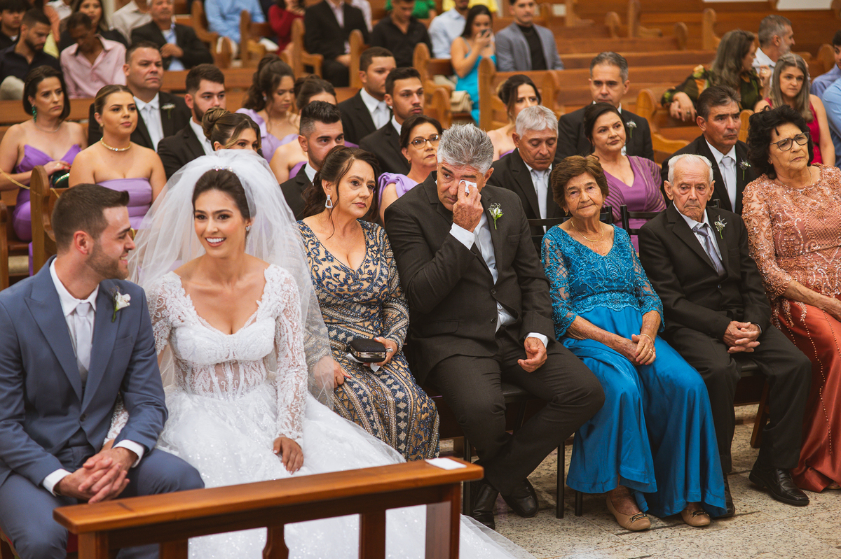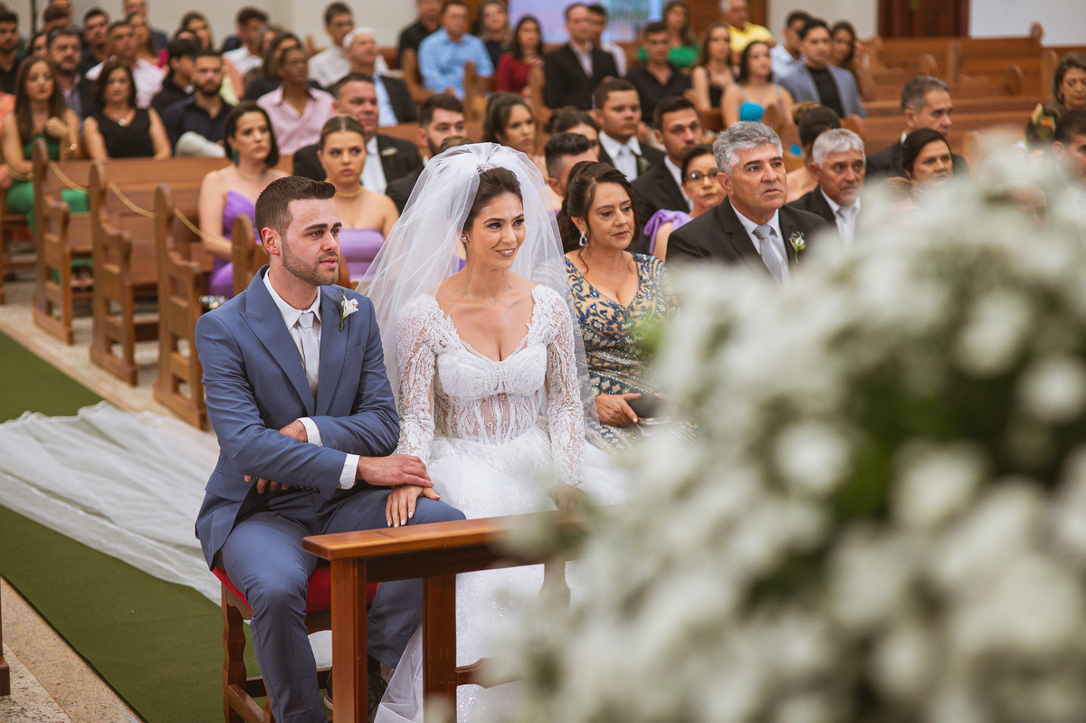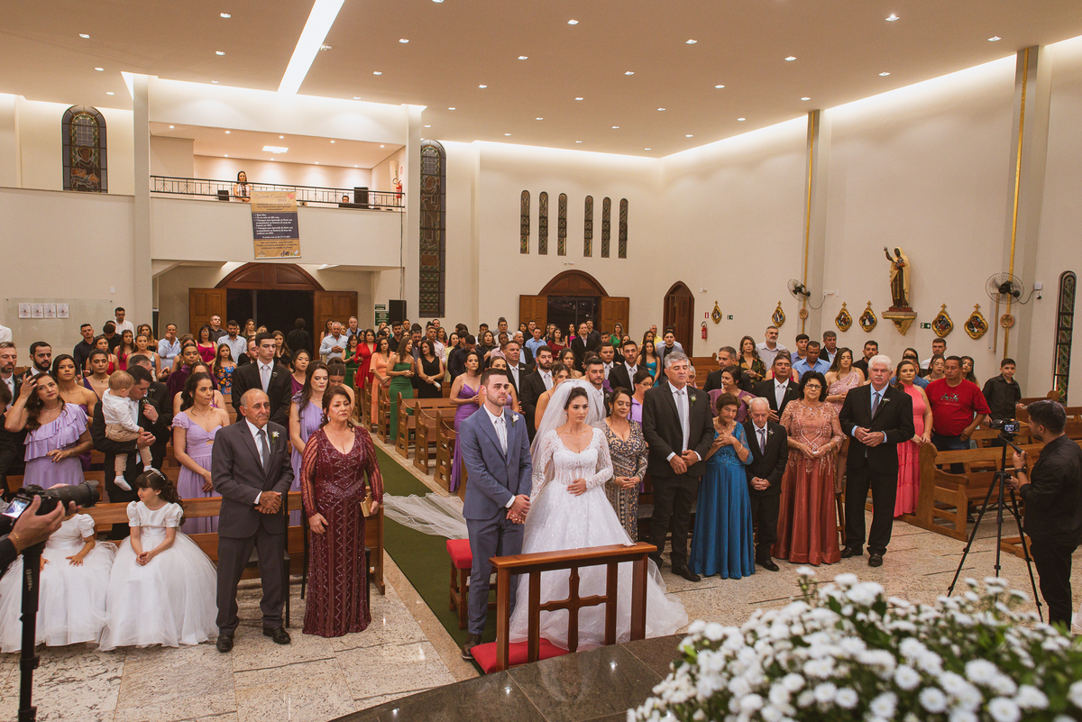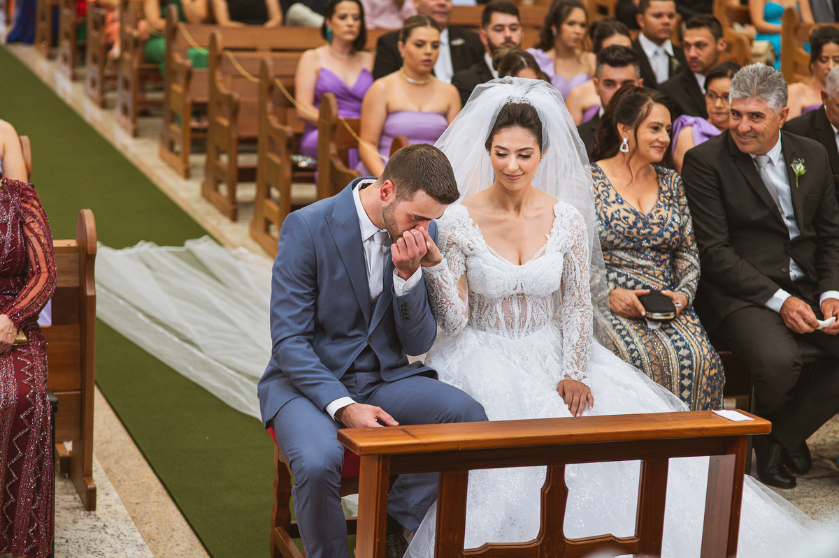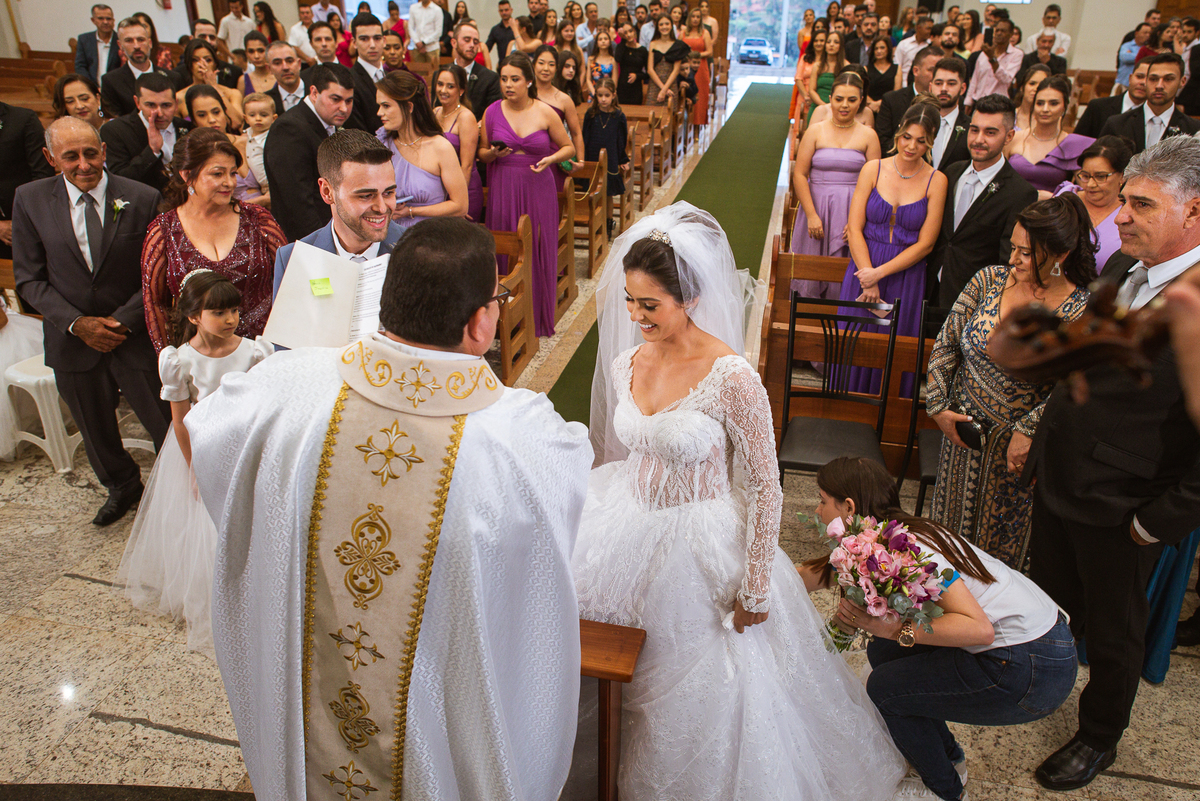 O padre os recebeu com muita alegria. Trouxe uma palavra abençoada que com toda certeza mexeu com o coração dos presentes e também dos noivos. Eles receberam as alianças, que foram ungidas com a água benta. Eles fizeram a troca de votos e também colocaram a aliança, um no dedo do outro. Com um beijo na aliança, cada um deles selou aquele momento de fé e emoção. O padre ainda convidou os presentes a erguerem as mãos abençoando os noivos. Todos oraram pelos noivos os abençoando. Os pais de ambos estavam muito emocionados. Eles participaram também da comunhão juntos. Com muita fé, os dois participaram desse momento e juntos foram abençoados. Depois, eles foram declarados casados perante Deus e assinaram os papéis do casamento.
