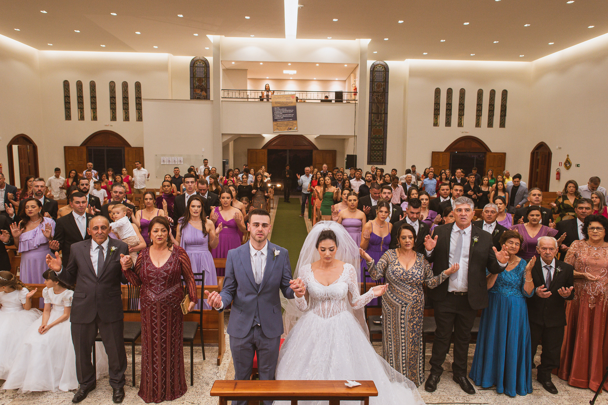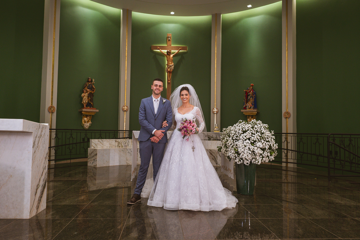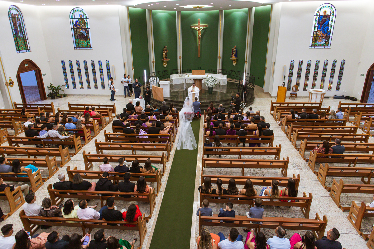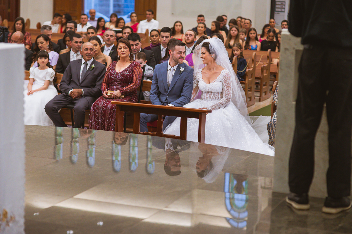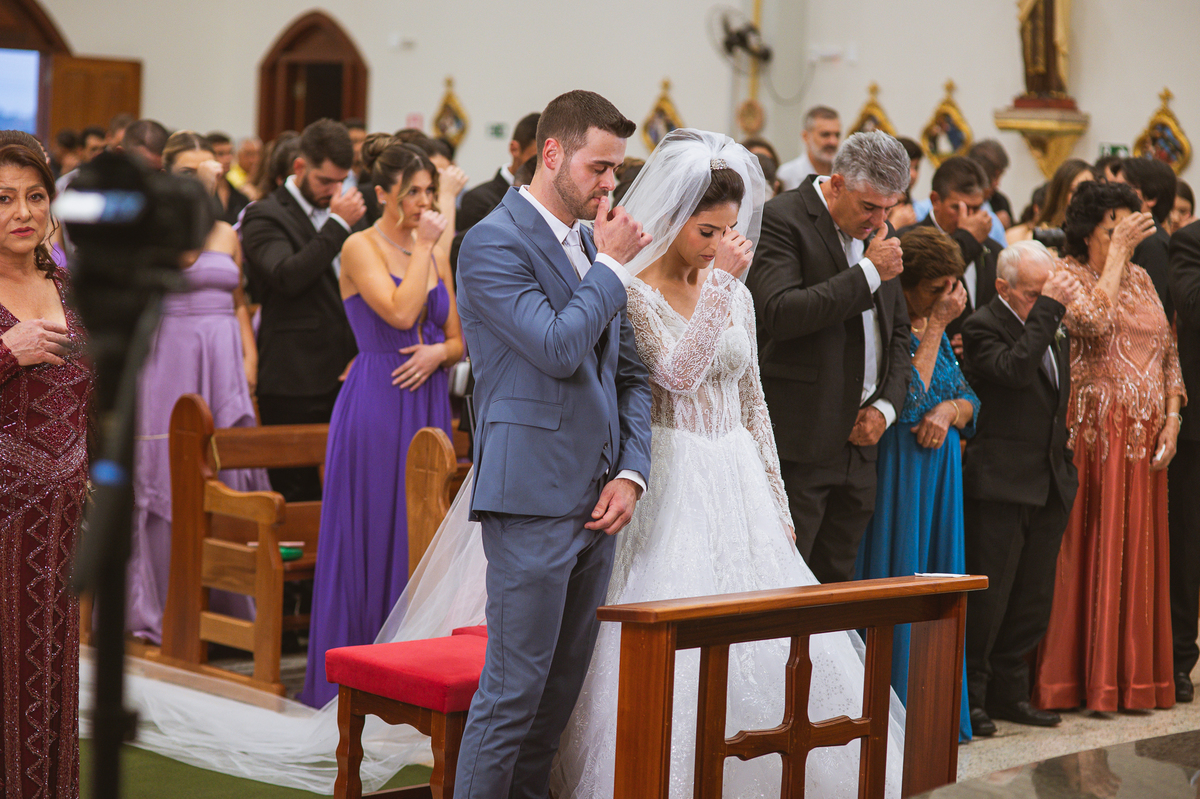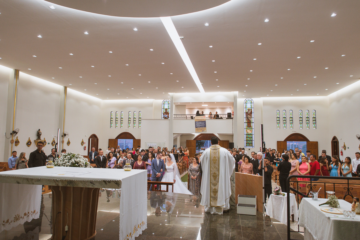 O padre os recebeu com muita alegria. Trouxe uma palavra abençoada que com toda certeza mexeu com o coração dos presentes e também dos noivos. Eles receberam as alianças, que foram ungidas com a água benta. Eles fizeram a troca de votos e também colocaram a aliança, um no dedo do outro. Com um beijo na aliança, cada um deles selou aquele momento de fé e emoção. O padre ainda convidou os presentes a erguerem as mãos abençoando os noivos. Todos oraram pelos noivos os abençoando. Os pais de ambos estavam muito emocionados. Eles participaram também da comunhão juntos. Com muita fé, os dois participaram desse momento e juntos foram abençoados. Depois, eles foram declarados casados perante Deus e assinaram os papéis do casamento.