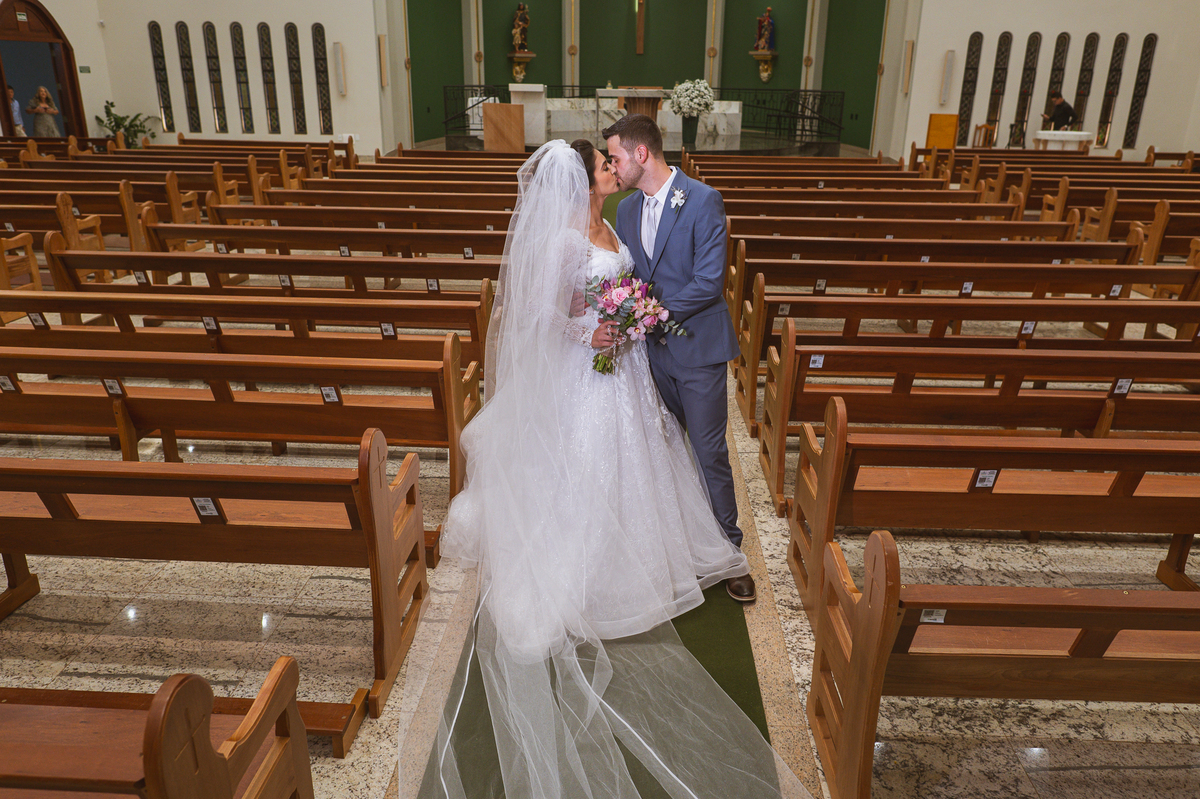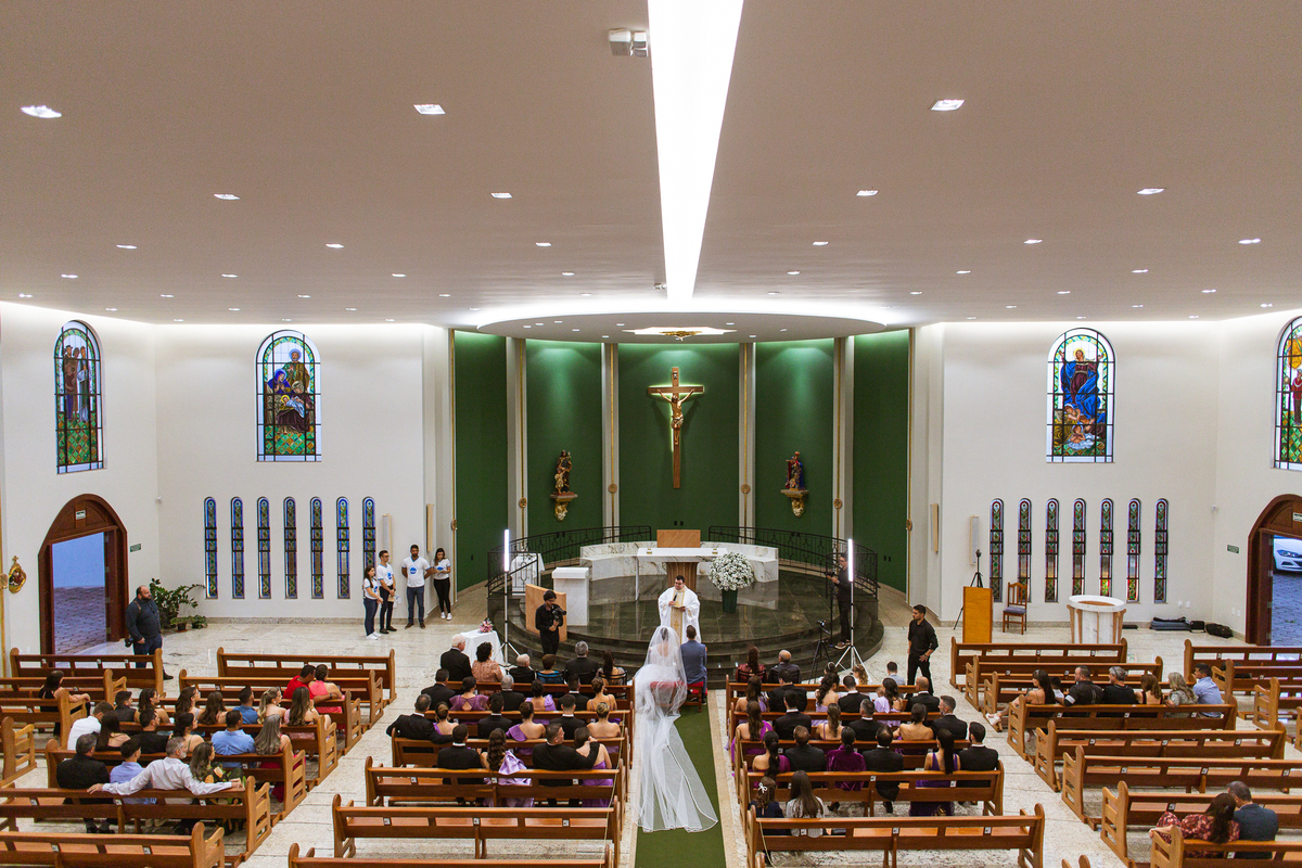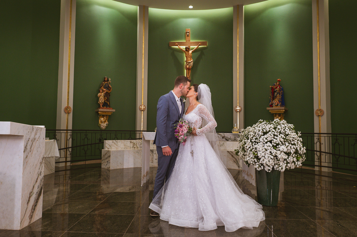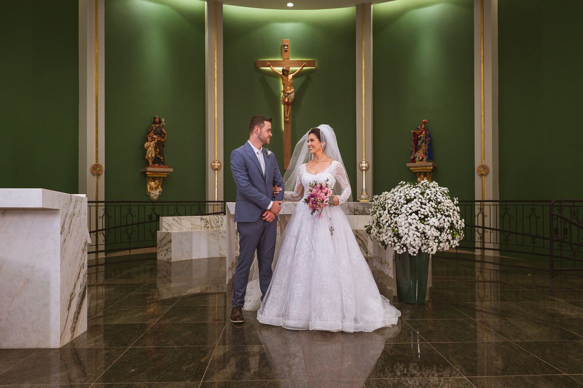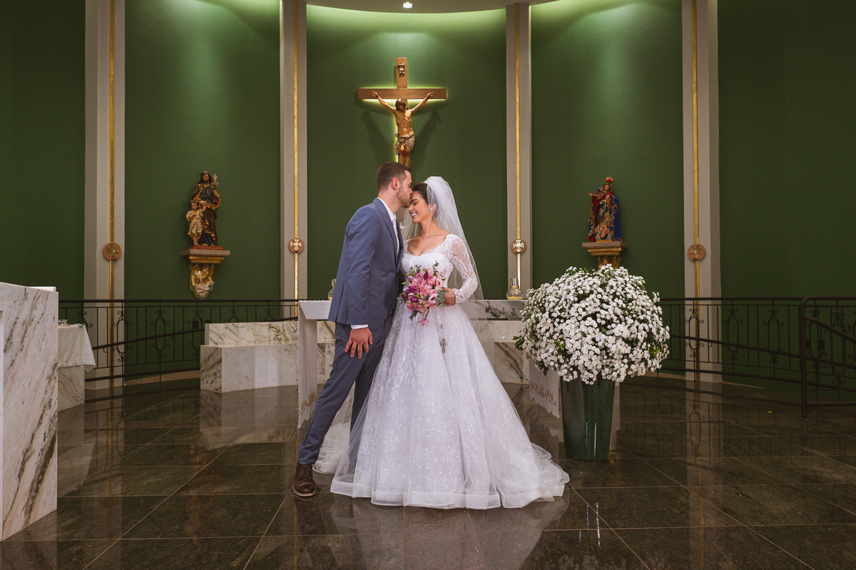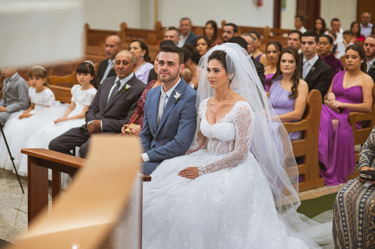 O padre os recebeu com muita alegria. Trouxe uma palavra abençoada que com toda certeza mexeu com o coração dos presentes e também dos noivos. Eles receberam as alianças, que foram ungidas com a água benta. Eles fizeram a troca de votos e também colocaram a aliança, um no dedo do outro. Com um beijo na aliança, cada um deles selou aquele momento de fé e emoção. O padre ainda convidou os presentes a erguerem as mãos abençoando os noivos. Todos oraram pelos noivos os abençoando. Os pais de ambos estavam muito emocionados. Eles participaram também da comunhão juntos. Com muita fé, os dois participaram desse momento e juntos foram abençoados. Depois, eles foram declarados casados perante Deus e assinaram os papéis do casamento.