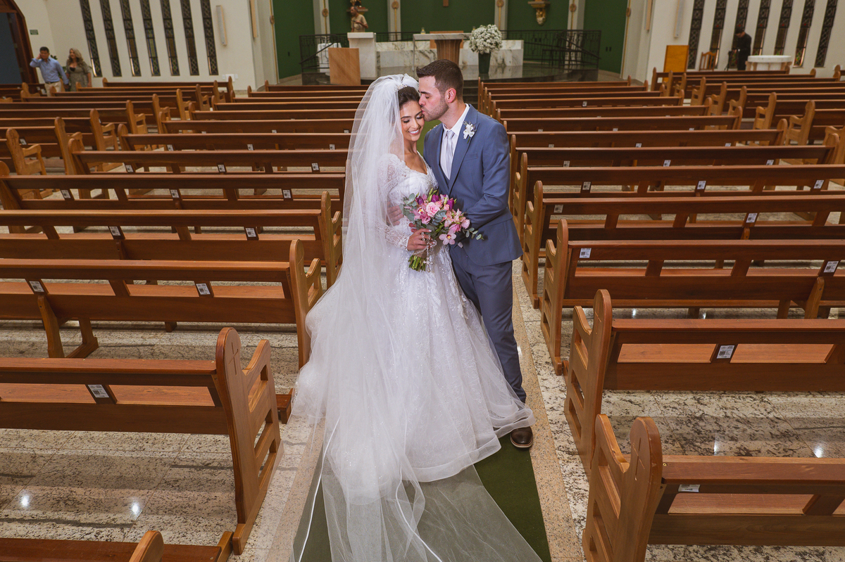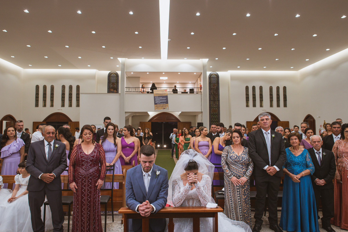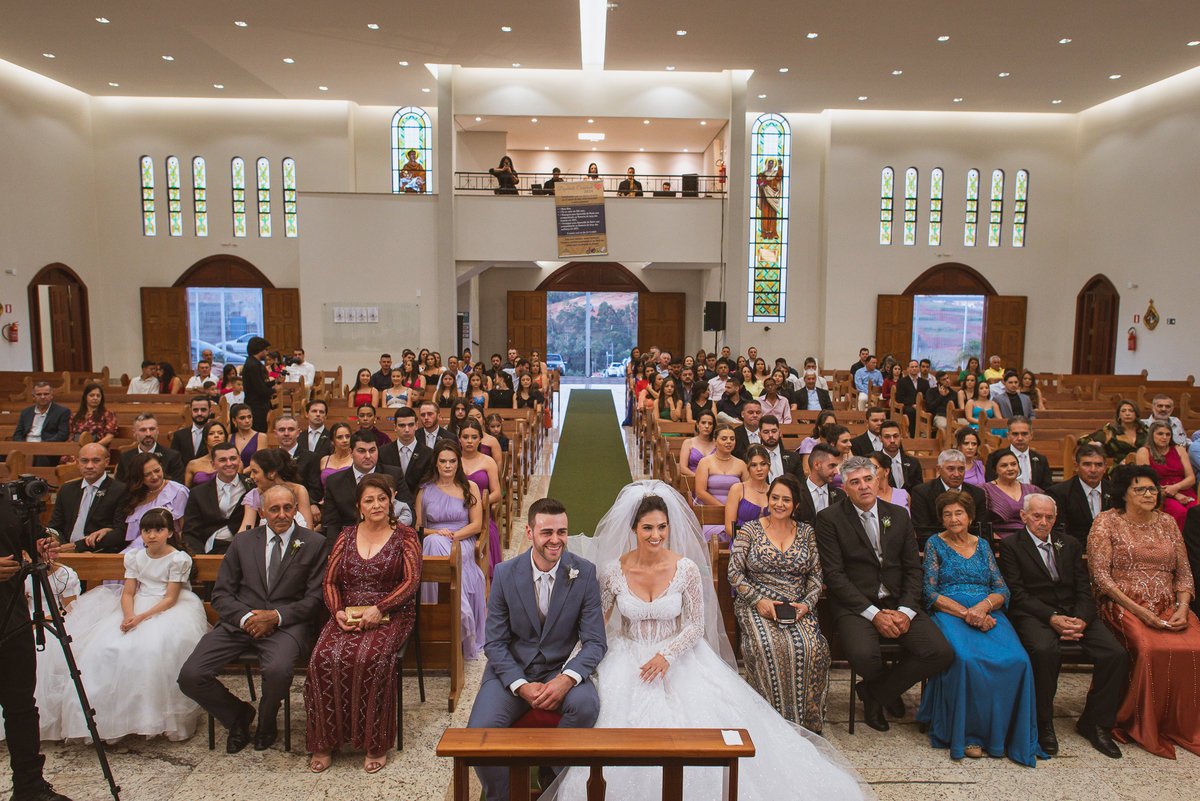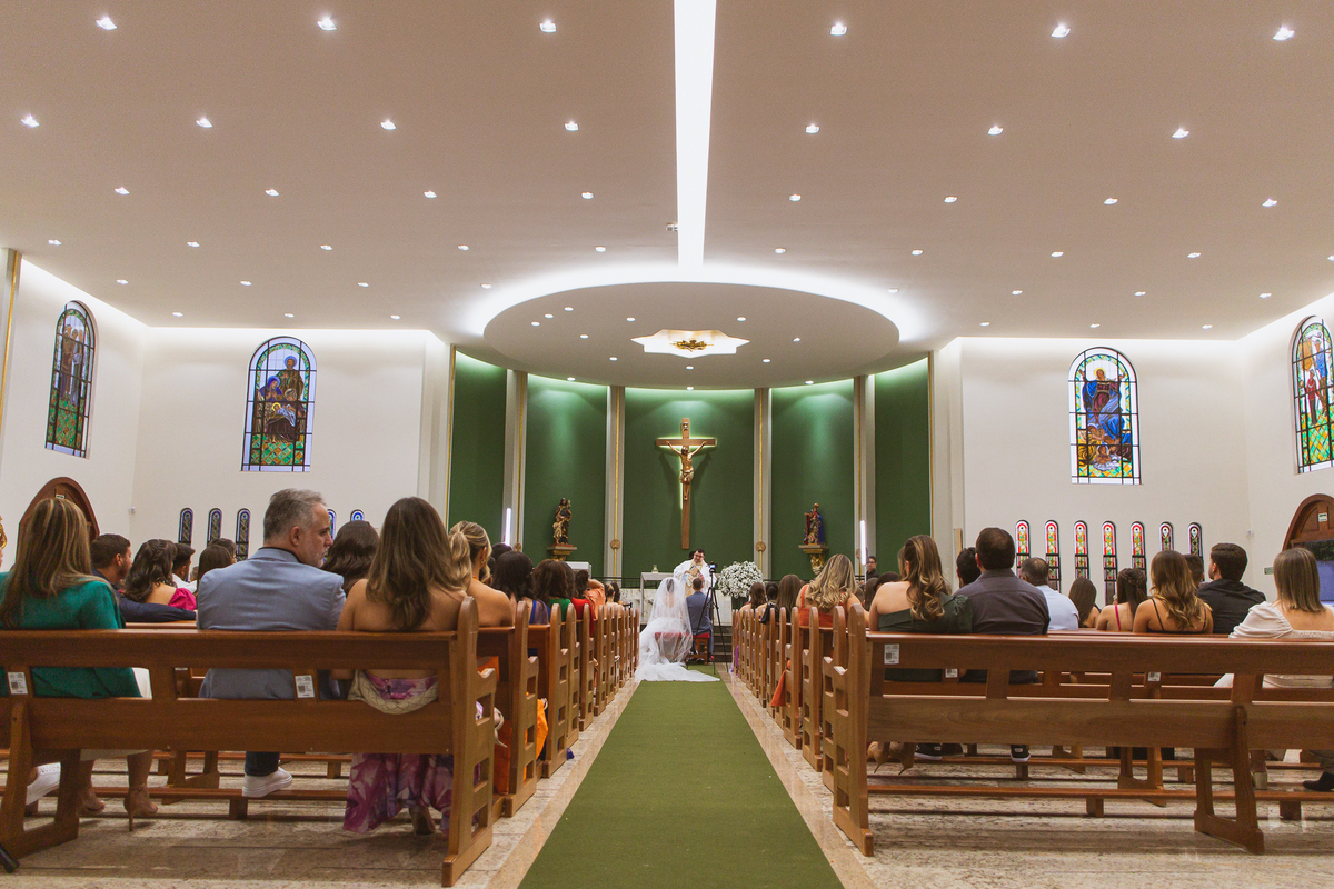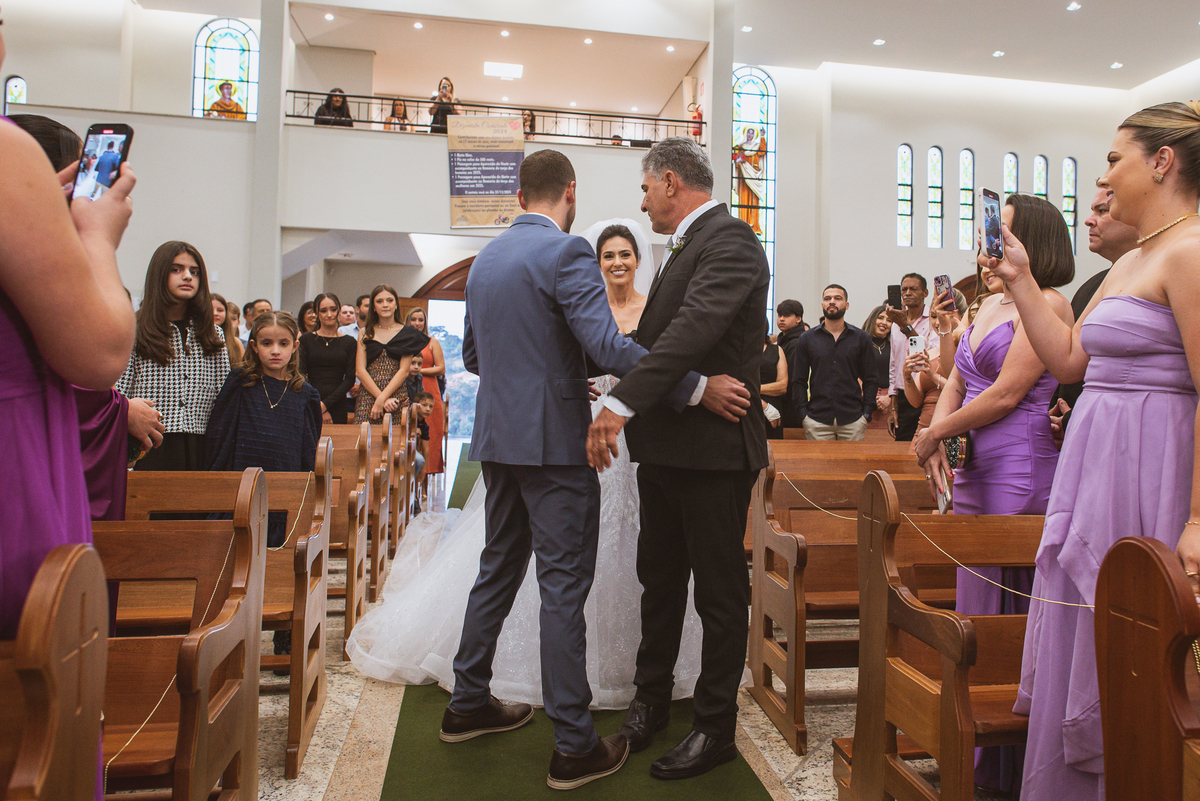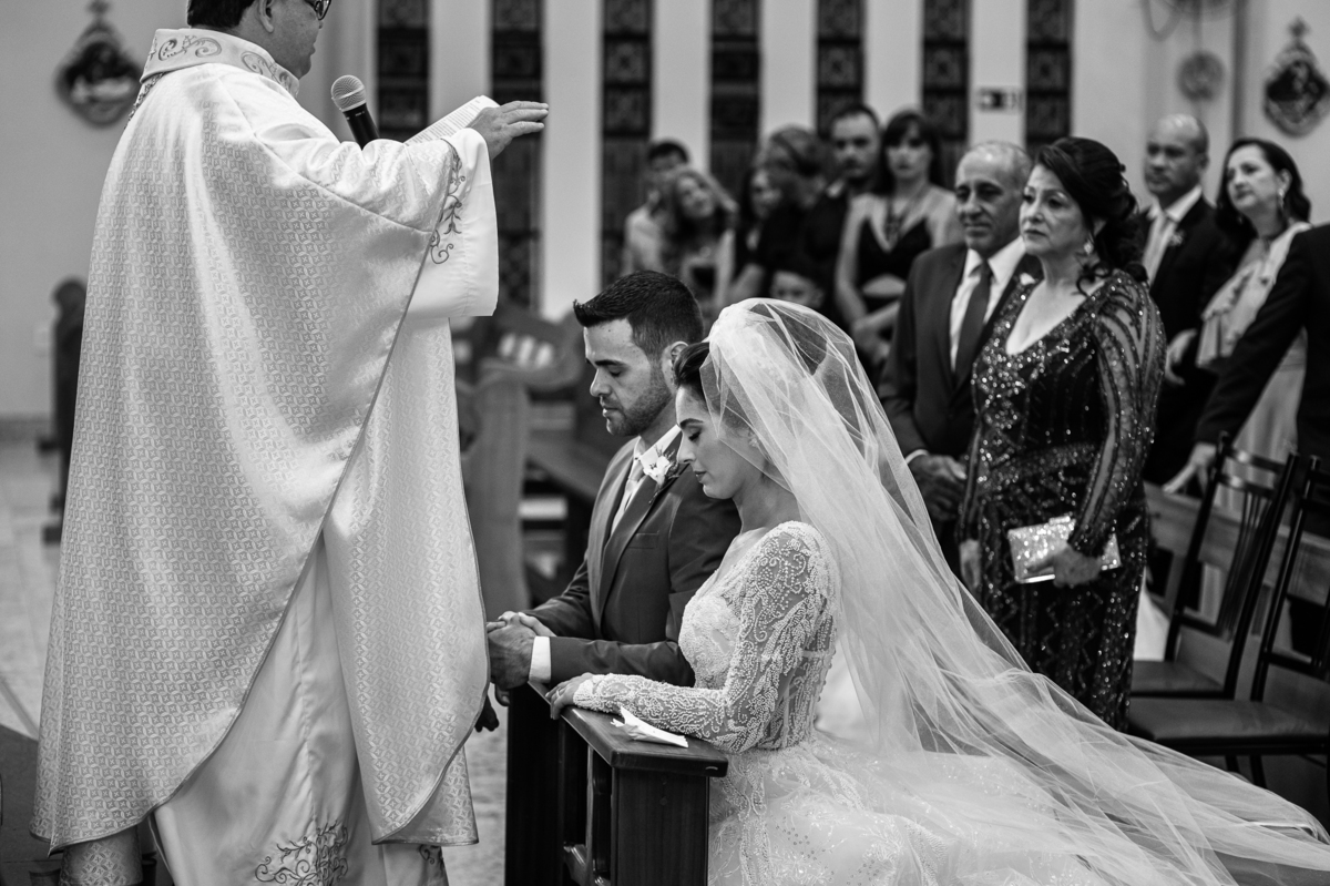 O padre os recebeu com muita alegria. Trouxe uma palavra abençoada que com toda certeza mexeu com o coração dos presentes e também dos noivos. Eles receberam as alianças, que foram ungidas com a água benta. Eles fizeram a troca de votos e também colocaram a aliança, um no dedo do outro. Com um beijo na aliança, cada um deles selou aquele momento de fé e emoção. O padre ainda convidou os presentes a erguerem as mãos abençoando os noivos. Todos oraram pelos noivos os abençoando. Os pais de ambos estavam muito emocionados. Eles participaram também da comunhão juntos. Com muita fé, os dois participaram desse momento e juntos foram abençoados. Depois, eles foram declarados casados perante Deus e assinaram os papéis do casamento.