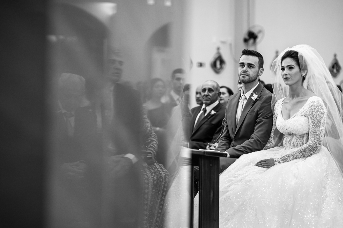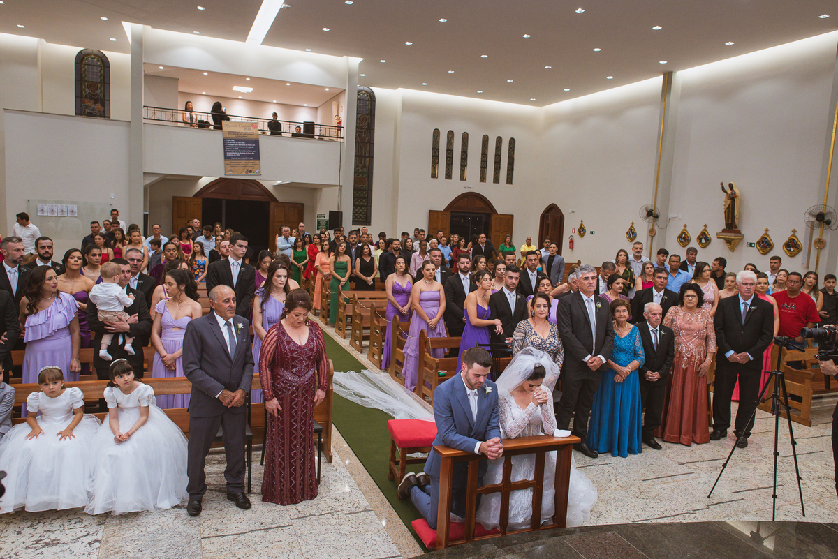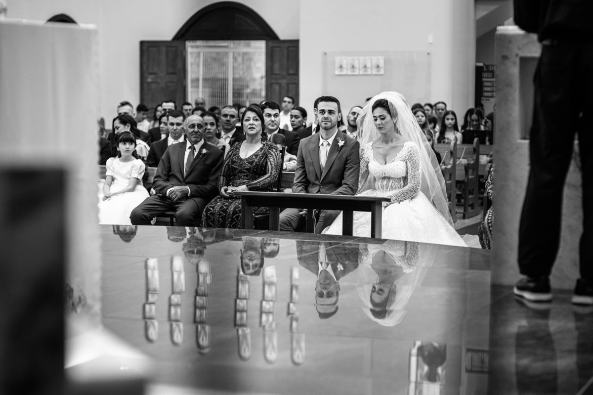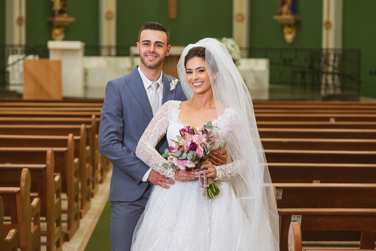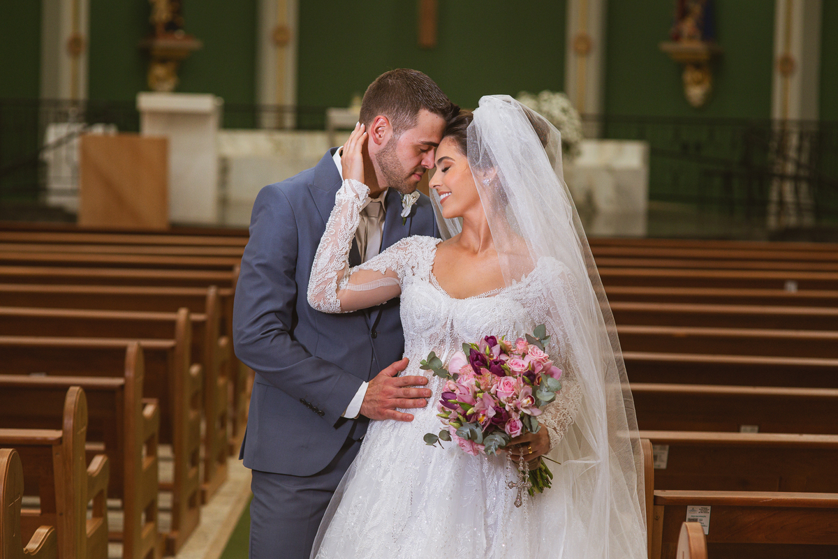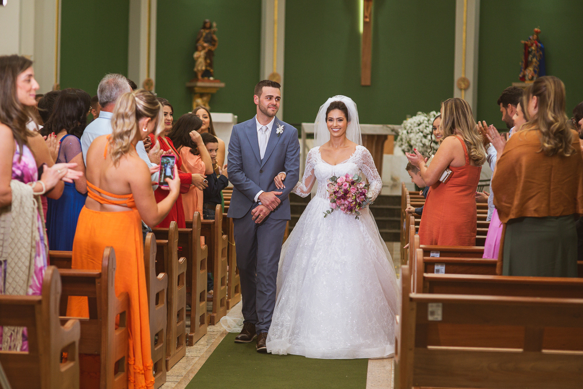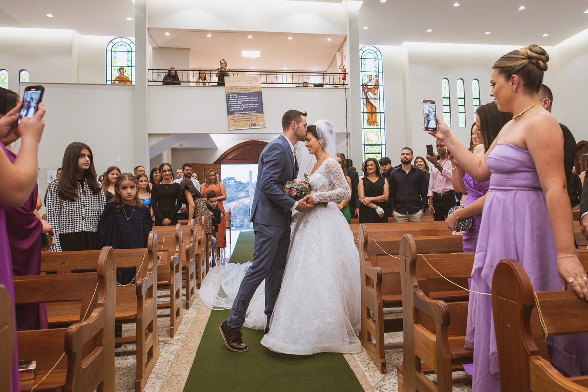 O padre os recebeu com muita alegria. Trouxe uma palavra abençoada que com toda certeza mexeu com o coração dos presentes e também dos noivos. Eles receberam as alianças, que foram ungidas com a água benta. Eles fizeram a troca de votos e também colocaram a aliança, um no dedo do outro. Com um beijo na aliança, cada um deles selou aquele momento de fé e emoção. O padre ainda convidou os presentes a erguerem as mãos abençoando os noivos. Todos oraram pelos noivos os abençoando. Os pais de ambos estavam muito emocionados. Eles participaram também da comunhão juntos. Com muita fé, os dois participaram desse momento e juntos foram abençoados. Depois, eles foram declarados casados perante Deus e assinaram os papéis do casamento.