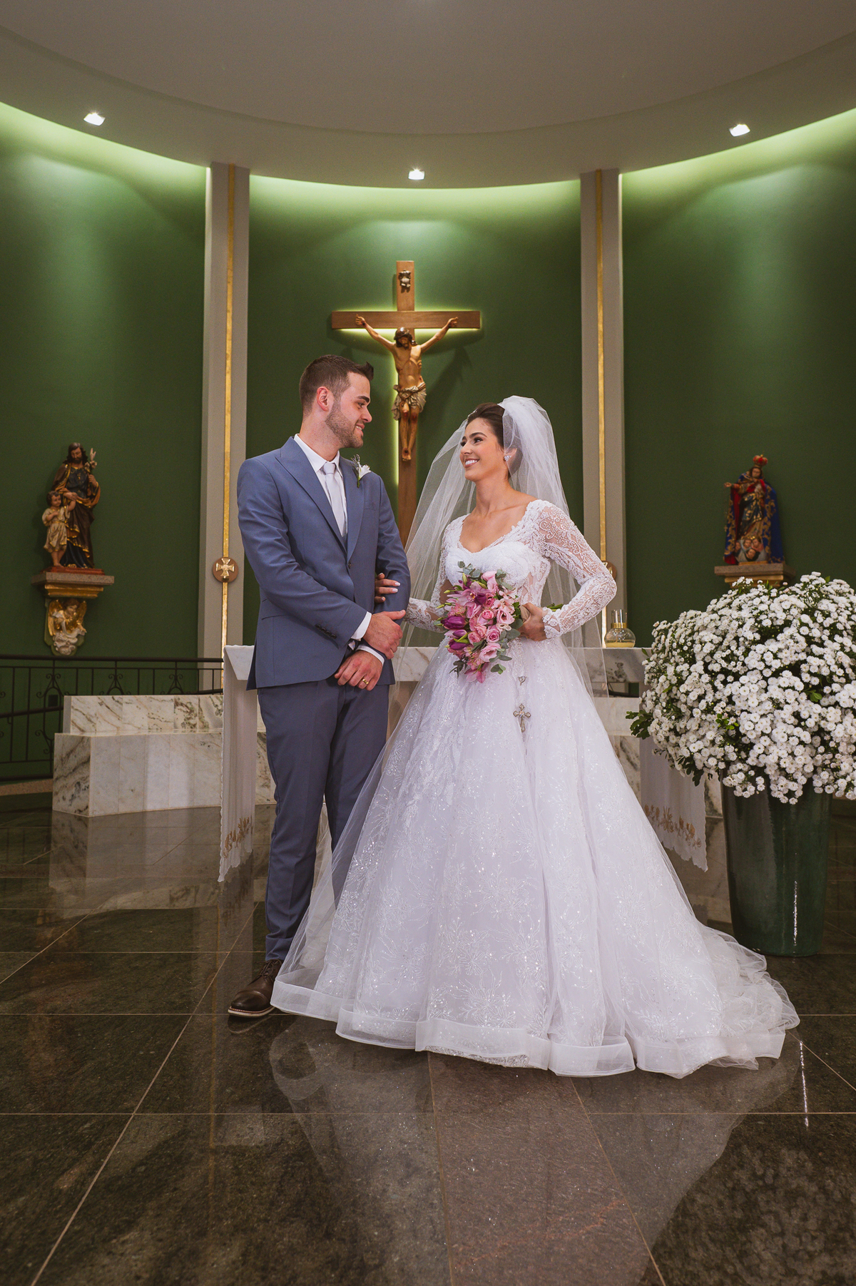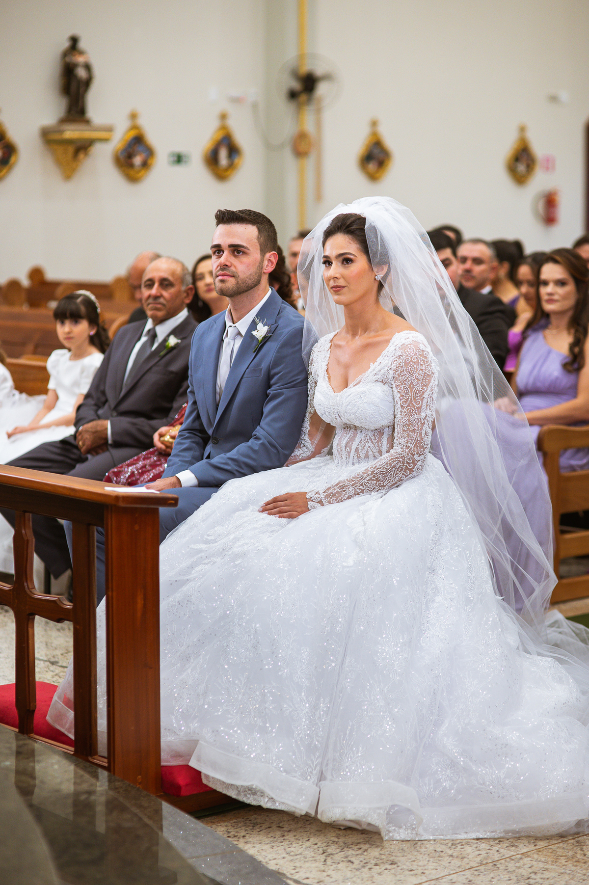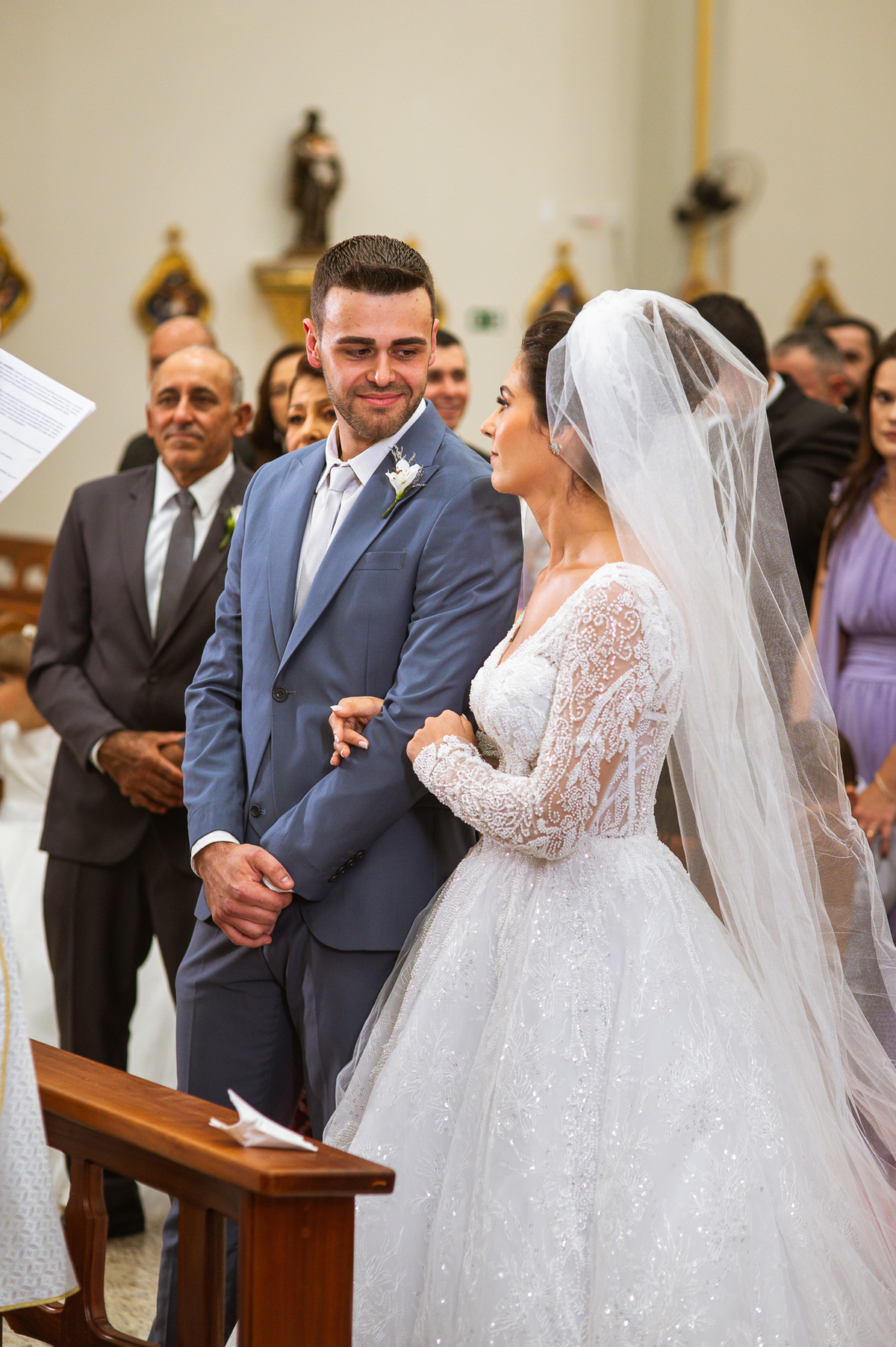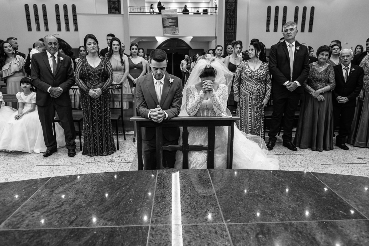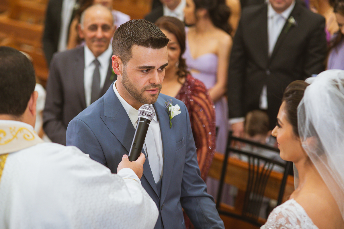 O padre os recebeu com muita alegria. Trouxe uma palavra abençoada que com toda certeza mexeu com o coração dos presentes e também dos noivos. Eles receberam as alianças, que foram ungidas com a água benta. Eles fizeram a troca de votos e também colocaram a aliança, um no dedo do outro. Com um beijo na aliança, cada um deles selou aquele momento de fé e emoção. O padre ainda convidou os presentes a erguerem as mãos abençoando os noivos. Todos oraram pelos noivos os abençoando. Os pais de ambos estavam muito emocionados. Eles participaram também da comunhão juntos. Com muita fé, os dois participaram desse momento e juntos foram abençoados. Depois, eles foram declarados casados perante Deus e assinaram os papéis do casamento.