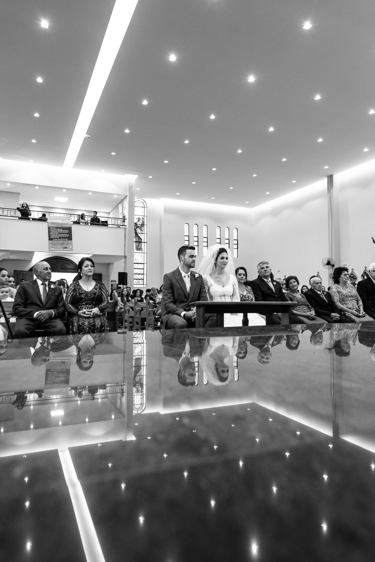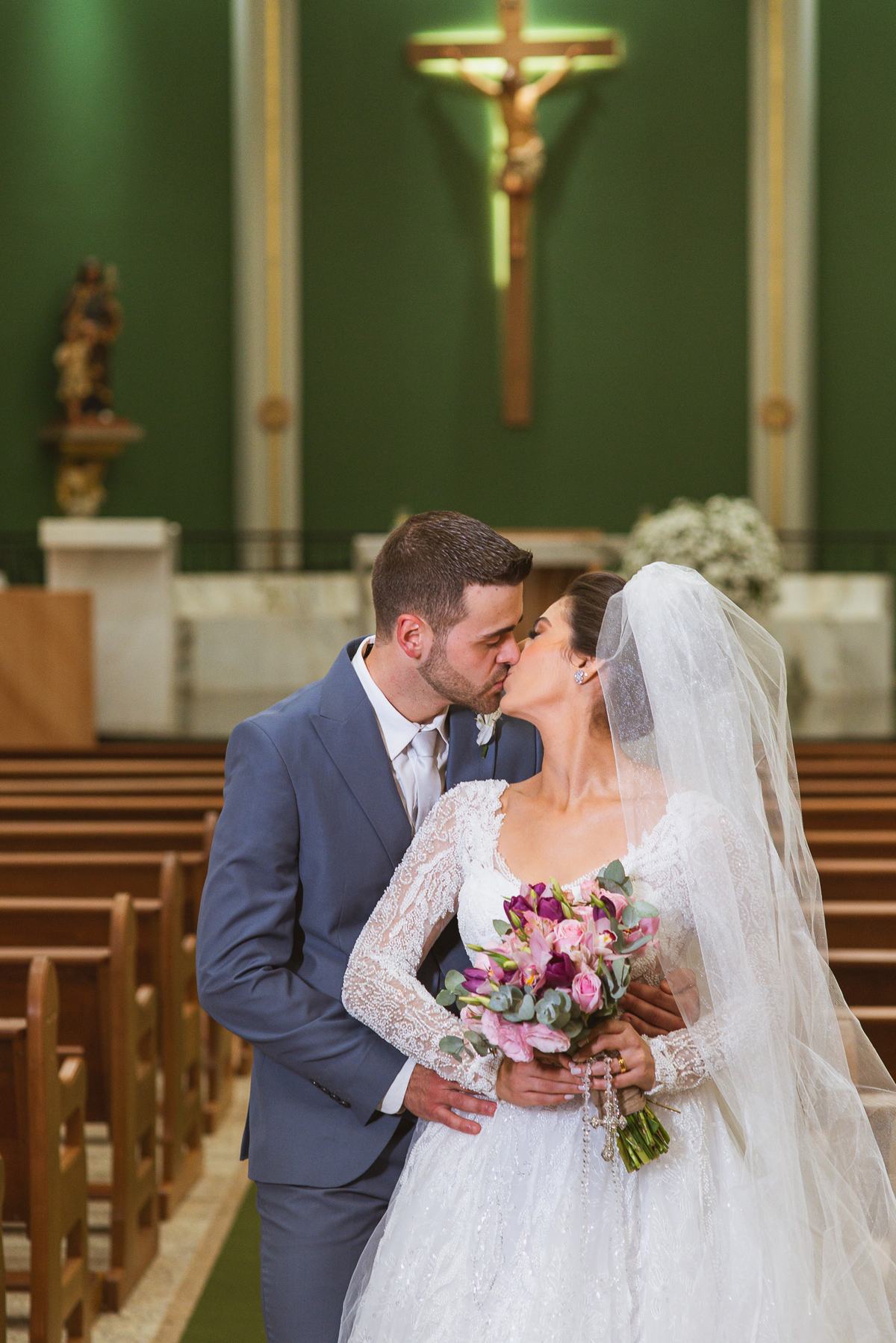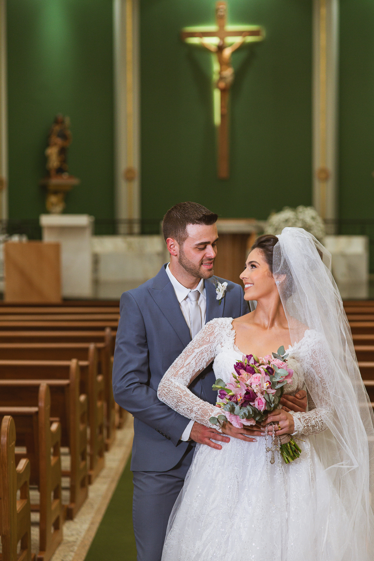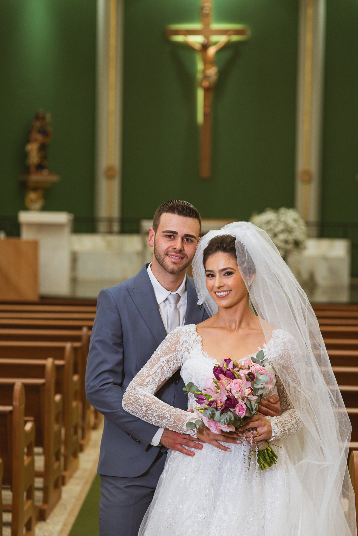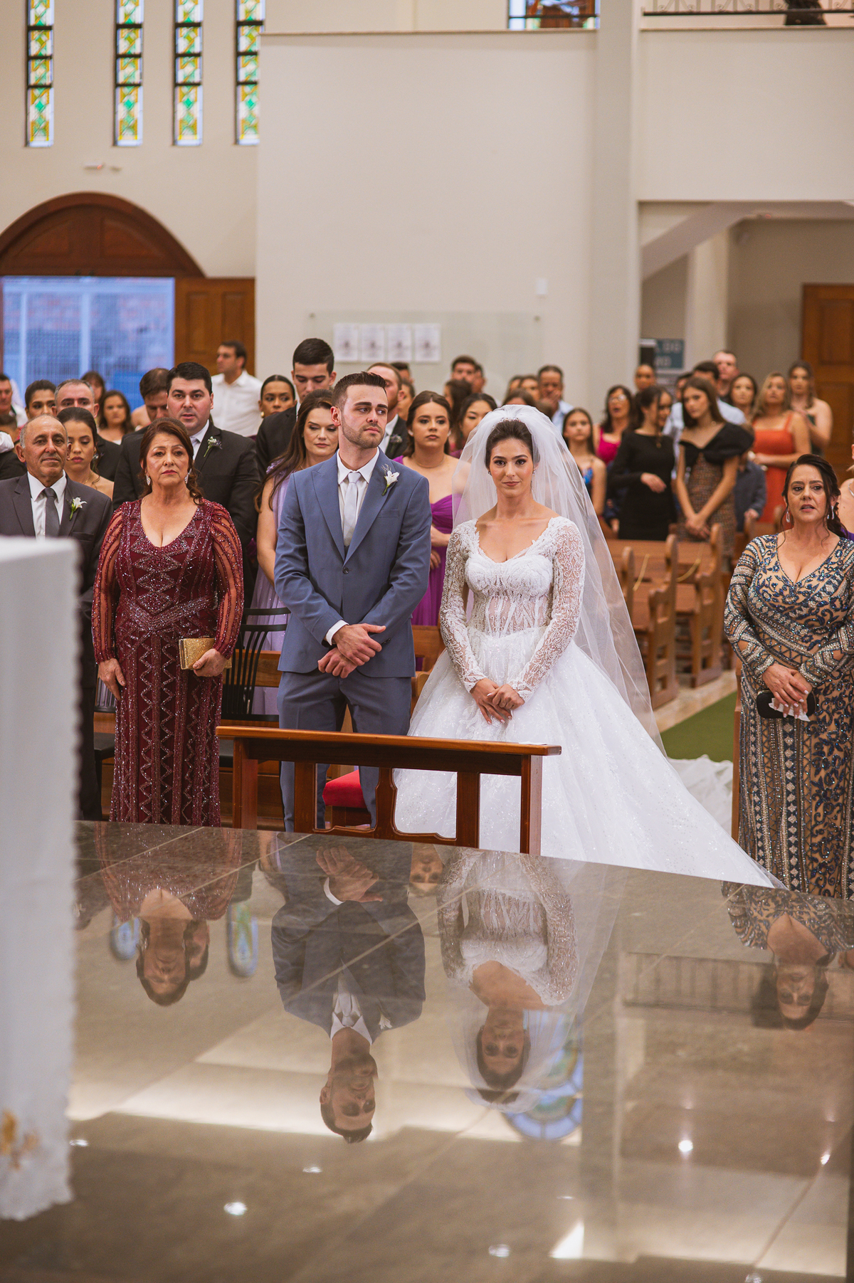 O padre os recebeu com muita alegria. Trouxe uma palavra abençoada que com toda certeza mexeu com o coração dos presentes e também dos noivos. Eles receberam as alianças, que foram ungidas com a água benta. Eles fizeram a troca de votos e também colocaram a aliança, um no dedo do outro. Com um beijo na aliança, cada um deles selou aquele momento de fé e emoção. O padre ainda convidou os presentes a erguerem as mãos abençoando os noivos. Todos oraram pelos noivos os abençoando. Os pais de ambos estavam muito emocionados. Eles participaram também da comunhão juntos. Com muita fé, os dois participaram desse momento e juntos foram abençoados. Depois, eles foram declarados casados perante Deus e assinaram os papéis do casamento.