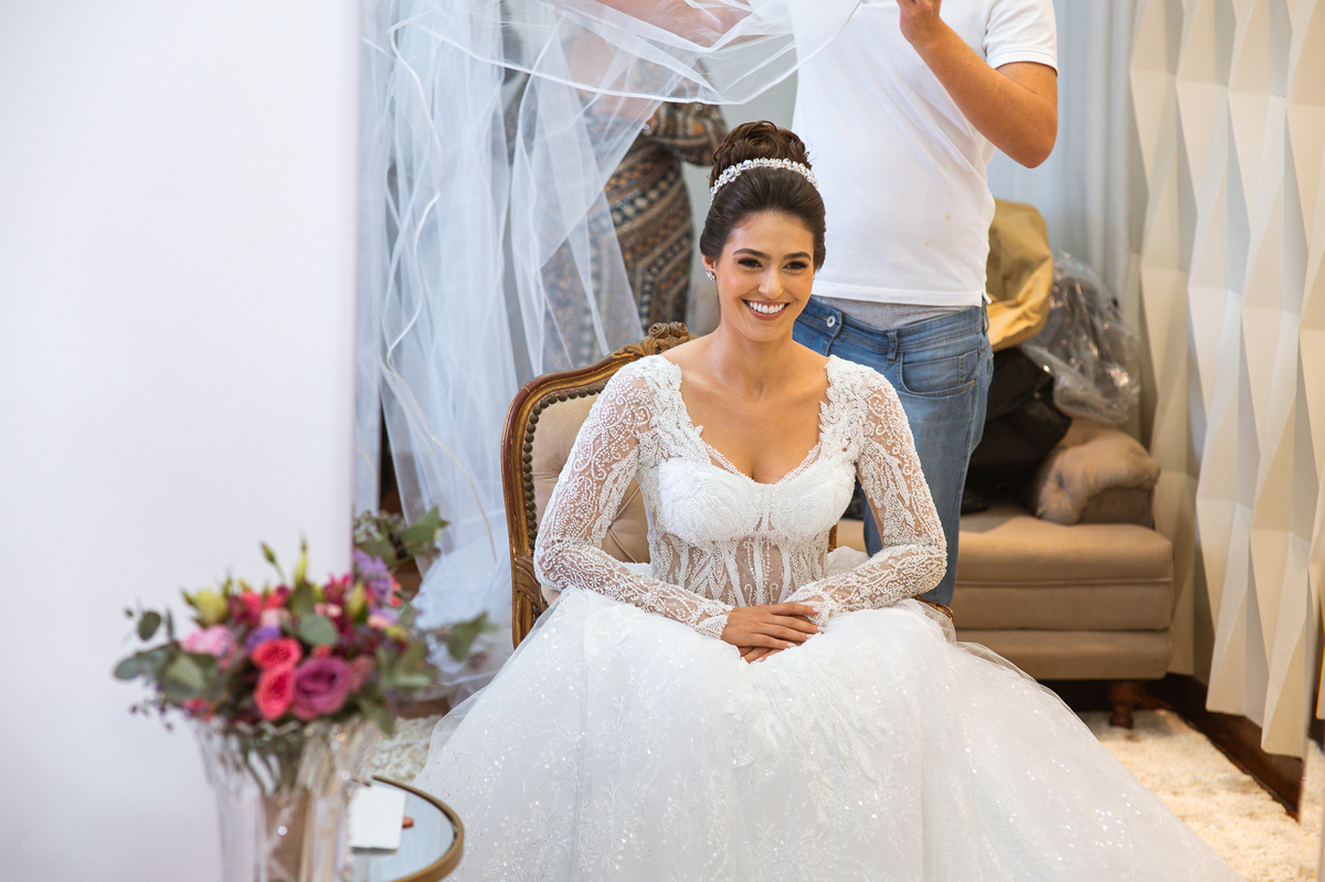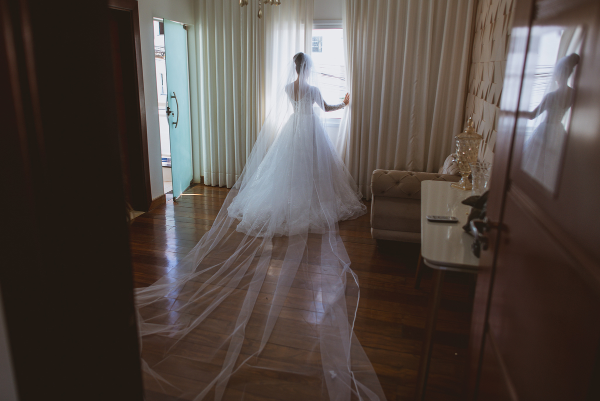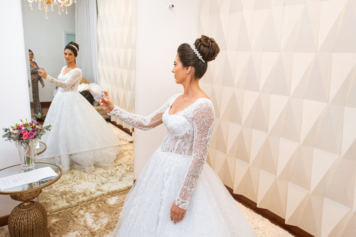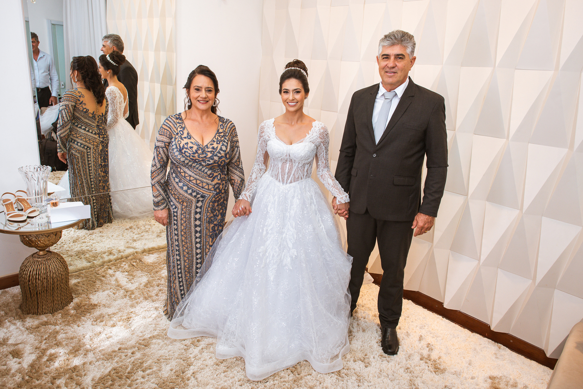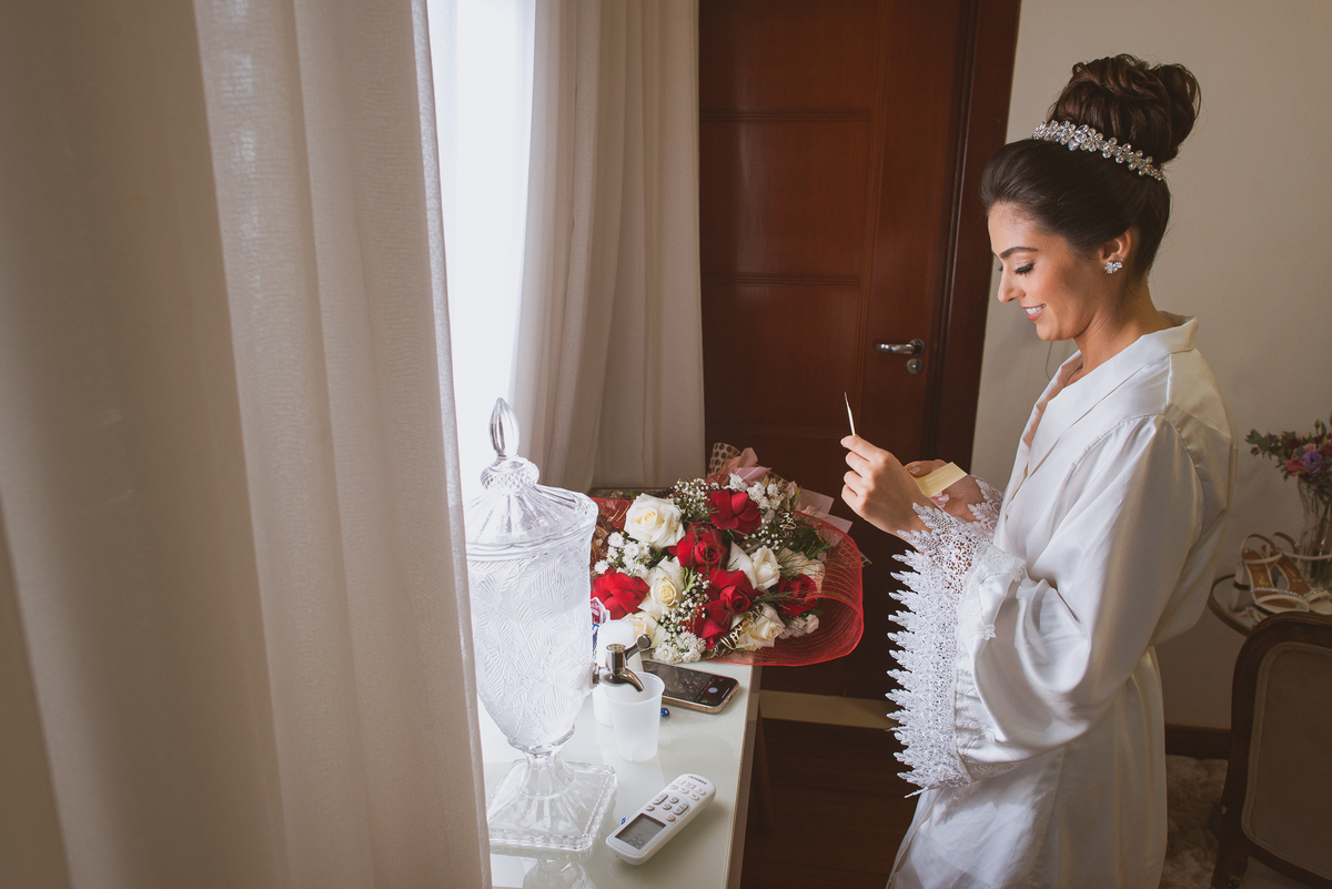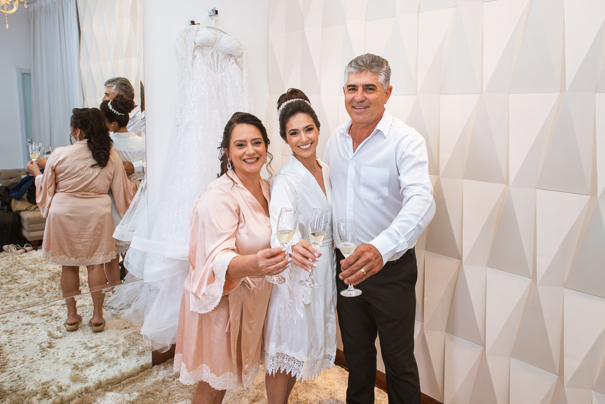 Se um é bom, imagine dois! Cada um mais lindo que o outro. A maquiadora Bárbara convidou os presentes para realizarem um brinde em comemoração ao grande dia de Jaqueline. Com palavras de toda sorte de bênçãos sobre a união, eles brindaram e comemoram muito. Agora, era o momento de colocar o vestido. Jaqueline havia pensado em tudo, nos mínimos detalhes. Pensou em sair bem antes para não haver nenhum atraso, pois teríamos que percorrer ainda mais de 100km. Então, ela tratou de logo colocar o vestido e finalizar a produção. Aguardei do lado de fora e poucos minutos depois ela estava pronta. E que vestido que encaixou bem nela! Nossa, ficou impecável! Ela estava lindíssima, uma verdadeira princesa. Imagino que o coração dos pais nesse momento fica feliz e apertado ao mesmo tempo.
