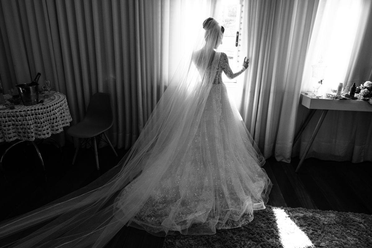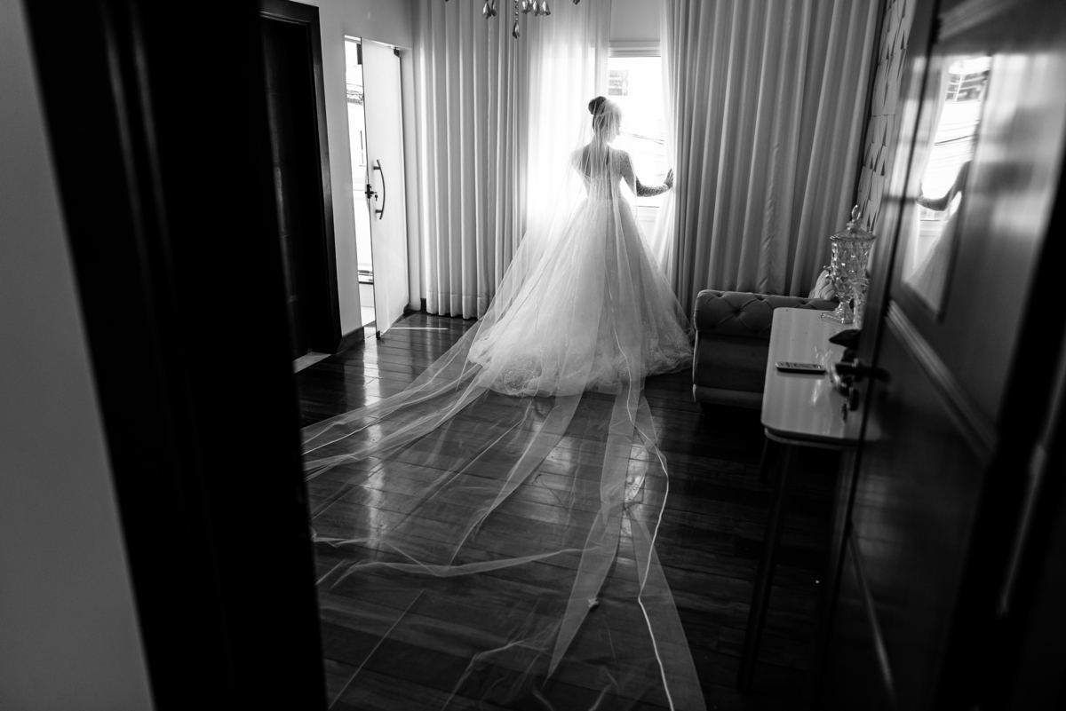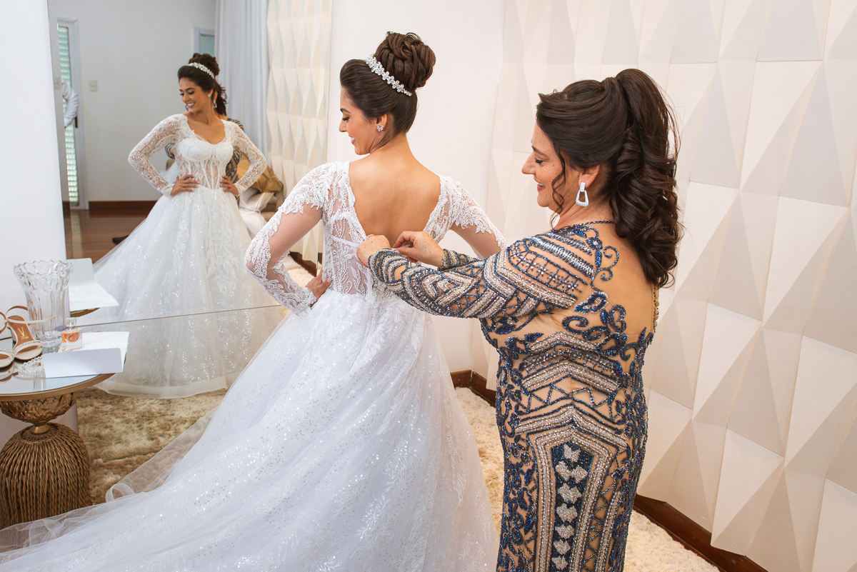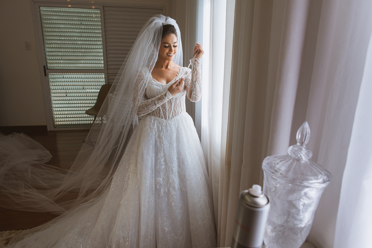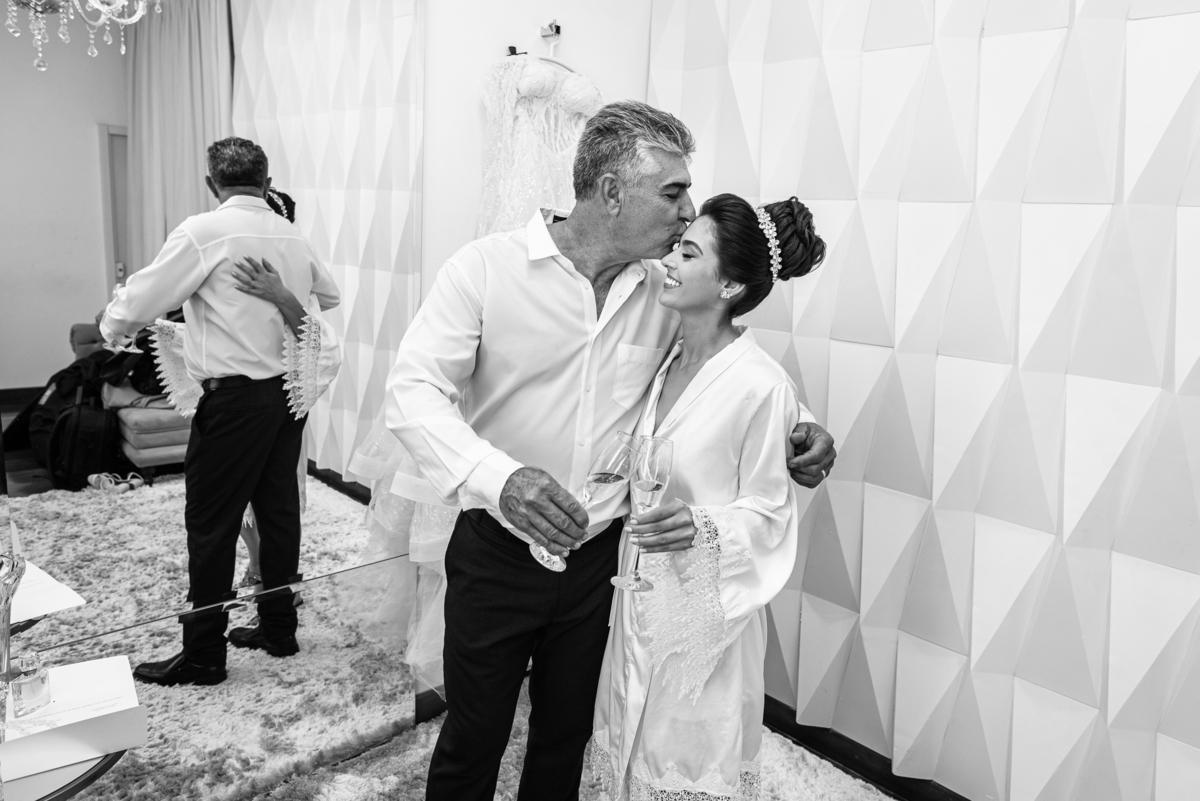 Se um é bom, imagine dois! Cada um mais lindo que o outro. A maquiadora Bárbara convidou os presentes para realizarem um brinde em comemoração ao grande dia de Jaqueline. Com palavras de toda sorte de bênçãos sobre a união, eles brindaram e comemoram muito. Agora, era o momento de colocar o vestido. Jaqueline havia pensado em tudo, nos mínimos detalhes. Pensou em sair bem antes para não haver nenhum atraso, pois teríamos que percorrer ainda mais de 100km. Então, ela tratou de logo colocar o vestido e finalizar a produção. Aguardei do lado de fora e poucos minutos depois ela estava pronta. E que vestido que encaixou bem nela! Nossa, ficou impecável! Ela estava lindíssima, uma verdadeira princesa. Imagino que o coração dos pais nesse momento fica feliz e apertado ao mesmo tempo.