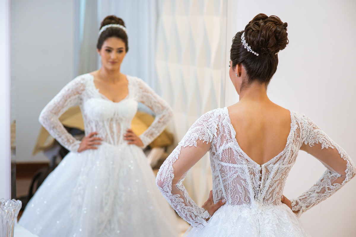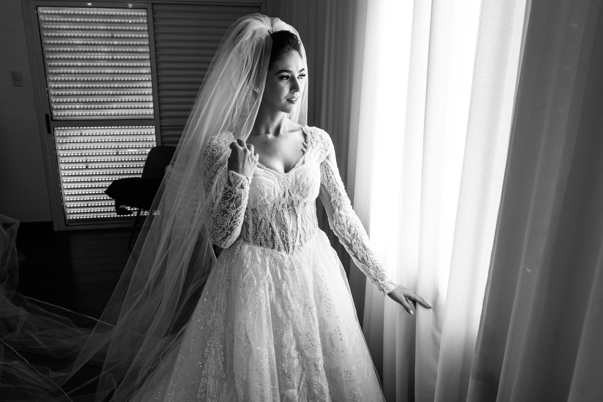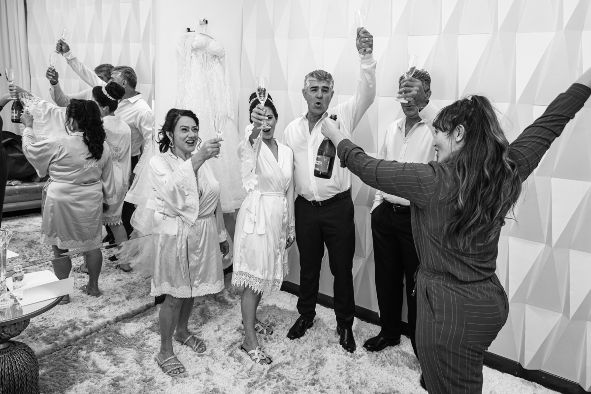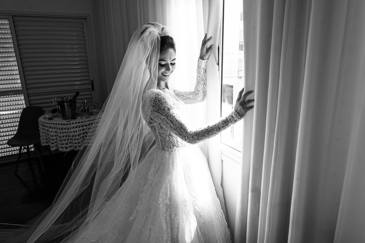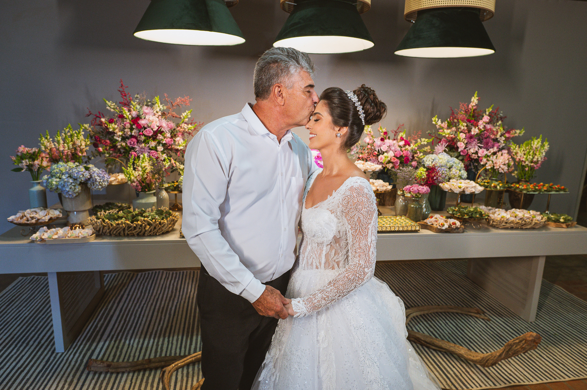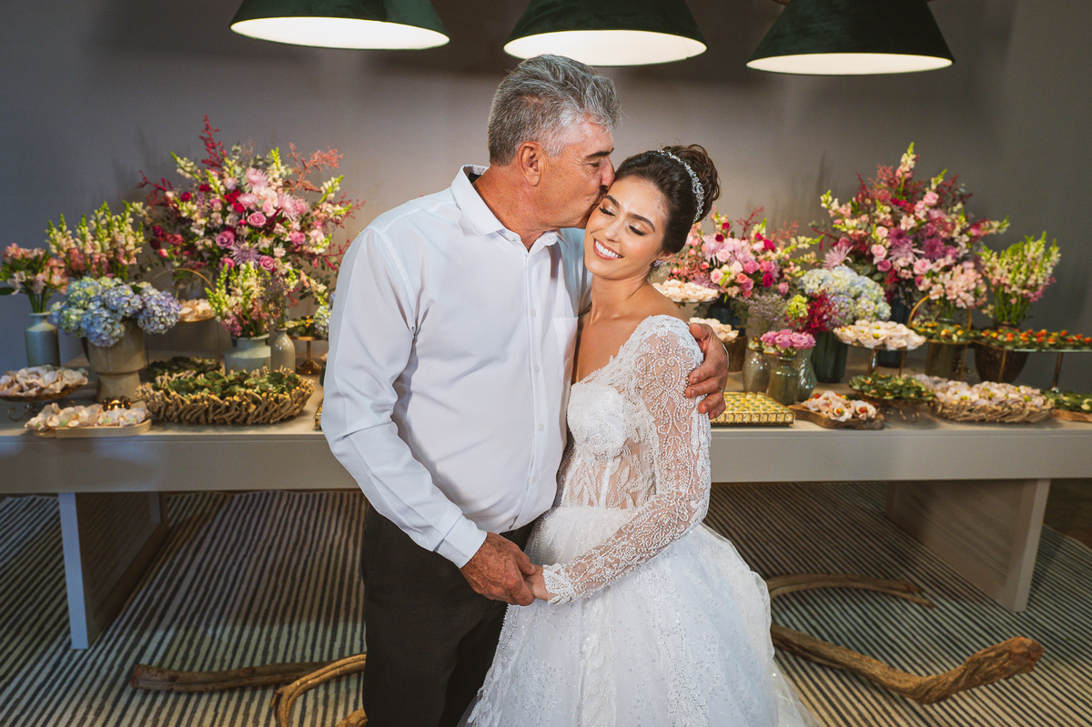Se um é bom, imagine dois! Cada um mais lindo que o outro. A maquiadora Bárbara convidou os presentes para realizarem um brinde em comemoração ao grande dia de Jaqueline. Com palavras de toda sorte de bênçãos sobre a união, eles brindaram e comemoram muito. Agora, era o momento de colocar o vestido. Jaqueline havia pensado em tudo, nos mínimos detalhes. Pensou em sair bem antes para não haver nenhum atraso, pois teríamos que percorrer ainda mais de 100km. Então, ela tratou de logo colocar o vestido e finalizar a produção. Aguardei do lado de fora e poucos minutos depois ela estava pronta. E que vestido que encaixou bem nela! Nossa, ficou impecável! Ela estava lindíssima, uma verdadeira princesa. Imagino que o coração dos pais nesse momento fica feliz e apertado ao mesmo tempo.