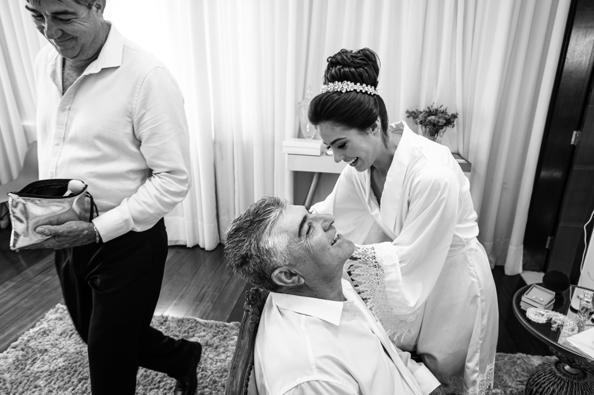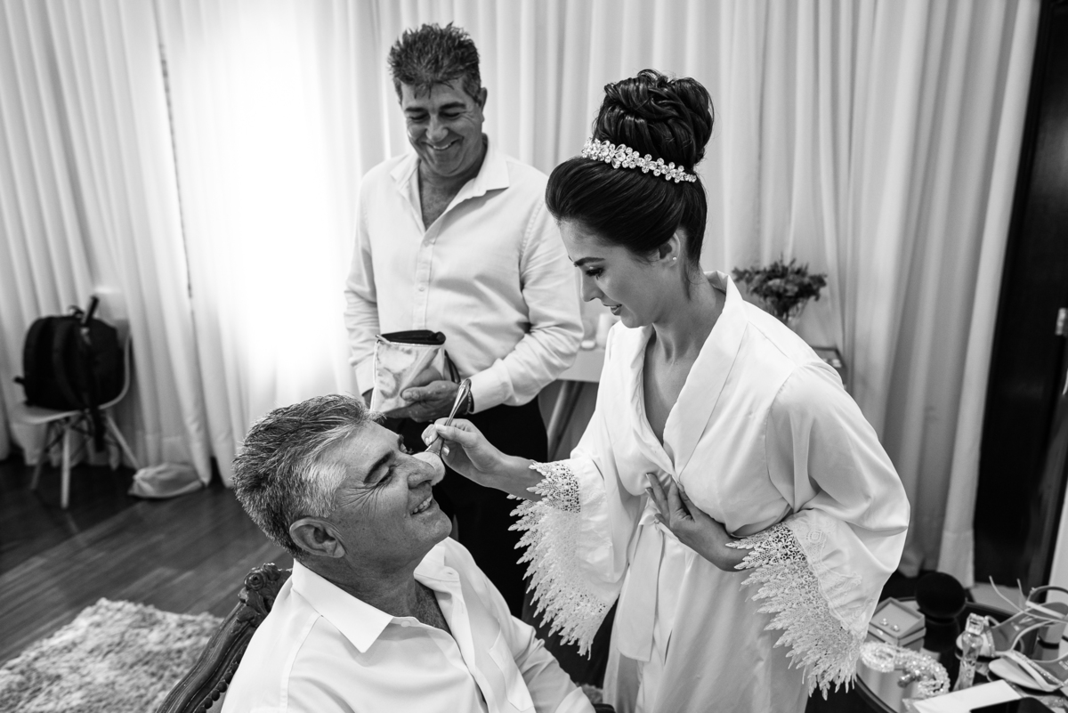 Há alguns dias atrás, tivemos outro grande casamento na cidade de São Gotardo - MG. E não pense que foi um casamento normal. Jaqueline optou por realizar sua produção aqui em Patos de Minas e posteriormente nós viajaríamos até a cidade dos noivos para concluir o trabalho. Organizamos tudo e iniciamos o trabalho bem mais cedo que de costume. Chegando no salão, encontrei uma noiva plena e tranquila. Aliás, ela estava era trabalhando. Pra quem não sabe, Jaqueline é maquiadora profissional (E excelente por sinal) e quando entrei na sala da noiva, ela estava dando um trato no rosto do seu papai. Passando um pó para tirar o brilho da pele e deixar ele todo bonitão. Ele, que é super divertido, se sentiu o máximo ao ser produzido pela filha, no dia mais importante de sua vida.