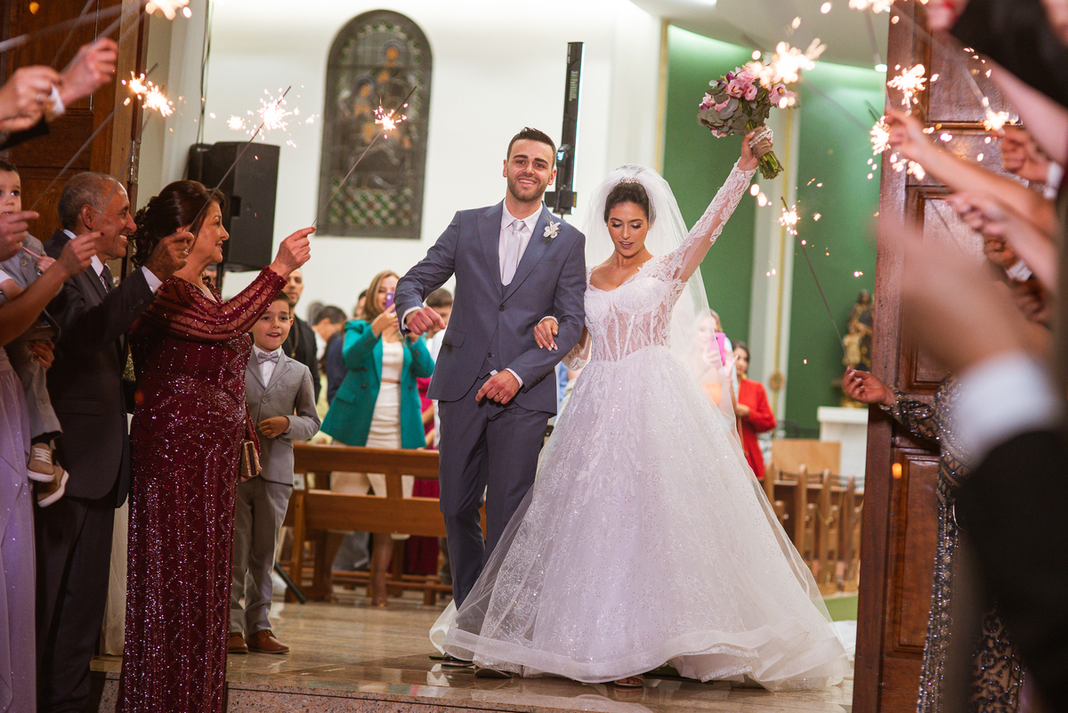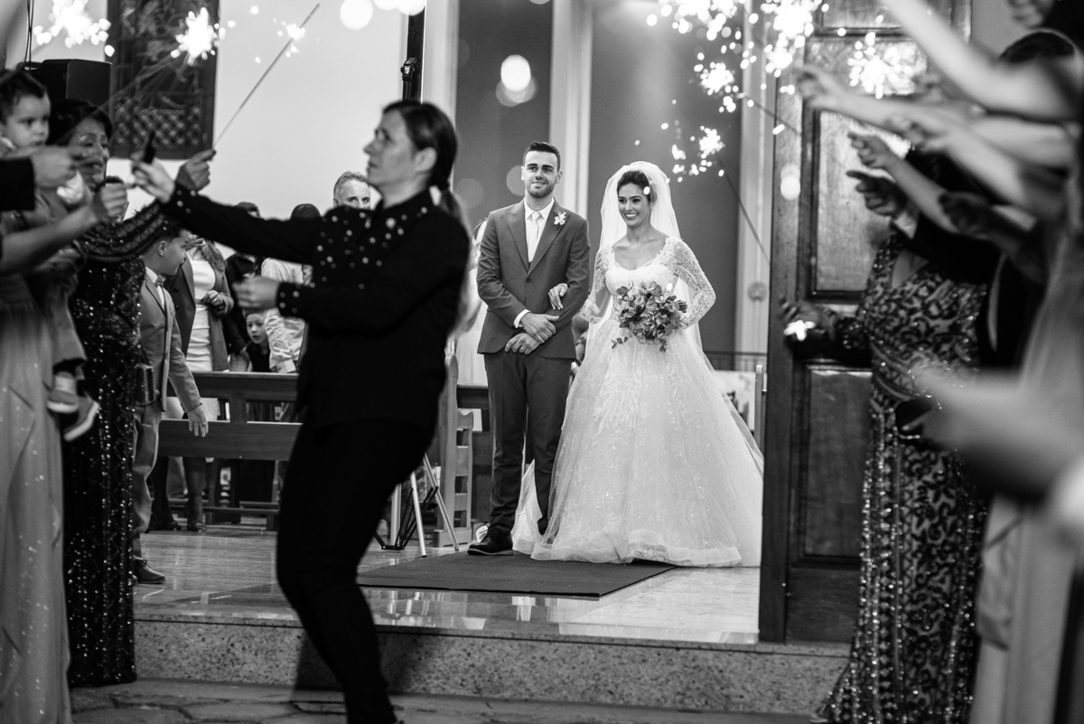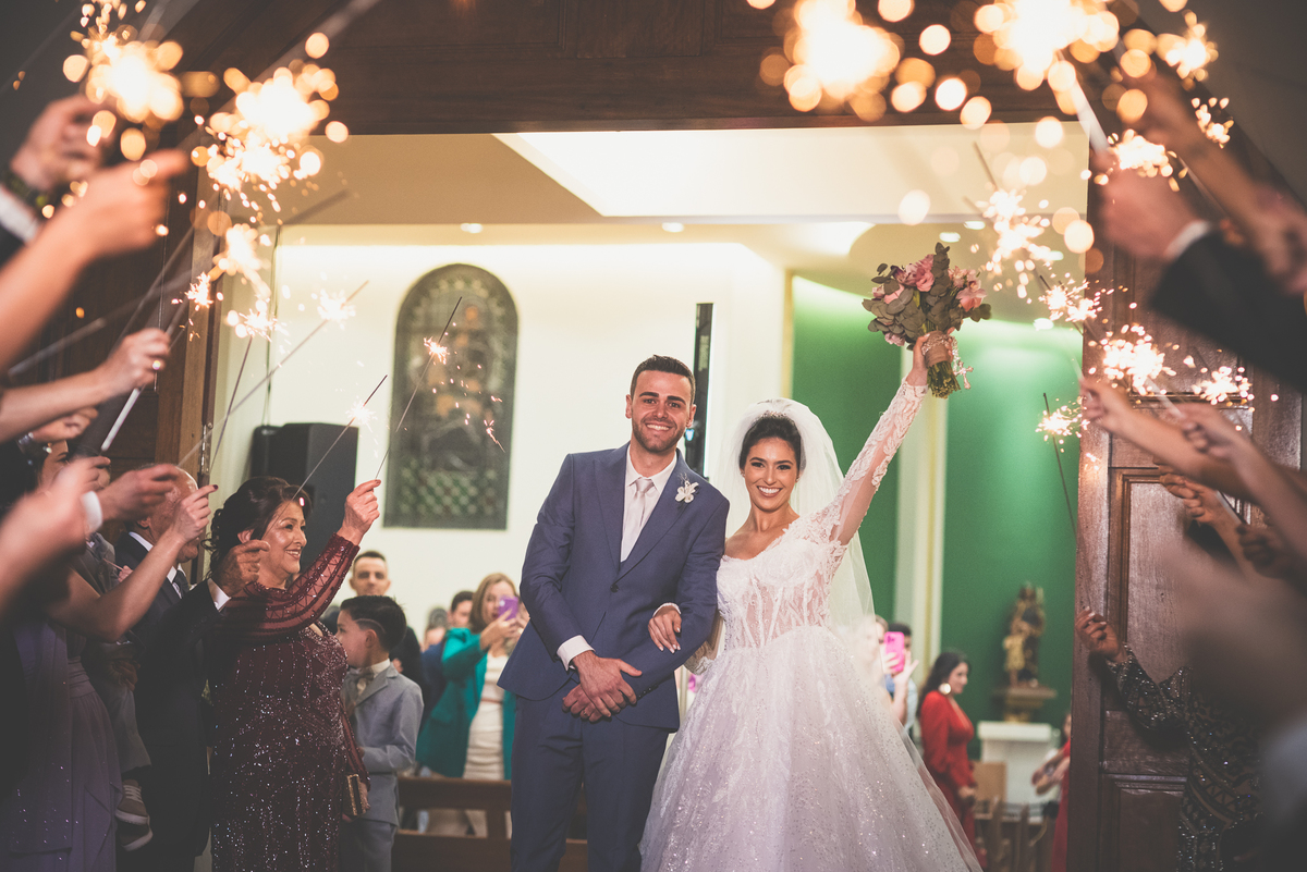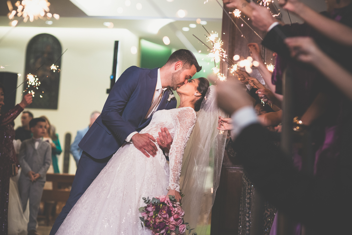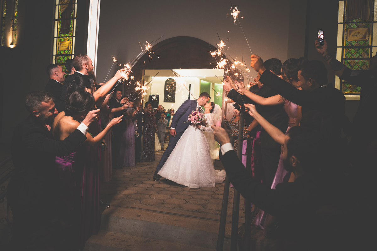 Fizemos as fotos com os convidados e padrinhos no altar. Finalizamos a celebração e o cerimonial organizou a fila de padrinhos para receber os recém-casados do lado de fora da igreja. Com os sparkles acesos nas mãos, eles fizeram uma grande festa ao recepcionar o mais novo casal de São Gotardo. Otávio deu aquele beijo clássico de cinema em sua esposa que comemorou muito aquele momento. Fizemos uma mini sessão de fotos dos noivos na Igreja, que tem um simbolismo muito grande para os dois. Logo após, seguimos para o Sítio Águas de Março, local da recepção. A decoração do local ficou a cargo da talentosa Alessandra, do SweetDecor. Tudo estava perfeito. A mesa do bolo foi cuidadosamente preparada com enfeites que eu não havia visto anteriormente.