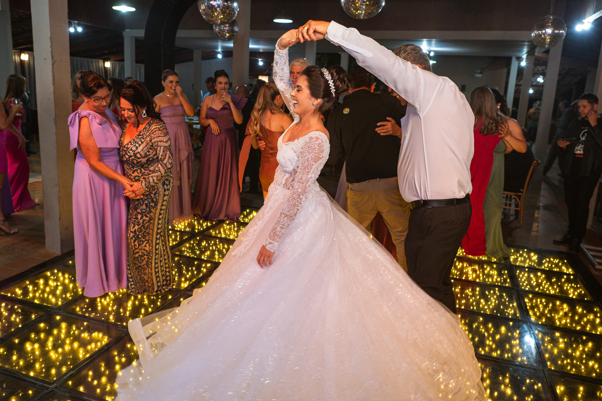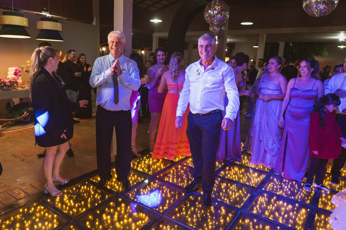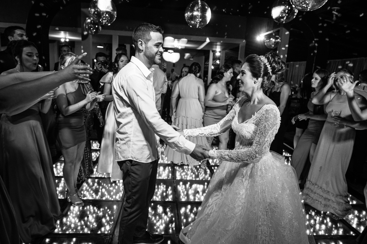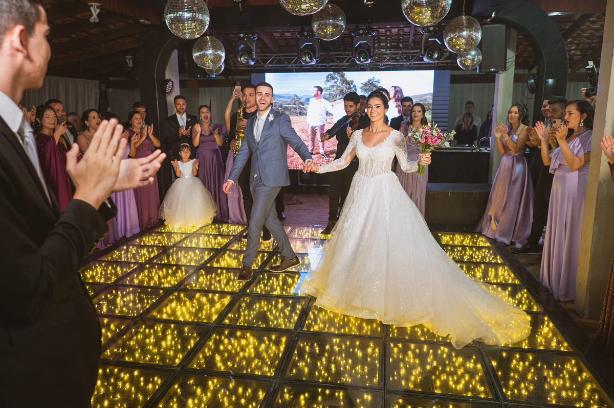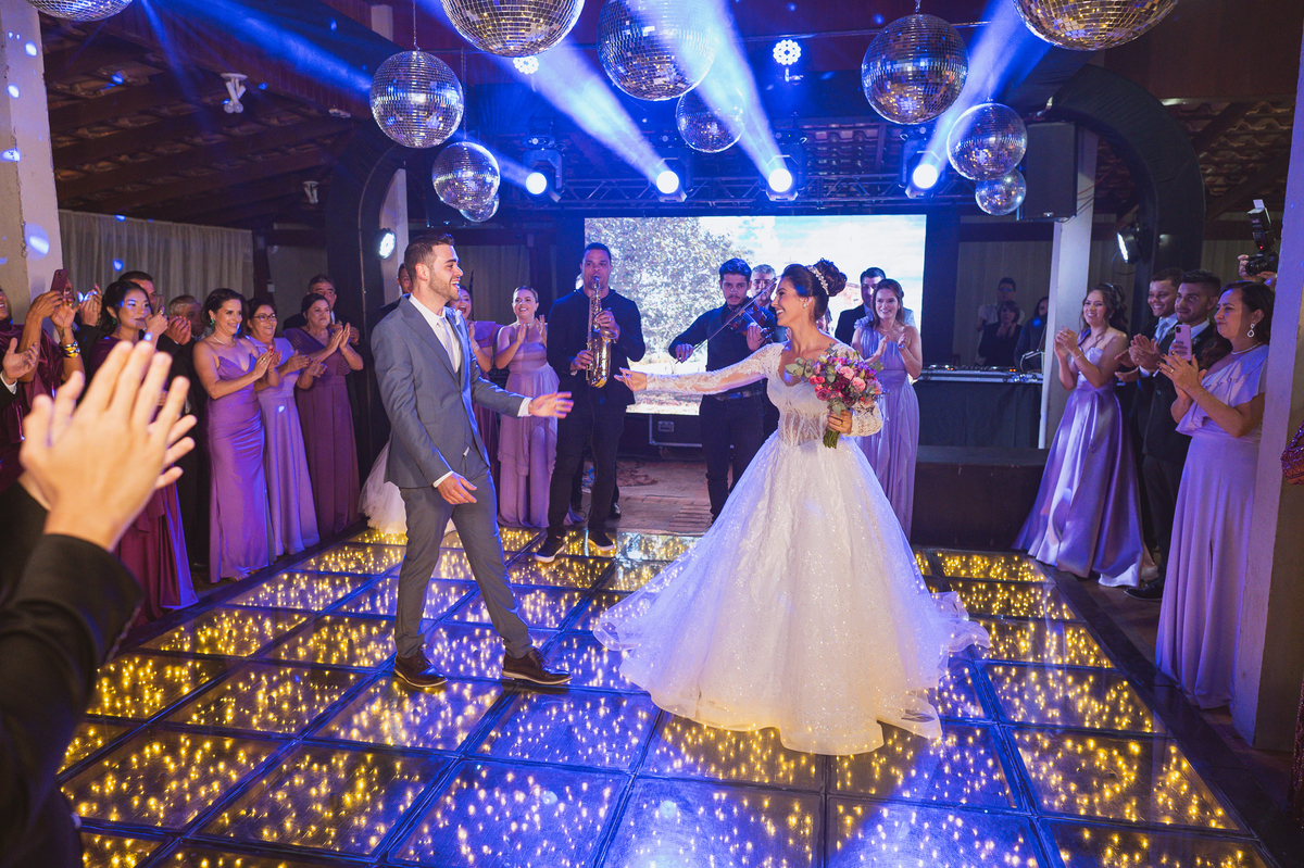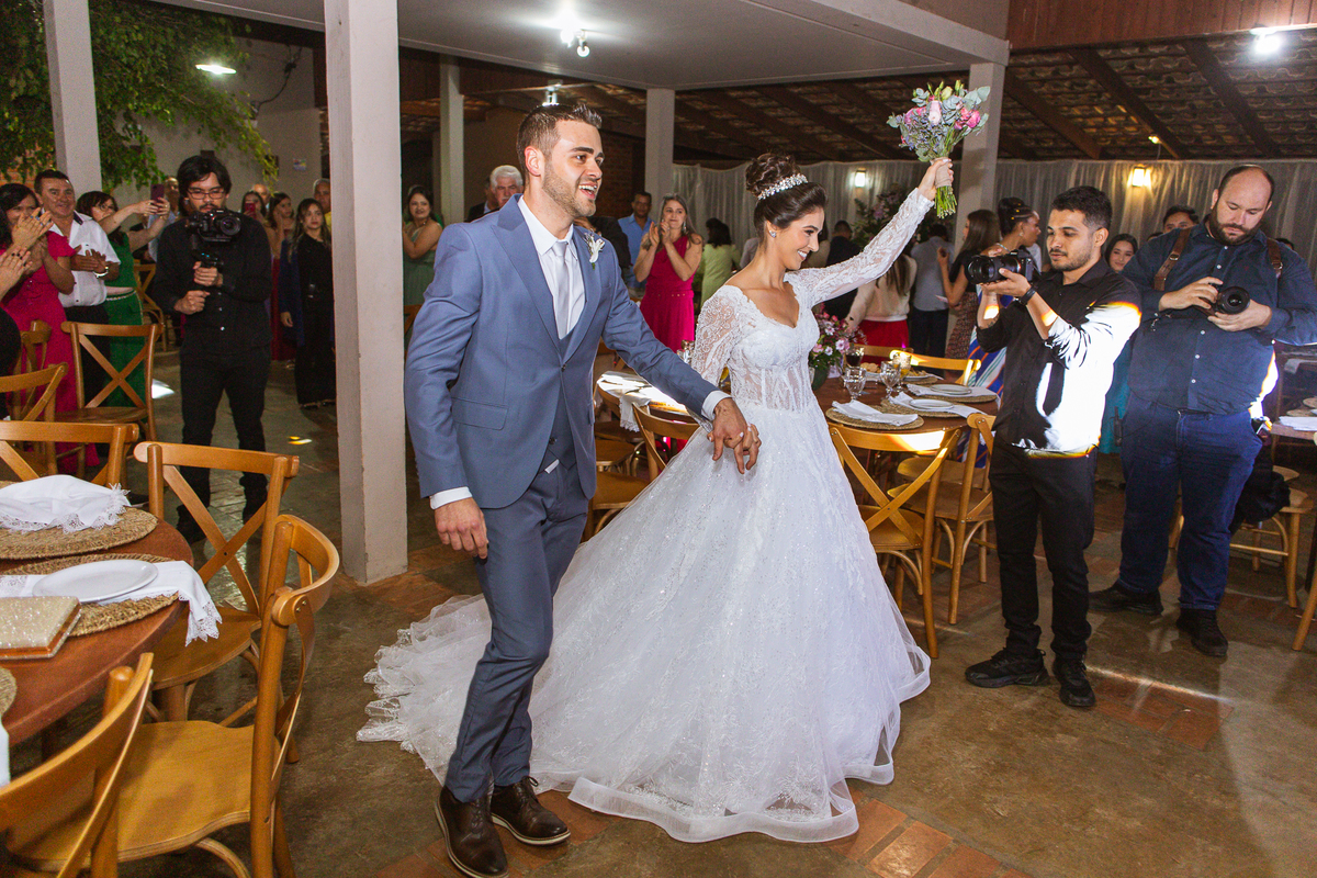O casal foi anunciado no som e logo foram convidados a entrar na festa. Os padrinhos já aguardavam na pista de dança e receberam os recém-casados com muita alegria. Otávio e Jaqueline prepararam uma valsa maravilhosa, cheia de passos combinados e finalizada com um beijo. Eles agradeceram a presença de seus amigos e familiares e fizemos mais algumas fotos na mesa do bolo. O noivo e alguns padrinhos passaram a gravata e ele no final ficou até sem a sua cueca, que foi "comprada" por alguns padrinhos. A noiva curtiu a pista com suas madrinhas que dançaram até o fim da festa. O buquê foi jogado e uma amiga muito especial que foi a sortuda.