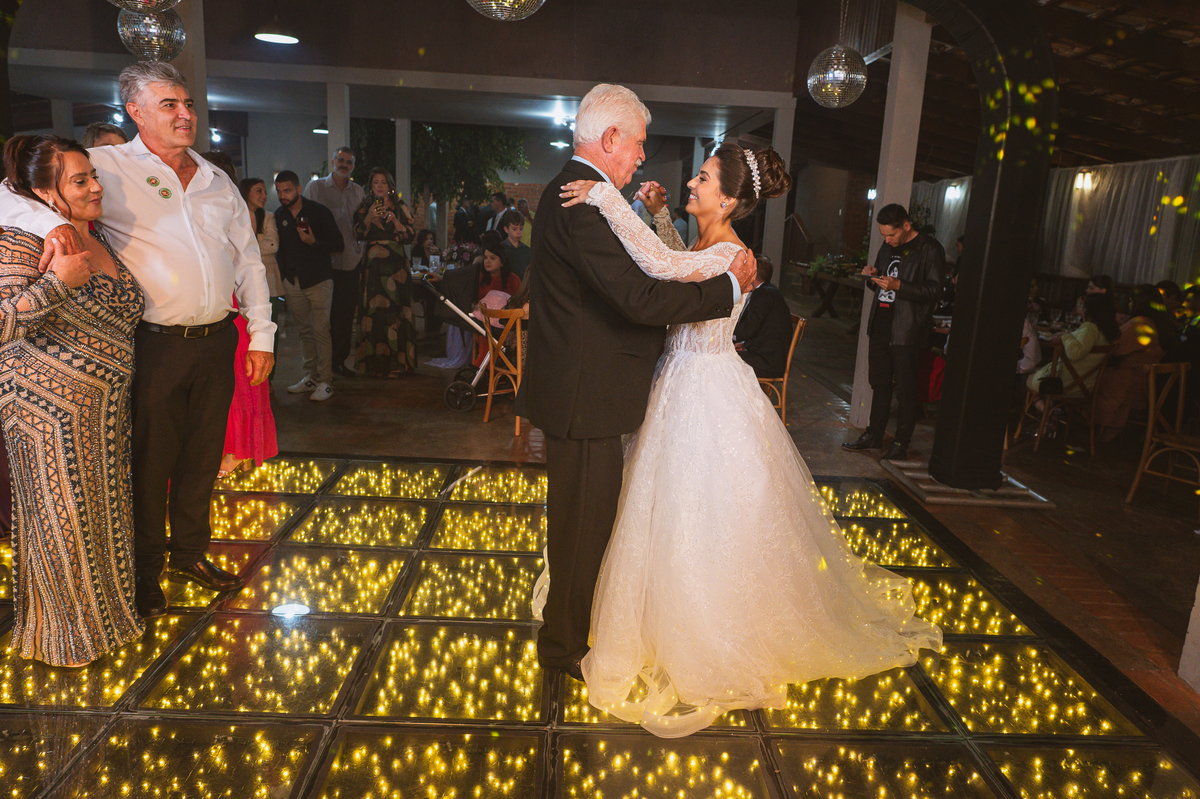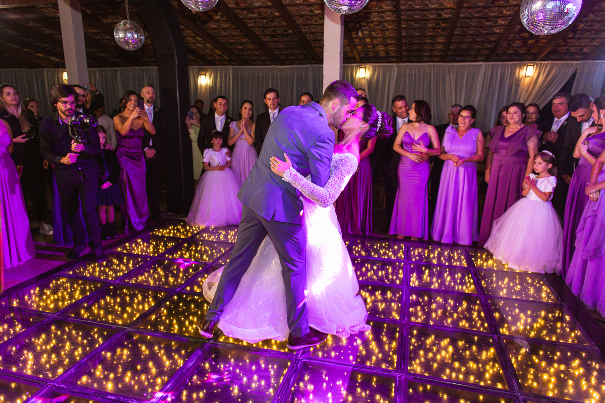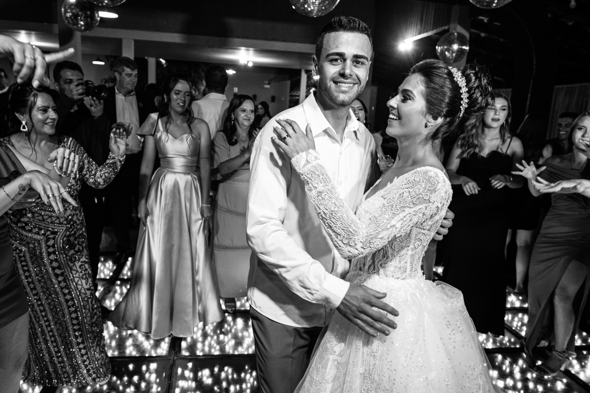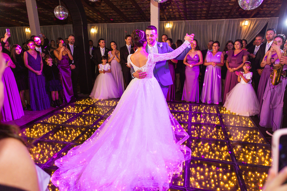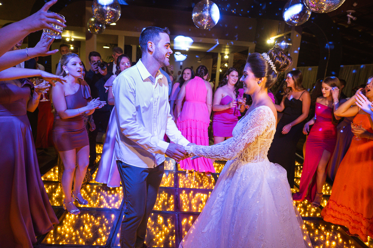 O casal foi anunciado no som e logo foram convidados a entrar na festa. Os padrinhos já aguardavam na pista de dança e receberam os recém-casados com muita alegria. Otávio e Jaqueline prepararam uma valsa maravilhosa, cheia de passos combinados e finalizada com um beijo. Eles agradeceram a presença de seus amigos e familiares e fizemos mais algumas fotos na mesa do bolo. O noivo e alguns padrinhos passaram a gravata e ele no final ficou até sem a sua cueca, que foi "comprada" por alguns padrinhos. A noiva curtiu a pista com suas madrinhas que dançaram até o fim da festa. O buquê foi jogado e uma amiga muito especial que foi a sortuda.