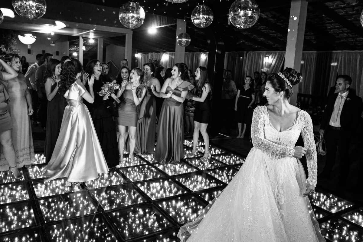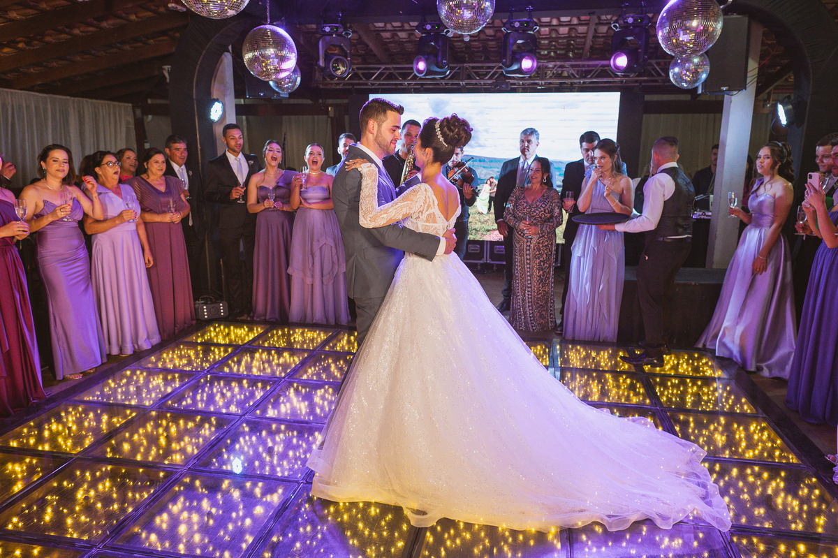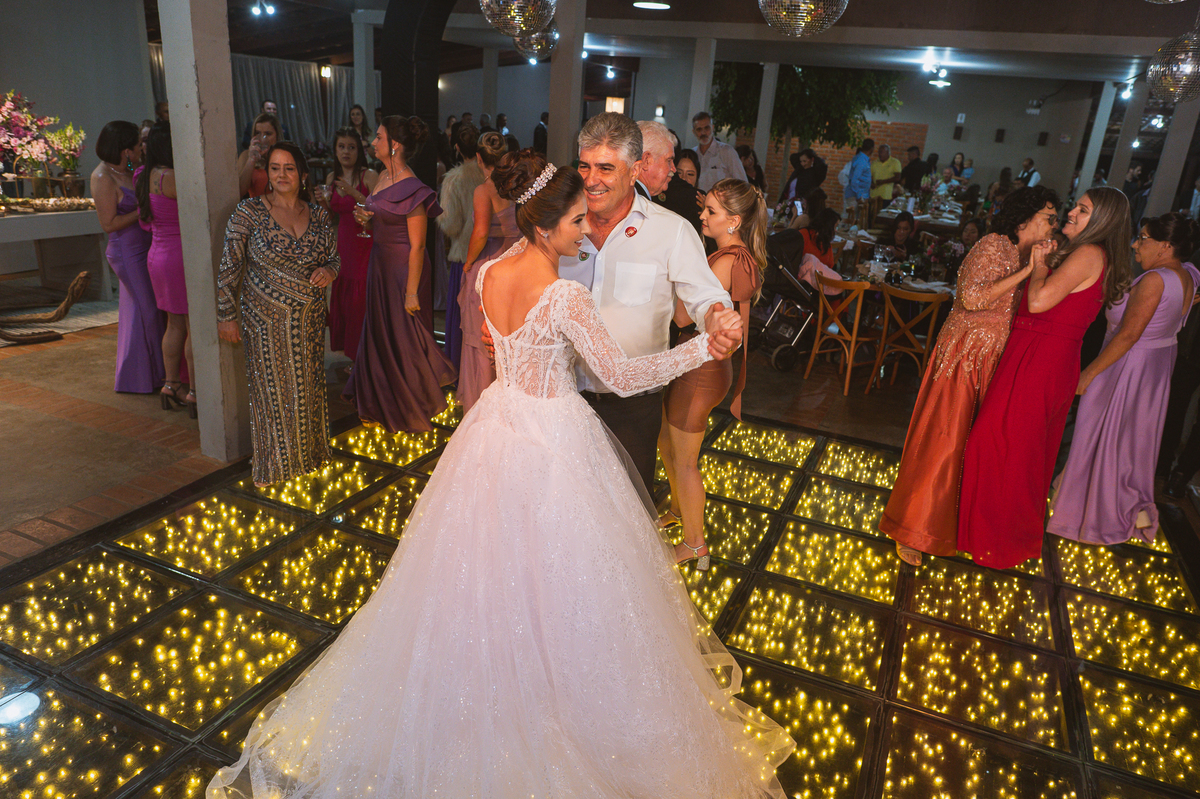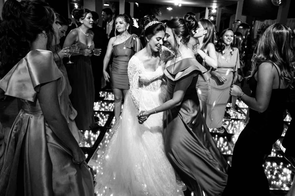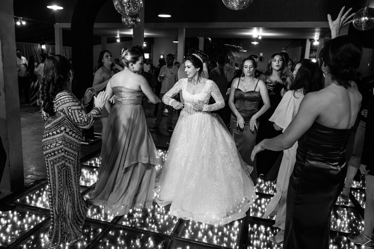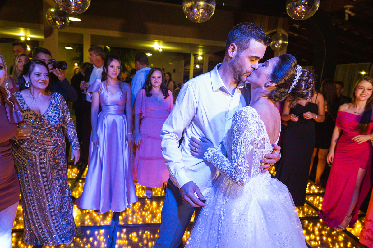 O casal foi anunciado no som e logo foram convidados a entrar na festa. Os padrinhos já aguardavam na pista de dança e receberam os recém-casados com muita alegria. Otávio e Jaqueline prepararam uma valsa maravilhosa, cheia de passos combinados e finalizada com um beijo. Eles agradeceram a presença de seus amigos e familiares e fizemos mais algumas fotos na mesa do bolo. O noivo e alguns padrinhos passaram a gravata e ele no final ficou até sem a sua cueca, que foi "comprada" por alguns padrinhos. A noiva curtiu a pista com suas madrinhas que dançaram até o fim da festa. O buquê foi jogado e uma amiga muito especial que foi a sortuda.