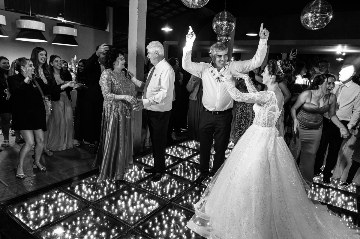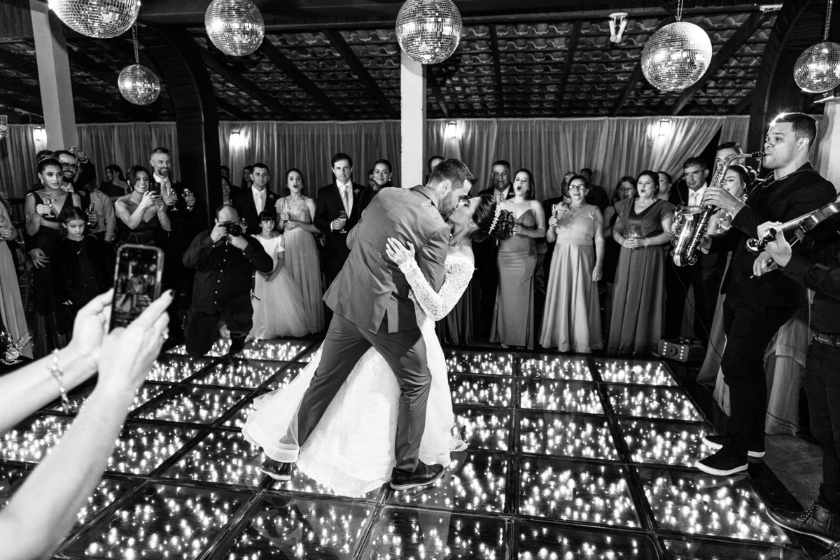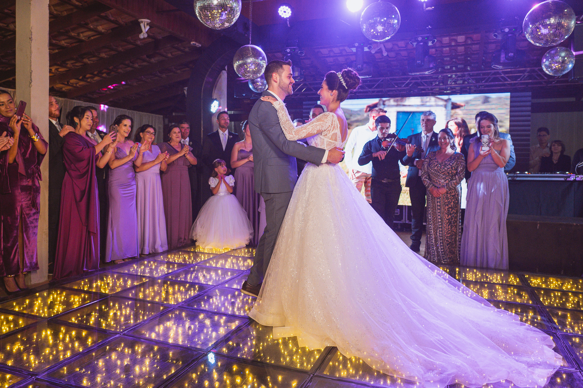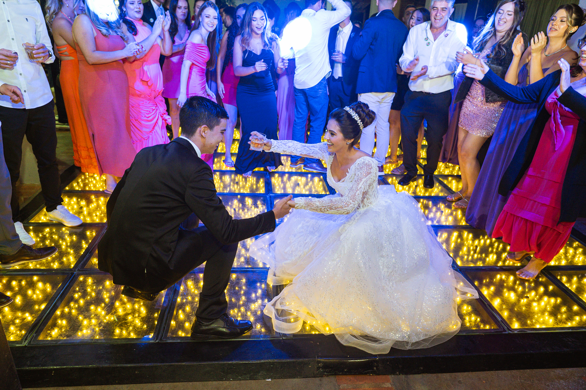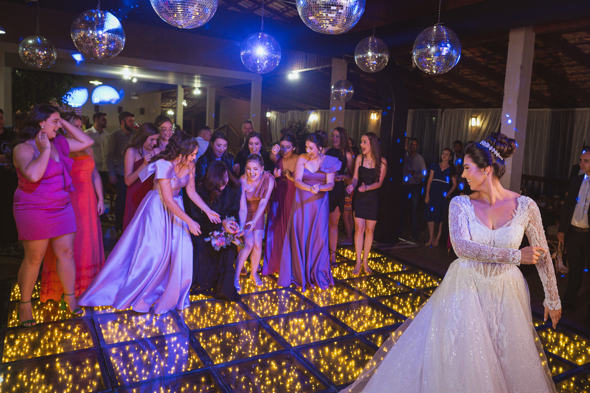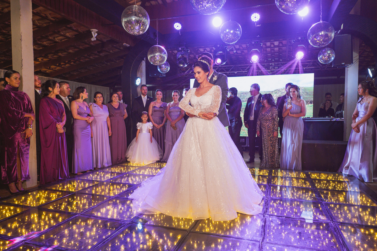 O casal foi anunciado no som e logo foram convidados a entrar na festa. Os padrinhos já aguardavam na pista de dança e receberam os recém-casados com muita alegria. Otávio e Jaqueline prepararam uma valsa maravilhosa, cheia de passos combinados e finalizada com um beijo. Eles agradeceram a presença de seus amigos e familiares e fizemos mais algumas fotos na mesa do bolo. O noivo e alguns padrinhos passaram a gravata e ele no final ficou até sem a sua cueca, que foi "comprada" por alguns padrinhos. A noiva curtiu a pista com suas madrinhas que dançaram até o fim da festa. O buquê foi jogado e uma amiga muito especial que foi a sortuda.