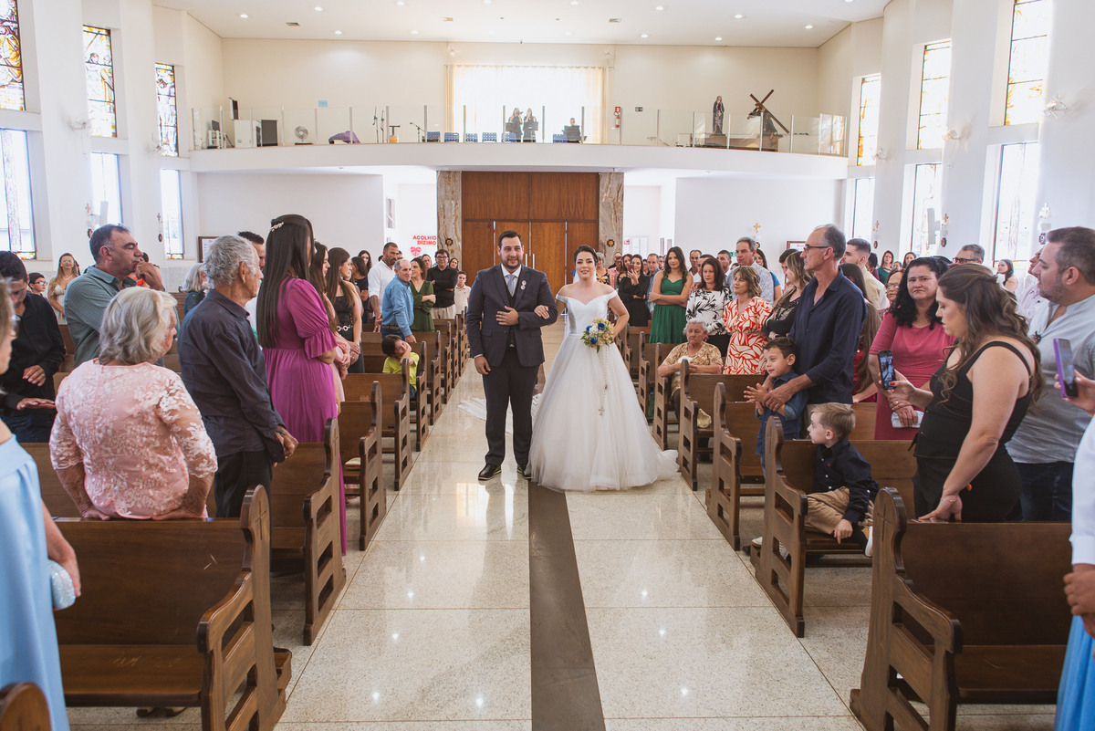 O dia estava muito bonito, o sol iluminando aquela tarde de friozinho deixava tudo ainda mais especial e charmoso. A equipe de cantores iniciou os trabalhos abrindo a celebração. Os primeiros a entrar foram o noivo de braços dados com seus pais. Eles abriram a fila de entradas e ao final do corredor, Marcos deu um forte abraço em sua mãe e posteriormente em seu pai despedindo-se deles. Posicionou no centro do corredor para assistir a entrada de sua noiva. As entradas dos padrinhos foi acontecendo e também dos pajens. Assim que ela começaram a entrar, as portas foram fechadas. A noiva se posicionou atrás dessa porta que era a única coisa que separava os dois naquele momento. Os pajens desfilaram com seu jeitinho engraçado e fizeram todos rirem. Por fim, a marcha nupcial começou a ser entoada. Nesse momento, não há coração duro o suficiente para não se emocionar...