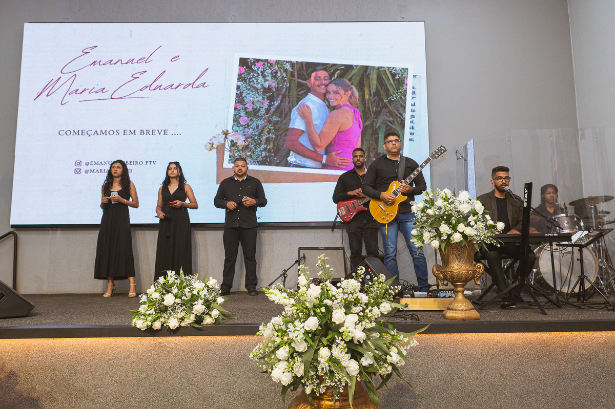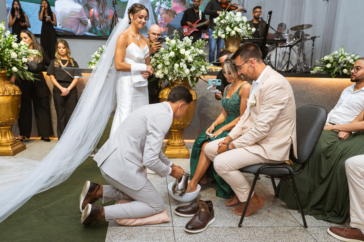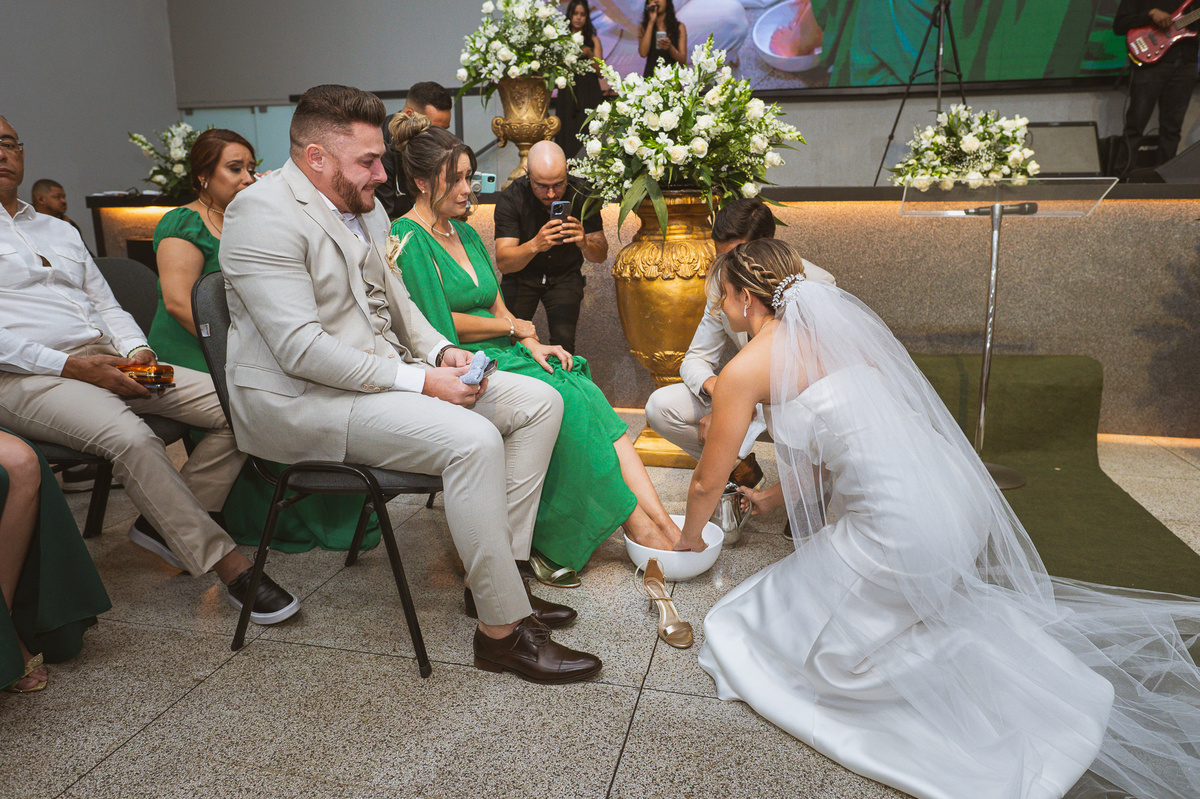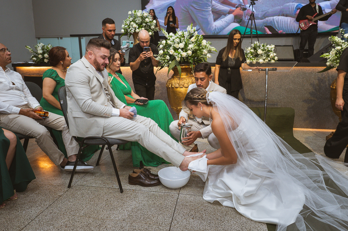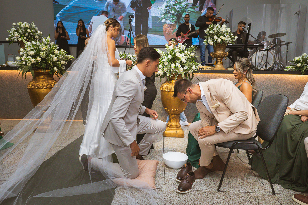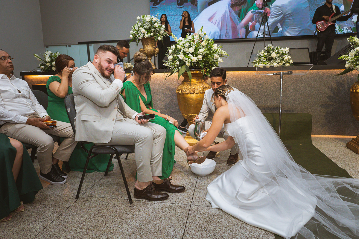 Emanuel recebeu sua noiva, com um respeitoso beijo em sua testa. Agora juntinhos, eles caminharam para receber a bênção de Deus sobre seu casamento. O celebrante foi nada menos do que o Pai do noivo. Ele os recebeu e trouxe uma palavra maravilhosa aos dois. Quando eu disse lá em cima que tive gratas surpresas, uma delas foi a que aconteceu logo depois da palavra. Os noivos prepararam uma lindíssima homenagem que eu nunca havia visto antes, nesses anos todos de profissão. Eles, carinhosamente e como sinal de gratidão, fizeram a cerimônia chamada "Lava pés". Em forma de agradecimento aos anos todos de cuidado e ensino até aquele dia, eles lavaram os pés de seus pais. Maria Eduarda começou lavando os pés de seu pai e depois de sua mãe. Nesse momento, foi difícil conter a emoção. Foi o sinônimo máximo de respeito que eu já vi. Emanuel a auxiliava. Depois, ele fez o mesmo com seus pais enquanto Duda o auxiliava. Foram momentos inesquecíveis que vivenciamos. Depois dessa homenagem, ainda tivemos a surpresa de que o pai da noiva, que também é pastor, concluir os votos e os declarar casados. Já pensou ter essa sorte de os dois pais celebrando o casamento? Pois então! Ele também trouxe mais um complemento de votos maravilhosos aos dois, e também pediu que eles trocassem seus votos um para o outro. As alianças foram trocadas e os votos pronunciados. Poucas pessoas não choraram nesse momento. Foi incrível ouvir um pouquinho da história de amor dos dois. Esse momento emocionou até as crianças que estavam presentes.