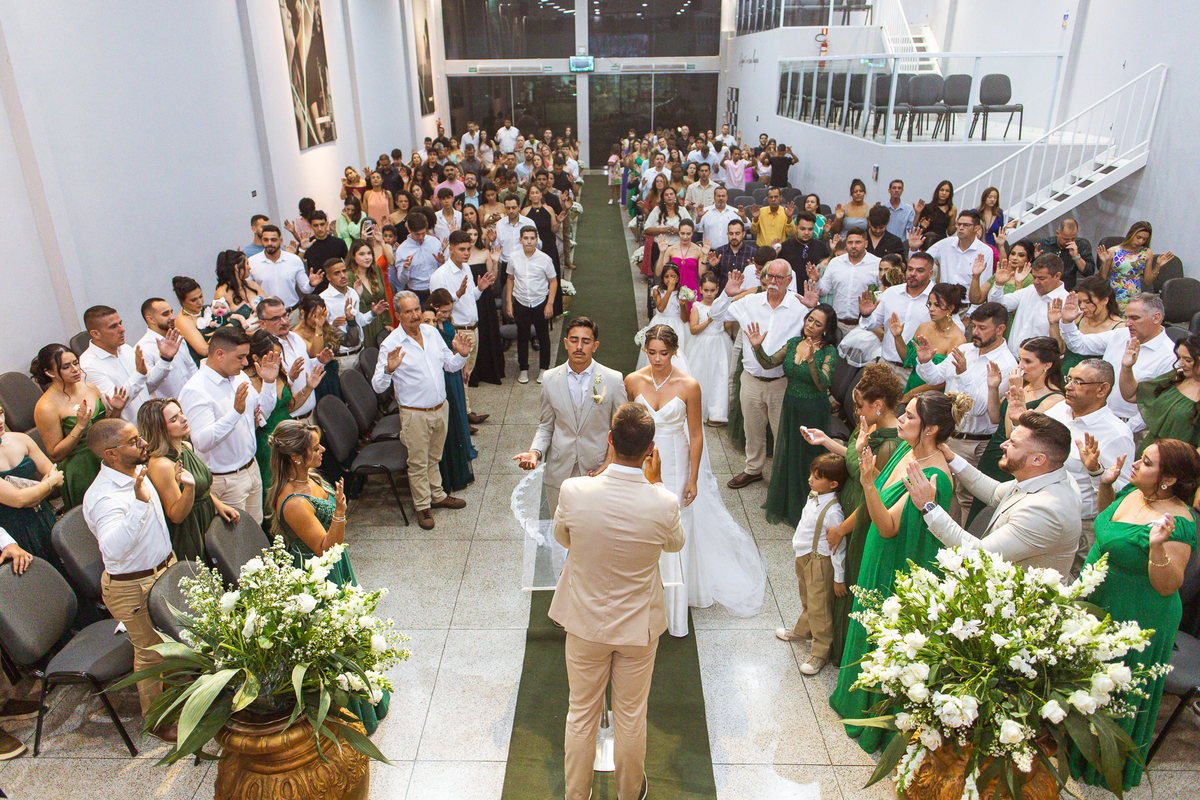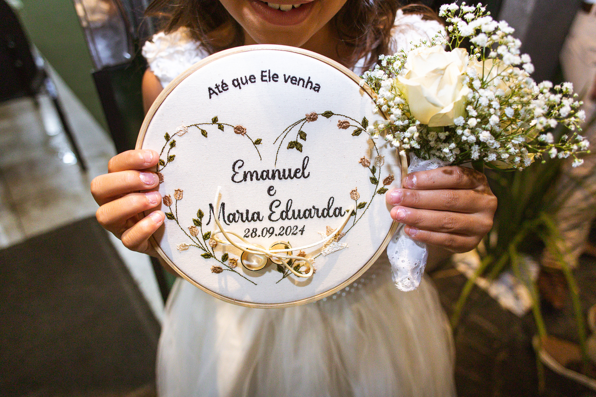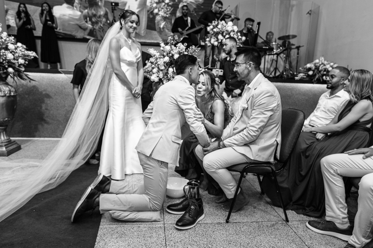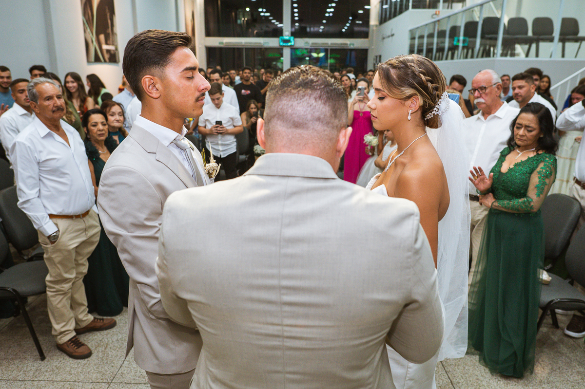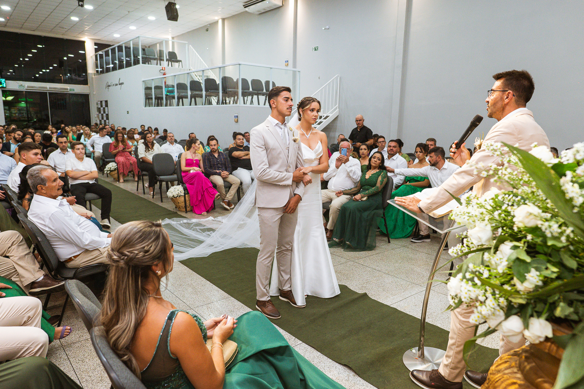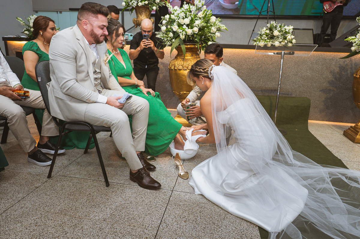 Emanuel recebeu sua noiva, com um respeitoso beijo em sua testa. Agora juntinhos, eles caminharam para receber a bênção de Deus sobre seu casamento. O celebrante foi nada menos do que o Pai do noivo. Ele os recebeu e trouxe uma palavra maravilhosa aos dois. Quando eu disse lá em cima que tive gratas surpresas, uma delas foi a que aconteceu logo depois da palavra. Os noivos prepararam uma lindíssima homenagem que eu nunca havia visto antes, nesses anos todos de profissão. Eles, carinhosamente e como sinal de gratidão, fizeram a cerimônia chamada "Lava pés". Em forma de agradecimento aos anos todos de cuidado e ensino até aquele dia, eles lavaram os pés de seus pais. Maria Eduarda começou lavando os pés de seu pai e depois de sua mãe. Nesse momento, foi difícil conter a emoção. Foi o sinônimo máximo de respeito que eu já vi. Emanuel a auxiliava. Depois, ele fez o mesmo com seus pais enquanto Duda o auxiliava. Foram momentos inesquecíveis que vivenciamos. Depois dessa homenagem, ainda tivemos a surpresa de que o pai da noiva, que também é pastor, concluir os votos e os declarar casados. Já pensou ter essa sorte de os dois pais celebrando o casamento? Pois então! Ele também trouxe mais um complemento de votos maravilhosos aos dois, e também pediu que eles trocassem seus votos um para o outro. As alianças foram trocadas e os votos pronunciados. Poucas pessoas não choraram nesse momento. Foi incrível ouvir um pouquinho da história de amor dos dois. Esse momento emocionou até as crianças que estavam presentes.