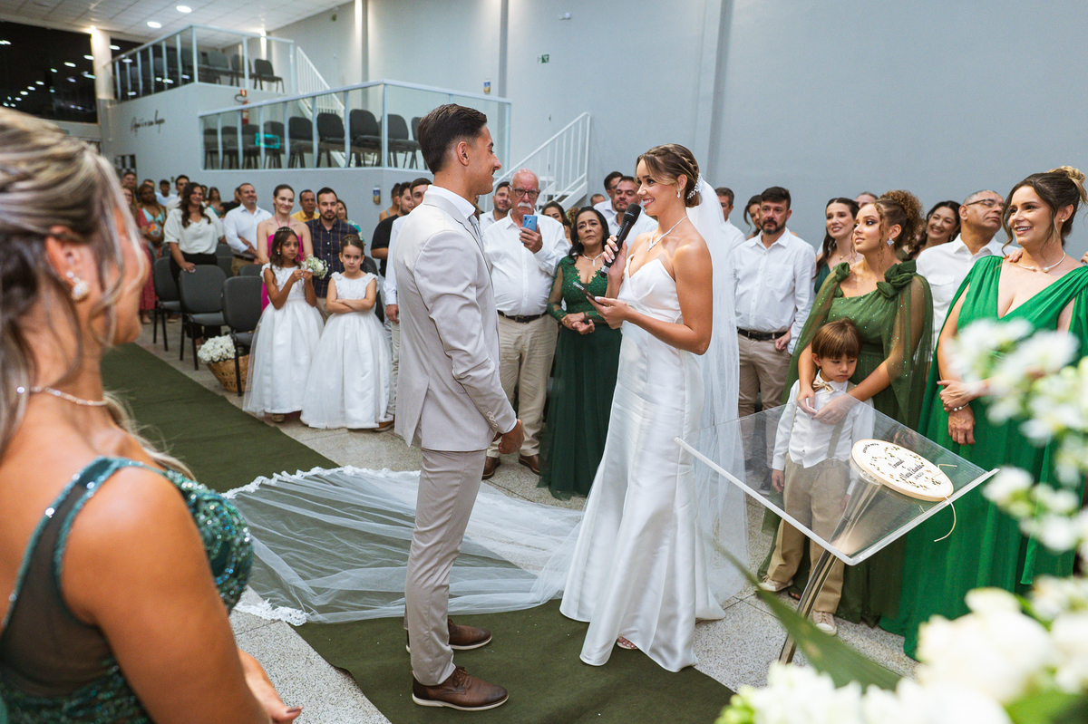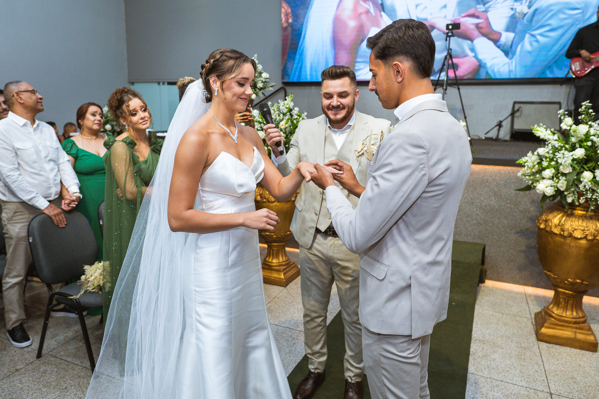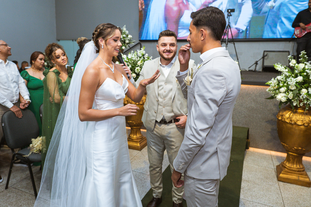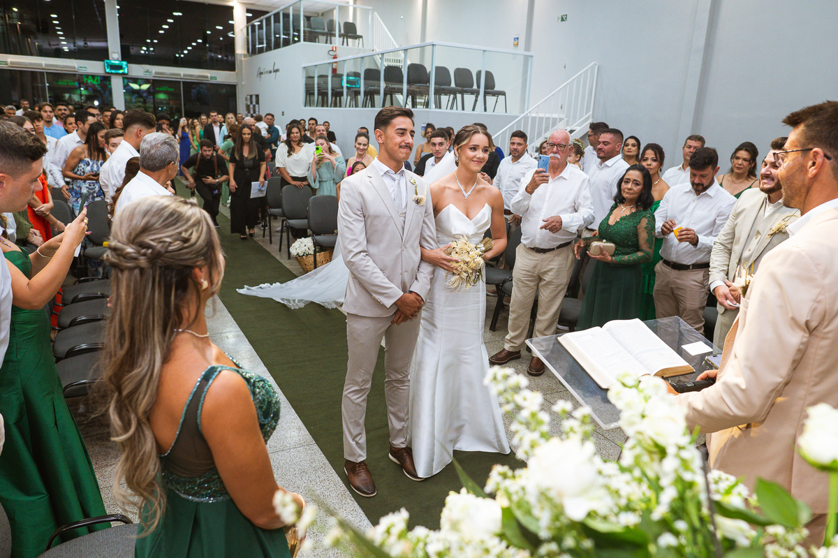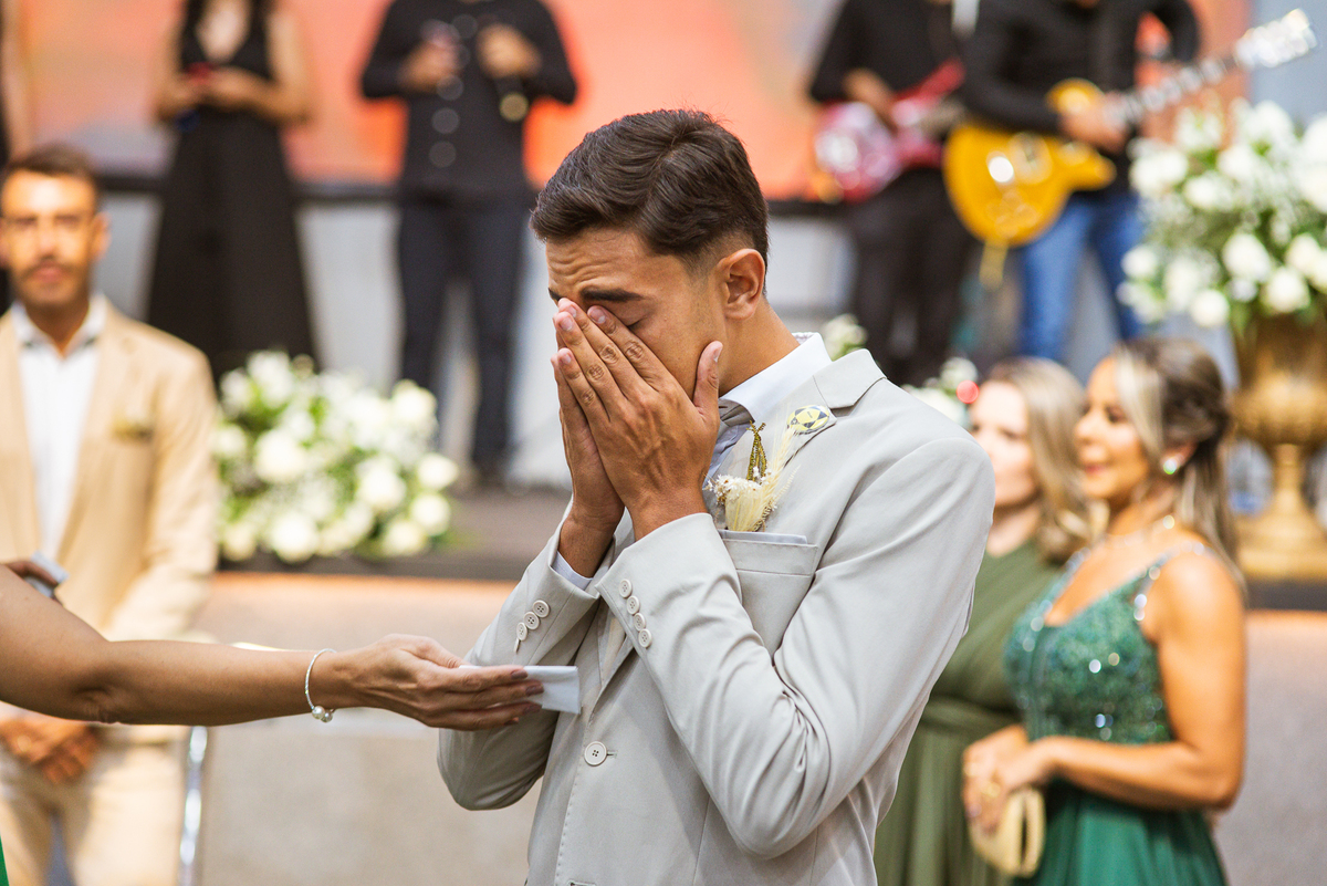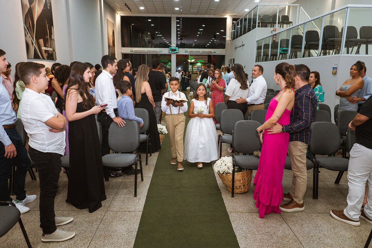 Emanuel recebeu sua noiva, com um respeitoso beijo em sua testa. Agora juntinhos, eles caminharam para receber a bênção de Deus sobre seu casamento. O celebrante foi nada menos do que o Pai do noivo. Ele os recebeu e trouxe uma palavra maravilhosa aos dois. Quando eu disse lá em cima que tive gratas surpresas, uma delas foi a que aconteceu logo depois da palavra. Os noivos prepararam uma lindíssima homenagem que eu nunca havia visto antes, nesses anos todos de profissão. Eles, carinhosamente e como sinal de gratidão, fizeram a cerimônia chamada "Lava pés". Em forma de agradecimento aos anos todos de cuidado e ensino até aquele dia, eles lavaram os pés de seus pais. Maria Eduarda começou lavando os pés de seu pai e depois de sua mãe. Nesse momento, foi difícil conter a emoção. Foi o sinônimo máximo de respeito que eu já vi. Emanuel a auxiliava. Depois, ele fez o mesmo com seus pais enquanto Duda o auxiliava. Foram momentos inesquecíveis que vivenciamos. Depois dessa homenagem, ainda tivemos a surpresa de que o pai da noiva, que também é pastor, concluir os votos e os declarar casados. Já pensou ter essa sorte de os dois pais celebrando o casamento? Pois então! Ele também trouxe mais um complemento de votos maravilhosos aos dois, e também pediu que eles trocassem seus votos um para o outro. As alianças foram trocadas e os votos pronunciados. Poucas pessoas não choraram nesse momento. Foi incrível ouvir um pouquinho da história de amor dos dois. Esse momento emocionou até as crianças que estavam presentes.