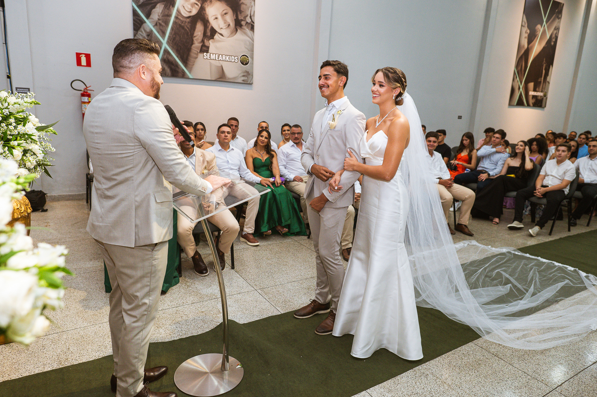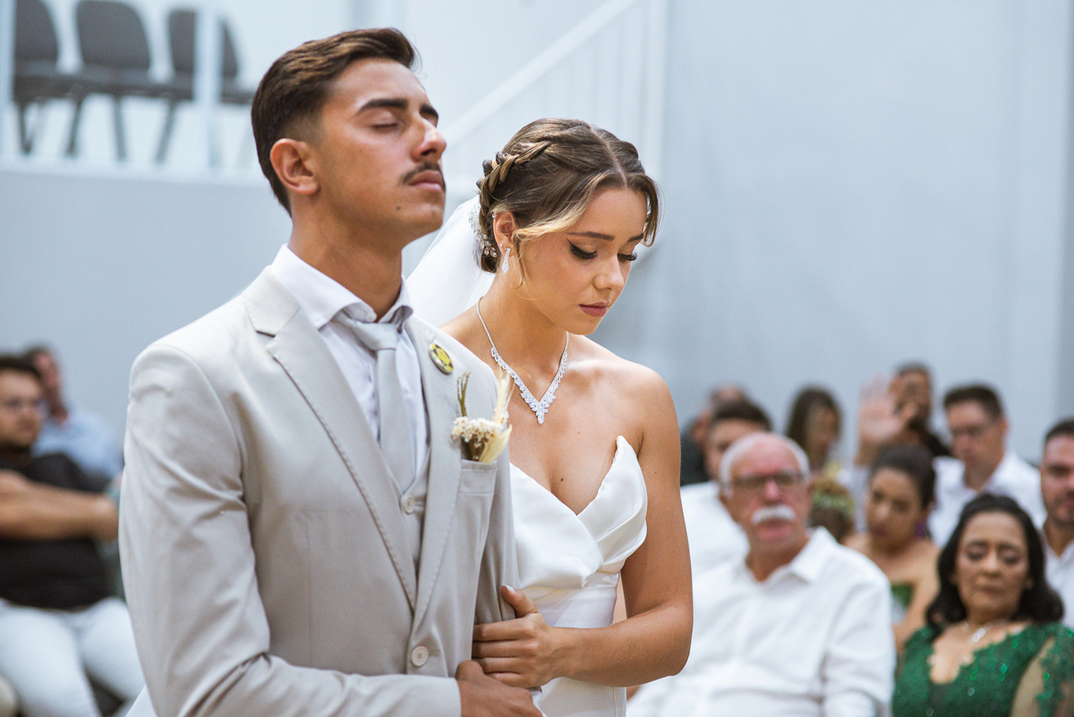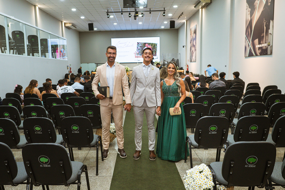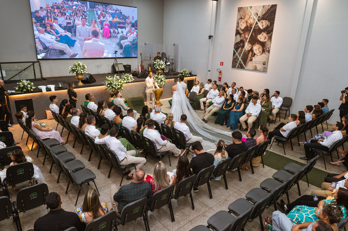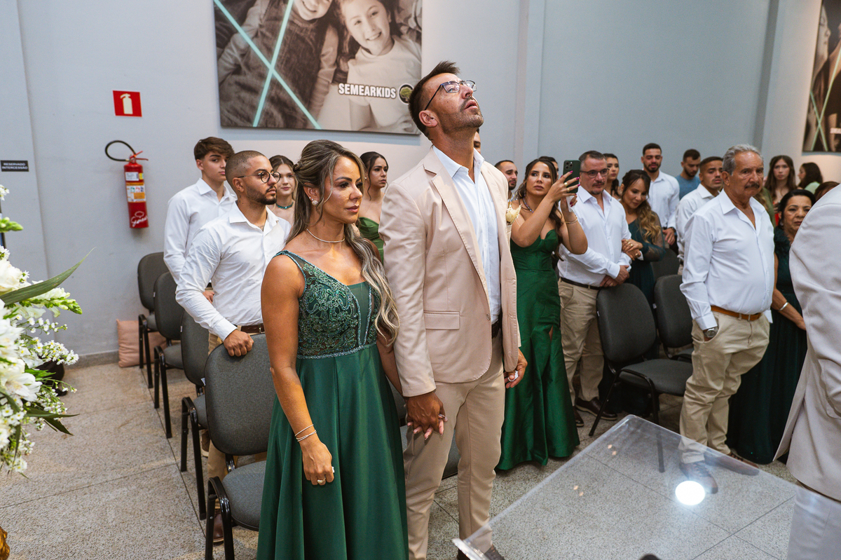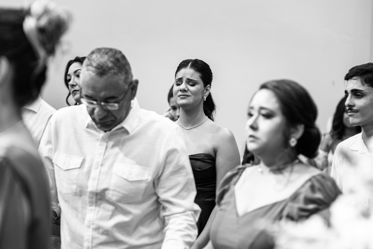 Emanuel recebeu sua noiva, com um respeitoso beijo em sua testa. Agora juntinhos, eles caminharam para receber a bênção de Deus sobre seu casamento. O celebrante foi nada menos do que o Pai do noivo. Ele os recebeu e trouxe uma palavra maravilhosa aos dois. Quando eu disse lá em cima que tive gratas surpresas, uma delas foi a que aconteceu logo depois da palavra. Os noivos prepararam uma lindíssima homenagem que eu nunca havia visto antes, nesses anos todos de profissão. Eles, carinhosamente e como sinal de gratidão, fizeram a cerimônia chamada "Lava pés". Em forma de agradecimento aos anos todos de cuidado e ensino até aquele dia, eles lavaram os pés de seus pais. Maria Eduarda começou lavando os pés de seu pai e depois de sua mãe. Nesse momento, foi difícil conter a emoção. Foi o sinônimo máximo de respeito que eu já vi. Emanuel a auxiliava. Depois, ele fez o mesmo com seus pais enquanto Duda o auxiliava. Foram momentos inesquecíveis que vivenciamos. Depois dessa homenagem, ainda tivemos a surpresa de que o pai da noiva, que também é pastor, concluir os votos e os declarar casados. Já pensou ter essa sorte de os dois pais celebrando o casamento? Pois então! Ele também trouxe mais um complemento de votos maravilhosos aos dois, e também pediu que eles trocassem seus votos um para o outro. As alianças foram trocadas e os votos pronunciados. Poucas pessoas não choraram nesse momento. Foi incrível ouvir um pouquinho da história de amor dos dois. Esse momento emocionou até as crianças que estavam presentes.