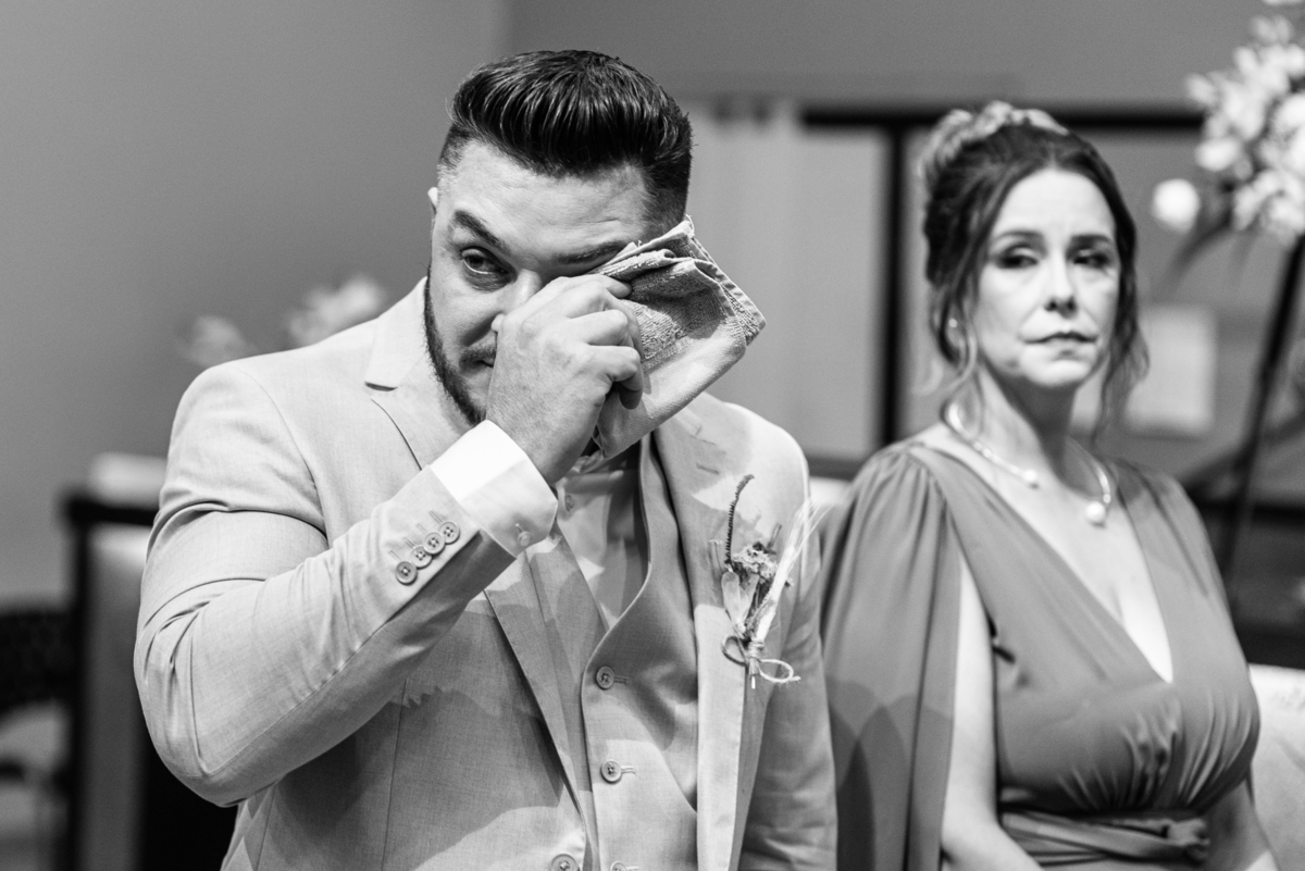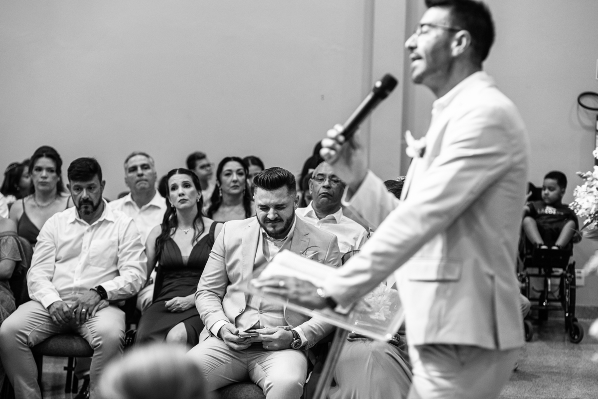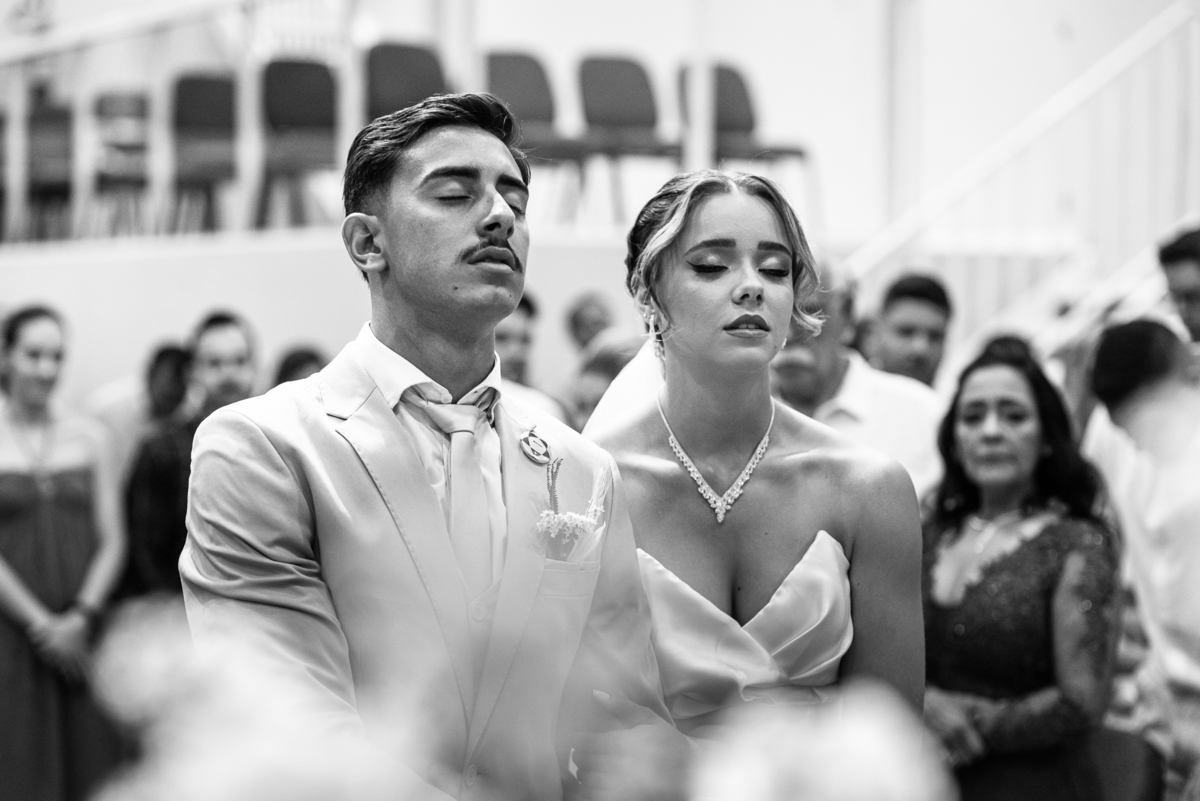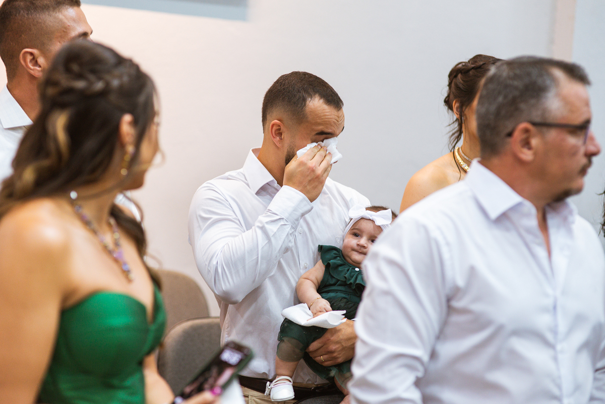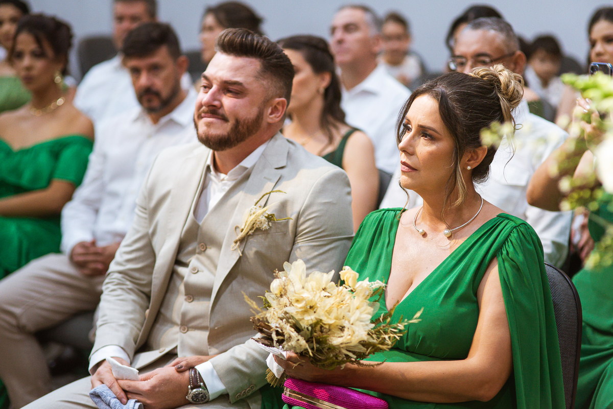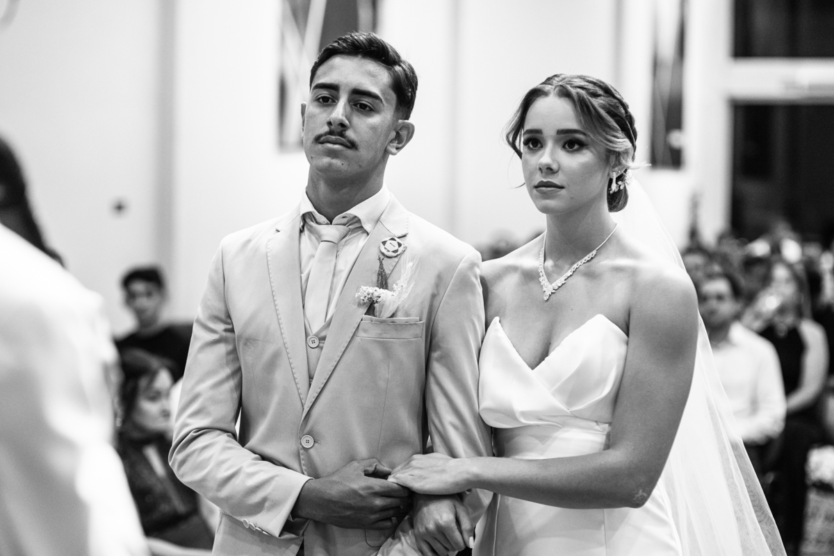 Emanuel recebeu sua noiva, com um respeitoso beijo em sua testa. Agora juntinhos, eles caminharam para receber a bênção de Deus sobre seu casamento. O celebrante foi nada menos do que o Pai do noivo. Ele os recebeu e trouxe uma palavra maravilhosa aos dois. Quando eu disse lá em cima que tive gratas surpresas, uma delas foi a que aconteceu logo depois da palavra. Os noivos prepararam uma lindíssima homenagem que eu nunca havia visto antes, nesses anos todos de profissão. Eles, carinhosamente e como sinal de gratidão, fizeram a cerimônia chamada "Lava pés". Em forma de agradecimento aos anos todos de cuidado e ensino até aquele dia, eles lavaram os pés de seus pais. Maria Eduarda começou lavando os pés de seu pai e depois de sua mãe. Nesse momento, foi difícil conter a emoção. Foi o sinônimo máximo de respeito que eu já vi. Emanuel a auxiliava. Depois, ele fez o mesmo com seus pais enquanto Duda o auxiliava. Foram momentos inesquecíveis que vivenciamos. Depois dessa homenagem, ainda tivemos a surpresa de que o pai da noiva, que também é pastor, concluir os votos e os declarar casados. Já pensou ter essa sorte de os dois pais celebrando o casamento? Pois então! Ele também trouxe mais um complemento de votos maravilhosos aos dois, e também pediu que eles trocassem seus votos um para o outro. As alianças foram trocadas e os votos pronunciados. Poucas pessoas não choraram nesse momento. Foi incrível ouvir um pouquinho da história de amor dos dois. Esse momento emocionou até as crianças que estavam presentes.
