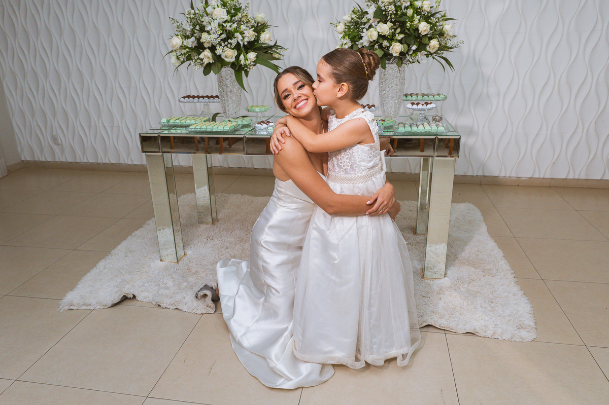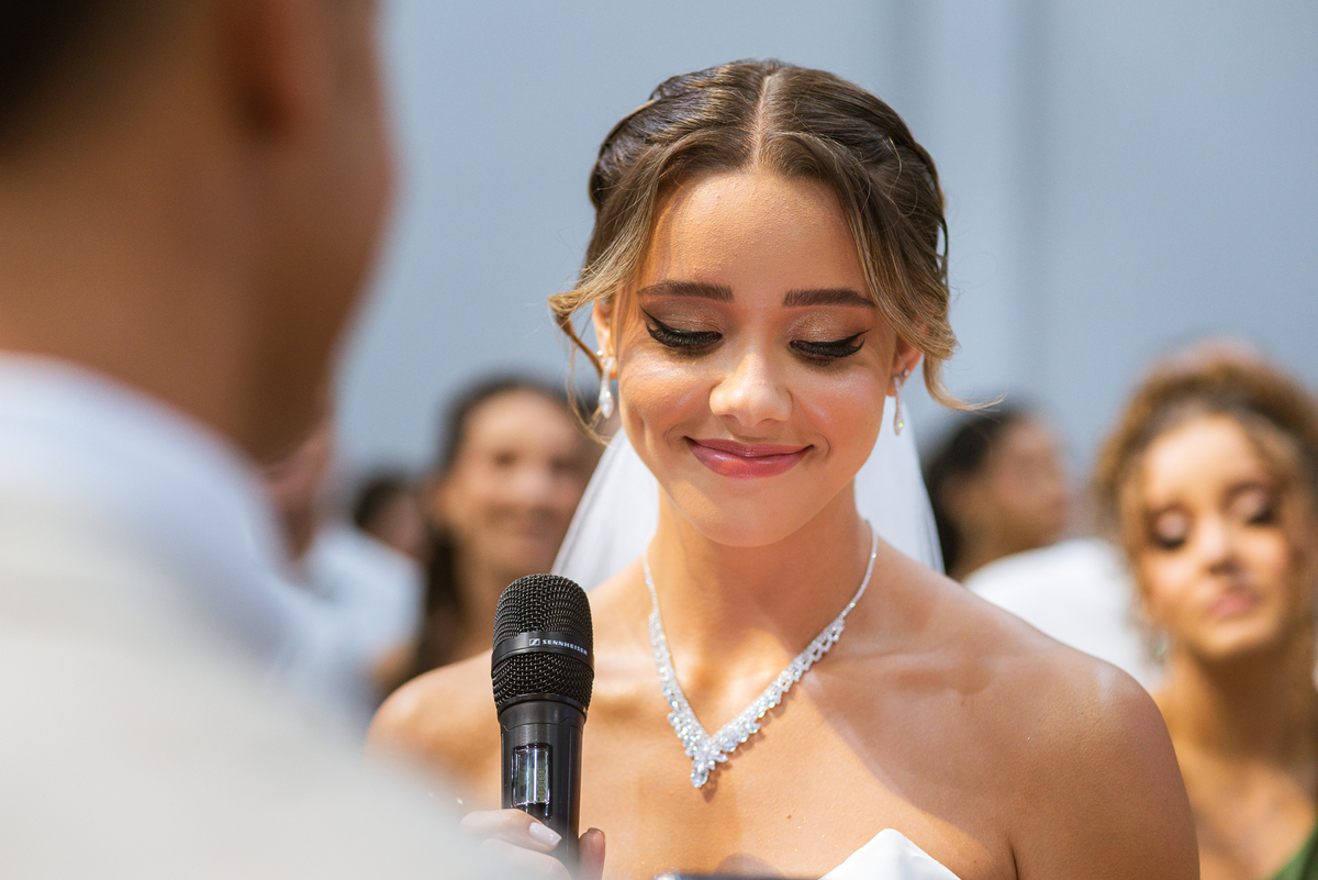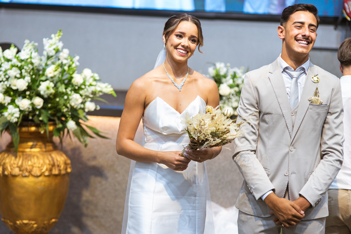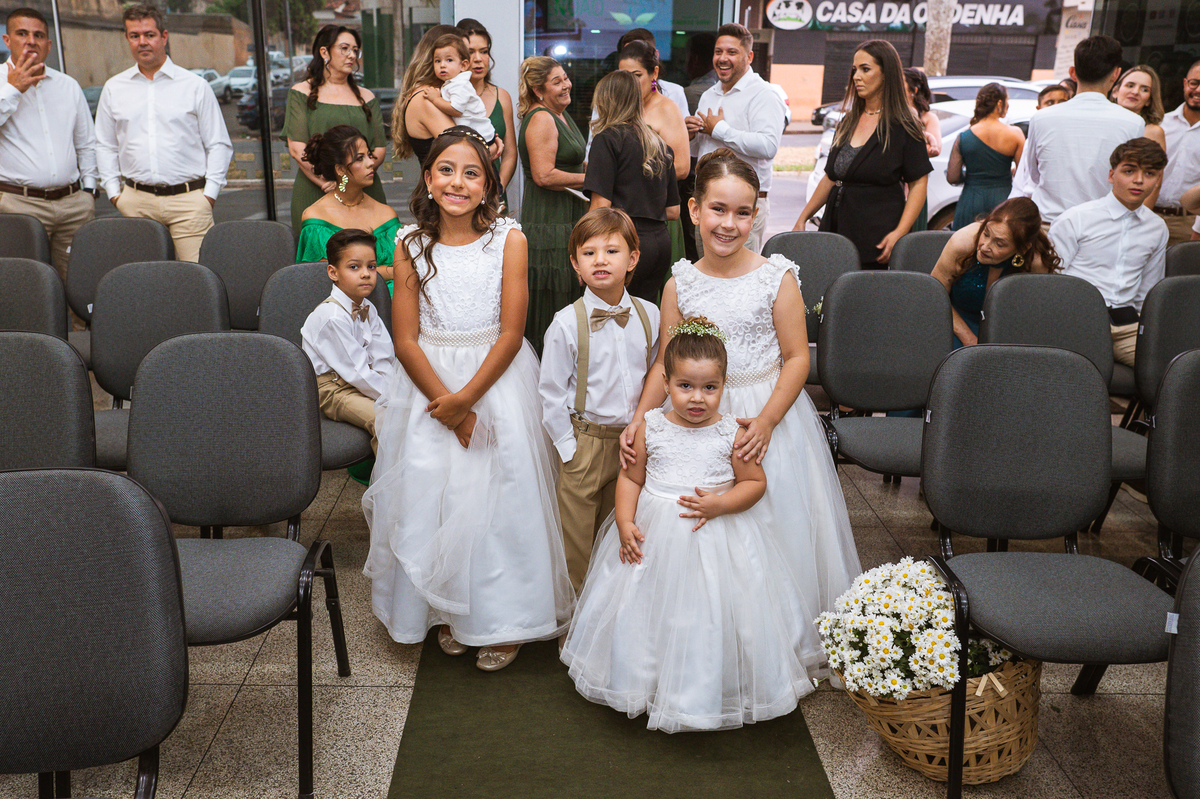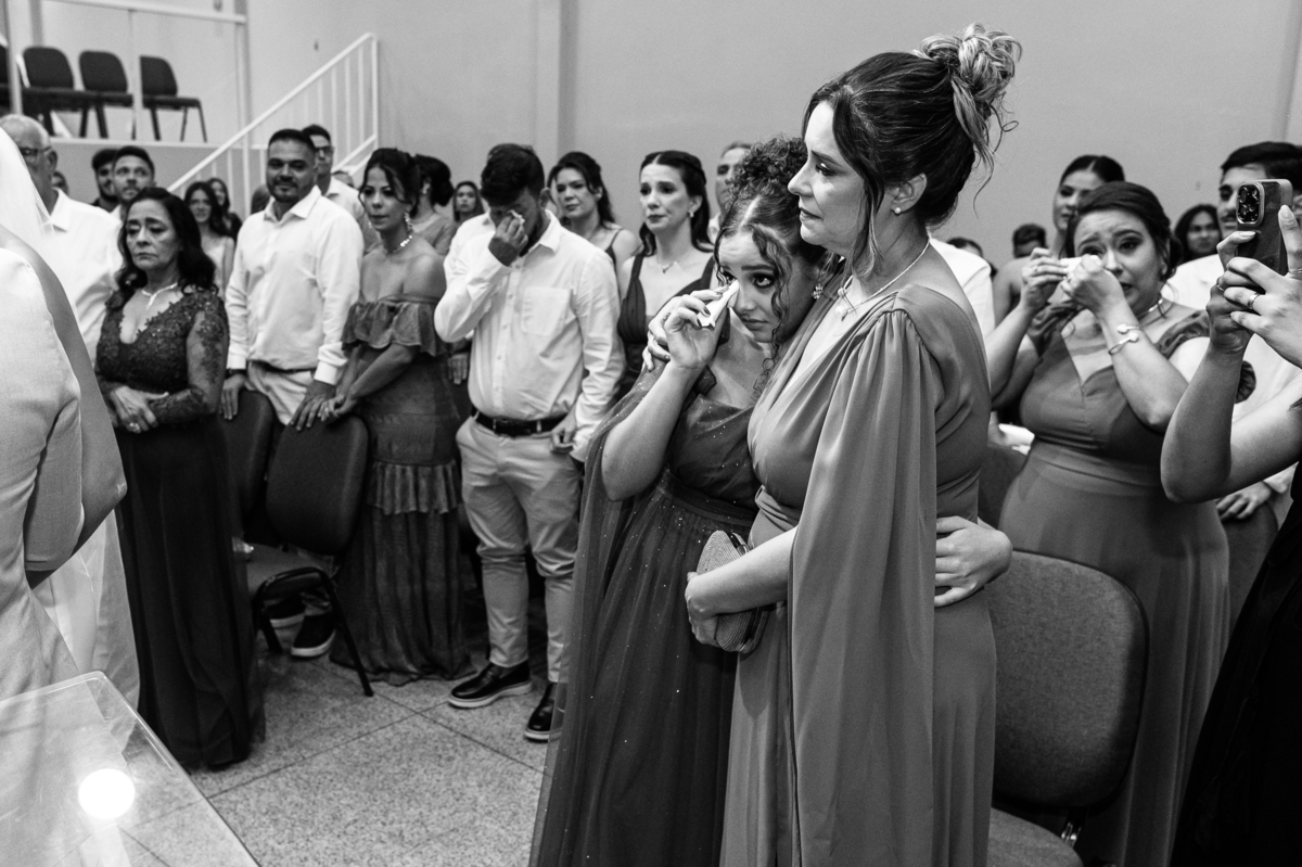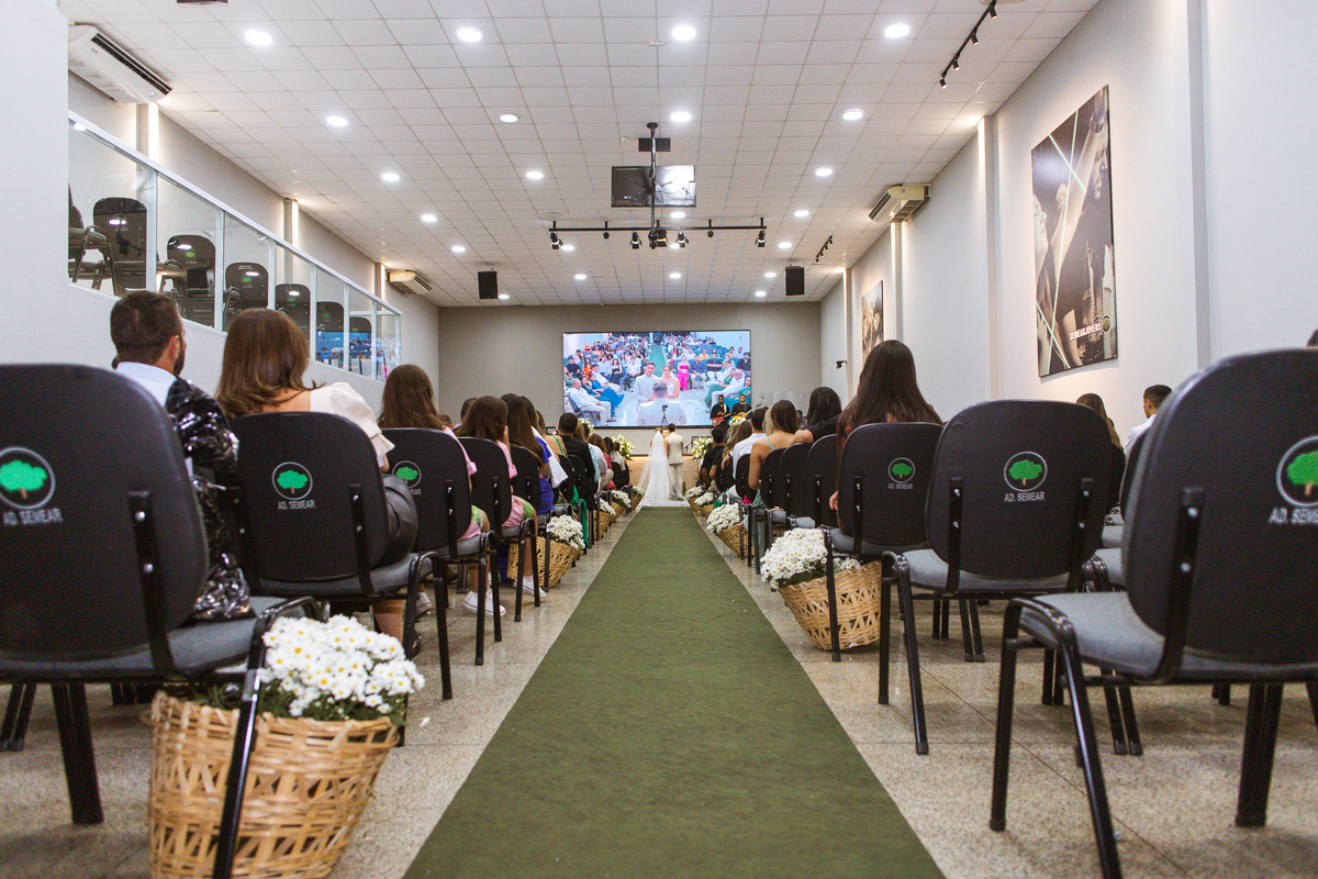 Emanuel recebeu sua noiva, com um respeitoso beijo em sua testa. Agora juntinhos, eles caminharam para receber a bênção de Deus sobre seu casamento. O celebrante foi nada menos do que o Pai do noivo. Ele os recebeu e trouxe uma palavra maravilhosa aos dois. Quando eu disse lá em cima que tive gratas surpresas, uma delas foi a que aconteceu logo depois da palavra. Os noivos prepararam uma lindíssima homenagem que eu nunca havia visto antes, nesses anos todos de profissão. Eles, carinhosamente e como sinal de gratidão, fizeram a cerimônia chamada "Lava pés". Em forma de agradecimento aos anos todos de cuidado e ensino até aquele dia, eles lavaram os pés de seus pais. Maria Eduarda começou lavando os pés de seu pai e depois de sua mãe. Nesse momento, foi difícil conter a emoção. Foi o sinônimo máximo de respeito que eu já vi. Emanuel a auxiliava. Depois, ele fez o mesmo com seus pais enquanto Duda o auxiliava. Foram momentos inesquecíveis que vivenciamos. Depois dessa homenagem, ainda tivemos a surpresa de que o pai da noiva, que também é pastor, concluir os votos e os declarar casados. Já pensou ter essa sorte de os dois pais celebrando o casamento? Pois então! Ele também trouxe mais um complemento de votos maravilhosos aos dois, e também pediu que eles trocassem seus votos um para o outro. As alianças foram trocadas e os votos pronunciados. Poucas pessoas não choraram nesse momento. Foi incrível ouvir um pouquinho da história de amor dos dois. Esse momento emocionou até as crianças que estavam presentes.