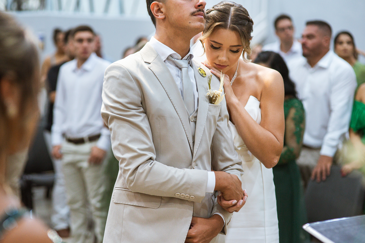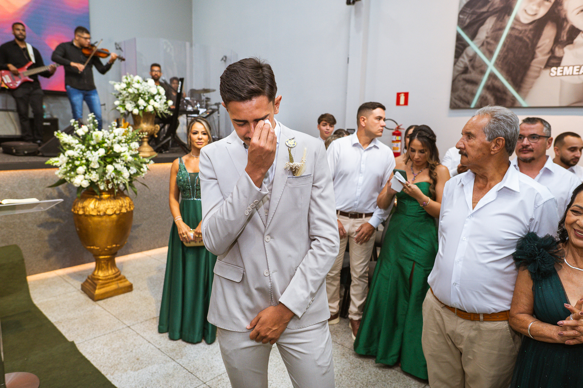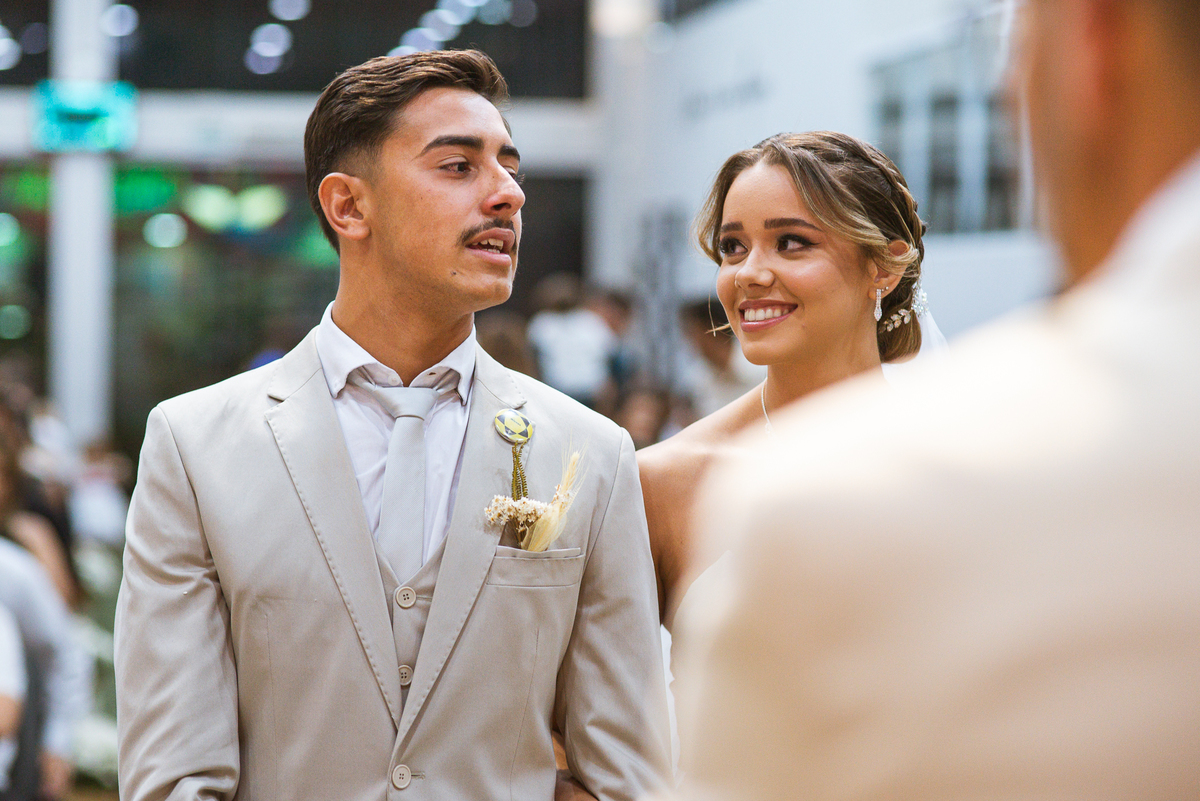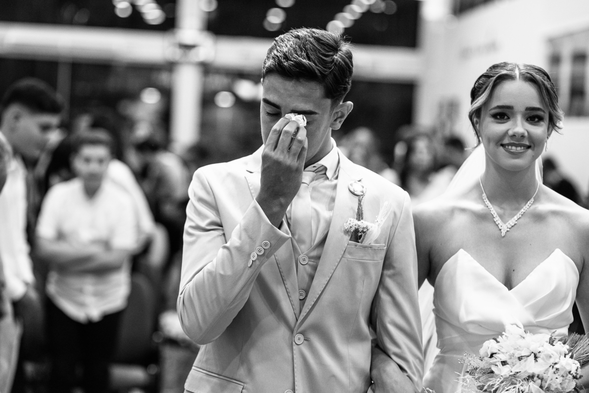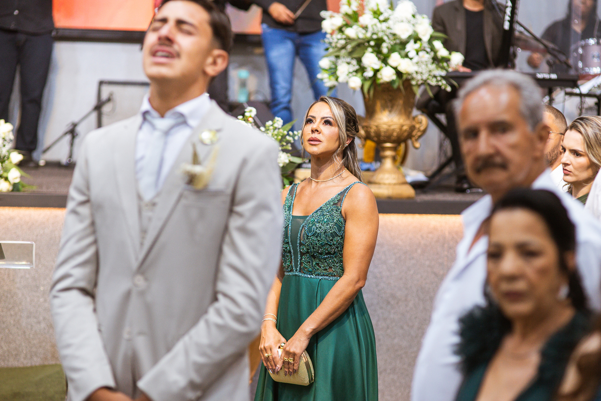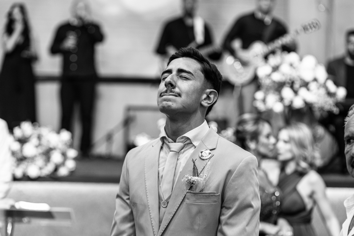 E não foi só ela a se emocionar grandemente com toda a celebração. Os pais dos noivos, da noiva e também vários padrinhos precisaram enxugar suas lágrimas durante todo o casamento. Chegada a hora da noiva entrar, o coração e os olhos de todos se voltaram para a entrada da Igreja. Quando Duda surgiu de braços dados com seu pai, Emanuel quase não se segurou de felicidade e uma alegria contagiantes. Sempre agradecendo à Deus e louvando enquanto via sua noiva caminhando ao seu encontro. Passo a passo, noiva e seu pai chegavam mais perto do encontro final. Emanuel recebeu seu sogro e com um beijo carinhoso no rosto ele o abraçou fortemente. Depois de se despedir da filha, ele entregou a mão dela ao noivo. Foi a primeira troca de olhares olho no olho dos dois naquele dia. Parecia que mil palavras foram ditas naqueles segundos de olhares...