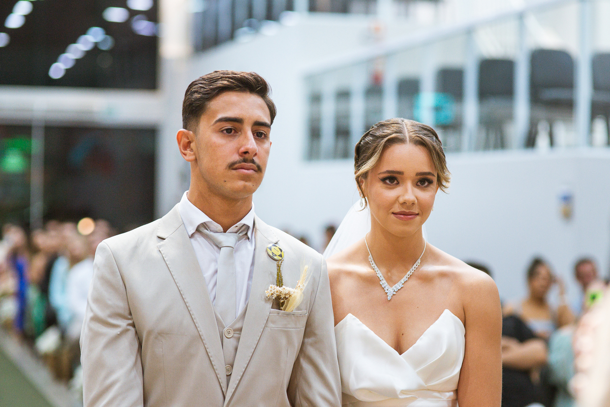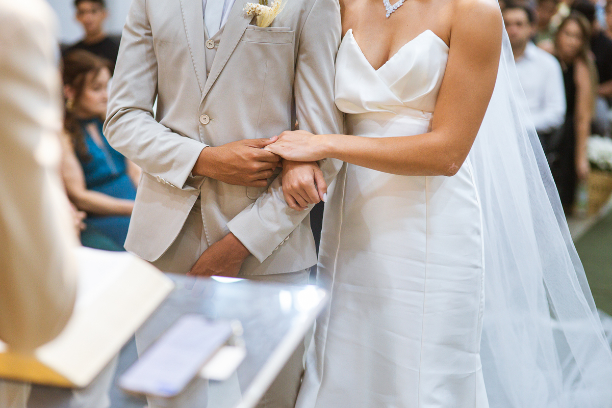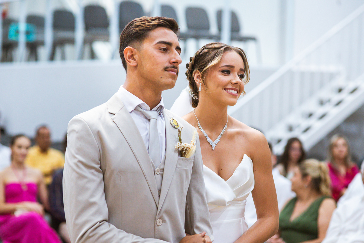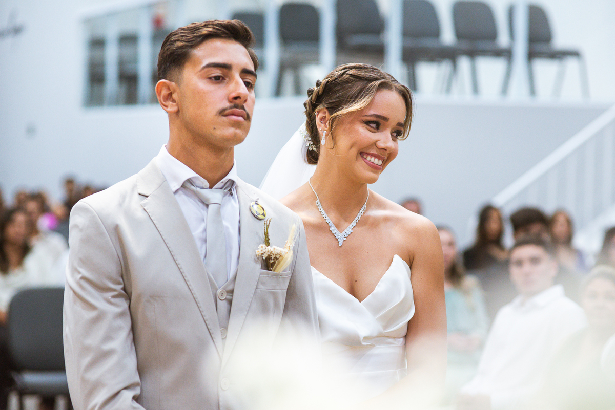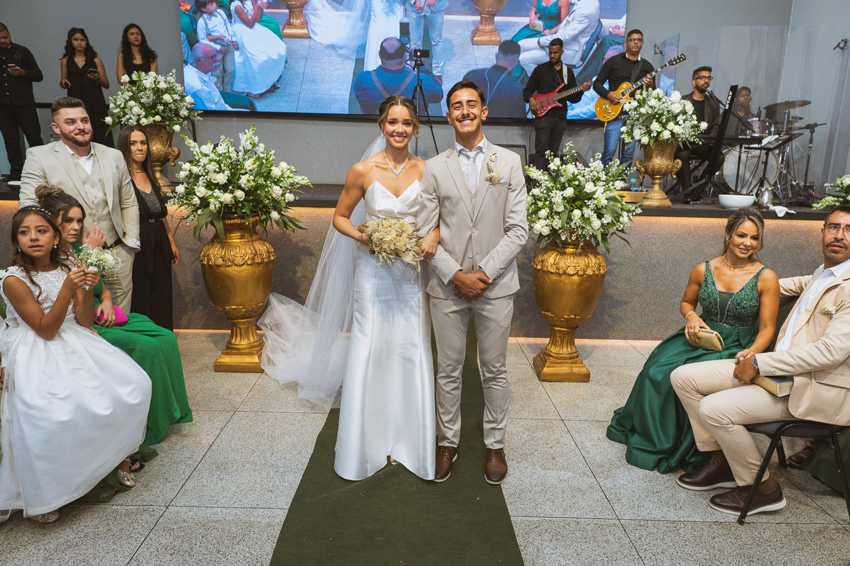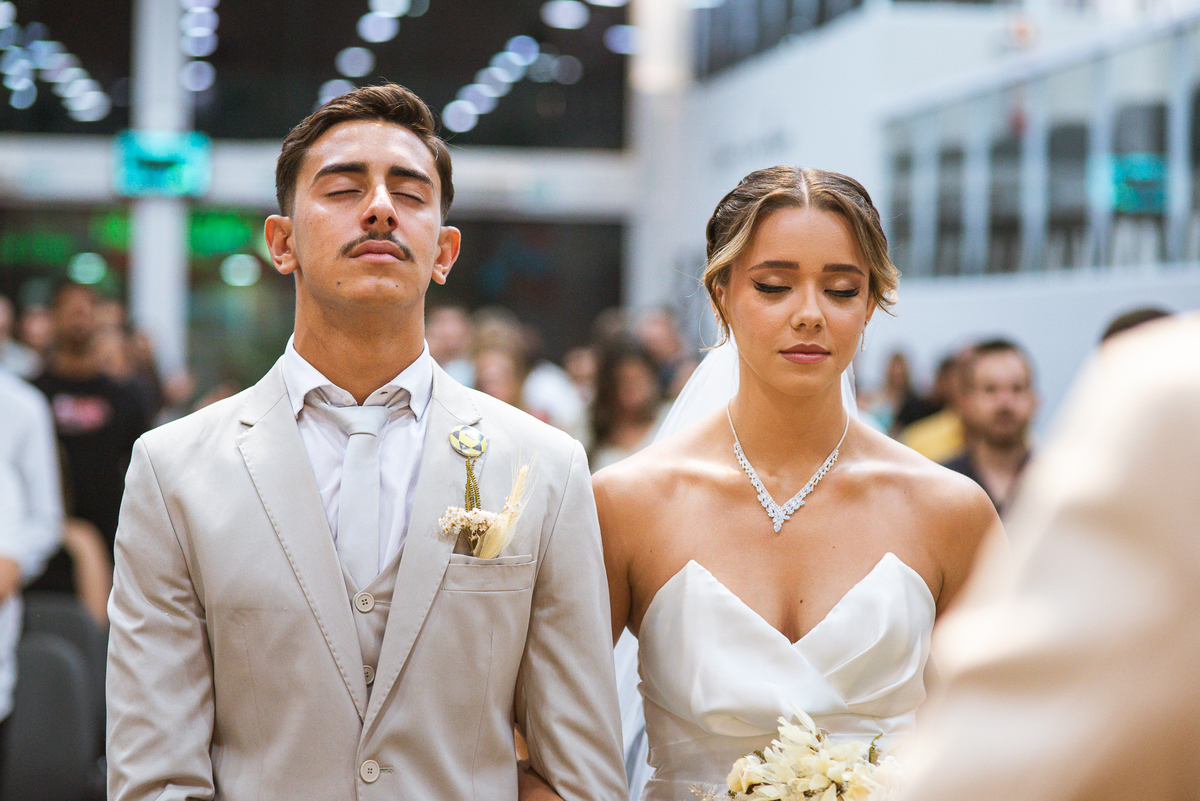 E não foi só ela a se emocionar grandemente com toda a celebração. Os pais dos noivos, da noiva e também vários padrinhos precisaram enxugar suas lágrimas durante todo o casamento. Chegada a hora da noiva entrar, o coração e os olhos de todos se voltaram para a entrada da Igreja. Quando Duda surgiu de braços dados com seu pai, Emanuel quase não se segurou de felicidade e uma alegria contagiantes. Sempre agradecendo à Deus e louvando enquanto via sua noiva caminhando ao seu encontro. Passo a passo, noiva e seu pai chegavam mais perto do encontro final. Emanuel recebeu seu sogro e com um beijo carinhoso no rosto ele o abraçou fortemente. Depois de se despedir da filha, ele entregou a mão dela ao noivo. Foi a primeira troca de olhares olho no olho dos dois naquele dia. Parecia que mil palavras foram ditas naqueles segundos de olhares...