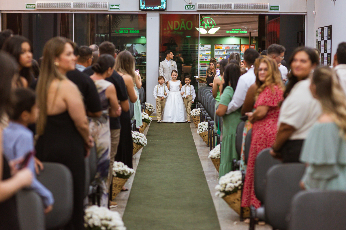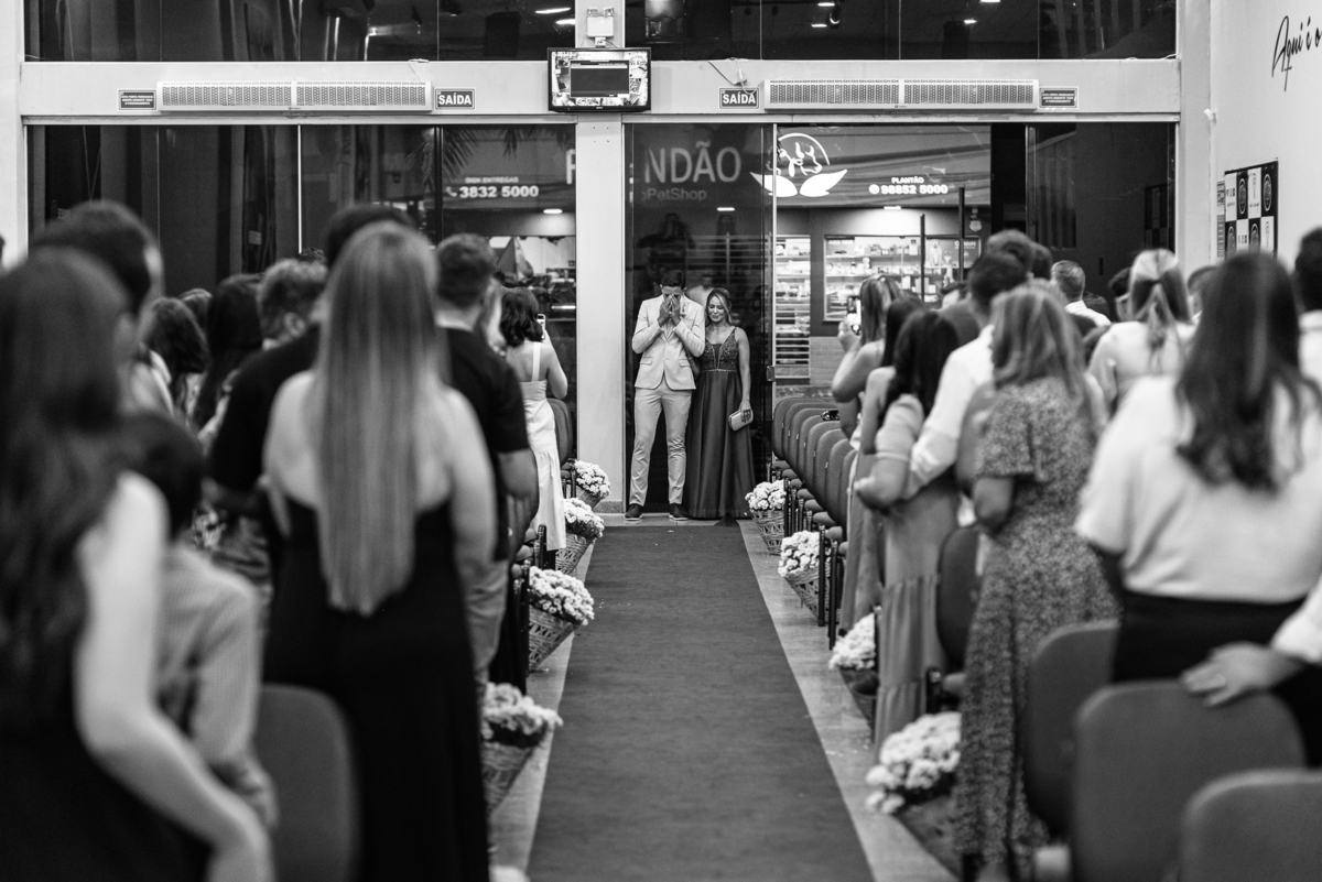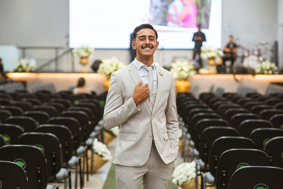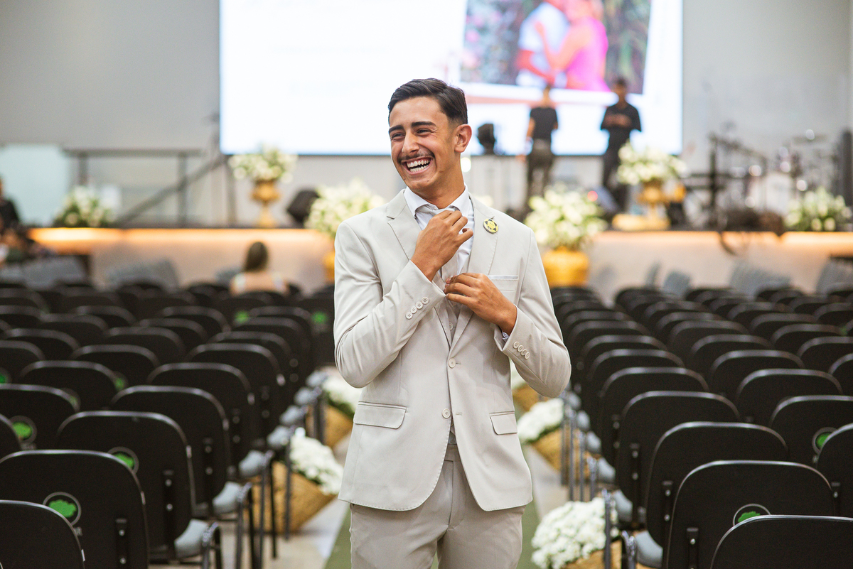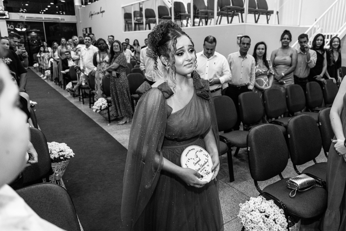 Aos poucos, as daminhas foram chegando e cada uma mais lindinha que a outra. Fizemos algumas fotos do noivo com seus pais e logo a cerimônia começou. O noivo entrou de mãos dadas com sua mãe, visivelmente emocionado do início ao fim do corredor. Quando chegou bem próximo do altar, ele despediu-se de sua mãe com um forte abraço e um respeitoso beijo na testa. O pai e mãe da noiva também entraram muito emocionados. Do lado de fora, ele já demonstrava que o coração estava apertado. Os olhos marejados de lágrimas já denunciavam que o misto de sentimentos estava à flor da pele. Na vez dos pajens, eles adentraram com suas plaquinhas anunciando a hora em que a noiva chegou. Emanuel visivelmente emocionado também aguardava ansiosamente a entrada de sua noiva. Do lado de fora, Maria Eduarda já havia descido do carro. De mãos dadas com seu pai, ela caminhava rumo a entrada do templo. Sua irmã acompanhava de perto, com os olhos cheios de lágrimas ela mal podia conter a emoção.