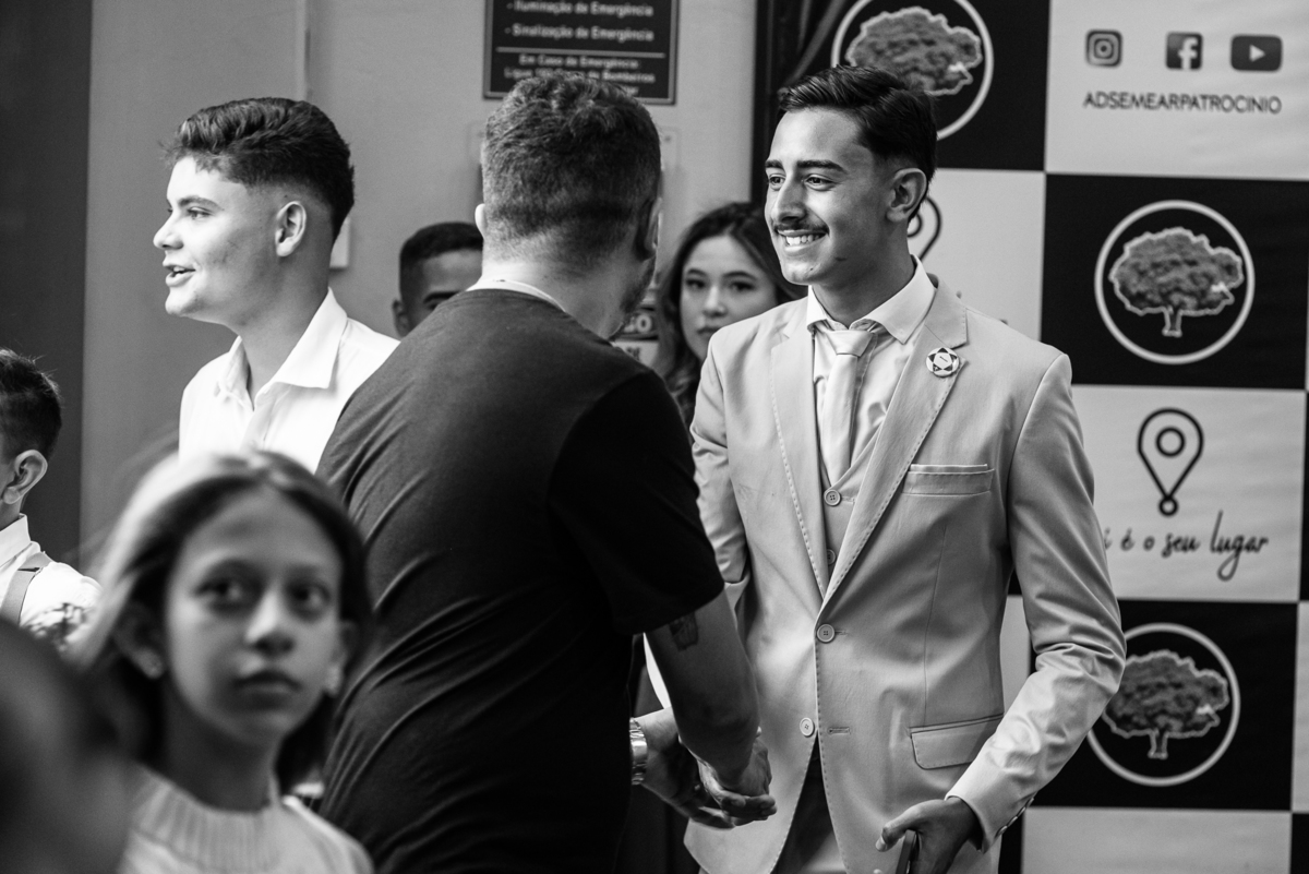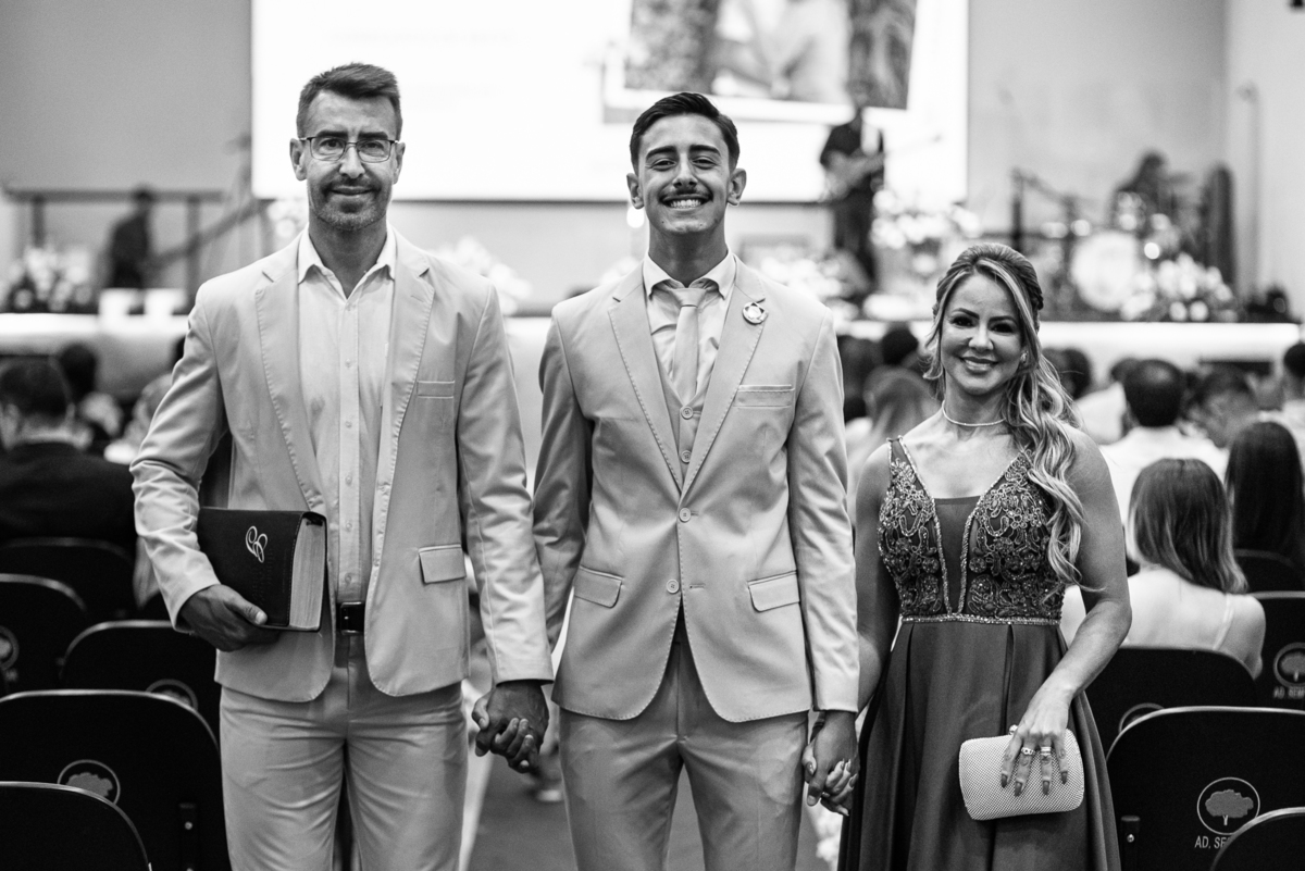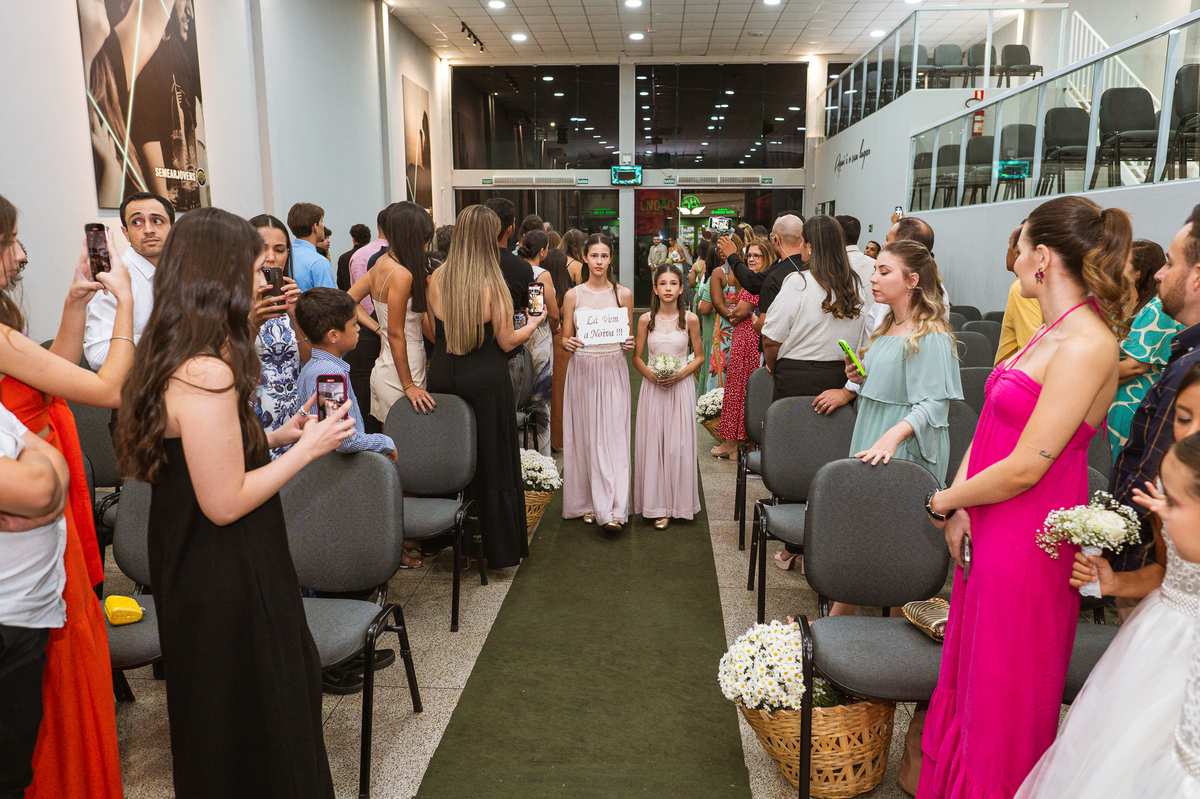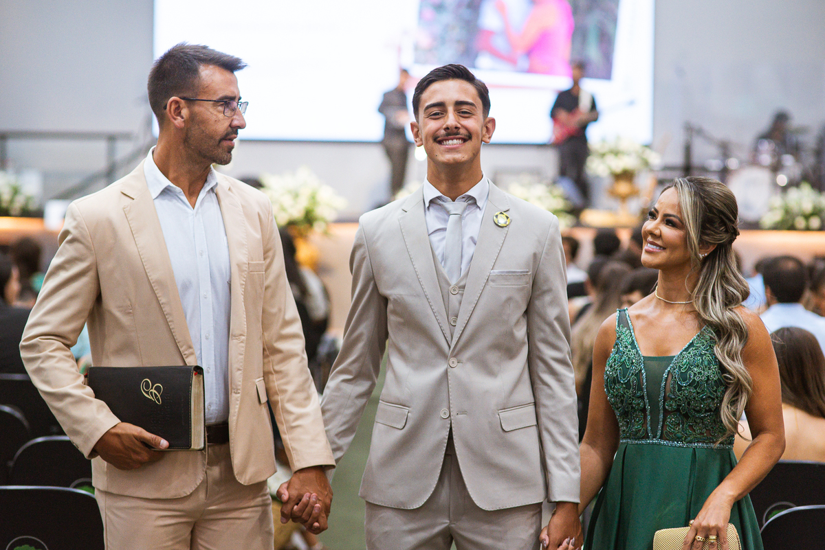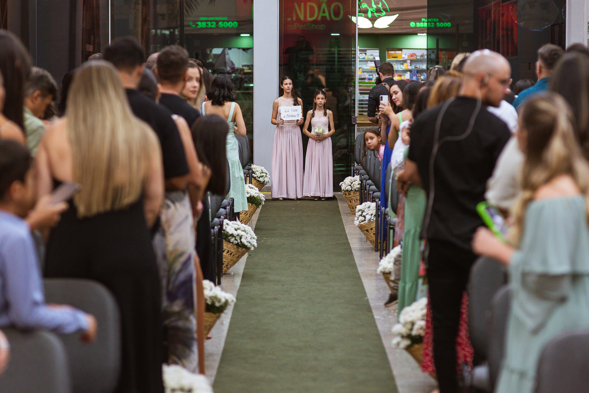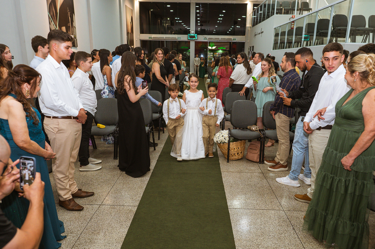 Aos poucos, as daminhas foram chegando e cada uma mais lindinha que a outra. Fizemos algumas fotos do noivo com seus pais e logo a cerimônia começou. O noivo entrou de mãos dadas com sua mãe, visivelmente emocionado do início ao fim do corredor. Quando chegou bem próximo do altar, ele despediu-se de sua mãe com um forte abraço e um respeitoso beijo na testa. O pai e mãe da noiva também entraram muito emocionados. Do lado de fora, ele já demonstrava que o coração estava apertado. Os olhos marejados de lágrimas já denunciavam que o misto de sentimentos estava à flor da pele. Na vez dos pajens, eles adentraram com suas plaquinhas anunciando a hora em que a noiva chegou. Emanuel visivelmente emocionado também aguardava ansiosamente a entrada de sua noiva. Do lado de fora, Maria Eduarda já havia descido do carro. De mãos dadas com seu pai, ela caminhava rumo a entrada do templo. Sua irmã acompanhava de perto, com os olhos cheios de lágrimas ela mal podia conter a emoção.
