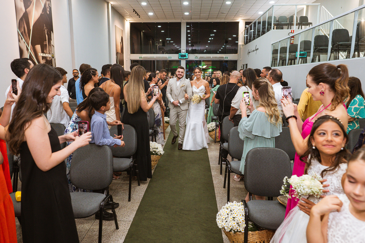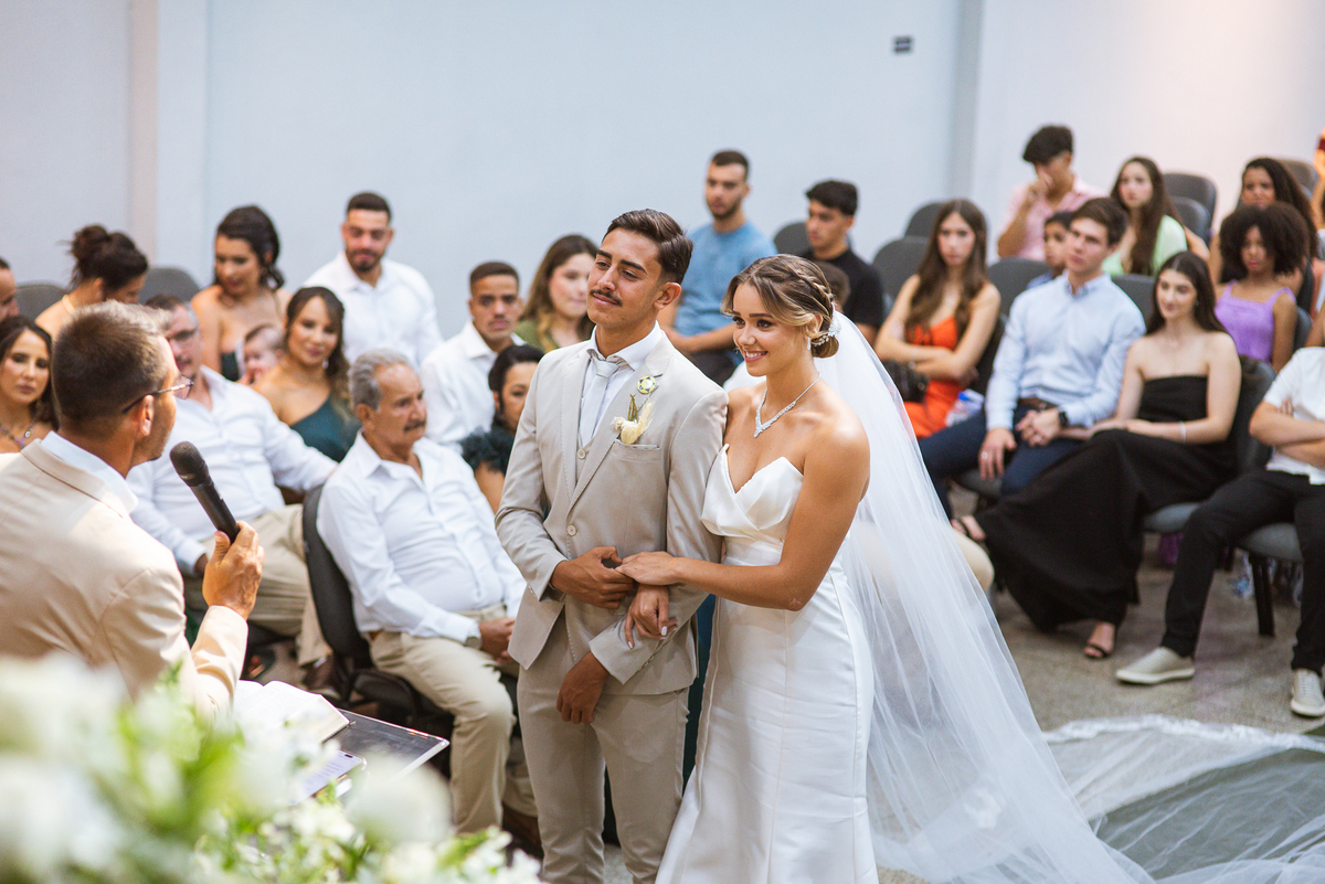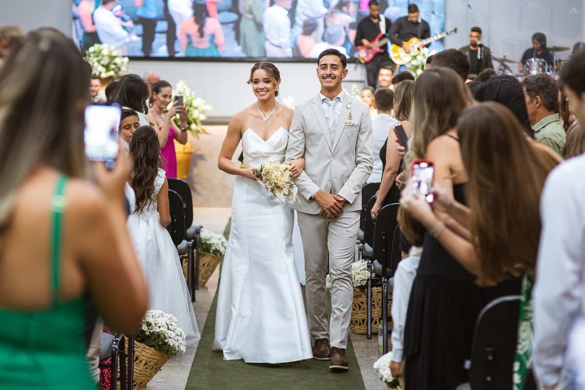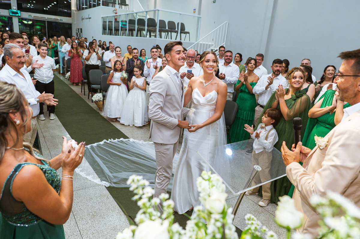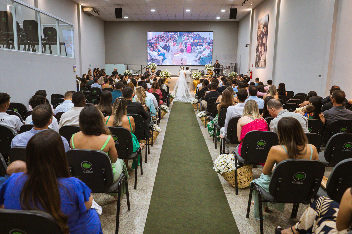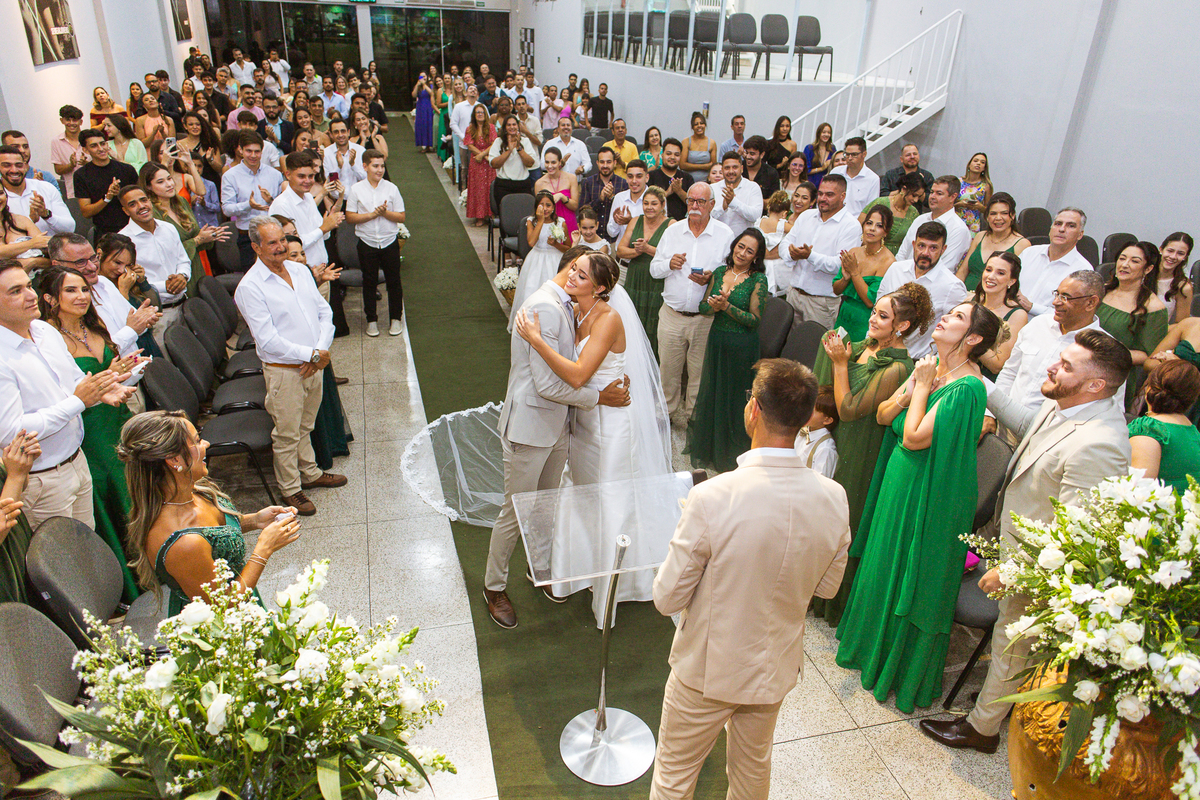 Posteriormente, os noivos receberam a oração de toda a Igreja e foram declarados casados. Com bastante festa, eles comemoraram muito junto com seus convidados. Fizemos nossas fotografias de praxe com todos os padrinhos e parentes e logo os noivos estavam saindo. No corredor, eles receberam as palmas de seus convidados e ao final comemoraram muito aquele momento. Ao findar da celebração, fomos para a recepção. Outra surpresa que tivemos foi que mesmo com um calor jamais visto antes, os céus se fecharam e uma chuvinha muito inesperada caiu levemente sobre a cidade. Pra quem chegou lá debaixo de um calor de quase 40 graus, uma chuva repentina foi quase como um sinal divino, não é? Os noivos foram juntamente com seus convidados para a recepção, onde fizemos mais algumas fotos dos noivos e também acompanhamos o corte da gravata. Finalizamos o dia com a sensação de dever cumprido e com o coração repleto de alegria. Foram momentos únicos e vivenciados de uma maneira inesquecível.