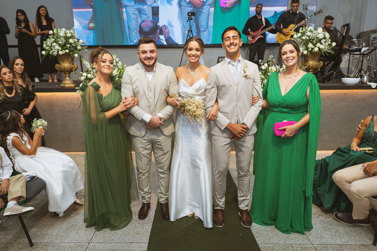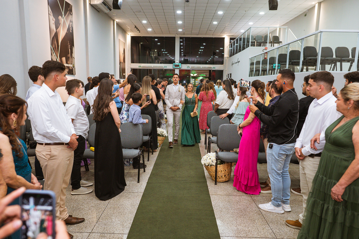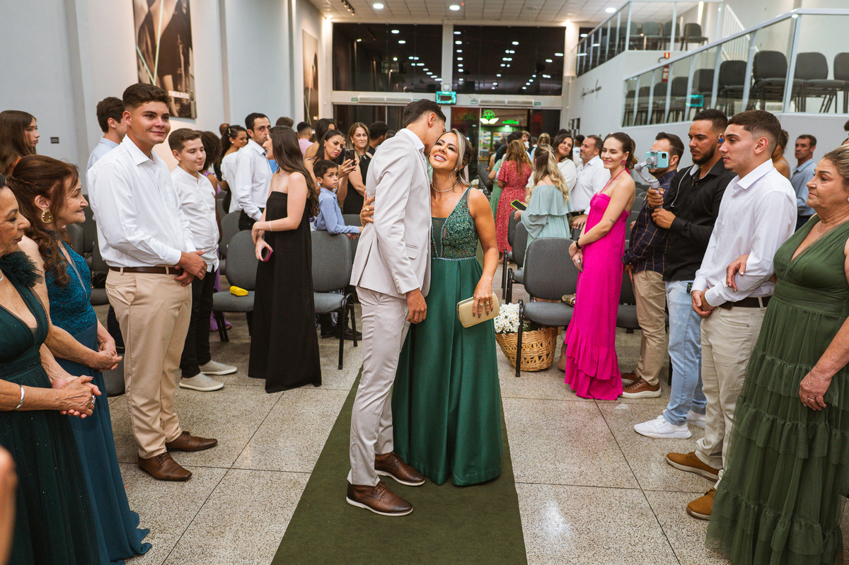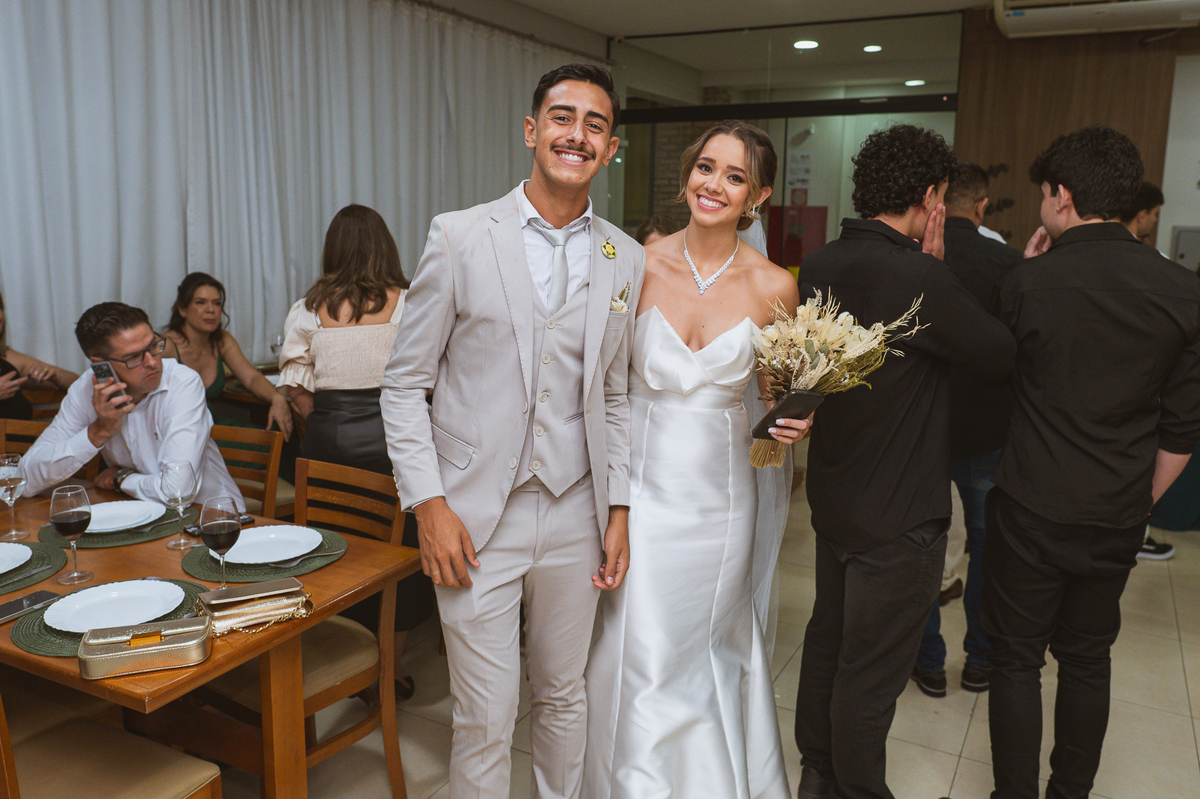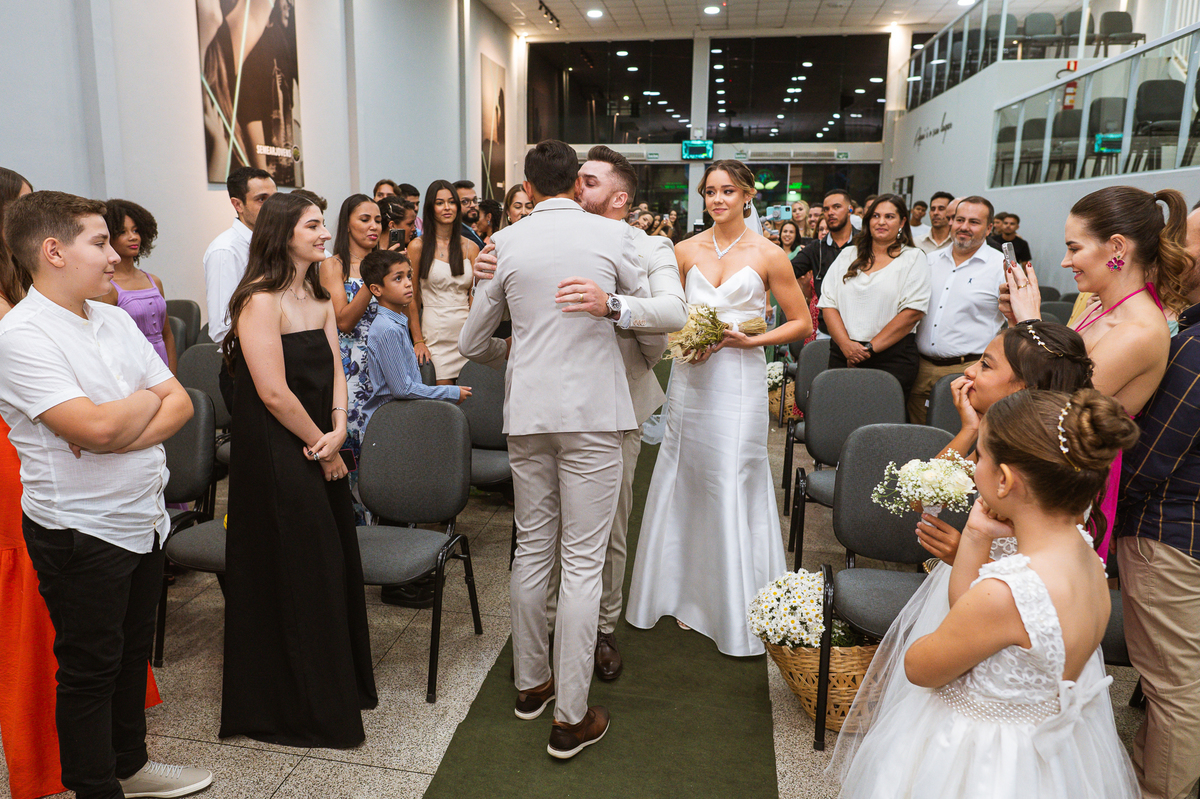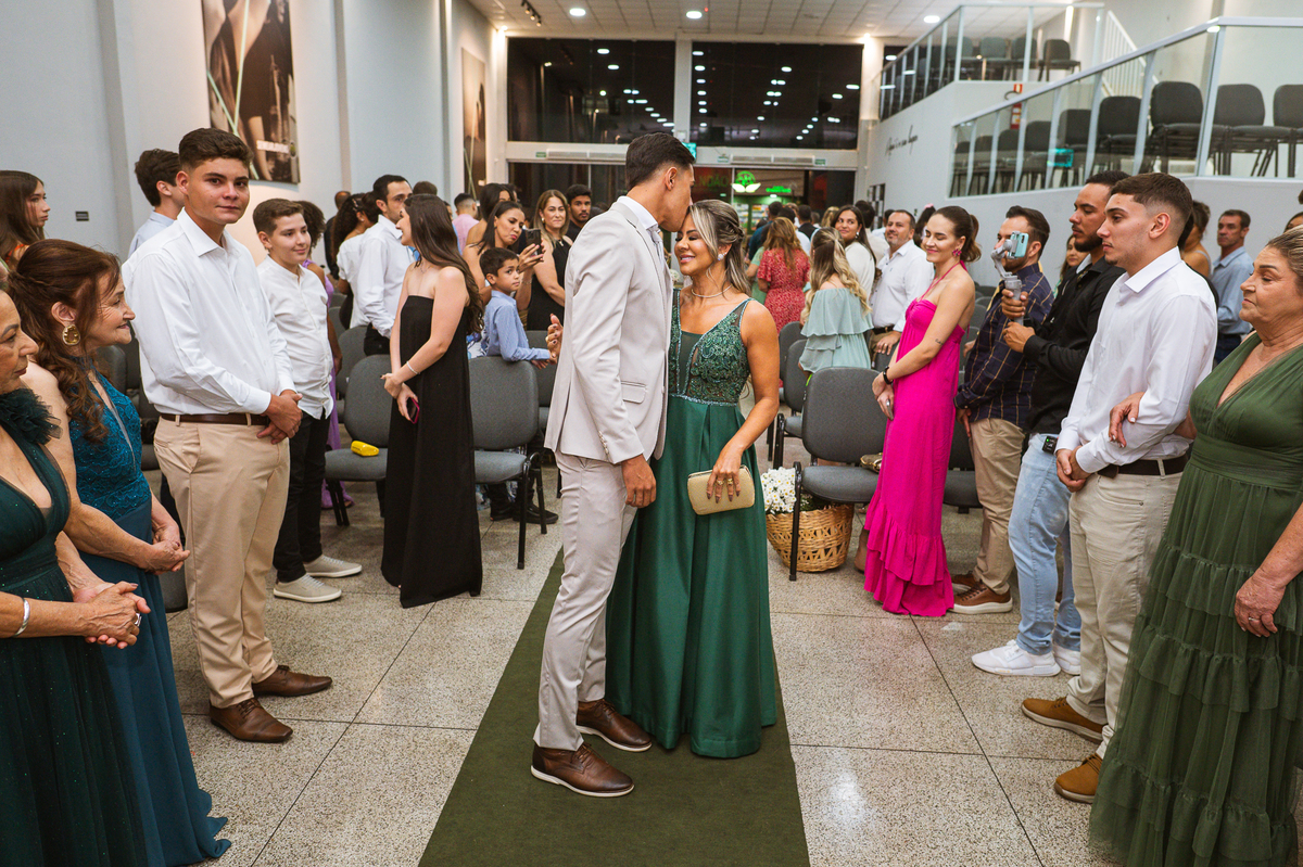 Posteriormente, os noivos receberam a oração de toda a Igreja e foram declarados casados. Com bastante festa, eles comemoraram muito junto com seus convidados. Fizemos nossas fotografias de praxe com todos os padrinhos e parentes e logo os noivos estavam saindo. No corredor, eles receberam as palmas de seus convidados e ao final comemoraram muito aquele momento. Ao findar da celebração, fomos para a recepção. Outra surpresa que tivemos foi que mesmo com um calor jamais visto antes, os céus se fecharam e uma chuvinha muito inesperada caiu levemente sobre a cidade. Pra quem chegou lá debaixo de um calor de quase 40 graus, uma chuva repentina foi quase como um sinal divino, não é? Os noivos foram juntamente com seus convidados para a recepção, onde fizemos mais algumas fotos dos noivos e também acompanhamos o corte da gravata. Finalizamos o dia com a sensação de dever cumprido e com o coração repleto de alegria. Foram momentos únicos e vivenciados de uma maneira inesquecível.