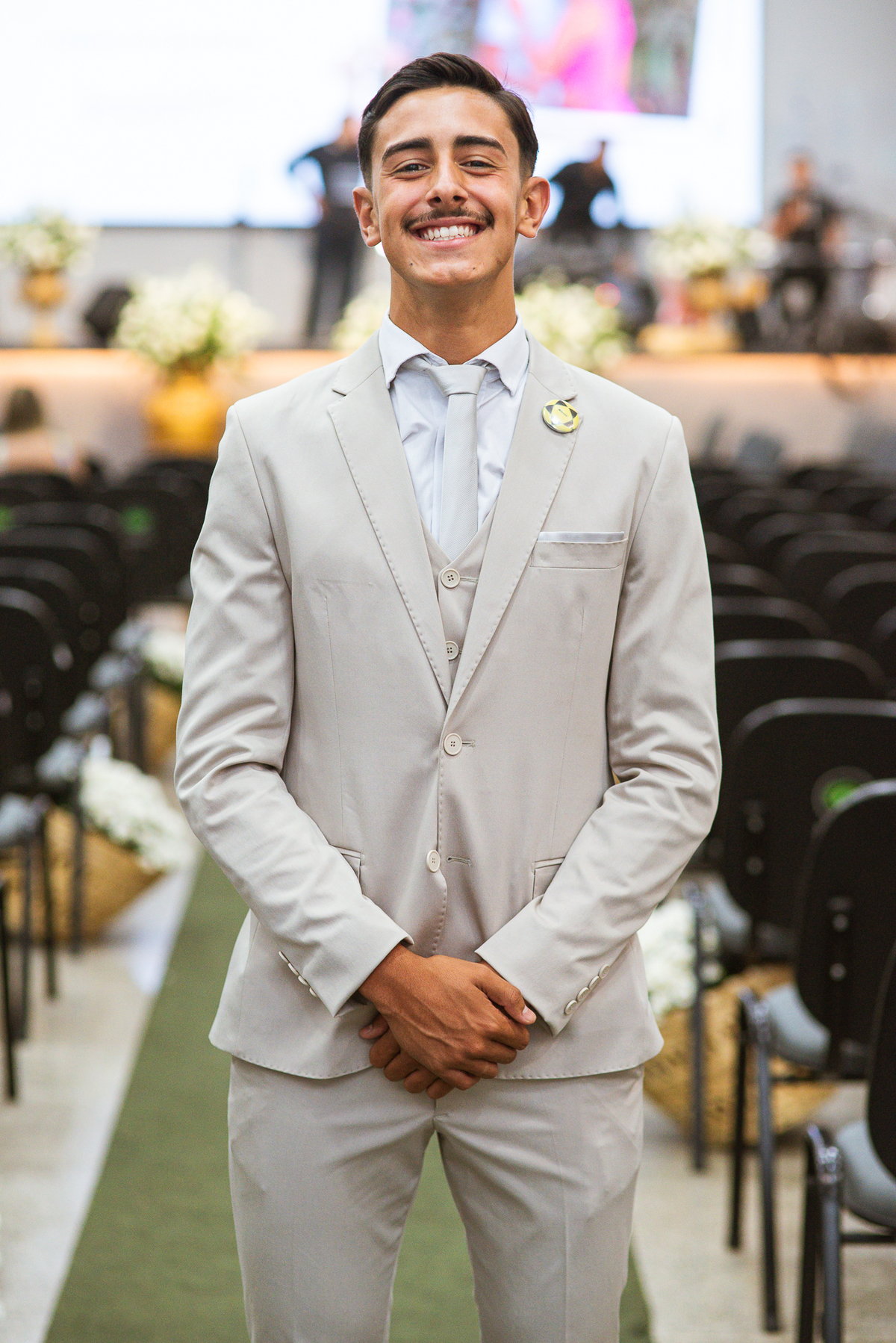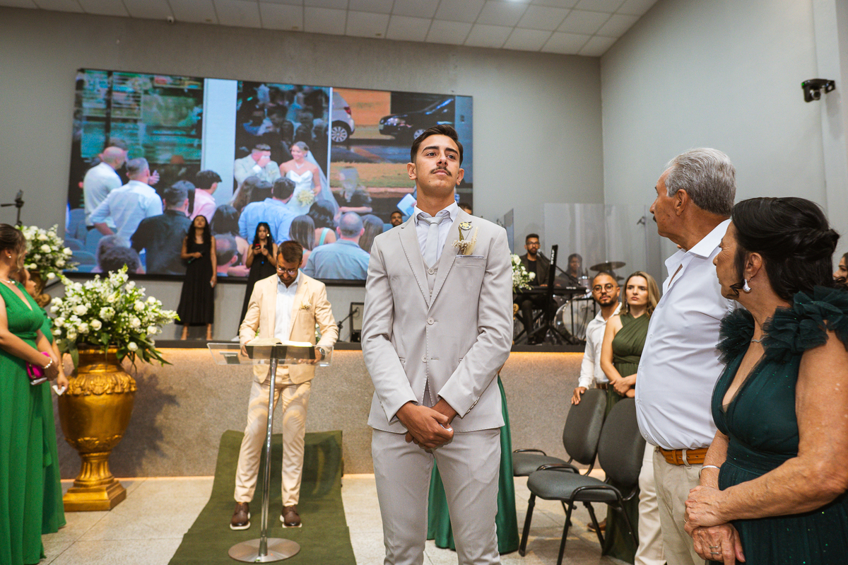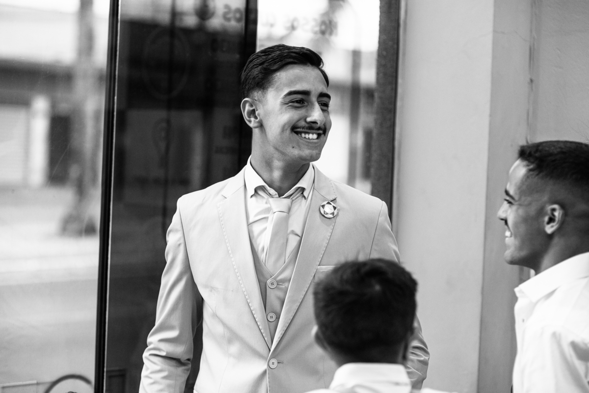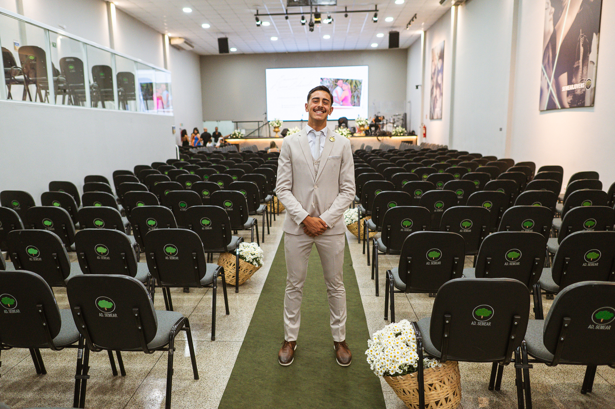 E os casamentos continuam a me surpreender positivamente. Quando a gente pensa que já experimentamos de tudo nessa área, vem um casal bem novinho e me mostra que não. Maria Eduarda e Emanuel conheceram nosso trabalho pelas redes sociais, entraram em contato e fecharam conosco. Mal sabíamos que seria um casamento super especial, recheado de emoções. Os dois são da cidade de Patrocínio - MG e foi lá onde o casamento aconteceu. Fizemos a cobertura do casamento civil no dia anterior e no sábado estávamos lá, firmes e fortes para completar a história. O dia estava muito quente, aqueles dias em que o calor estava fora do normal por toda parte. Emanuel foi um dos primeiros a chegar na porta da Igreja. Com alguns padrinhos e pajens, ele aguardou a chegada dos convidados.