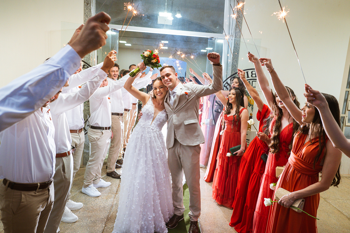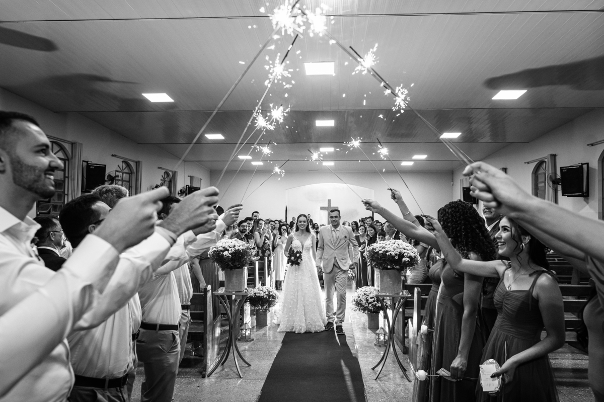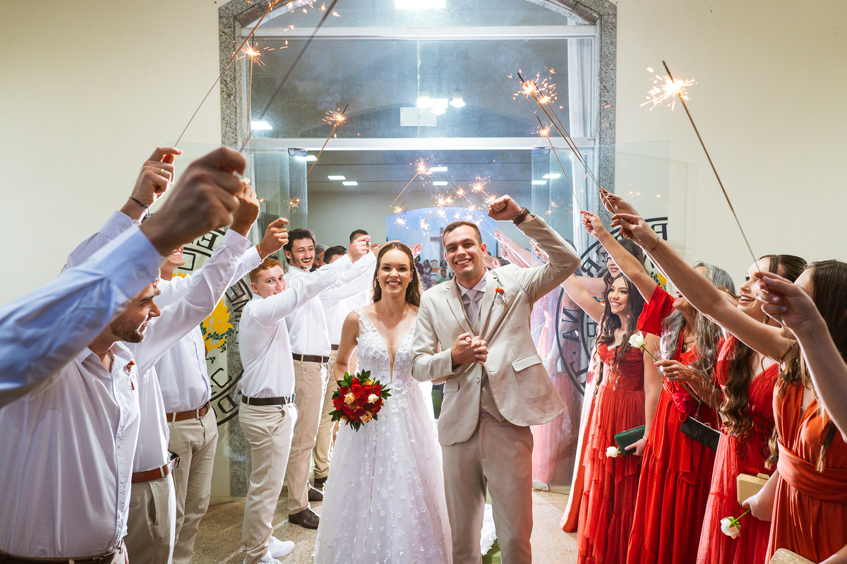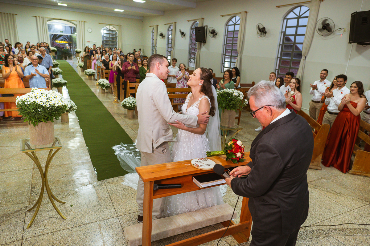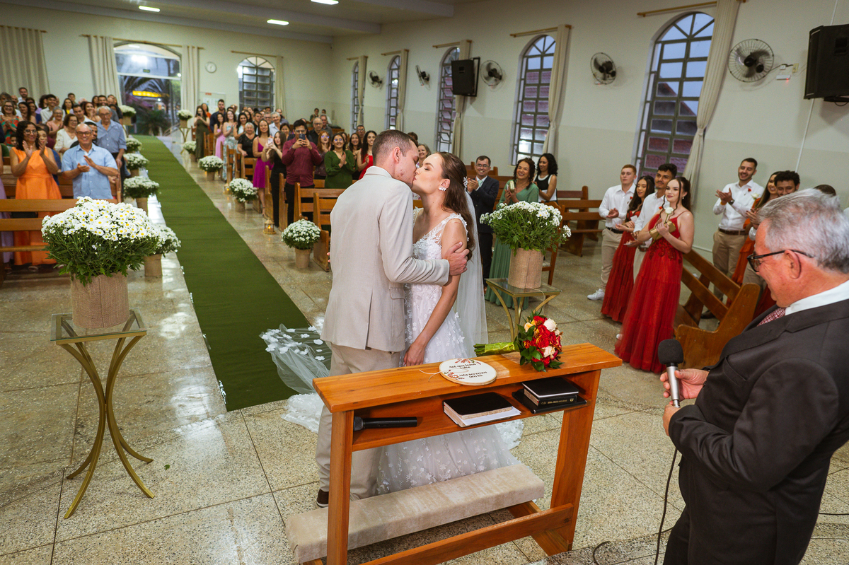Aquele frisson de todos que aguardavam ansiosos pelo momento do beijo aconteceu e então Paulo fez questão de cumprir o que foi ordenado. Com muita festa, todos aplaudiram os dois recém-casados. Realizamos a saída deles com os lindos Sparkles acesos que traziam mais luz ainda para o momento. Eles caminharam comemorando pelo corredor até a saída, onde os padrinhos os aguardavam felizes e comemorando muito. Com mais um super beijo de cinema, Esther e Paulo encerraram a celebração. Fizemos algumas fotografias com os pais e padrinhos, alguns convidados e também uma pequena sessão dos noivos. A recepção aconteceu no salão ao lado da Igreja, onde funcionava a congregação antes de expandir para o espaço ao lado. Tudo muito charmoso, parecia uma cena de novela.