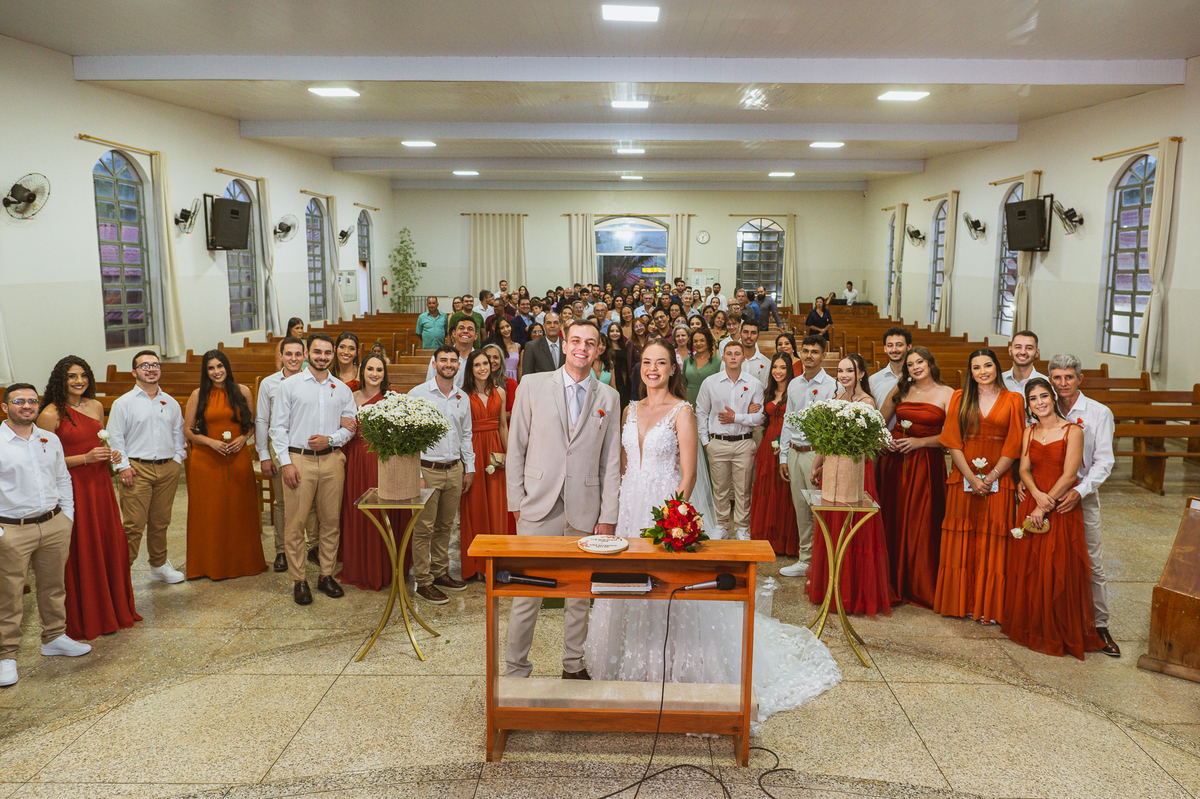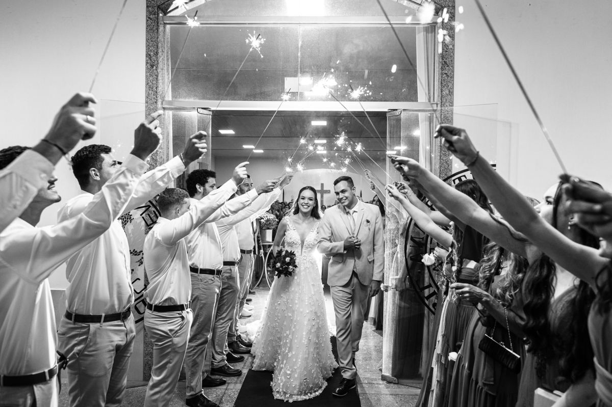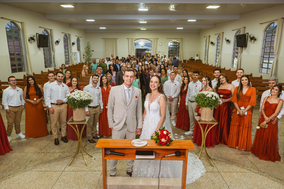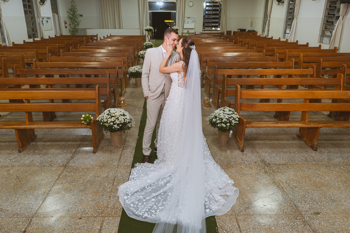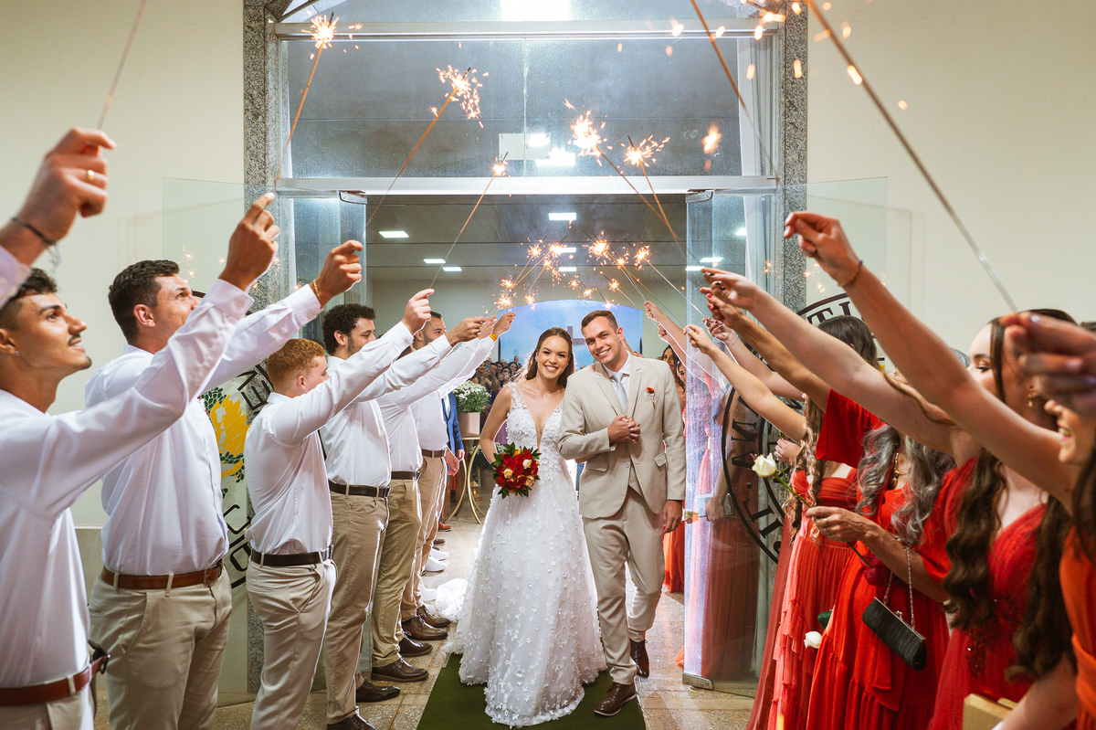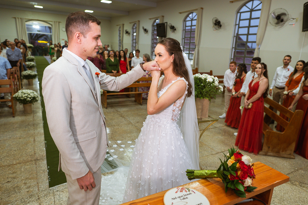 Aquele frisson de todos que aguardavam ansiosos pelo momento do beijo aconteceu e então Paulo fez questão de cumprir o que foi ordenado. Com muita festa, todos aplaudiram os dois recém-casados. Realizamos a saída deles com os lindos Sparkles acesos que traziam mais luz ainda para o momento. Eles caminharam comemorando pelo corredor até a saída, onde os padrinhos os aguardavam felizes e comemorando muito. Com mais um super beijo de cinema, Esther e Paulo encerraram a celebração. Fizemos algumas fotografias com os pais e padrinhos, alguns convidados e também uma pequena sessão dos noivos. A recepção aconteceu no salão ao lado da Igreja, onde funcionava a congregação antes de expandir para o espaço ao lado. Tudo muito charmoso, parecia uma cena de novela.