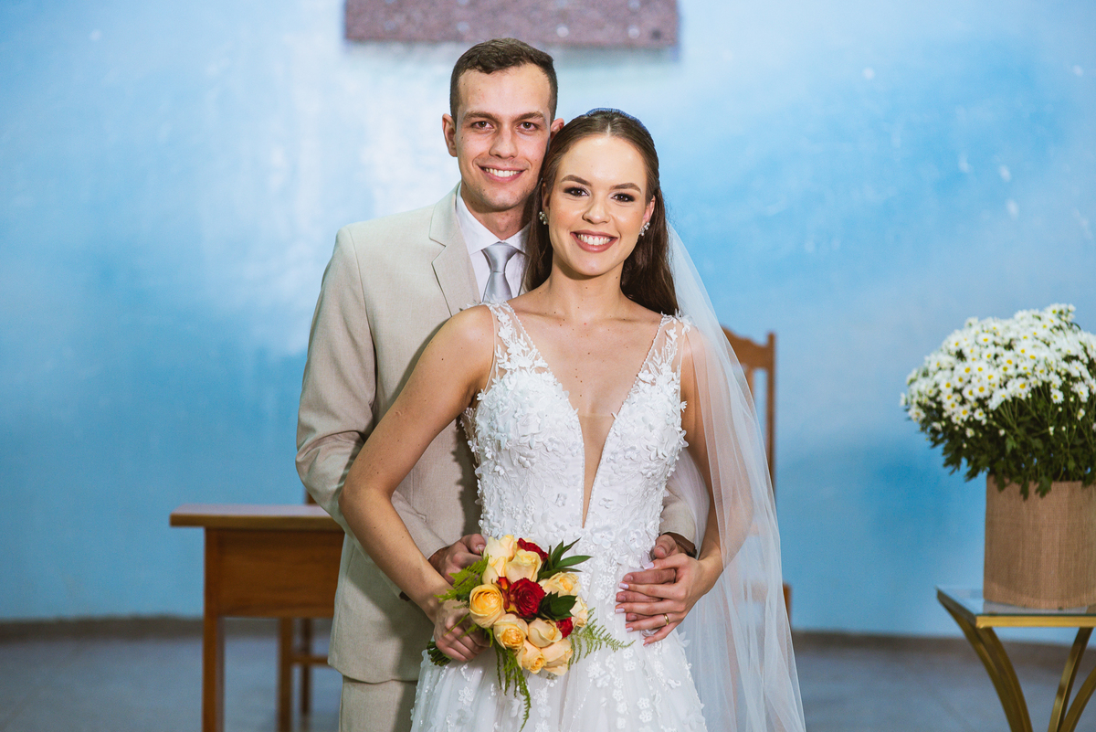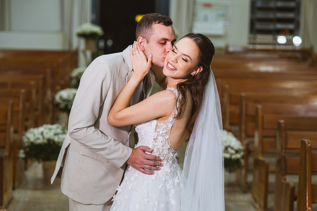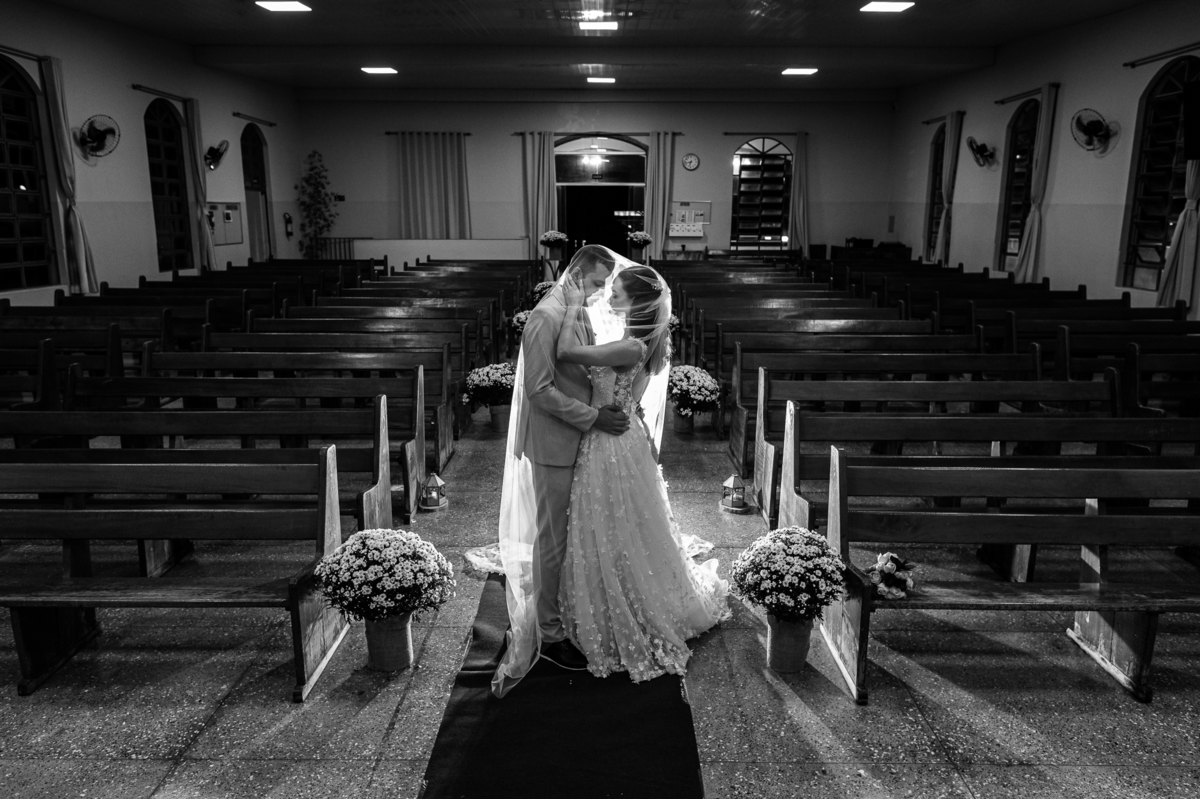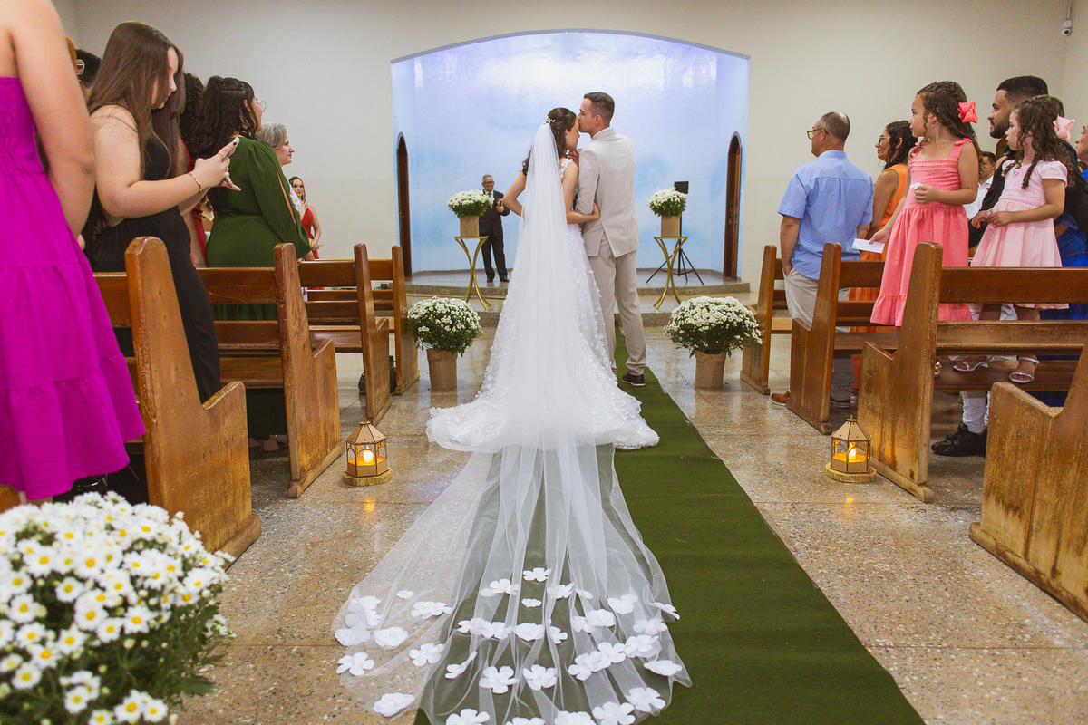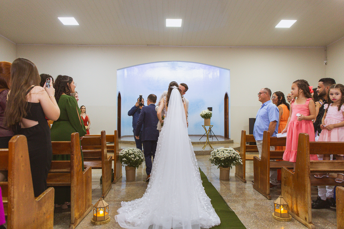 Aquele frisson de todos que aguardavam ansiosos pelo momento do beijo aconteceu e então Paulo fez questão de cumprir o que foi ordenado. Com muita festa, todos aplaudiram os dois recém-casados. Realizamos a saída deles com os lindos Sparkles acesos que traziam mais luz ainda para o momento. Eles caminharam comemorando pelo corredor até a saída, onde os padrinhos os aguardavam felizes e comemorando muito. Com mais um super beijo de cinema, Esther e Paulo encerraram a celebração. Fizemos algumas fotografias com os pais e padrinhos, alguns convidados e também uma pequena sessão dos noivos. A recepção aconteceu no salão ao lado da Igreja, onde funcionava a congregação antes de expandir para o espaço ao lado. Tudo muito charmoso, parecia uma cena de novela.