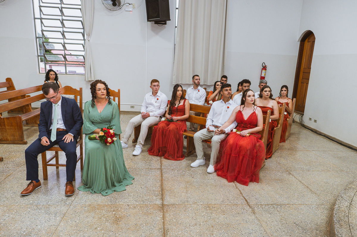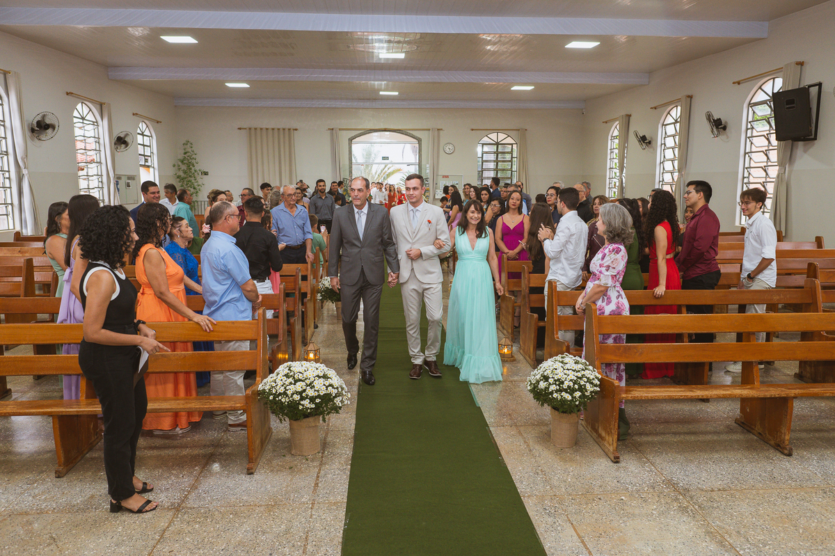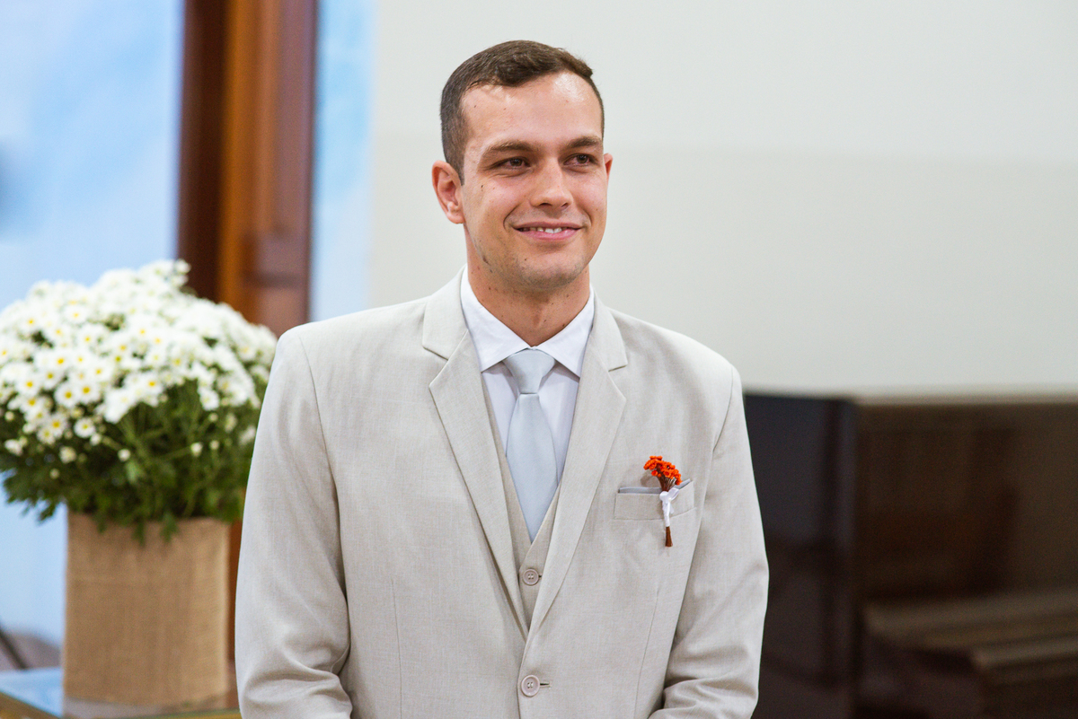 Víamos em cada detalhe um carinho muito especial. Tudo foi muito bem preparado para que fosse uma experiência inesquecível. Nos bancos do templo estavam os lencinhos, o que nos dizia que haveria muita emoção envolvida nessa celebração. Paulo chegou cedinho, ansioso para que começassem a cerimônia logo. Os padrinhos foram aos poucos chegando. Os avós do noivo chegaram e receberam um abraço carinhoso dele. Aproveitamos o momento para registrar e deixar guardado aquela memória do momento. Fizemos também um pequeno ensaio do noivo, em seu traje claro e imponente. Conforme os padrinhos e convidados iam chegando, recebiam um sorriso e um abraço do noivo.
