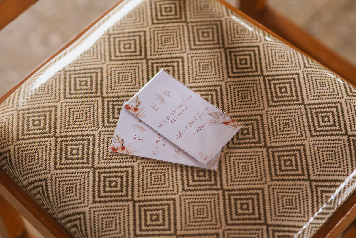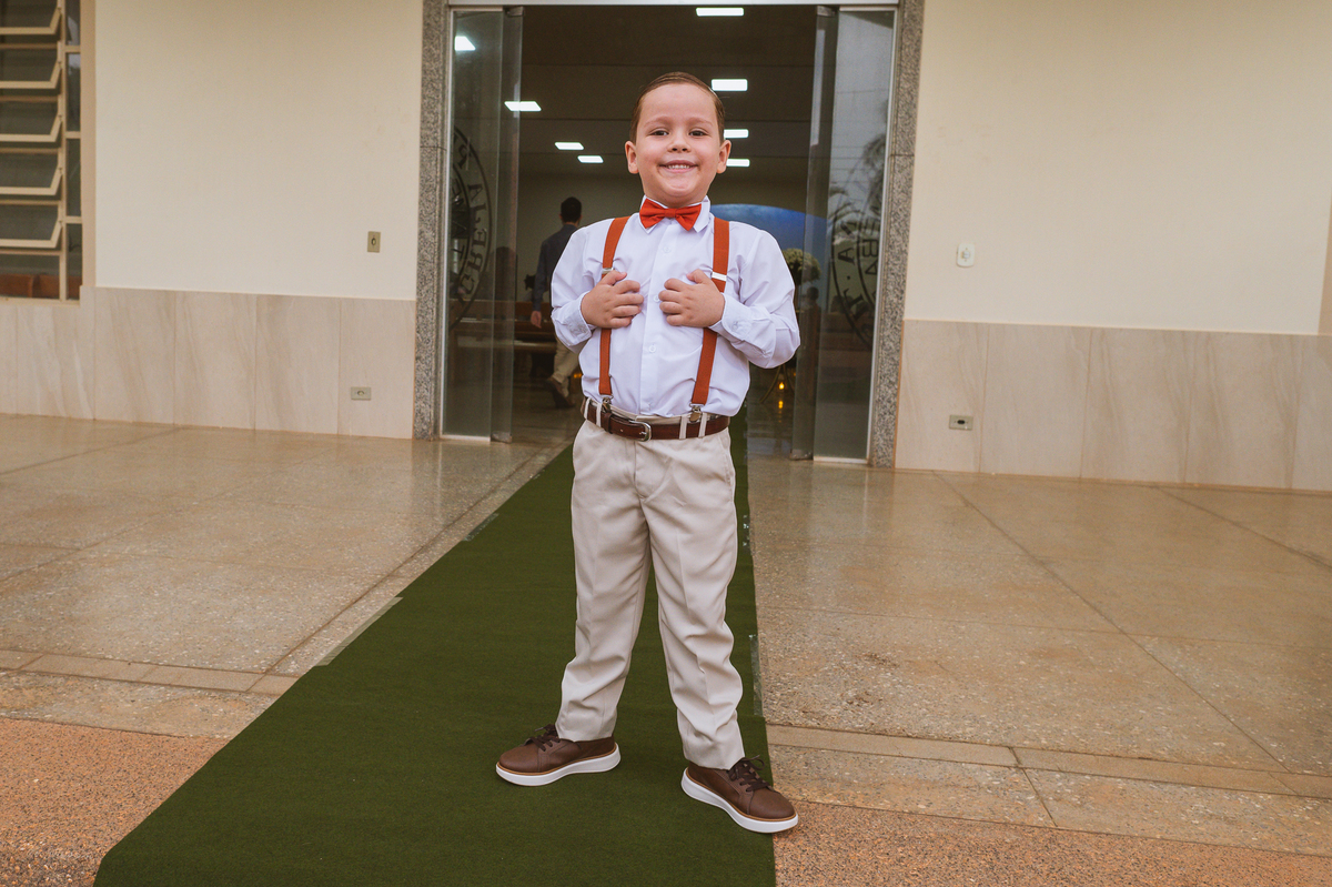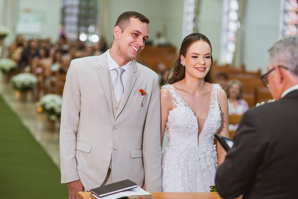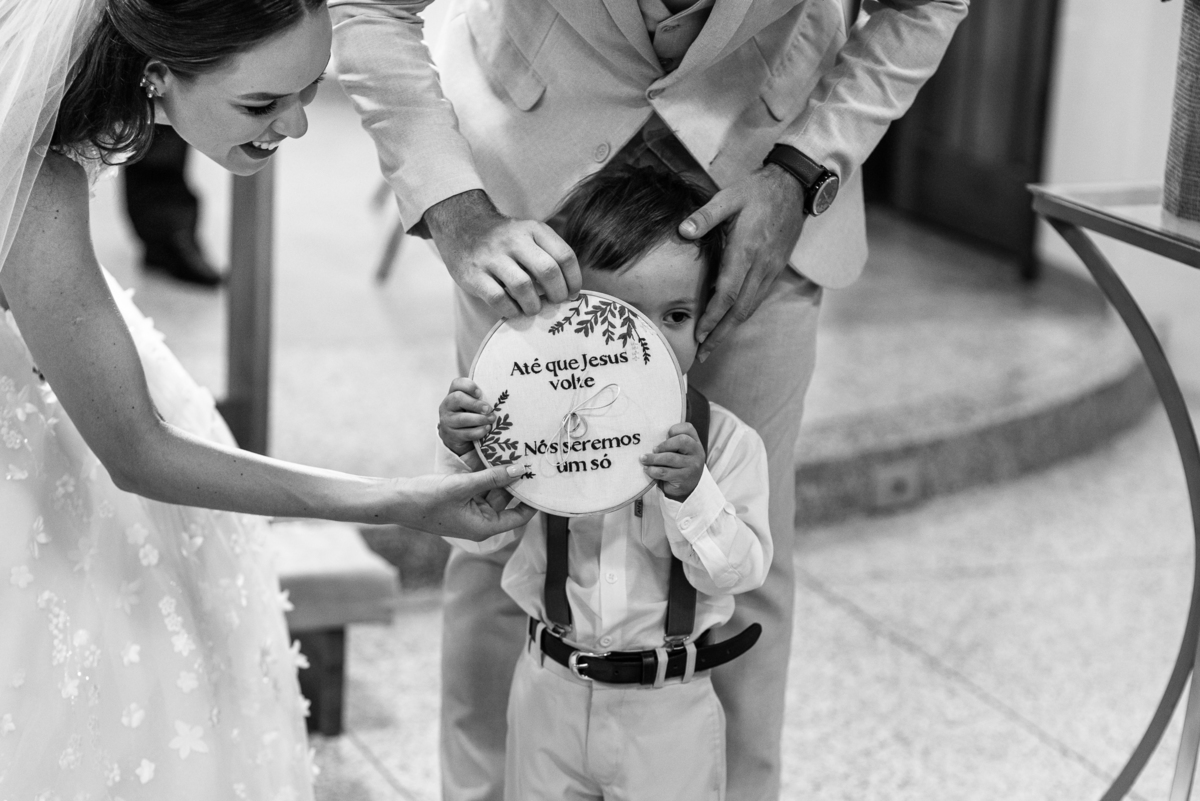 Víamos em cada detalhe um carinho muito especial. Tudo foi muito bem preparado para que fosse uma experiência inesquecível. Nos bancos do templo estavam os lencinhos, o que nos dizia que haveria muita emoção envolvida nessa celebração. Paulo chegou cedinho, ansioso para que começassem a cerimônia logo. Os padrinhos foram aos poucos chegando. Os avós do noivo chegaram e receberam um abraço carinhoso dele. Aproveitamos o momento para registrar e deixar guardado aquela memória do momento. Fizemos também um pequeno ensaio do noivo, em seu traje claro e imponente. Conforme os padrinhos e convidados iam chegando, recebiam um sorriso e um abraço do noivo.
