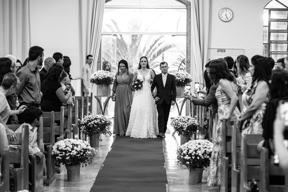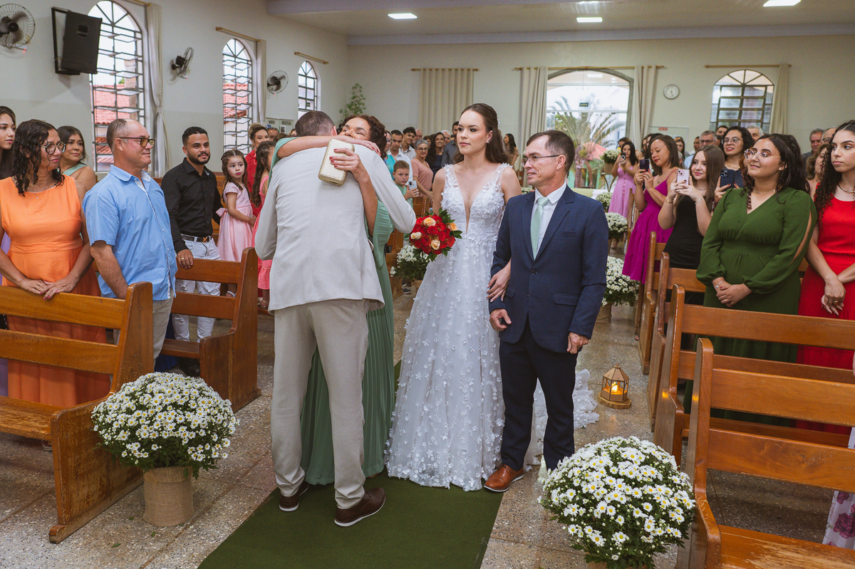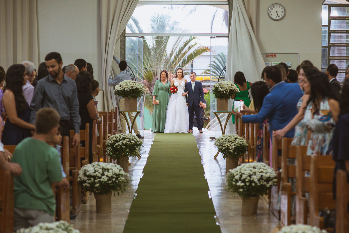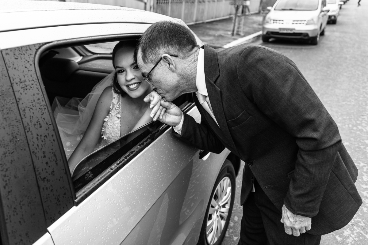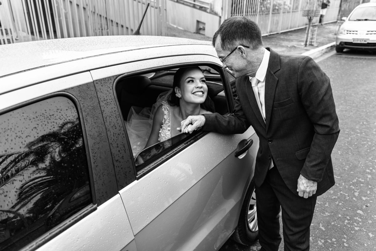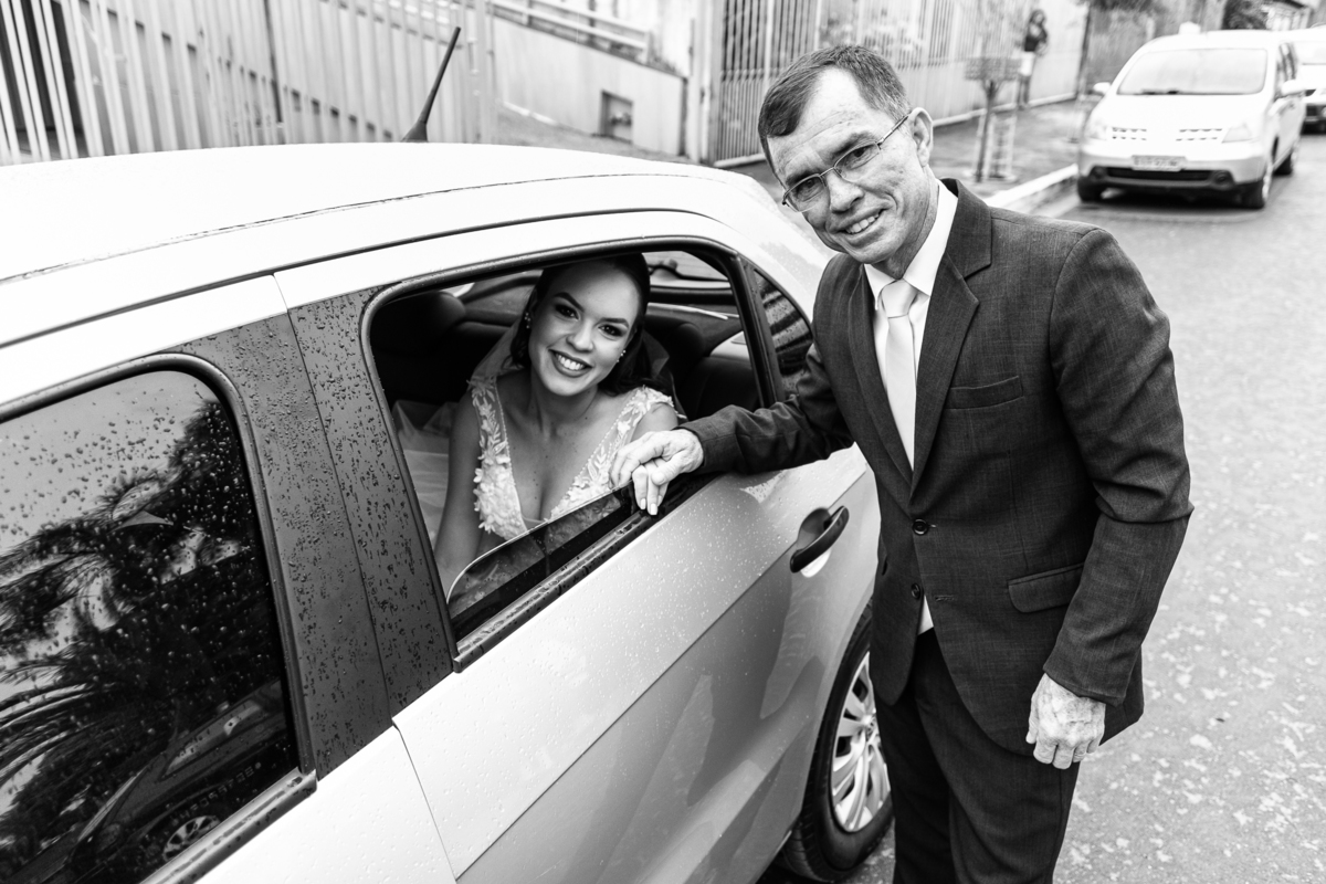 Alguns instantes depois, Esther também chegou. O carro estacionou bem próximo da Igreja e fizemos a nossa tradicional sessão de fotos dela no carro. O sorriso já contava toda a ansiedade que Esther sentia naquele momento. Ao fundo, os convidados iam entrando no salão. Por cá, o coração da noiva já batia acelerado, com a chegada do momento de iniciar a cerimônia. A música começou a ser tocada e todos fomos para dentro do salão. Esther ficou lá de fora juntamente de seus pais. Enquanto as entradas começavam a acontecer, aproveitamos o momento para fotografar a noiva com seu pai. Paulo entrou de braços dados com seus pais e ao final do corredor, despediu-se dos dois com um forte e emocionante abraço. Agora, sozinho, ele aguardava a entrada dos padrinhos e posteriormente de sua noiva.