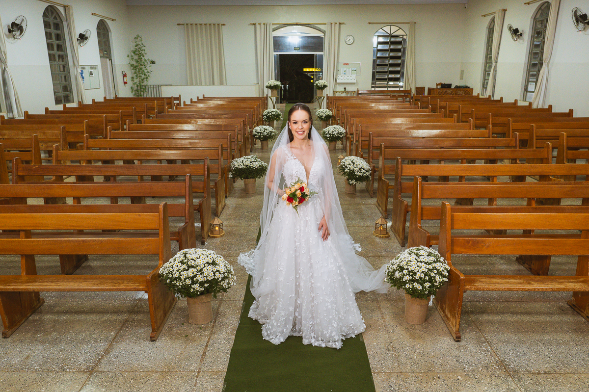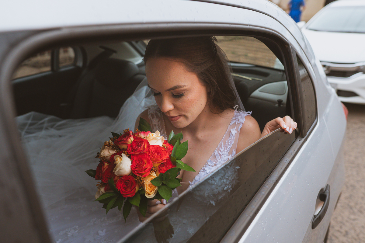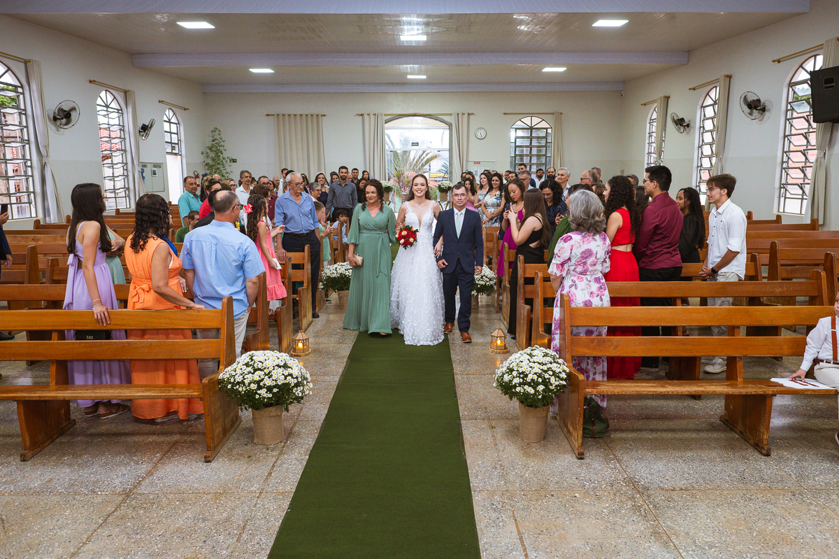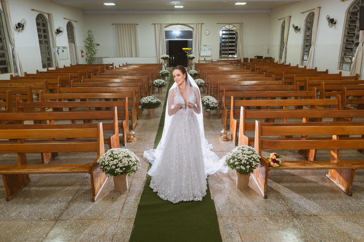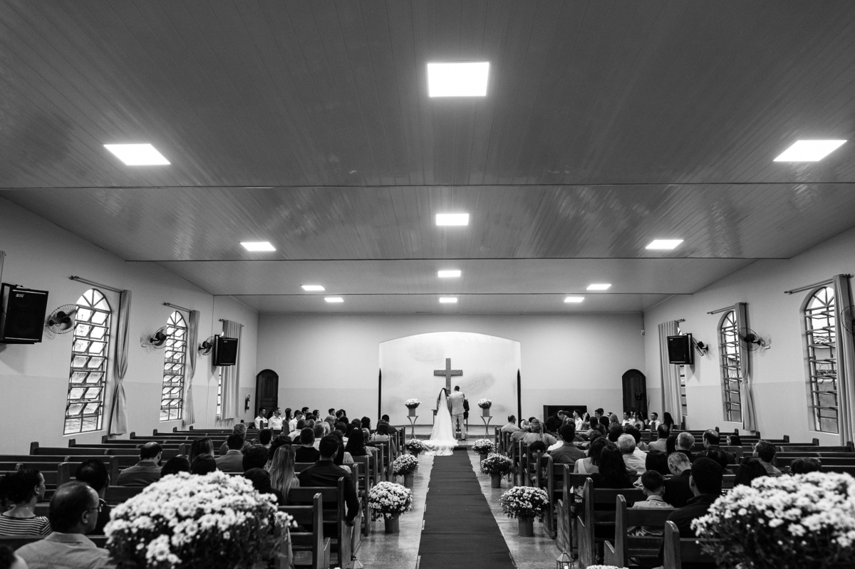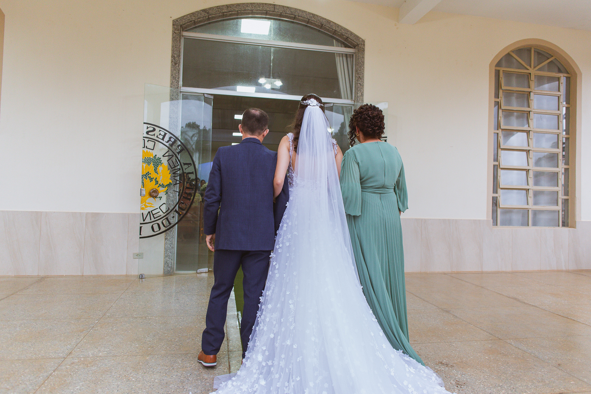 Alguns instantes depois, Esther também chegou. O carro estacionou bem próximo da Igreja e fizemos a nossa tradicional sessão de fotos dela no carro. O sorriso já contava toda a ansiedade que Esther sentia naquele momento. Ao fundo, os convidados iam entrando no salão. Por cá, o coração da noiva já batia acelerado, com a chegada do momento de iniciar a cerimônia. A música começou a ser tocada e todos fomos para dentro do salão. Esther ficou lá de fora juntamente de seus pais. Enquanto as entradas começavam a acontecer, aproveitamos o momento para fotografar a noiva com seu pai. Paulo entrou de braços dados com seus pais e ao final do corredor, despediu-se dos dois com um forte e emocionante abraço. Agora, sozinho, ele aguardava a entrada dos padrinhos e posteriormente de sua noiva.