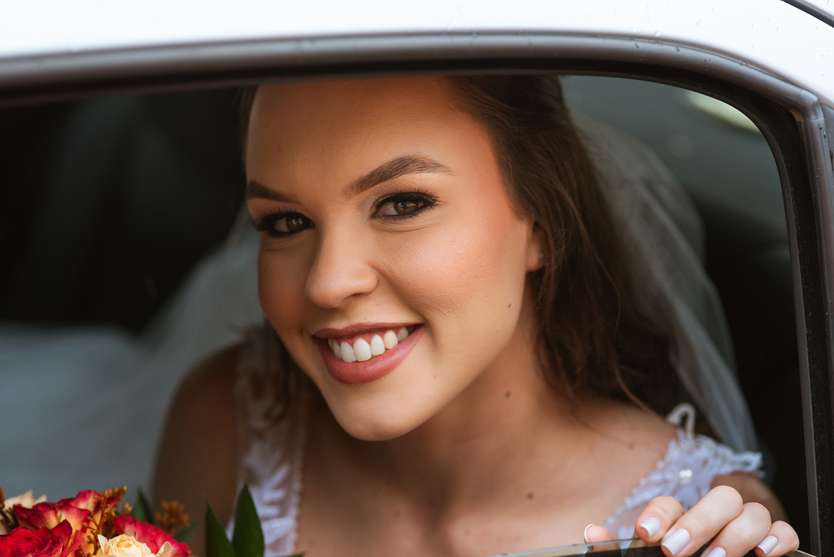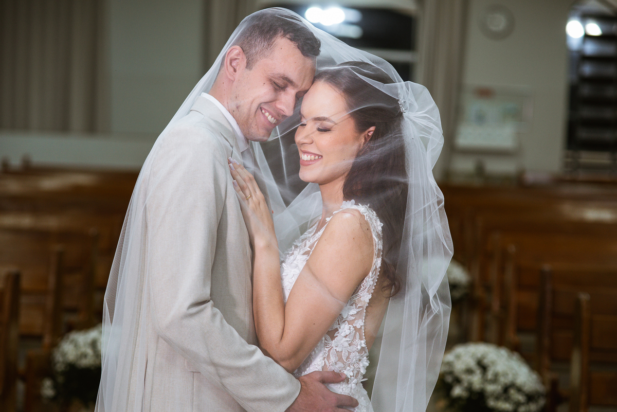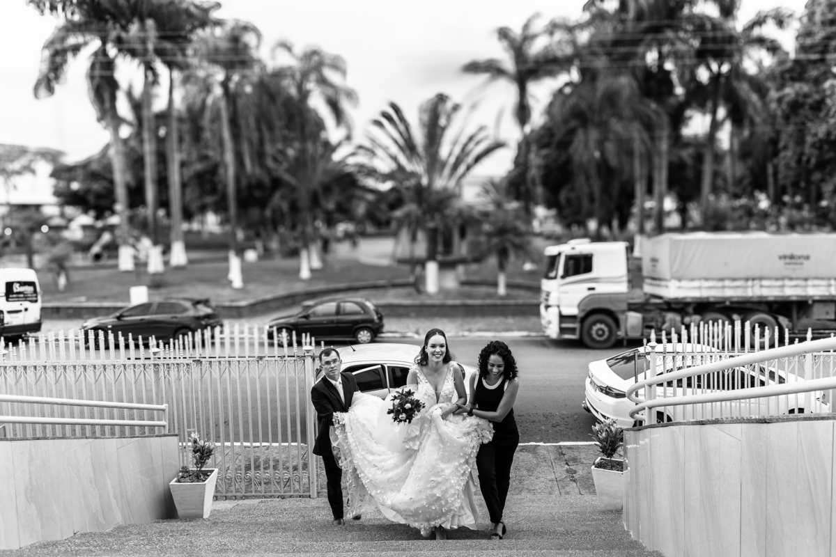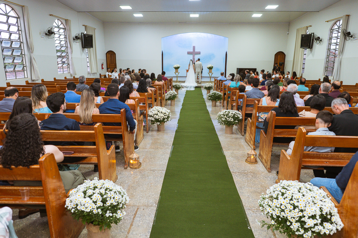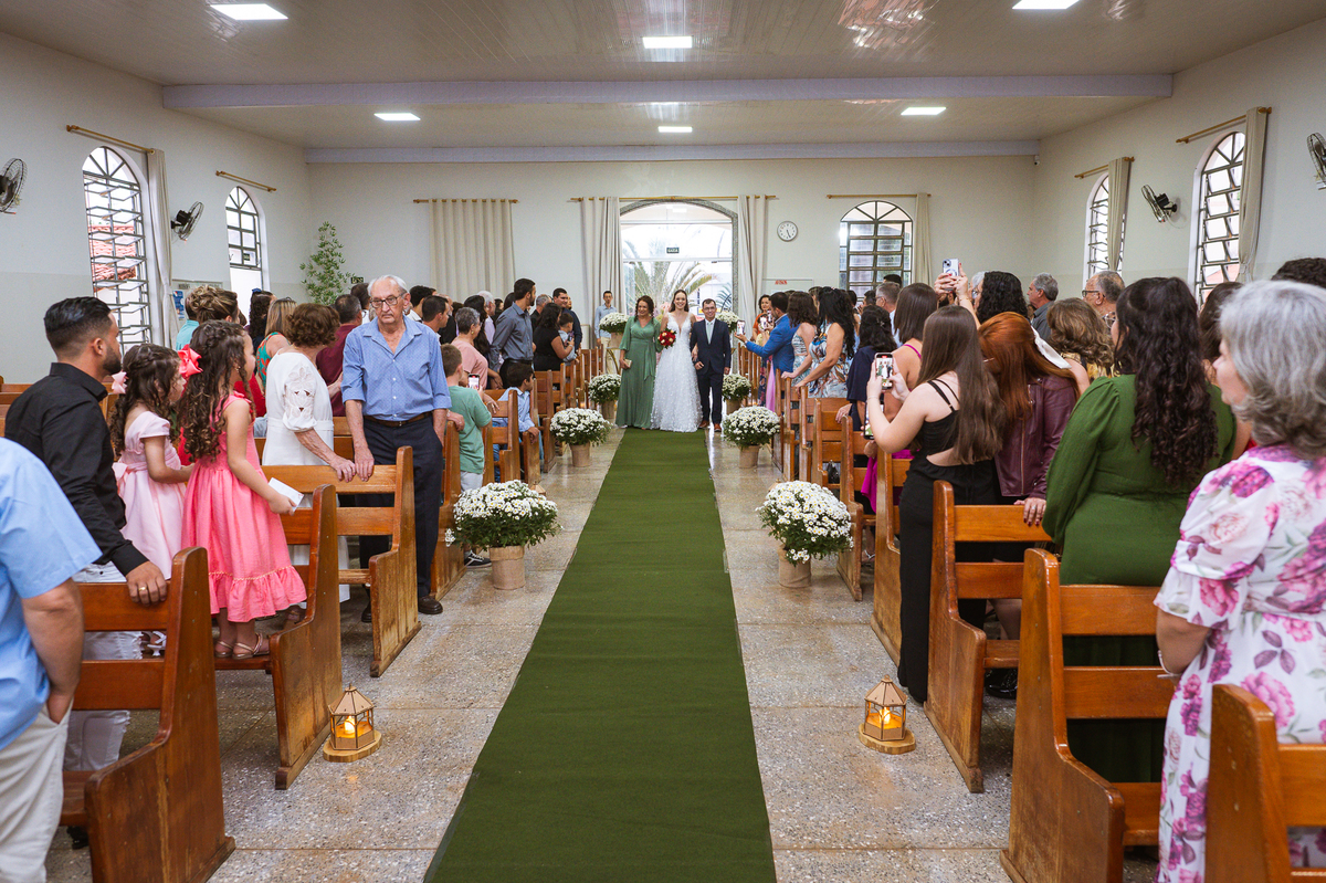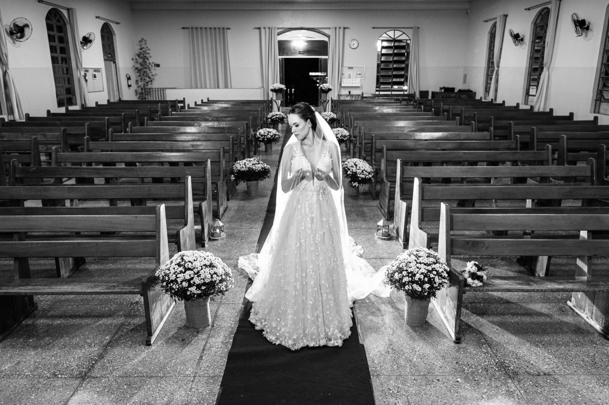 Alguns instantes depois, Esther também chegou. O carro estacionou bem próximo da Igreja e fizemos a nossa tradicional sessão de fotos dela no carro. O sorriso já contava toda a ansiedade que Esther sentia naquele momento. Ao fundo, os convidados iam entrando no salão. Por cá, o coração da noiva já batia acelerado, com a chegada do momento de iniciar a cerimônia. A música começou a ser tocada e todos fomos para dentro do salão. Esther ficou lá de fora juntamente de seus pais. Enquanto as entradas começavam a acontecer, aproveitamos o momento para fotografar a noiva com seu pai. Paulo entrou de braços dados com seus pais e ao final do corredor, despediu-se dos dois com um forte e emocionante abraço. Agora, sozinho, ele aguardava a entrada dos padrinhos e posteriormente de sua noiva.