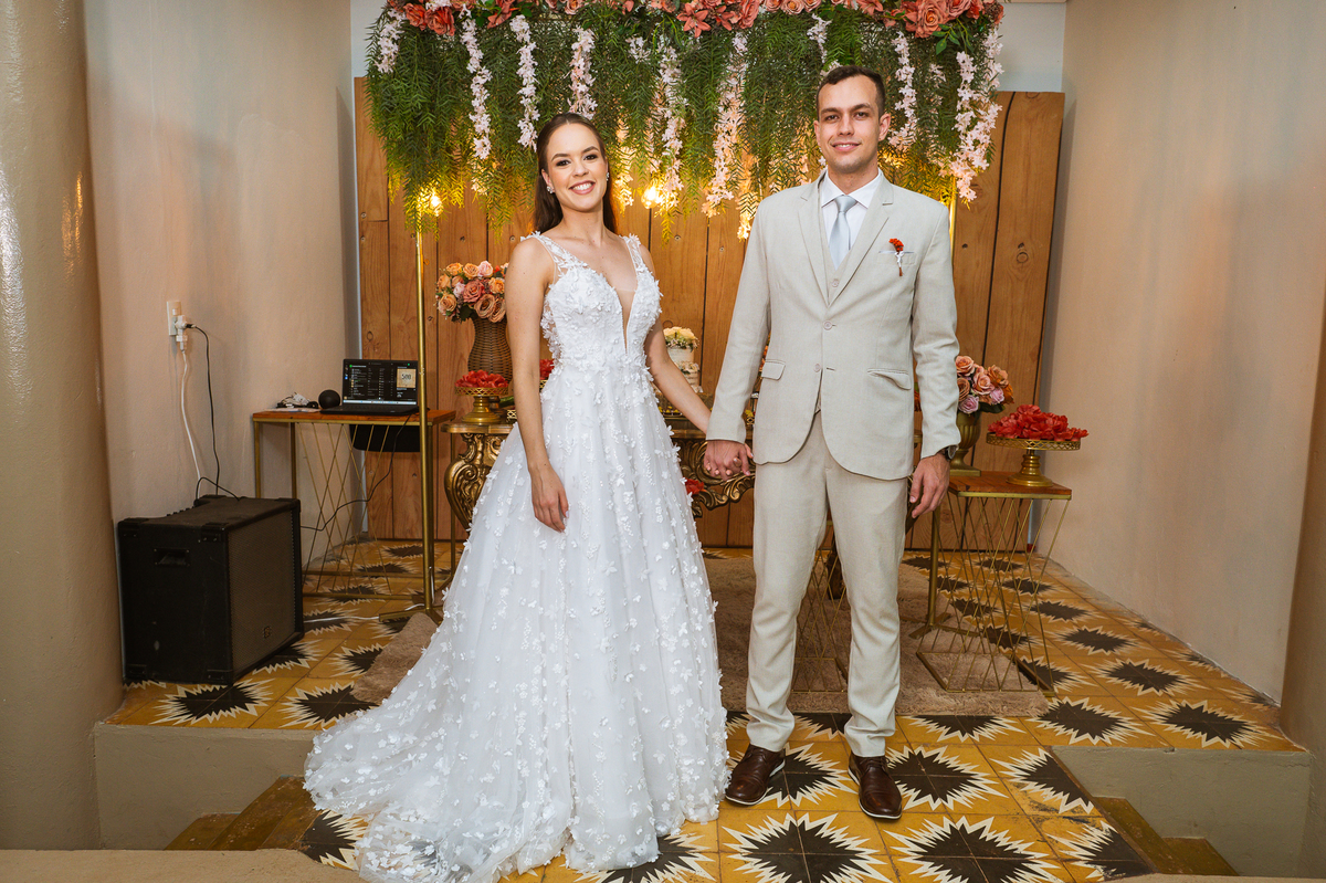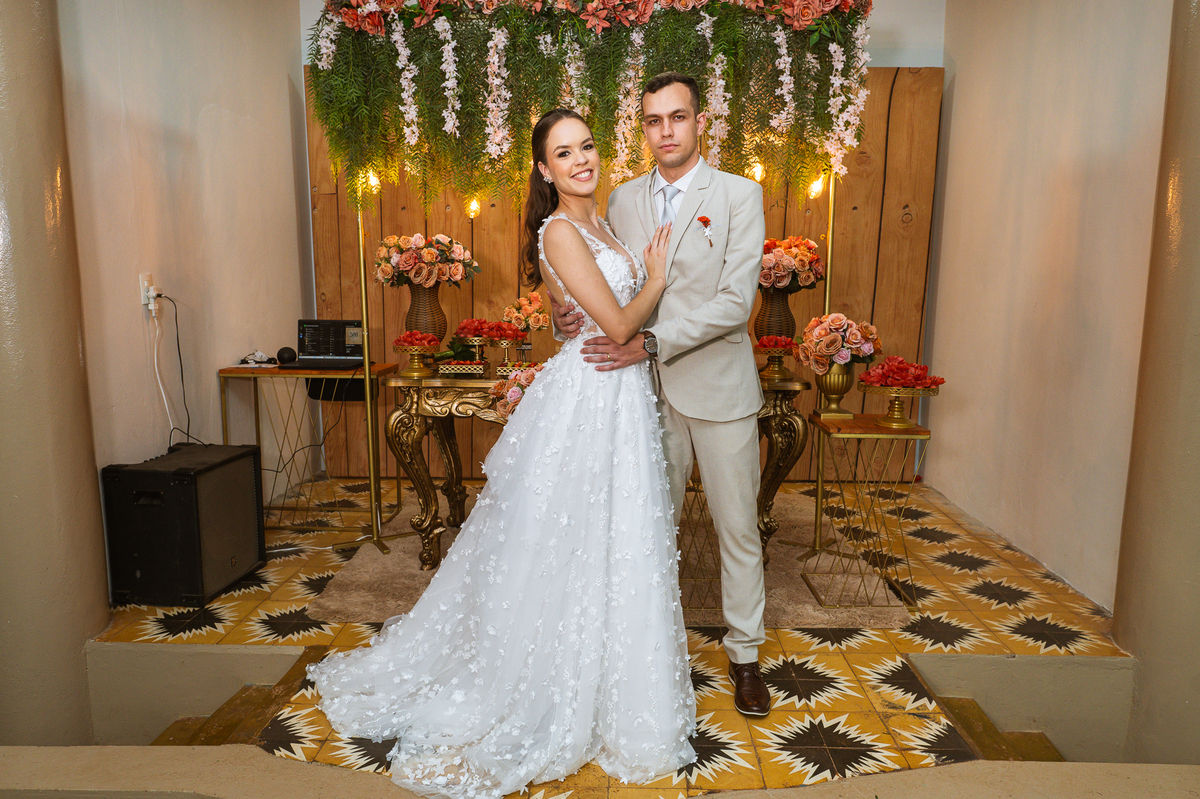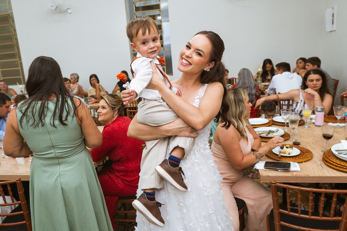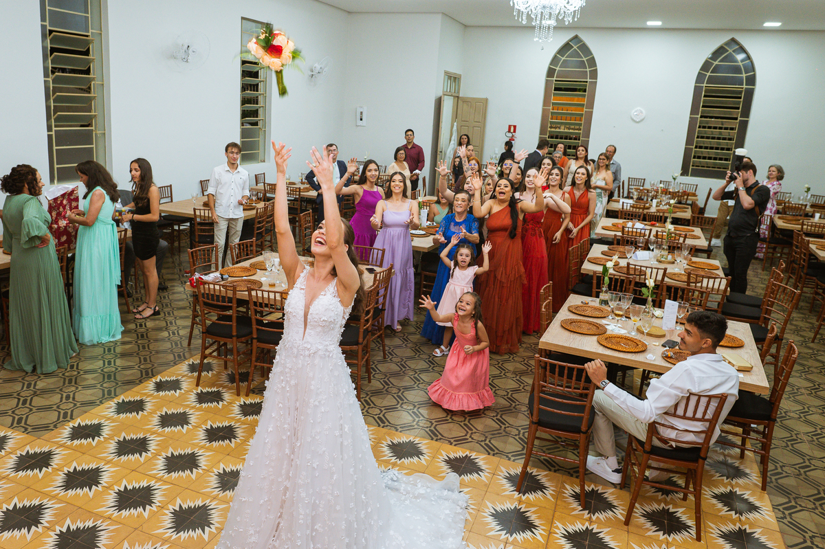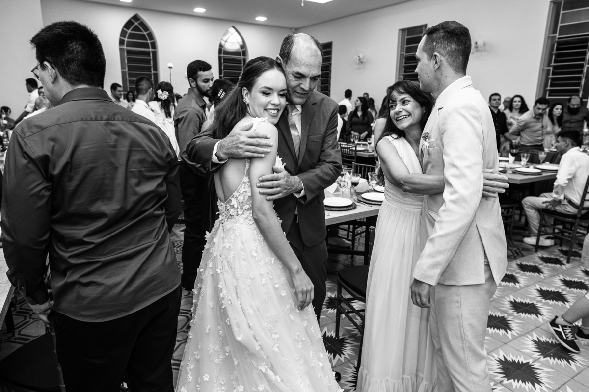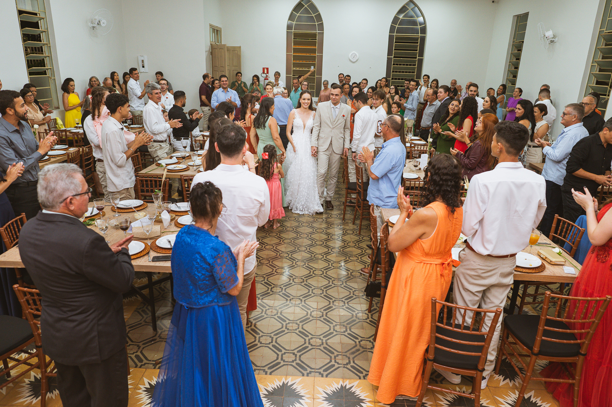 A decoração estava linda. A mesa do bolo colocada onde funcionava o altar, pronto para receber os ex-noivos. Os dois foram anunciados e entraram ao som de muitas palmas por parte de todos os convidados. Receberam todo o carinho deles e usamos o espaço para fazer mais algumas fotografias. Depois, Paulo realizou o corte da gravata com seus padrinhos e movimentou a festa. Esther cumprimentava seus convidados ao passo que recebia todo carinho de volta em forma de abraços de gratidão e felicidade. Um jantar maravilhoso foi servido e todos ficaram muito satisfeitos. Encerramos nossa participação depois de mais alguns momentos, após concluir todas os registros necessários e comunicar a noiva.