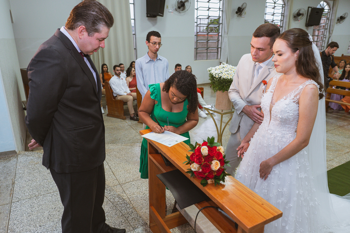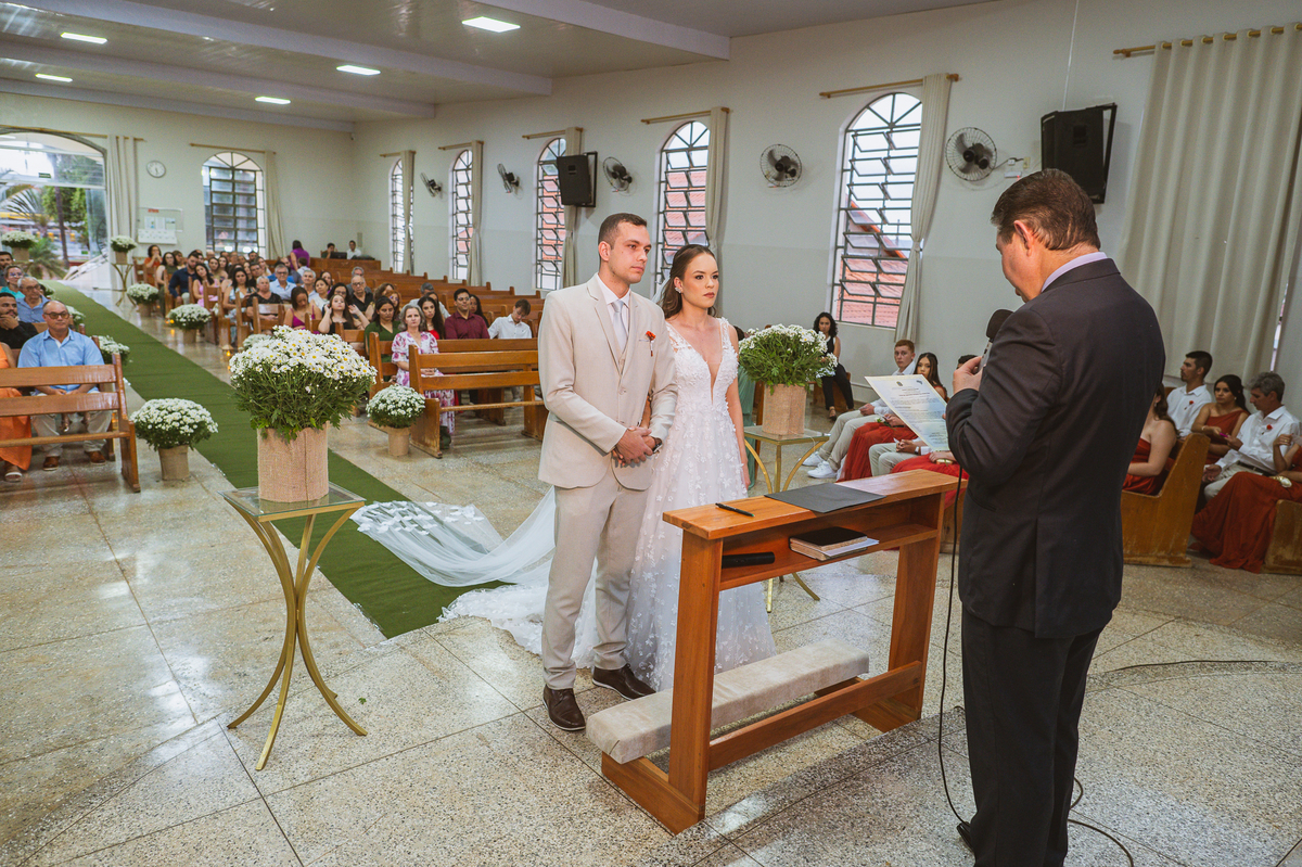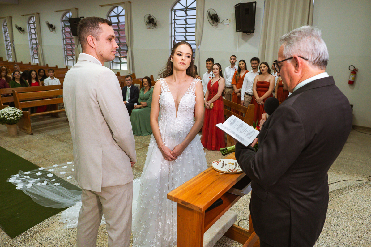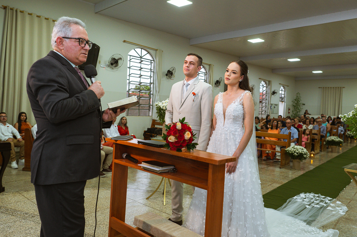 Juntinhos, os dois caminharam rumo ao altar. O presbítero os recebeu com todo carinho e até os fez sorrir durante a ministração da palavra, que foi dividida em dois momentos. Um dos pastores realizou a cerimônia e o outro os ungiu. Eles assinaram os documentos de casamento e trocaram seus votos. As alianças foram convidadas a entrar e foram trazidas por outro pajem, que arrancou sorrisos de todos ao chegar no altar. Sem saber muito o que fazer, ele ficou ali em meio aos noivos. Eles sorriram e pegaram o porta-alianças com a escrita "Até que Jesus volte, seremos um só". Esther e Paulo trocaram as alianças e com um beijo em cada uma das mãos, eles fecharam aquele momento com todo carinho. O pastor os declarou casados perante Deus e as testemunhas e disse que estavam liberados para que o noivo beijasse a noiva.